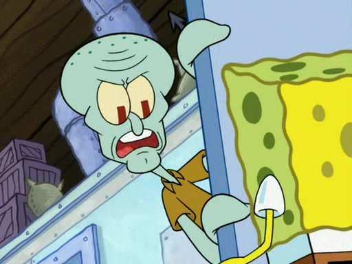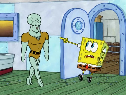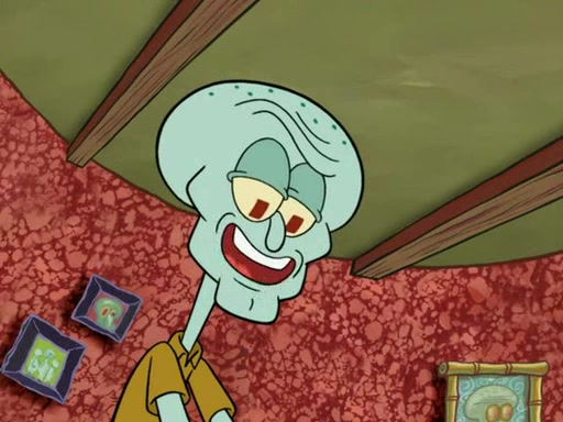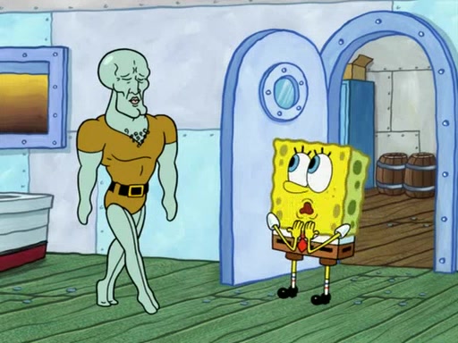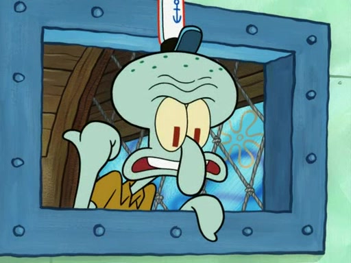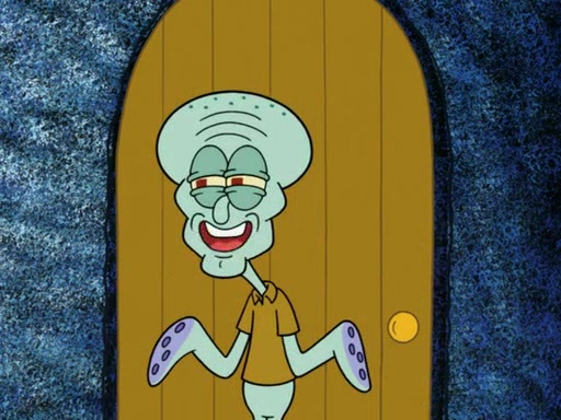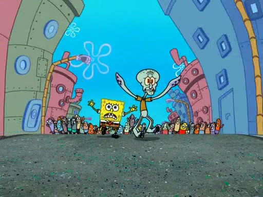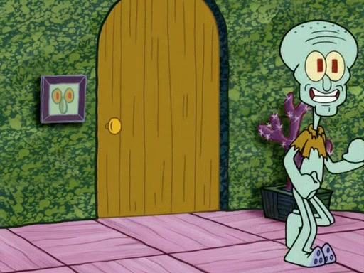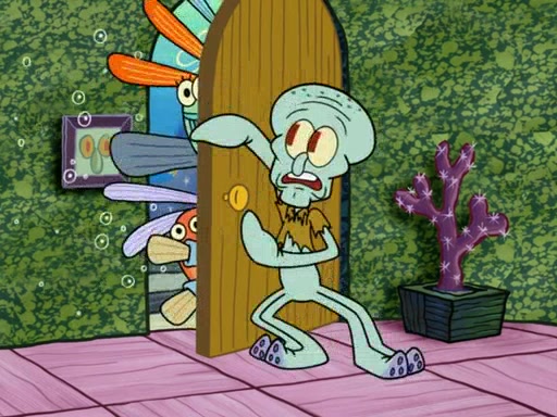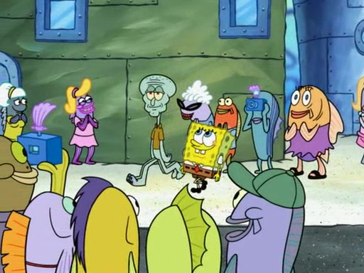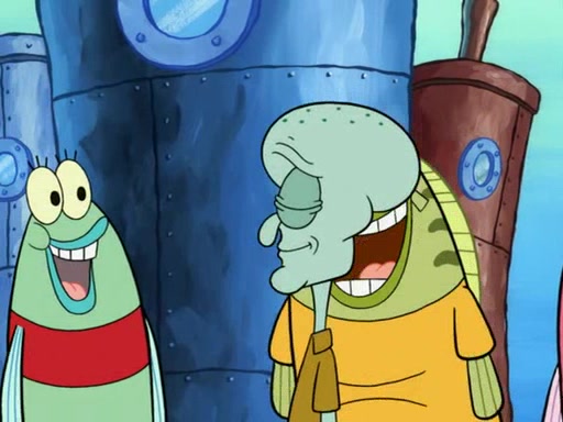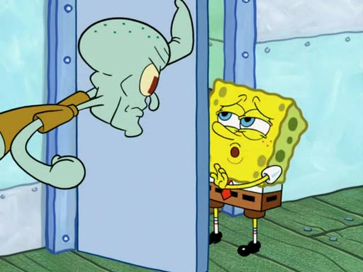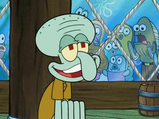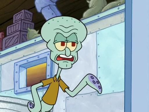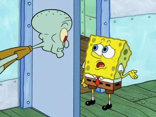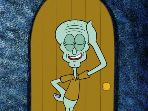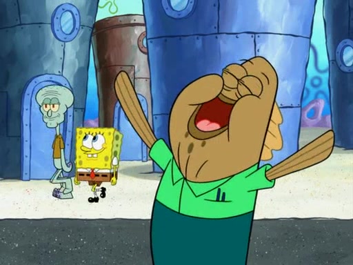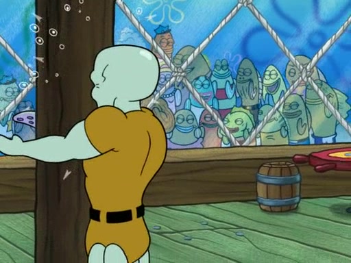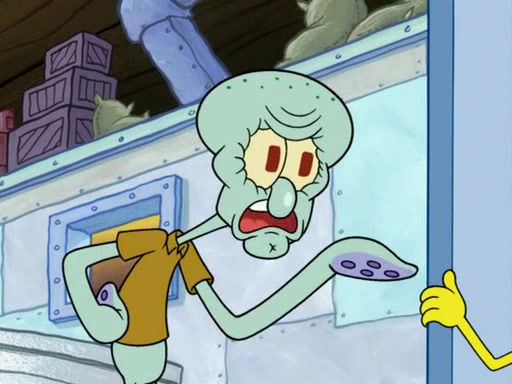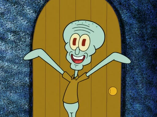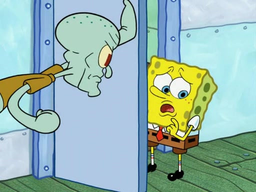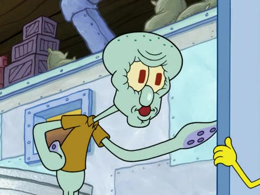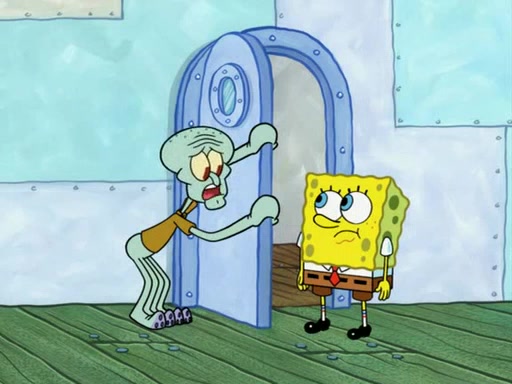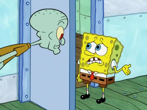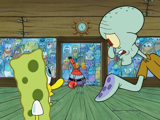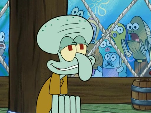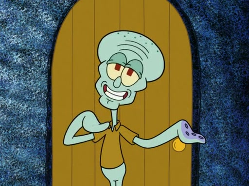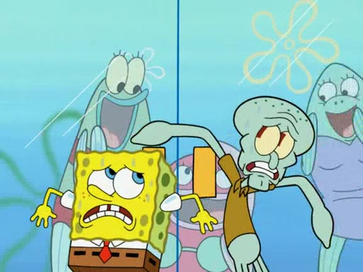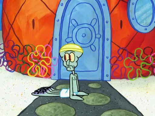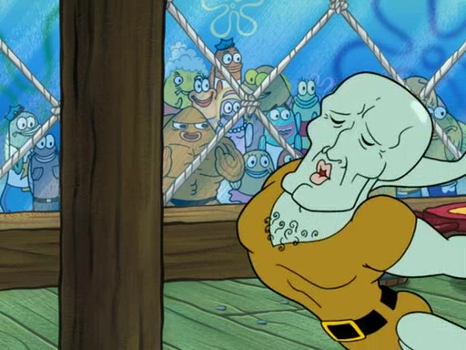 But all that changes when Squidward's fans go crazy and taking his stuff and won't leave him alone. Everything is too much for Squidward so he goes to SpongeBob for help. Squidward wants to become his normal self, so he and SpongeBob races to Krusty Krab with the crowd following them. Mr. Krabs becomes overjoyed to see everyone at the entrance, and begins to name all the prices. While he does that, Squidward tells SpongeBob to slam the door against his face in order to make him normal again. SpongeBob doesn't want to do it, but Squidward threatens to hurt SpongeBob if he doesn't hurt him. So he begins to slam the door against Squidward's face repeatedly, but it only makes Squidward even more handsome. Suddenly, the flying fish's other bowling shoe, falls out of the top, and SpongeBob, who was alarmed by it, pushes Squidward out of the way. SpongeBob's push sends Squidward flying dramatically and causes him to hit a pole, while the shoe just bounces off of SpongeBob's head. The blow from the pole causes Squidward's face to become normal again. The crowd, who is disappointed to see Squidward not handsome anymore, begins to walk away miserably, but Mr. Krabs, who is unhappy to see his beloved customers go away, tries to return Squidward's handsomeness by slamming the door repeatedly against his face.