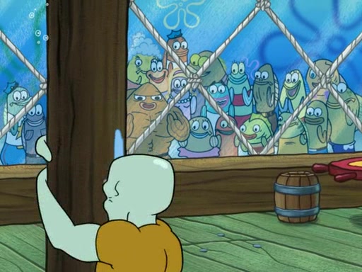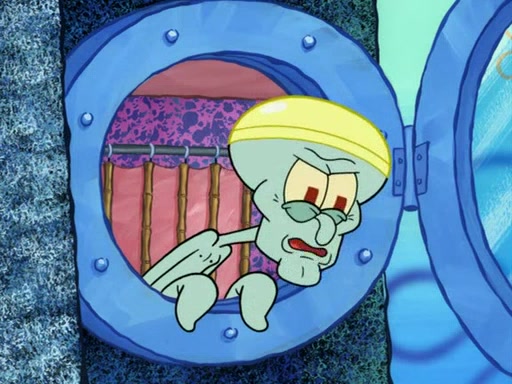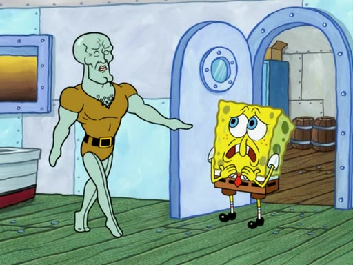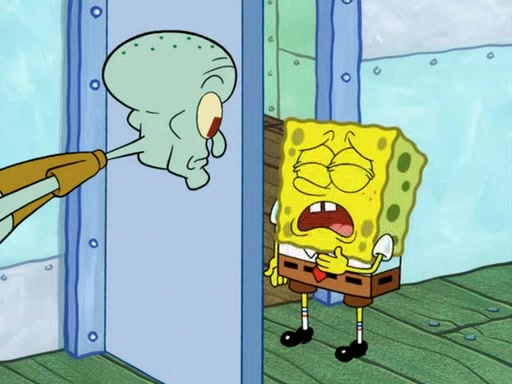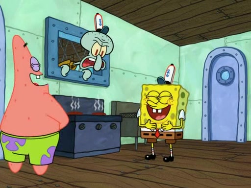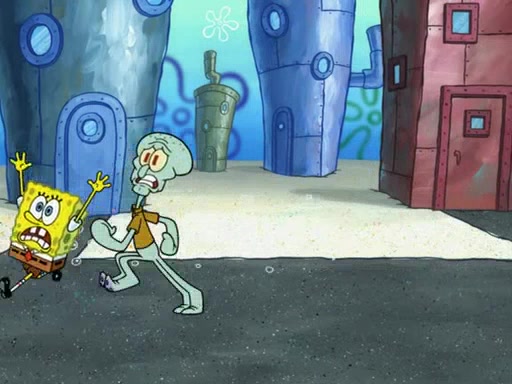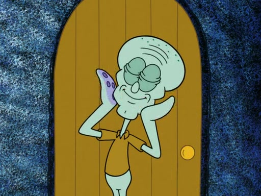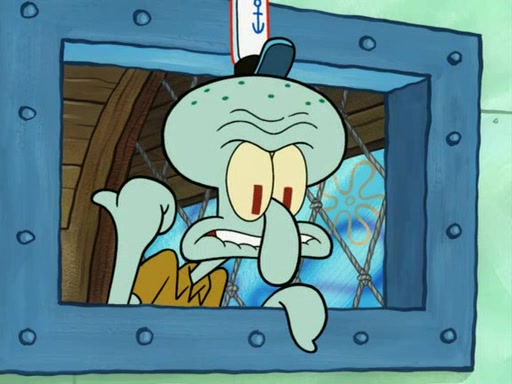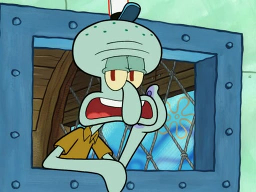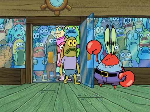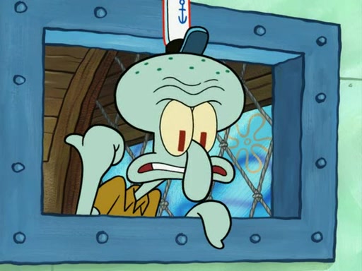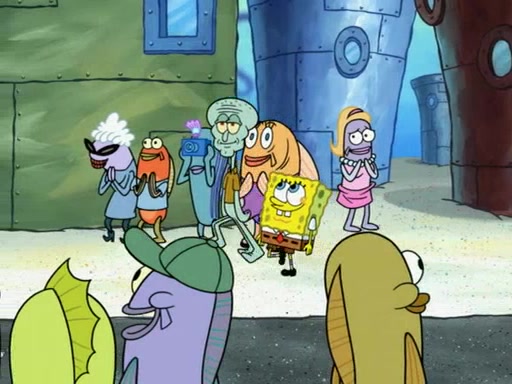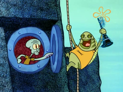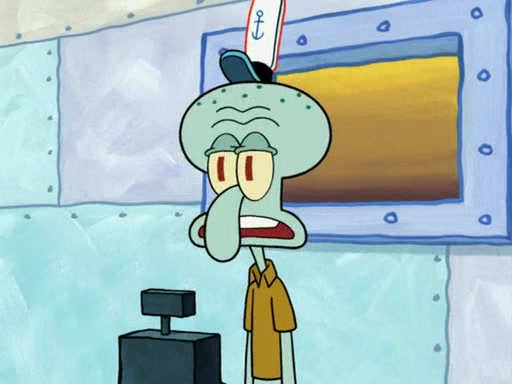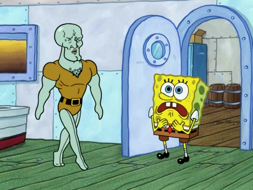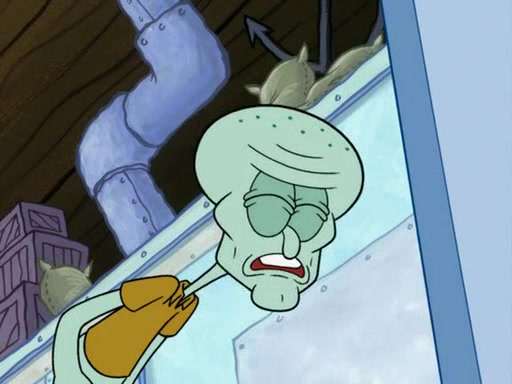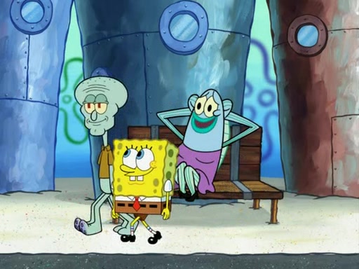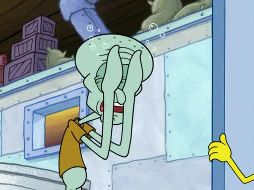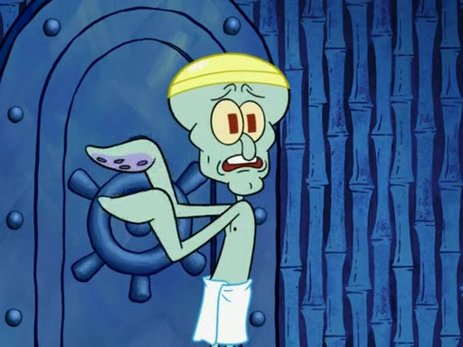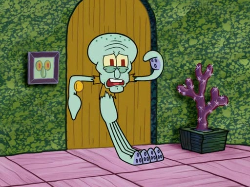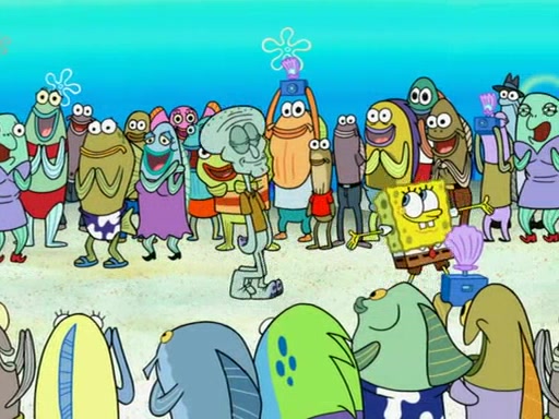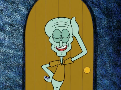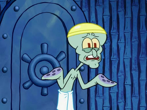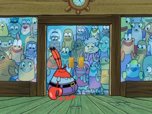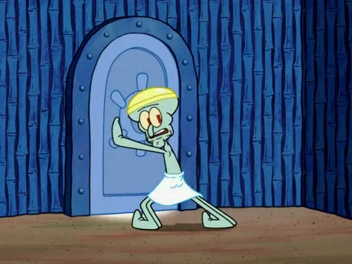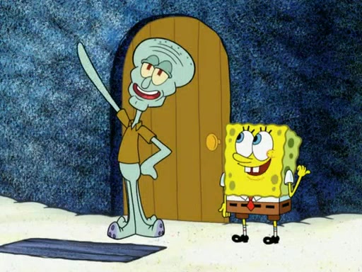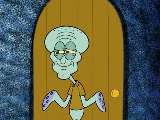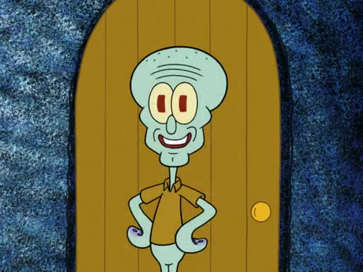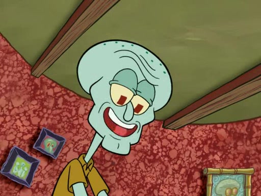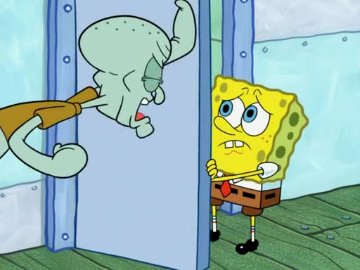 But all that changes when Squidward's fans go crazy and taking his stuff and won't leave him alone. Everything is too much for Squidward so he goes to SpongeBob for help. Squidward wants to become his normal self, so he and SpongeBob races to Krusty Krab with the crowd following them. Mr. Krabs becomes overjoyed to see everyone at the entrance, and begins to name all the prices. While he does that, Squidward tells SpongeBob to slam the door against his face in order to make him normal again. SpongeBob doesn't want to do it, but Squidward threatens to hurt SpongeBob if he doesn't hurt him. So he begins to slam the door against Squidward's face repeatedly, but it only makes Squidward even more handsome. Suddenly, the flying fish's other bowling shoe, falls out of the top, and SpongeBob, who was alarmed by it, pushes Squidward out of the way. SpongeBob's push sends Squidward flying dramatically and causes him to hit a pole, while the shoe just bounces off of SpongeBob's head. The blow from the pole causes Squidward's face to become normal again. The crowd, who is disappointed to see Squidward not handsome anymore, begins to walk away miserably, but Mr. Krabs, who is unhappy to see his beloved customers go away, tries to return Squidward's handsomeness by slamming the door repeatedly against his face.