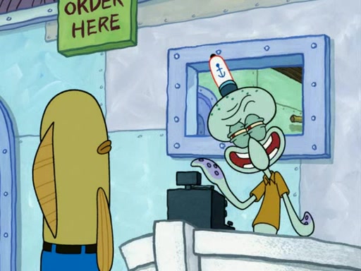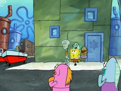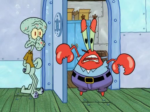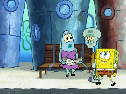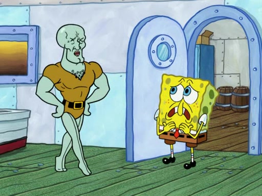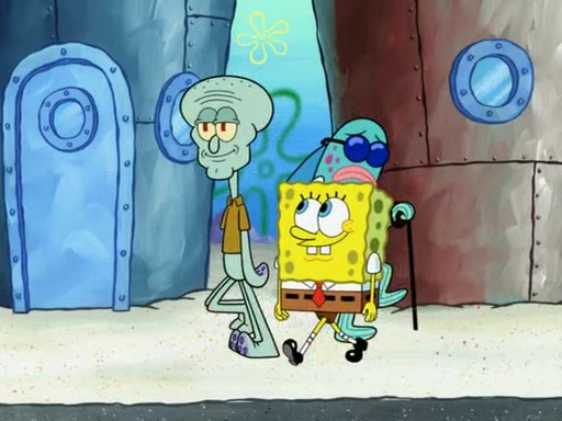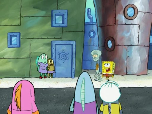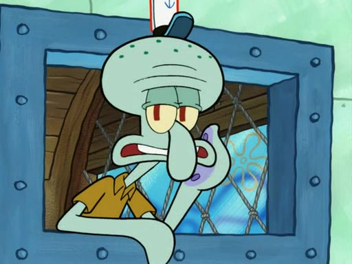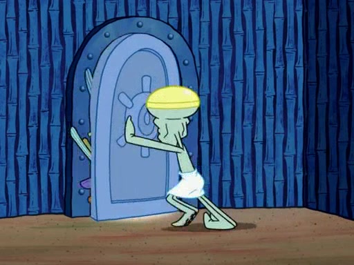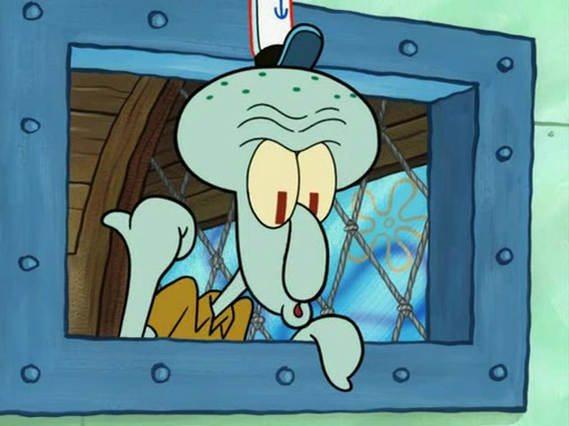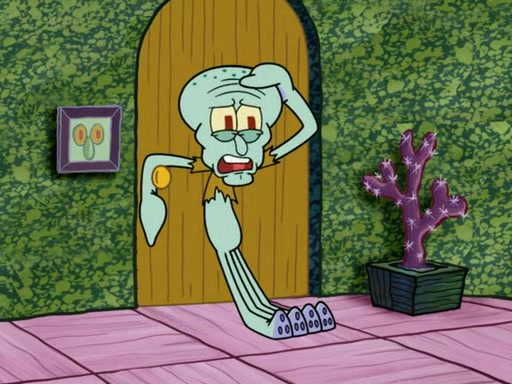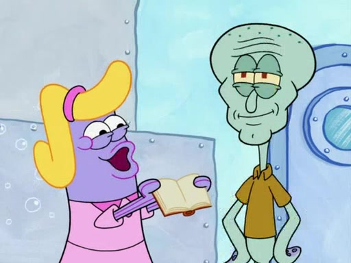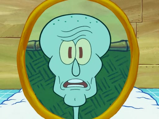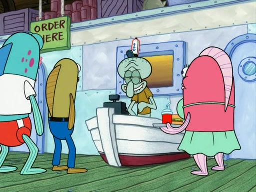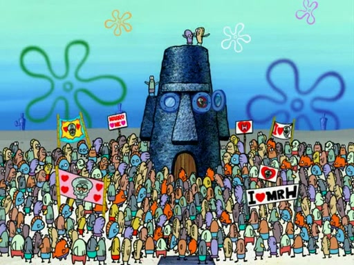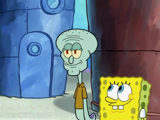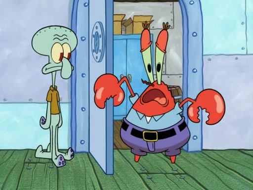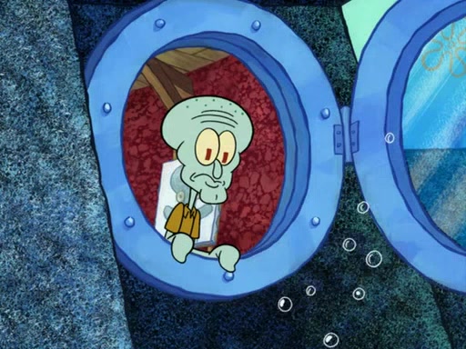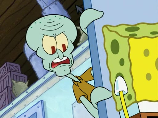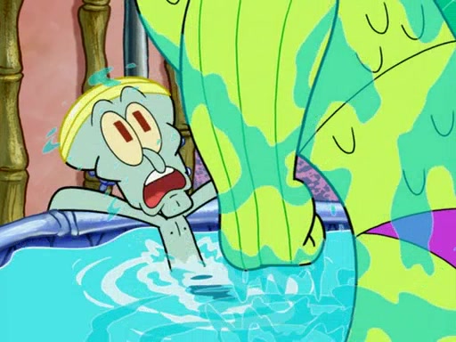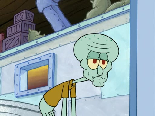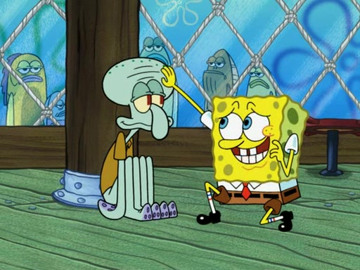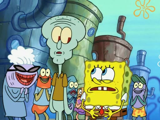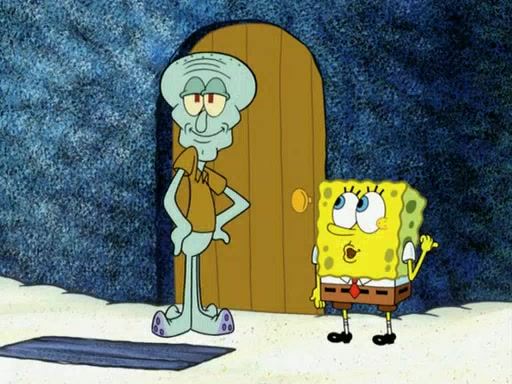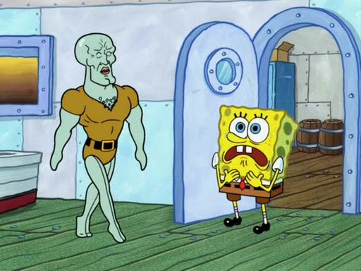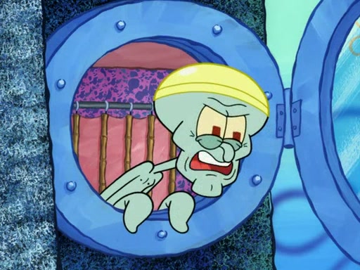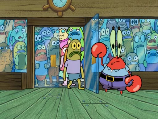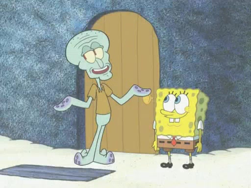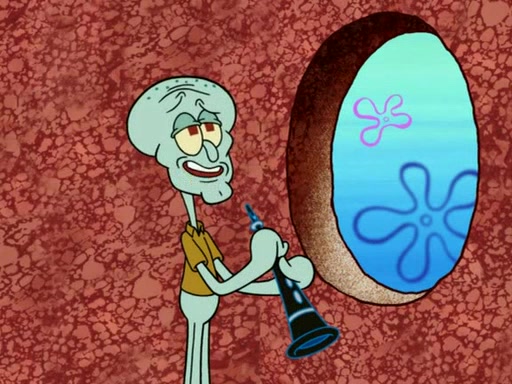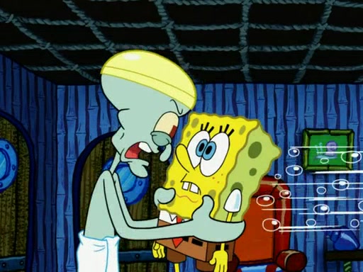 But all that changes when Squidward's fans go crazy and taking his stuff and won't leave him alone. Everything is too much for Squidward so he goes to SpongeBob for help. Squidward wants to become his normal self, so he and SpongeBob races to Krusty Krab with the crowd following them. Mr. Krabs becomes overjoyed to see everyone at the entrance, and begins to name all the prices. While he does that, Squidward tells SpongeBob to slam the door against his face in order to make him normal again. SpongeBob doesn't want to do it, but Squidward threatens to hurt SpongeBob if he doesn't hurt him. So he begins to slam the door against Squidward's face repeatedly, but it only makes Squidward even more handsome. Suddenly, the flying fish's other bowling shoe, falls out of the top, and SpongeBob, who was alarmed by it, pushes Squidward out of the way. SpongeBob's push sends Squidward flying dramatically and causes him to hit a pole, while the shoe just bounces off of SpongeBob's head. The blow from the pole causes Squidward's face to become normal again. The crowd, who is disappointed to see Squidward not handsome anymore, begins to walk away miserably, but Mr. Krabs, who is unhappy to see his beloved customers go away, tries to return Squidward's handsomeness by slamming the door repeatedly against his face.
