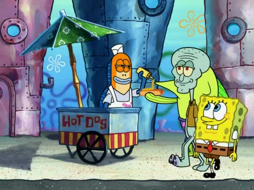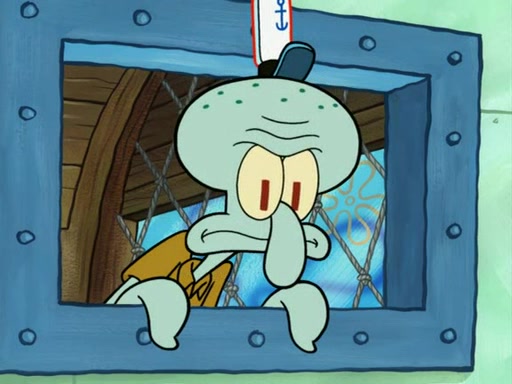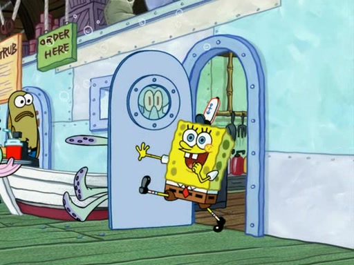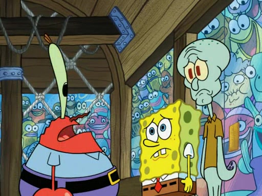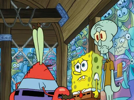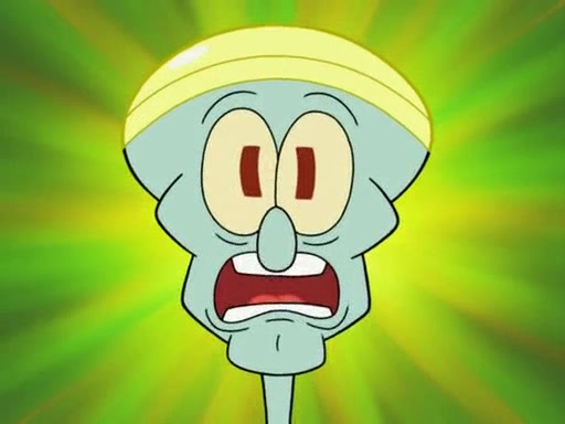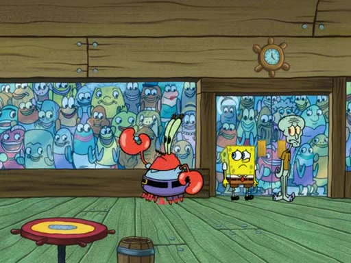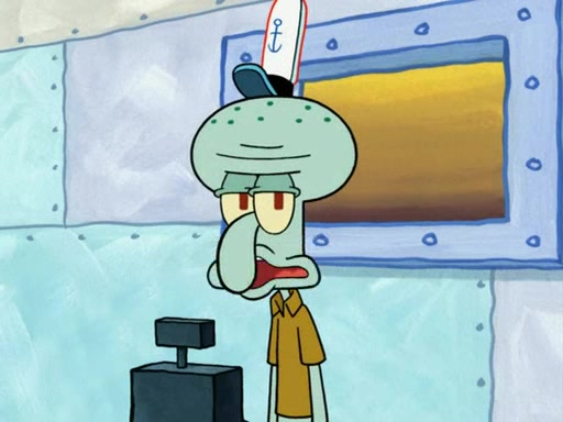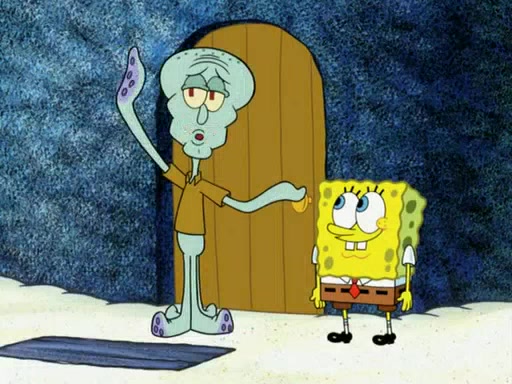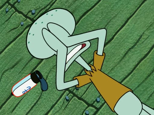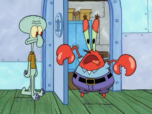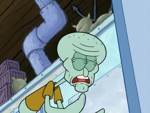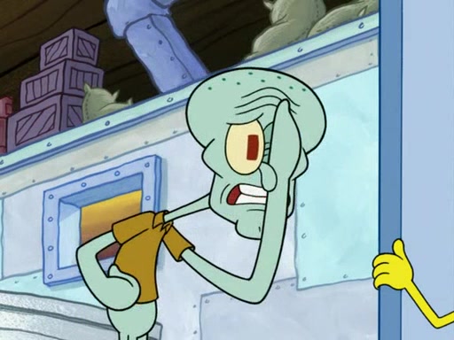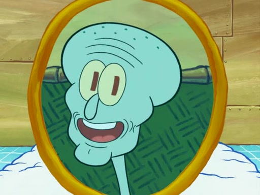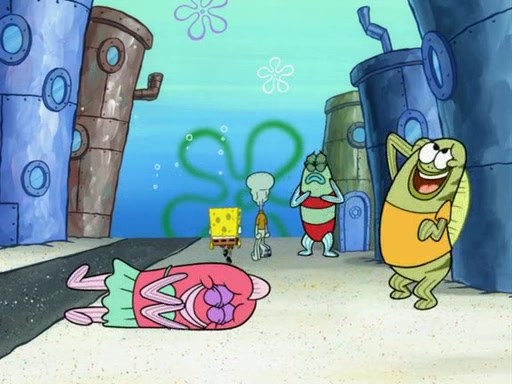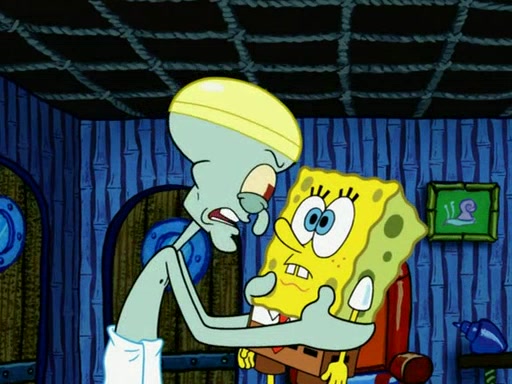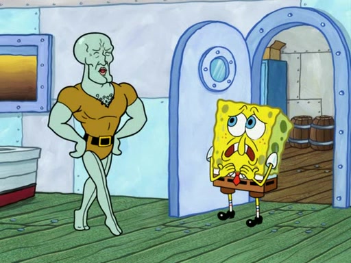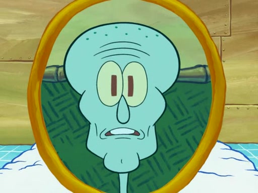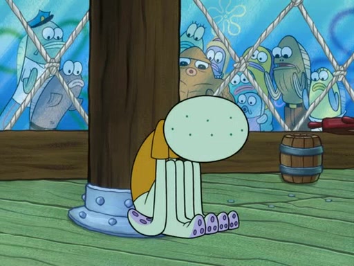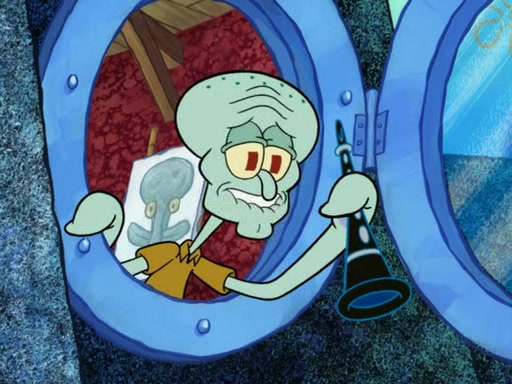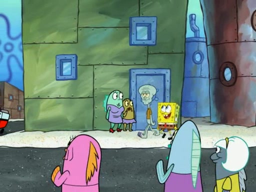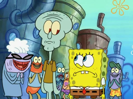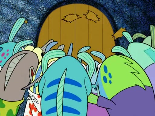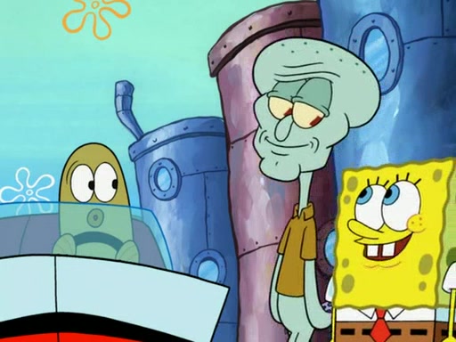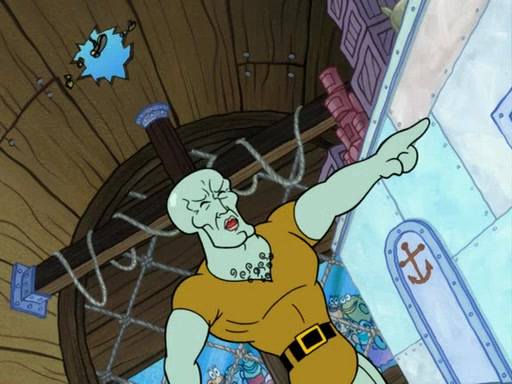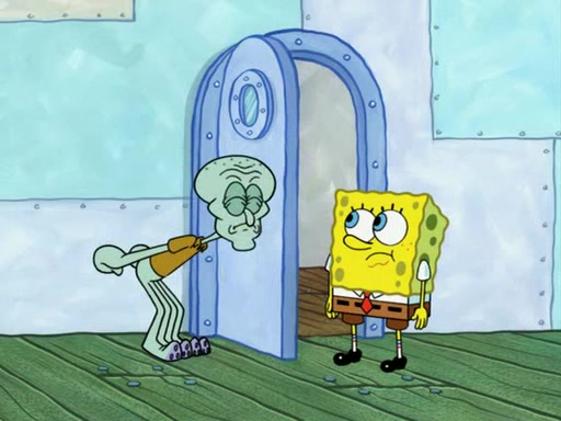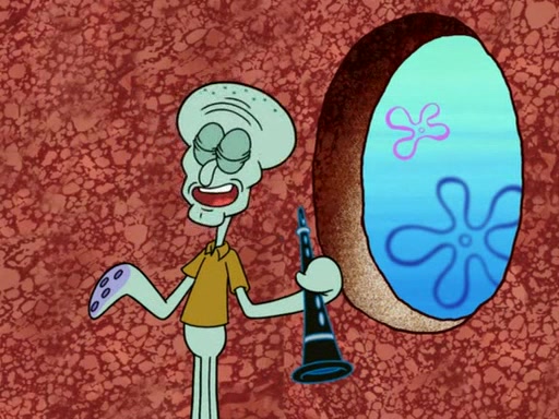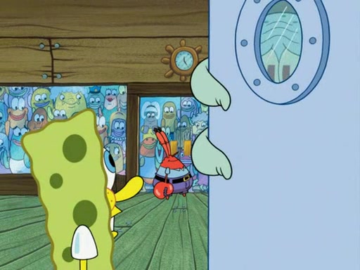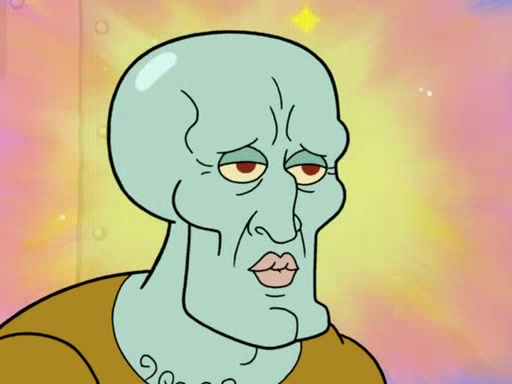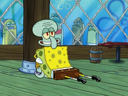 But all that changes when Squidward's fans go crazy and taking his stuff and won't leave him alone. Everything is too much for Squidward so he goes to SpongeBob for help. Squidward wants to become his normal self, so he and SpongeBob races to Krusty Krab with the crowd following them. Mr. Krabs becomes overjoyed to see everyone at the entrance, and begins to name all the prices. While he does that, Squidward tells SpongeBob to slam the door against his face in order to make him normal again. SpongeBob doesn't want to do it, but Squidward threatens to hurt SpongeBob if he doesn't hurt him. So he begins to slam the door against Squidward's face repeatedly, but it only makes Squidward even more handsome. Suddenly, the flying fish's other bowling shoe, falls out of the top, and SpongeBob, who was alarmed by it, pushes Squidward out of the way. SpongeBob's push sends Squidward flying dramatically and causes him to hit a pole, while the shoe just bounces off of SpongeBob's head. The blow from the pole causes Squidward's face to become normal again. The crowd, who is disappointed to see Squidward not handsome anymore, begins to walk away miserably, but Mr. Krabs, who is unhappy to see his beloved customers go away, tries to return Squidward's handsomeness by slamming the door repeatedly against his face.