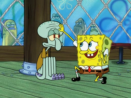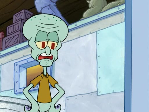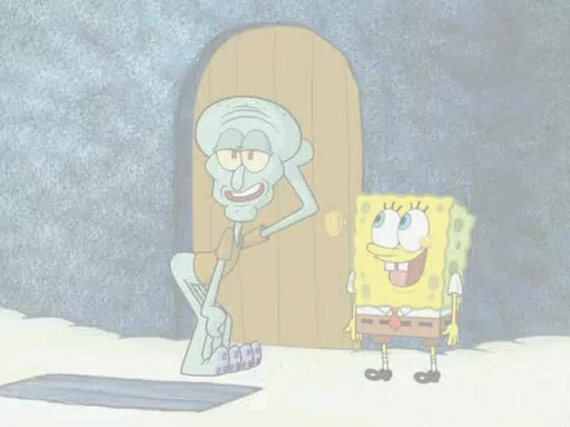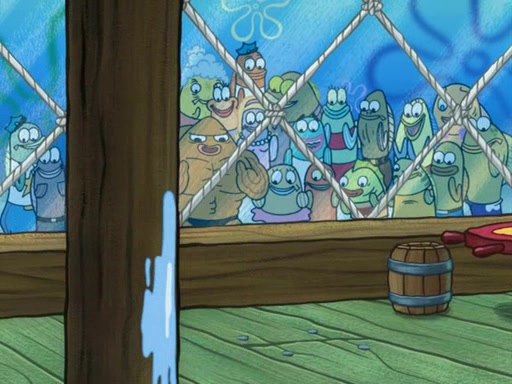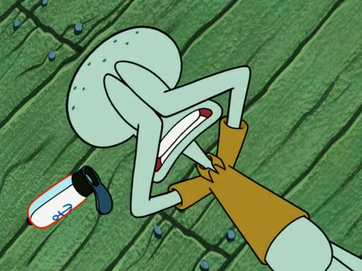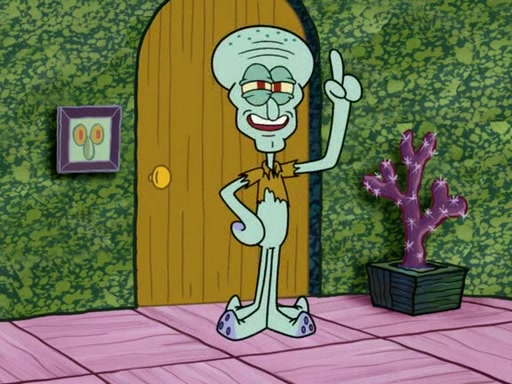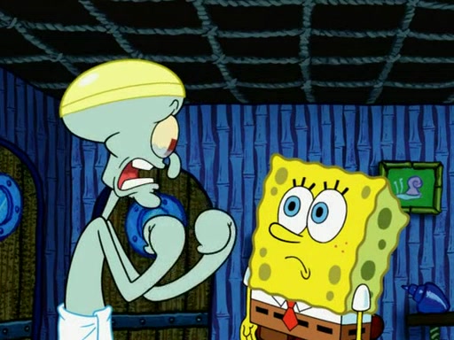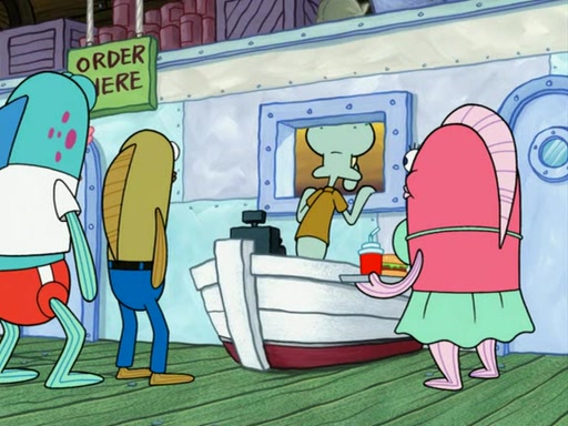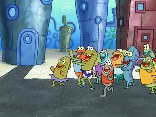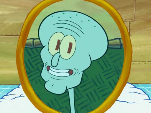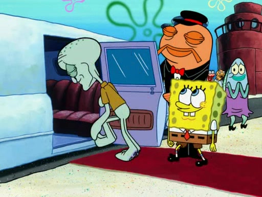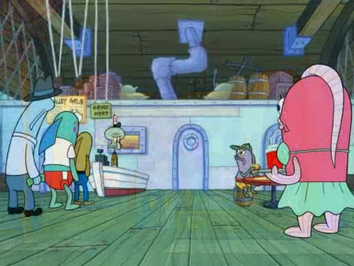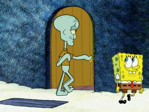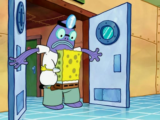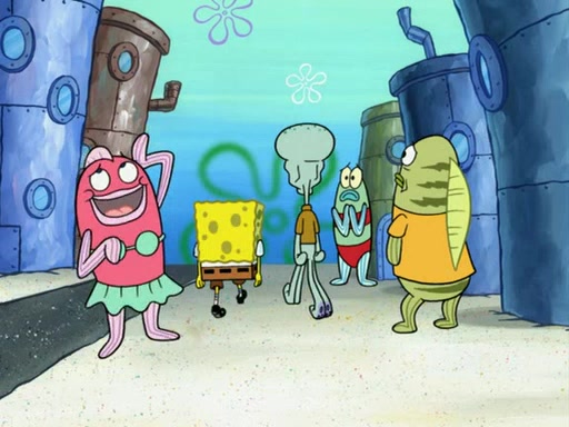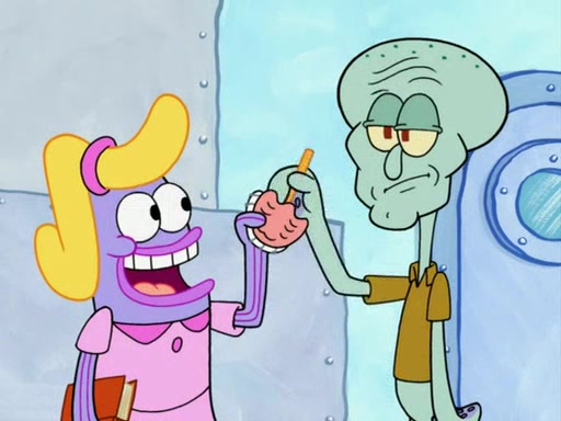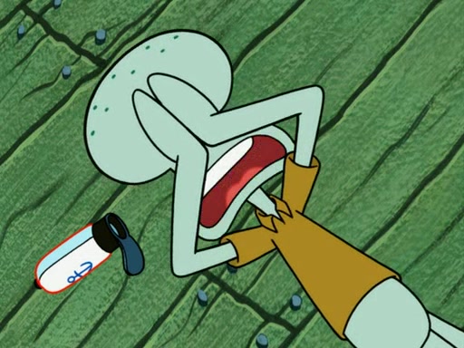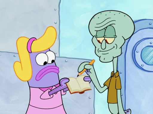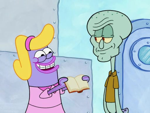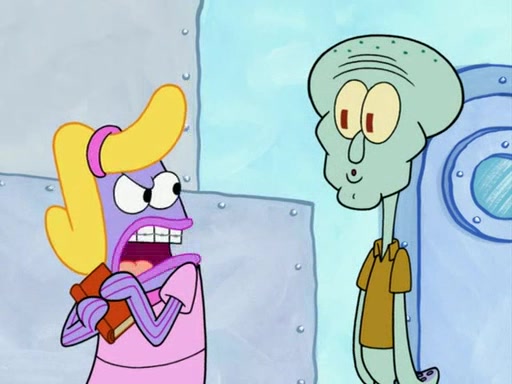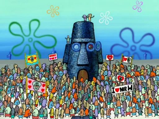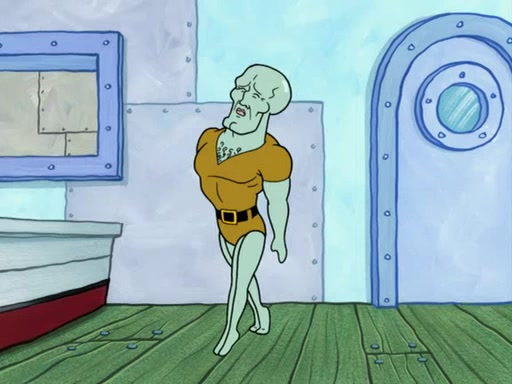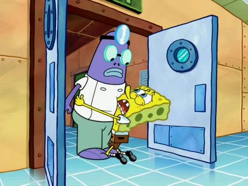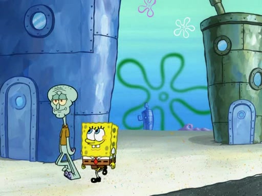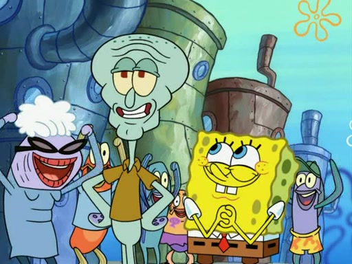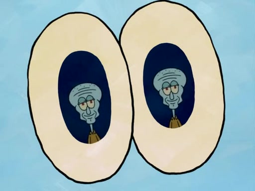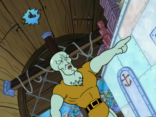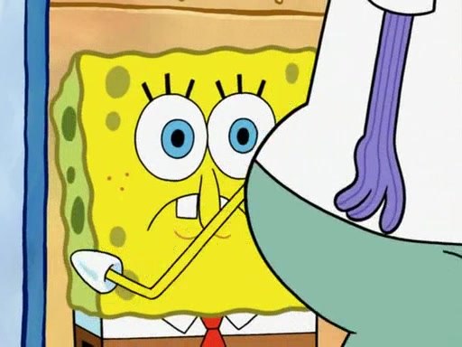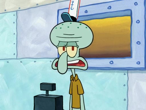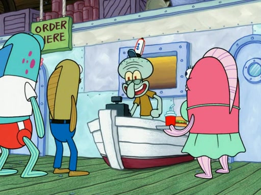 But all that changes when Squidward's fans go crazy and taking his stuff and won't leave him alone. Everything is too much for Squidward so he goes to SpongeBob for help. Squidward wants to become his normal self, so he and SpongeBob races to Krusty Krab with the crowd following them. Mr. Krabs becomes overjoyed to see everyone at the entrance, and begins to name all the prices. While he does that, Squidward tells SpongeBob to slam the door against his face in order to make him normal again. SpongeBob doesn't want to do it, but Squidward threatens to hurt SpongeBob if he doesn't hurt him. So he begins to slam the door against Squidward's face repeatedly, but it only makes Squidward even more handsome. Suddenly, the flying fish's other bowling shoe, falls out of the top, and SpongeBob, who was alarmed by it, pushes Squidward out of the way. SpongeBob's push sends Squidward flying dramatically and causes him to hit a pole, while the shoe just bounces off of SpongeBob's head. The blow from the pole causes Squidward's face to become normal again. The crowd, who is disappointed to see Squidward not handsome anymore, begins to walk away miserably, but Mr. Krabs, who is unhappy to see his beloved customers go away, tries to return Squidward's handsomeness by slamming the door repeatedly against his face.