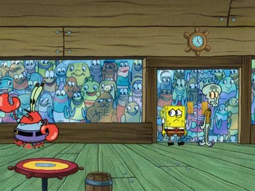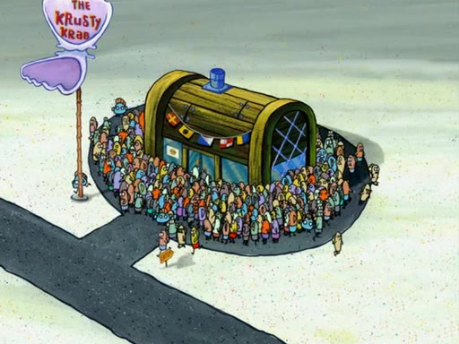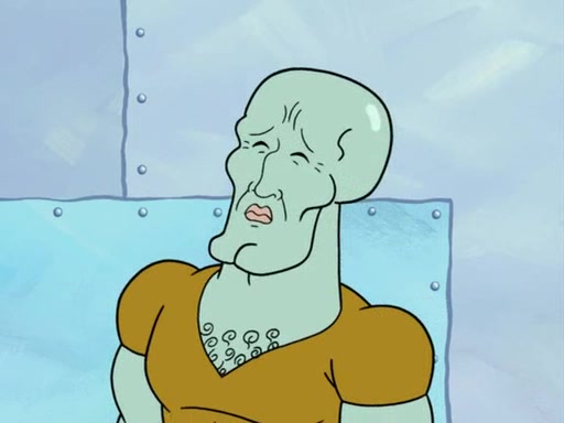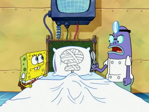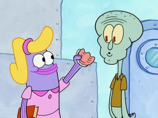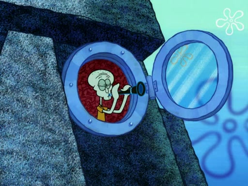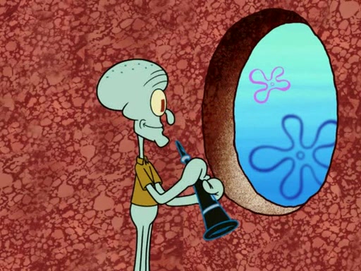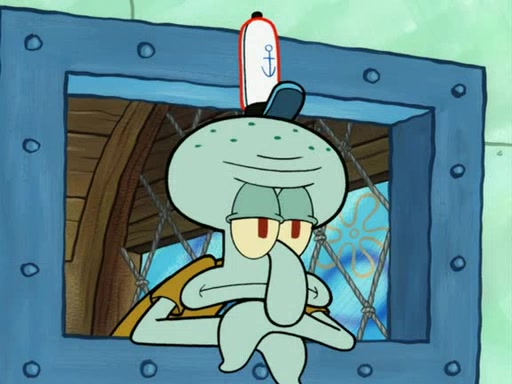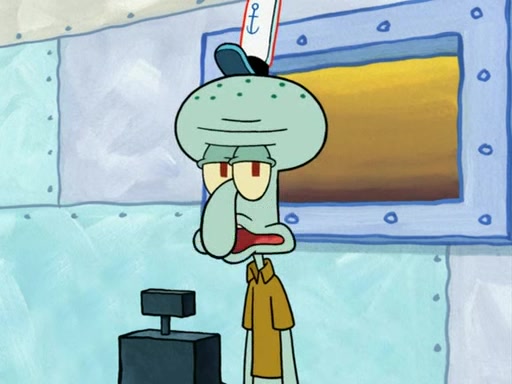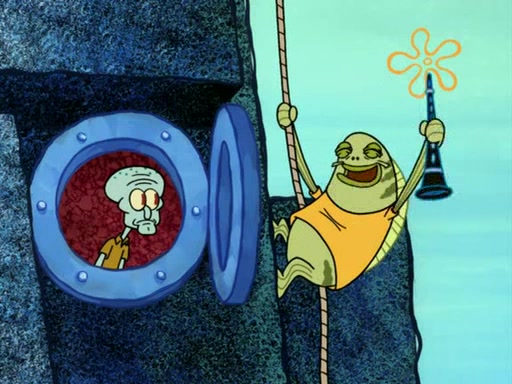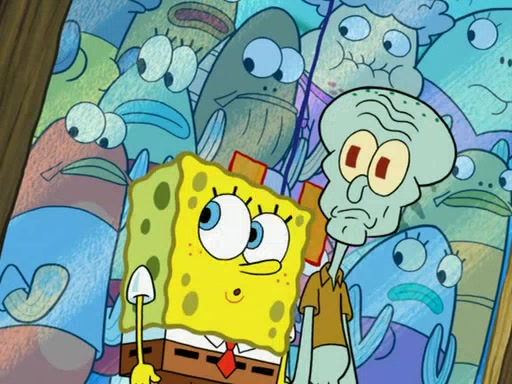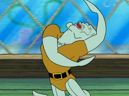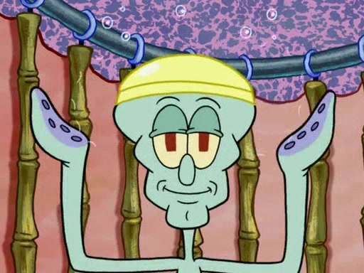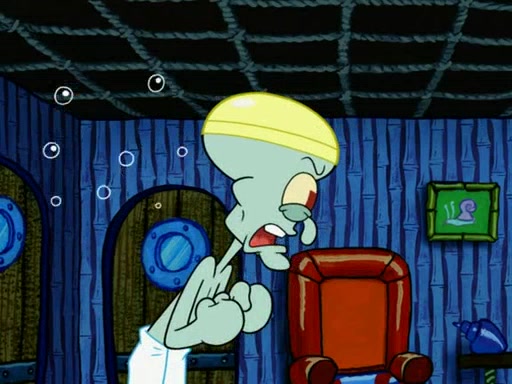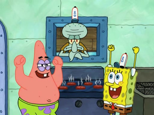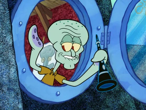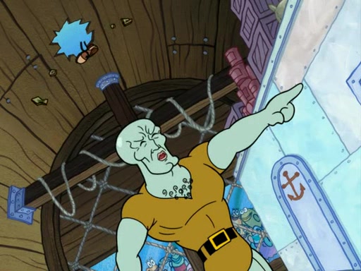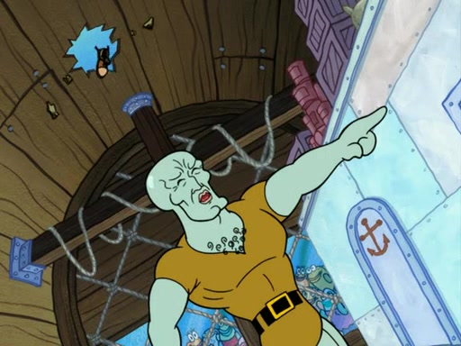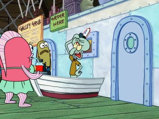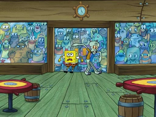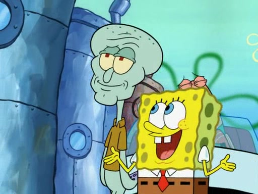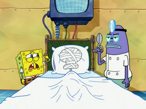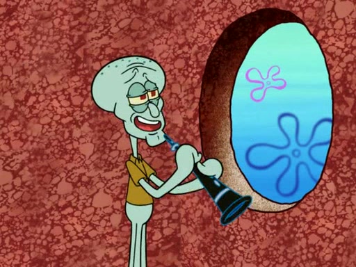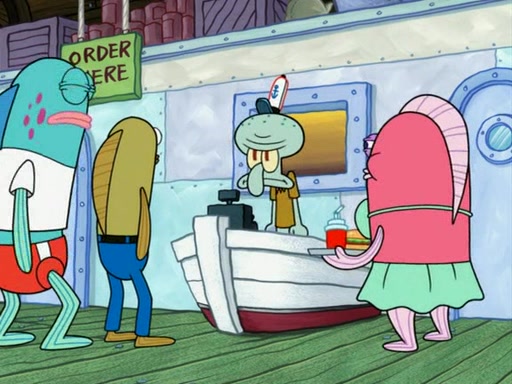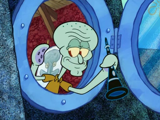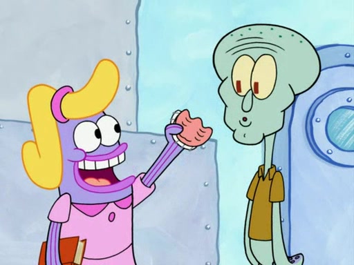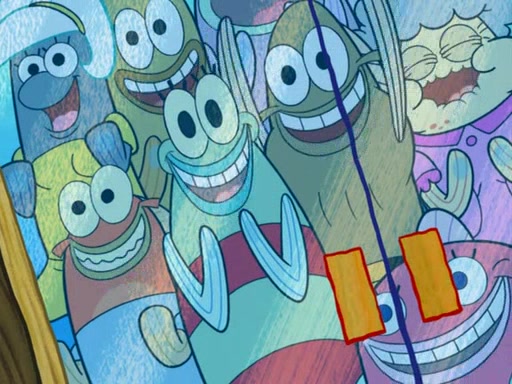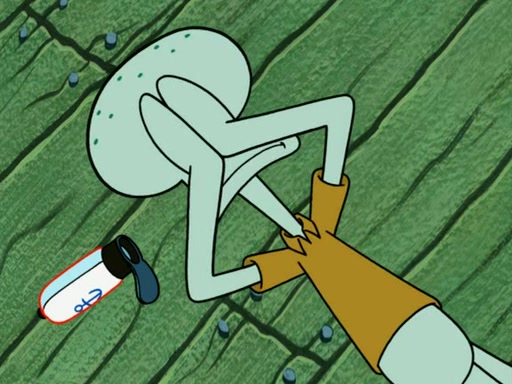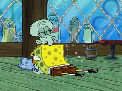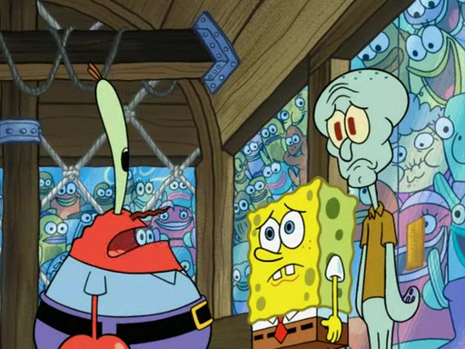 But all that changes when Squidward's fans go crazy and taking his stuff and won't leave him alone. Everything is too much for Squidward so he goes to SpongeBob for help. Squidward wants to become his normal self, so he and SpongeBob races to Krusty Krab with the crowd following them. Mr. Krabs becomes overjoyed to see everyone at the entrance, and begins to name all the prices. While he does that, Squidward tells SpongeBob to slam the door against his face in order to make him normal again. SpongeBob doesn't want to do it, but Squidward threatens to hurt SpongeBob if he doesn't hurt him. So he begins to slam the door against Squidward's face repeatedly, but it only makes Squidward even more handsome. Suddenly, the flying fish's other bowling shoe, falls out of the top, and SpongeBob, who was alarmed by it, pushes Squidward out of the way. SpongeBob's push sends Squidward flying dramatically and causes him to hit a pole, while the shoe just bounces off of SpongeBob's head. The blow from the pole causes Squidward's face to become normal again. The crowd, who is disappointed to see Squidward not handsome anymore, begins to walk away miserably, but Mr. Krabs, who is unhappy to see his beloved customers go away, tries to return Squidward's handsomeness by slamming the door repeatedly against his face.