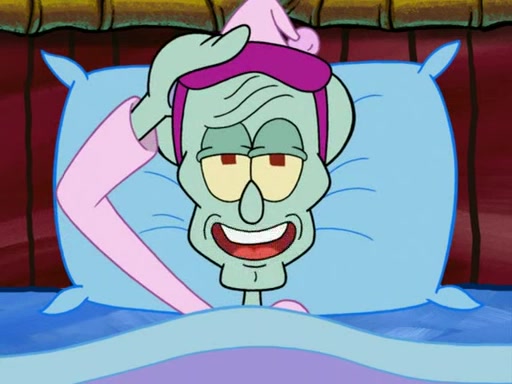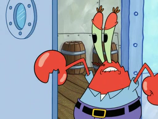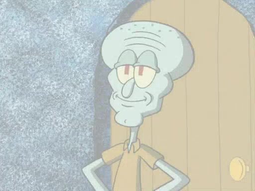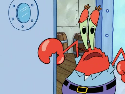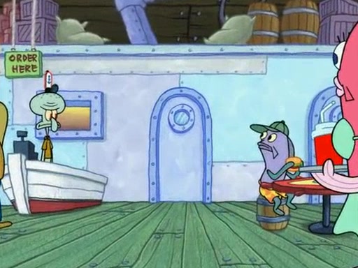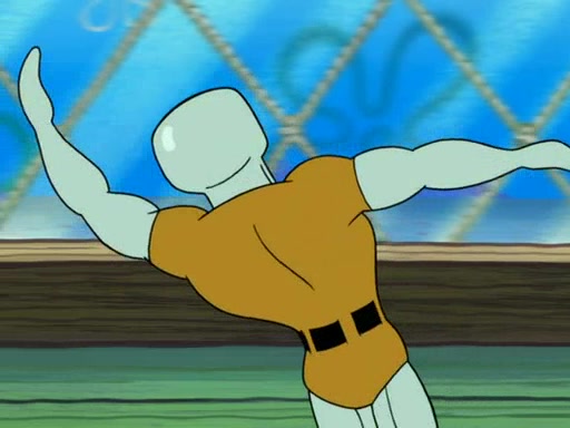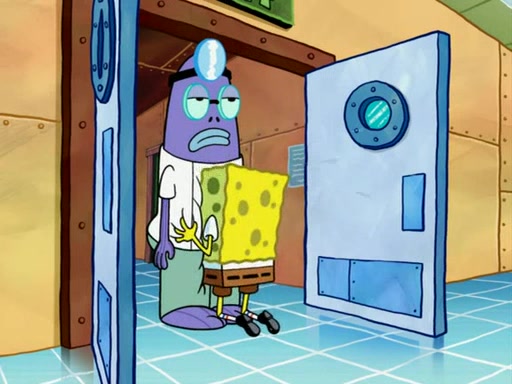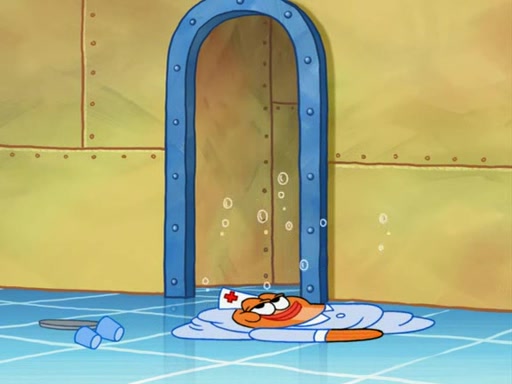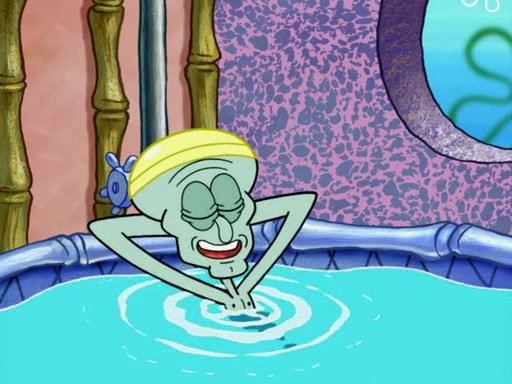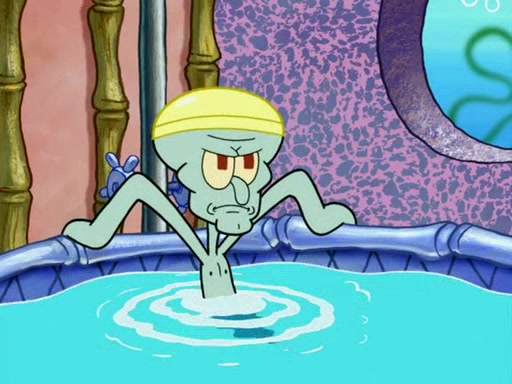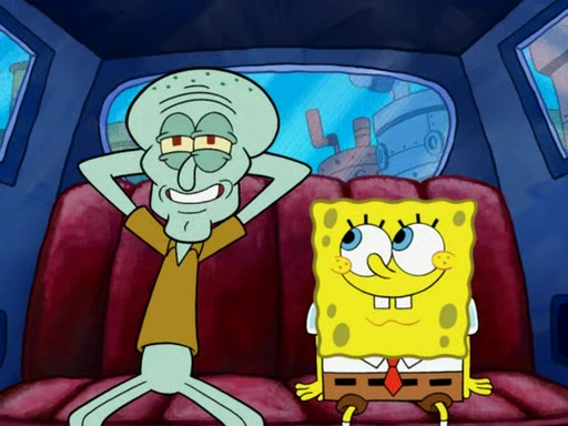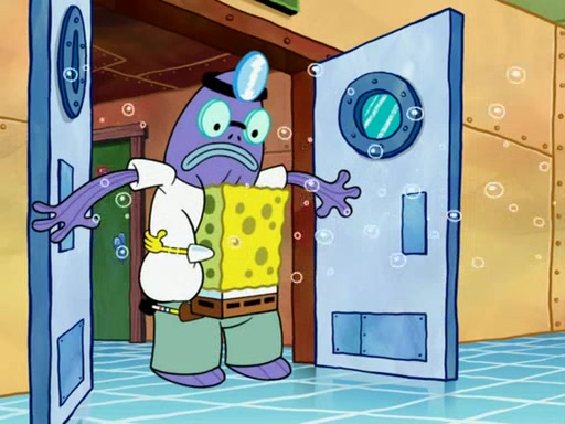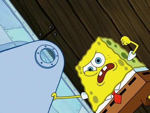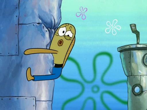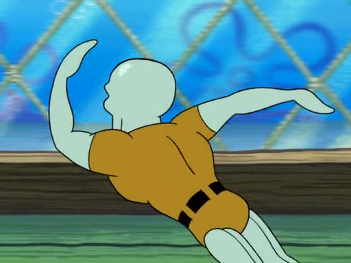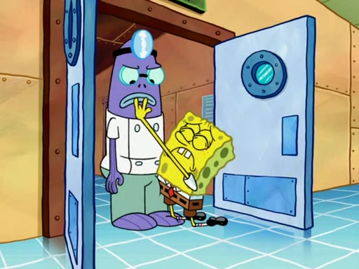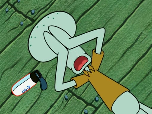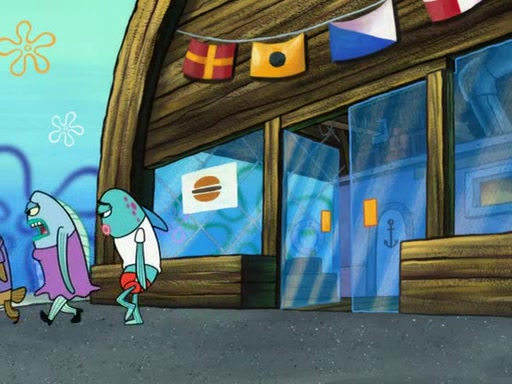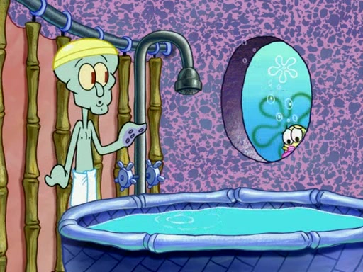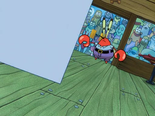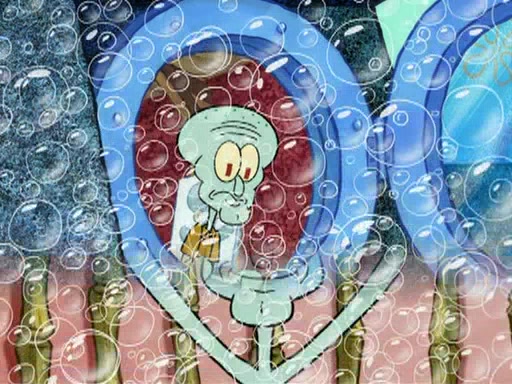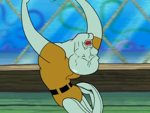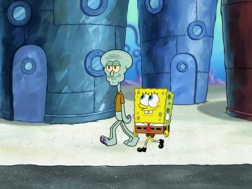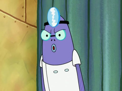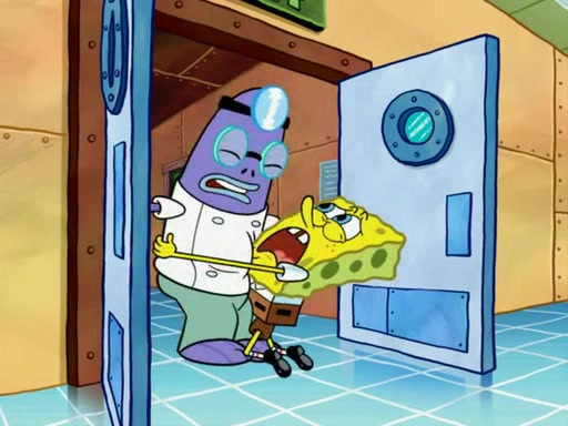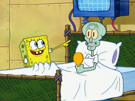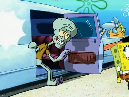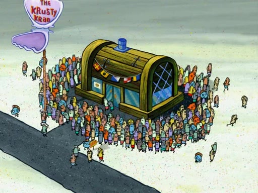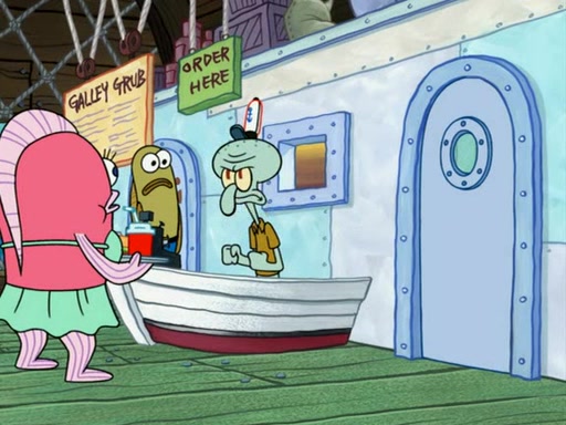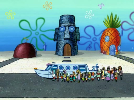 But all that changes when Squidward's fans go crazy and taking his stuff and won't leave him alone. Everything is too much for Squidward so he goes to SpongeBob for help. Squidward wants to become his normal self, so he and SpongeBob races to Krusty Krab with the crowd following them. Mr. Krabs becomes overjoyed to see everyone at the entrance, and begins to name all the prices. While he does that, Squidward tells SpongeBob to slam the door against his face in order to make him normal again. SpongeBob doesn't want to do it, but Squidward threatens to hurt SpongeBob if he doesn't hurt him. So he begins to slam the door against Squidward's face repeatedly, but it only makes Squidward even more handsome. Suddenly, the flying fish's other bowling shoe, falls out of the top, and SpongeBob, who was alarmed by it, pushes Squidward out of the way. SpongeBob's push sends Squidward flying dramatically and causes him to hit a pole, while the shoe just bounces off of SpongeBob's head. The blow from the pole causes Squidward's face to become normal again. The crowd, who is disappointed to see Squidward not handsome anymore, begins to walk away miserably, but Mr. Krabs, who is unhappy to see his beloved customers go away, tries to return Squidward's handsomeness by slamming the door repeatedly against his face.