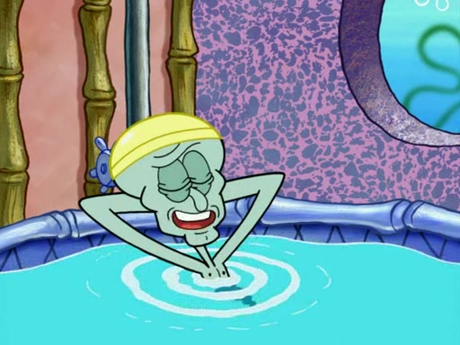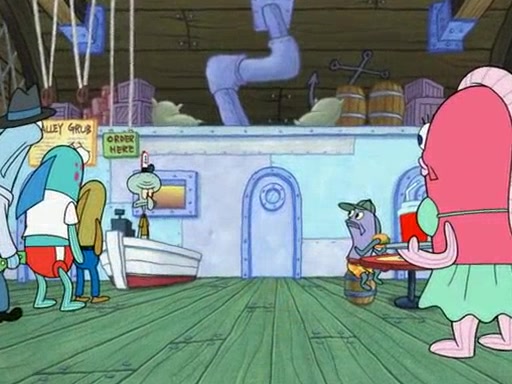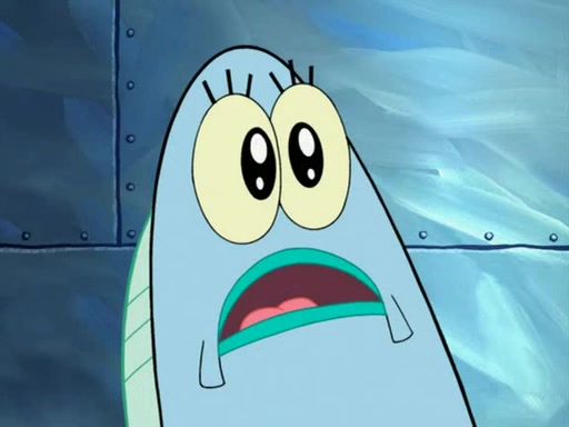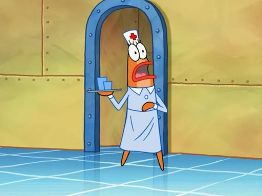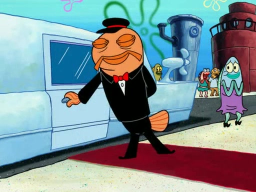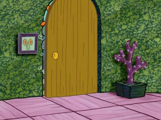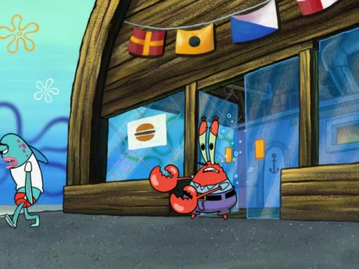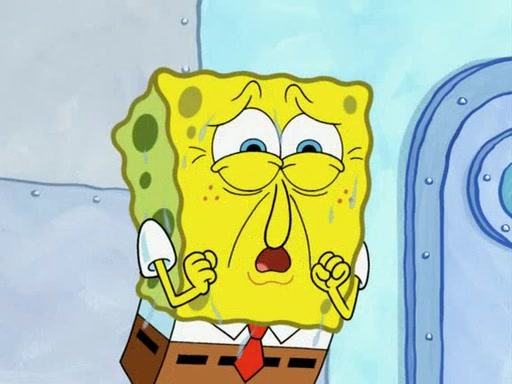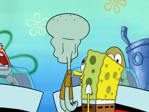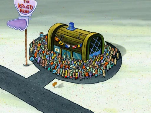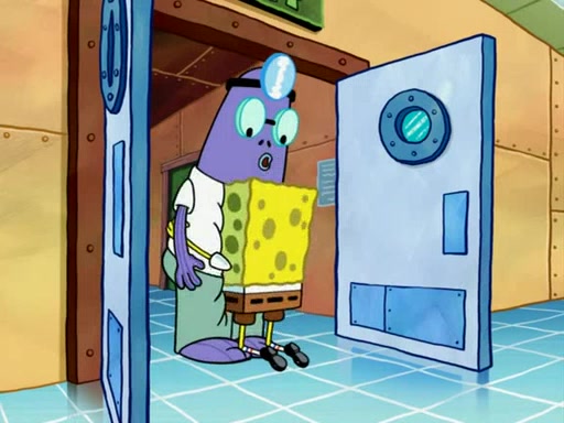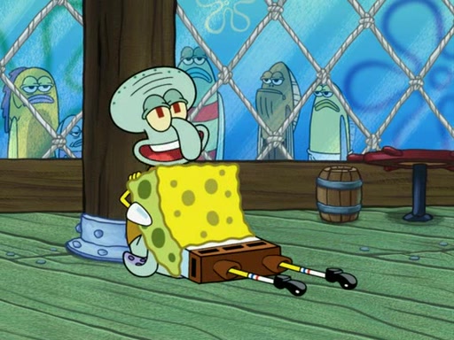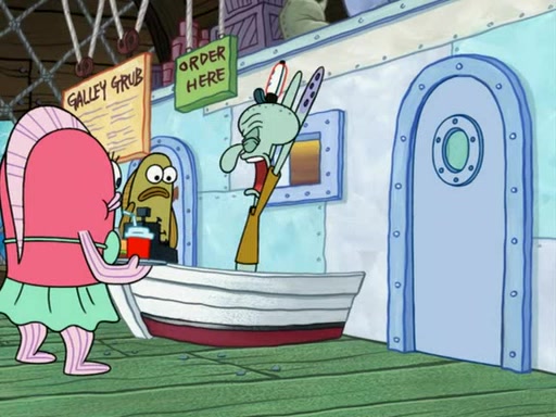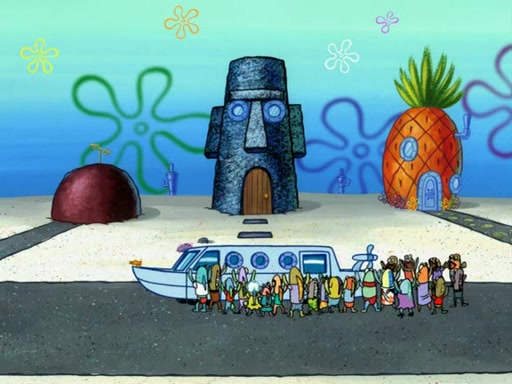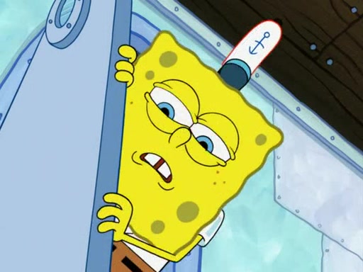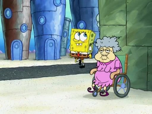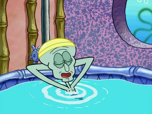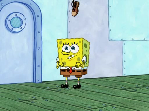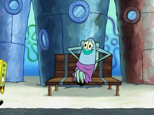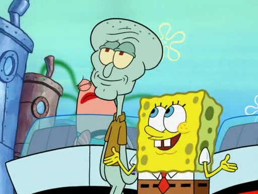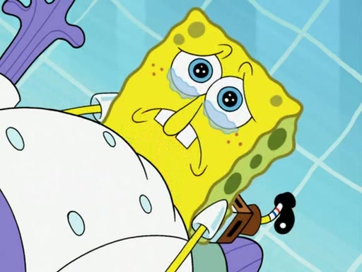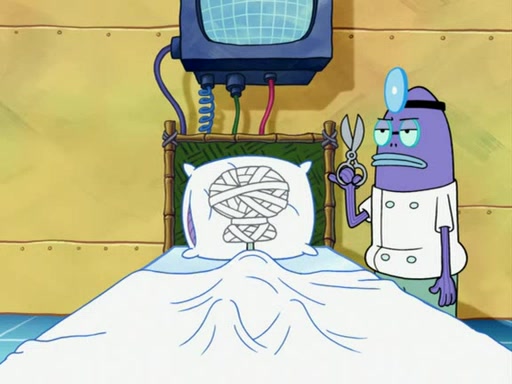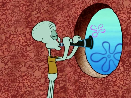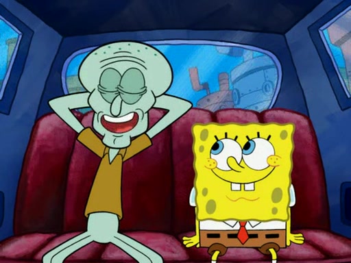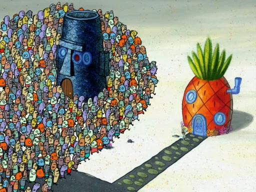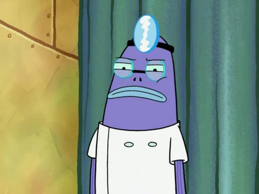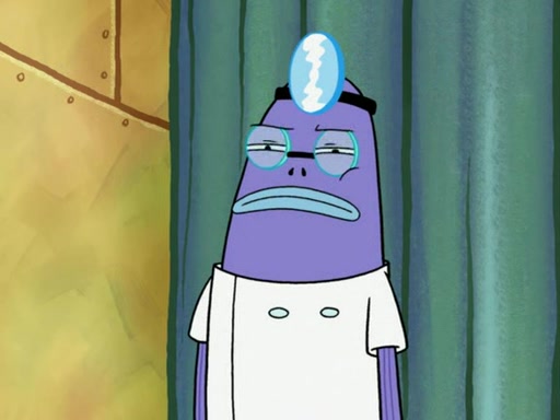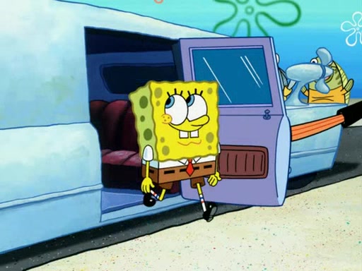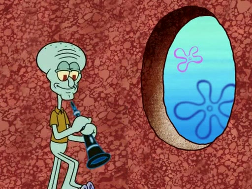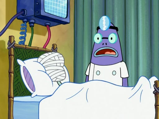 But all that changes when Squidward's fans go crazy and taking his stuff and won't leave him alone. Everything is too much for Squidward so he goes to SpongeBob for help. Squidward wants to become his normal self, so he and SpongeBob races to Krusty Krab with the crowd following them. Mr. Krabs becomes overjoyed to see everyone at the entrance, and begins to name all the prices. While he does that, Squidward tells SpongeBob to slam the door against his face in order to make him normal again. SpongeBob doesn't want to do it, but Squidward threatens to hurt SpongeBob if he doesn't hurt him. So he begins to slam the door against Squidward's face repeatedly, but it only makes Squidward even more handsome. Suddenly, the flying fish's other bowling shoe, falls out of the top, and SpongeBob, who was alarmed by it, pushes Squidward out of the way. SpongeBob's push sends Squidward flying dramatically and causes him to hit a pole, while the shoe just bounces off of SpongeBob's head. The blow from the pole causes Squidward's face to become normal again. The crowd, who is disappointed to see Squidward not handsome anymore, begins to walk away miserably, but Mr. Krabs, who is unhappy to see his beloved customers go away, tries to return Squidward's handsomeness by slamming the door repeatedly against his face.