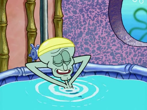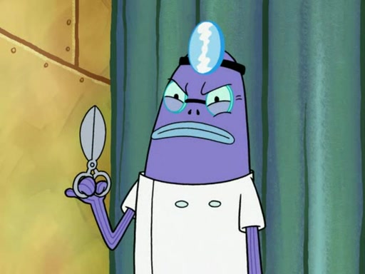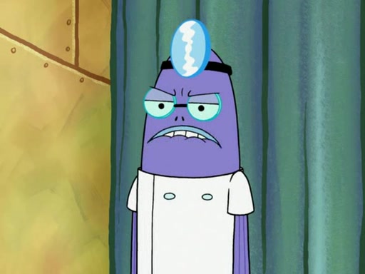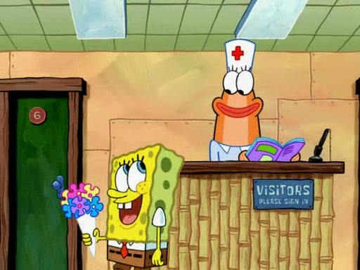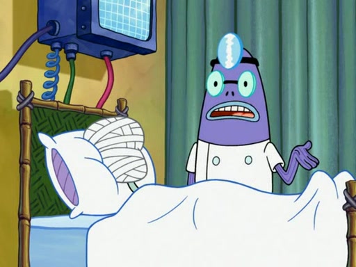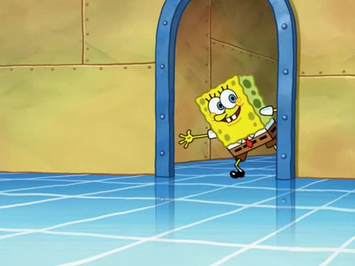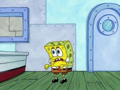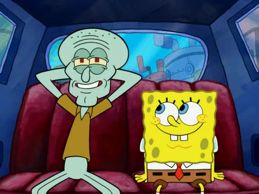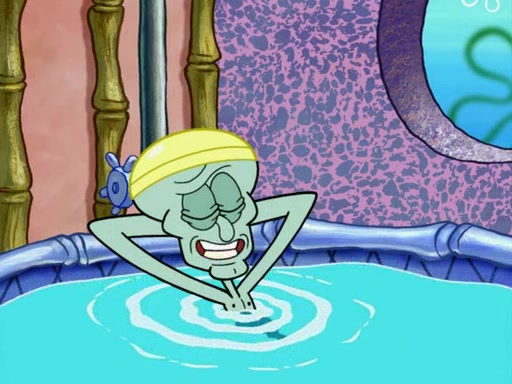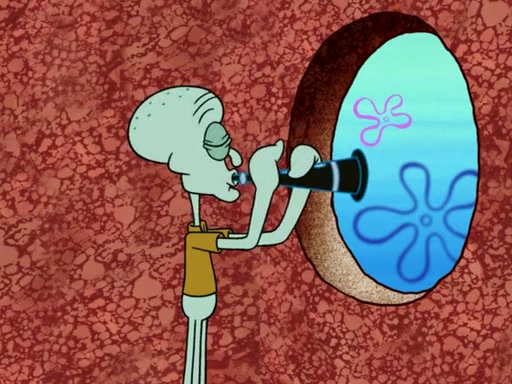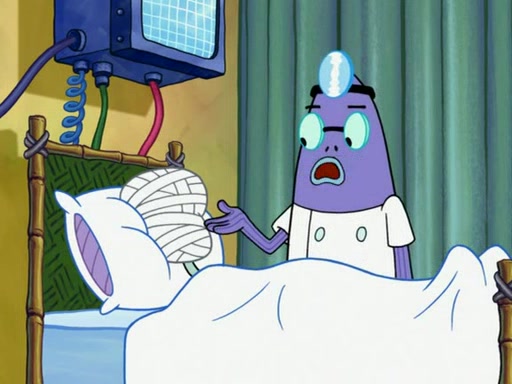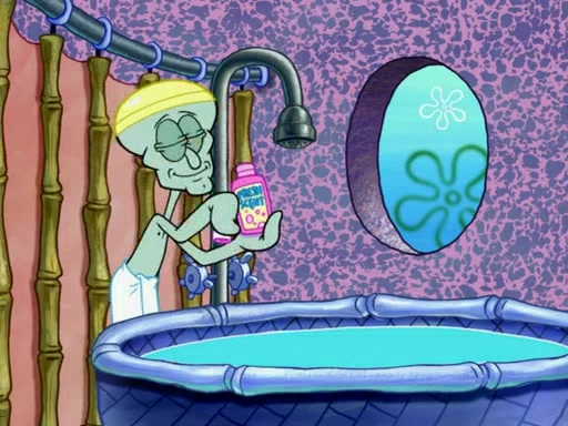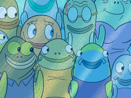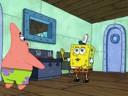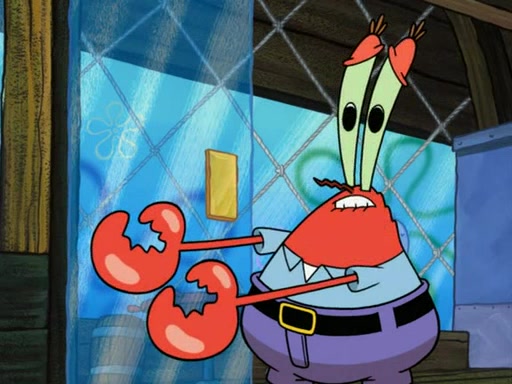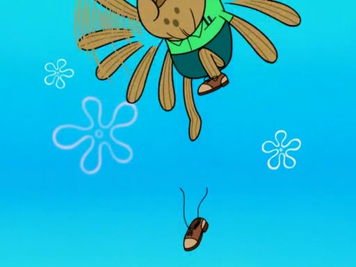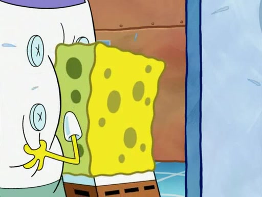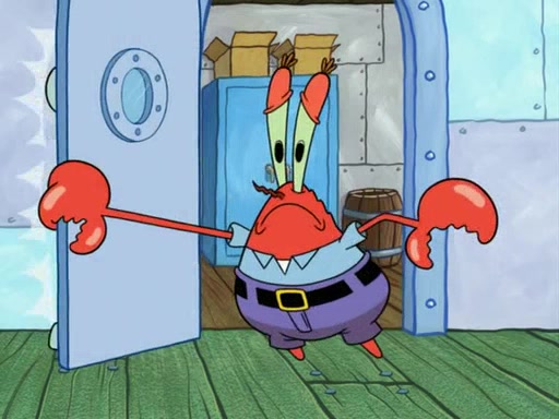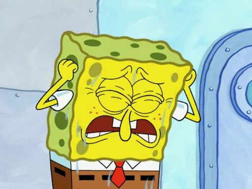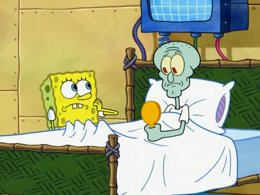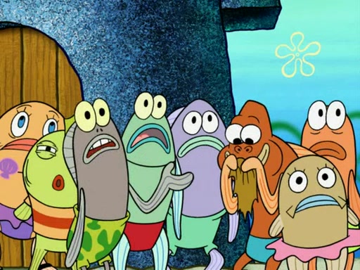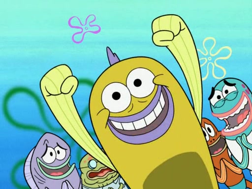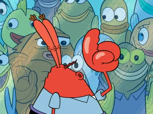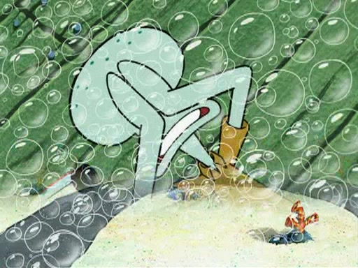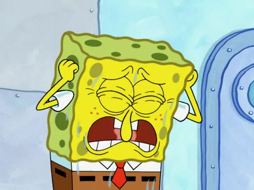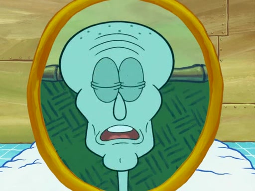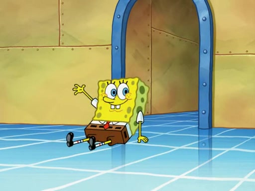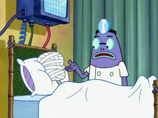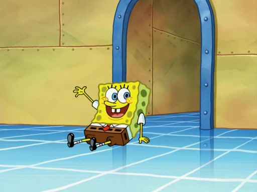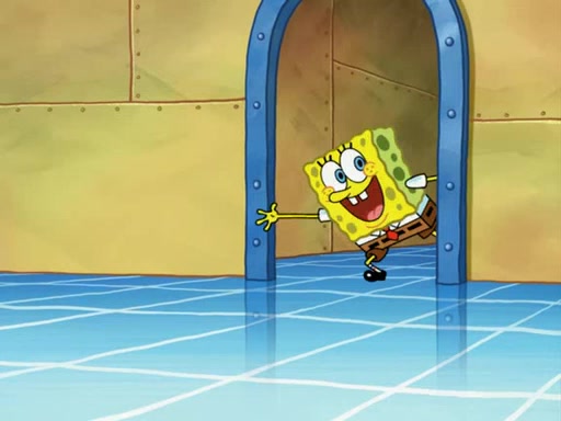But all that changes when Squidward's fans go crazy and taking his stuff and won't leave him alone. Everything is too much for Squidward so he goes to SpongeBob for help. Squidward wants to become his normal self, so he and SpongeBob races to Krusty Krab with the crowd following them. Mr. Krabs becomes overjoyed to see everyone at the entrance, and begins to name all the prices. While he does that, Squidward tells SpongeBob to slam the door against his face in order to make him normal again. SpongeBob doesn't want to do it, but Squidward threatens to hurt SpongeBob if he doesn't hurt him. So he begins to slam the door against Squidward's face repeatedly, but it only makes Squidward even more handsome. Suddenly, the flying fish's other bowling shoe, falls out of the top, and SpongeBob, who was alarmed by it, pushes Squidward out of the way. SpongeBob's push sends Squidward flying dramatically and causes him to hit a pole, while the shoe just bounces off of SpongeBob's head. The blow from the pole causes Squidward's face to become normal again. The crowd, who is disappointed to see Squidward not handsome anymore, begins to walk away miserably, but Mr. Krabs, who is unhappy to see his beloved customers go away, tries to return Squidward's handsomeness by slamming the door repeatedly against his face.