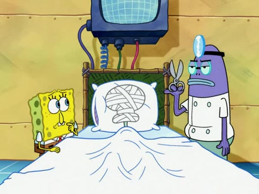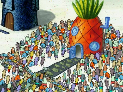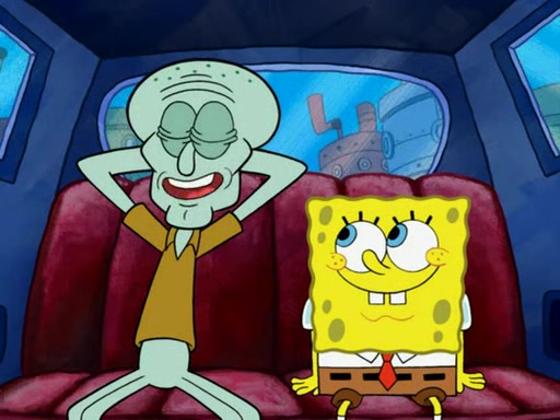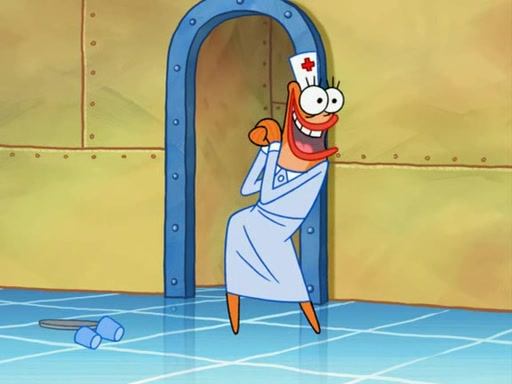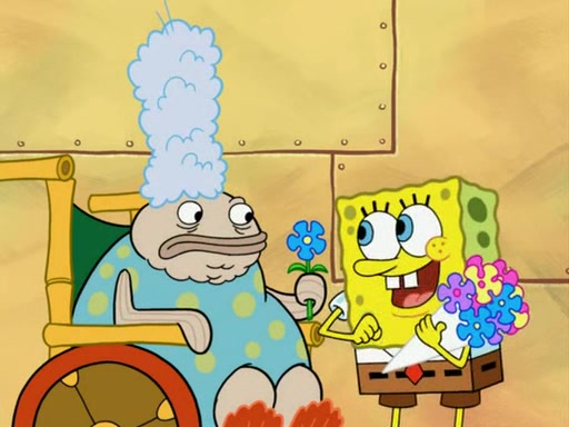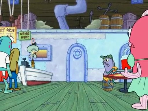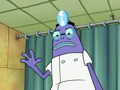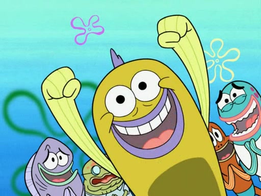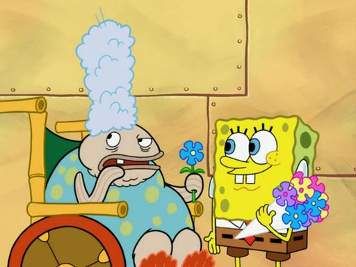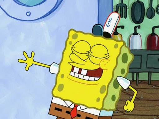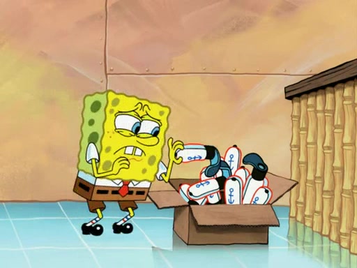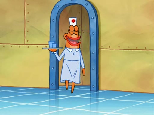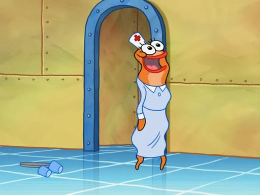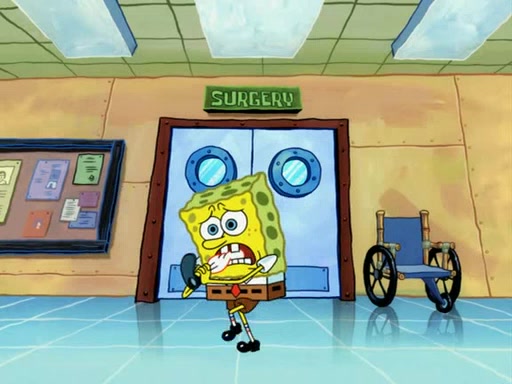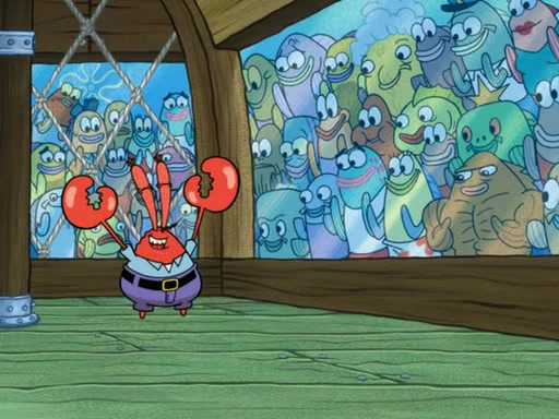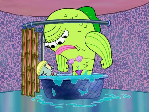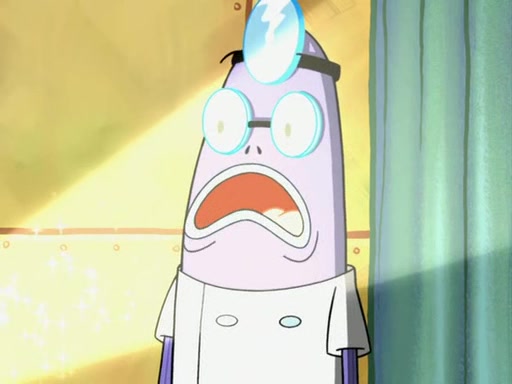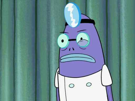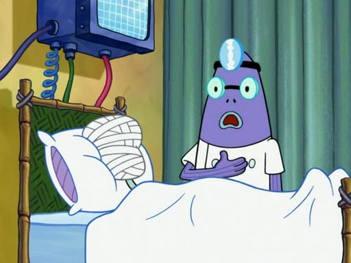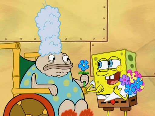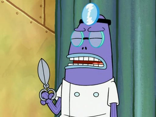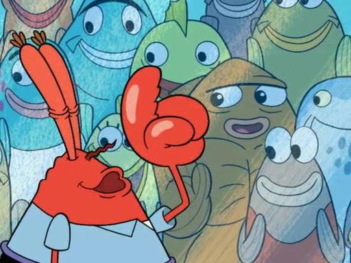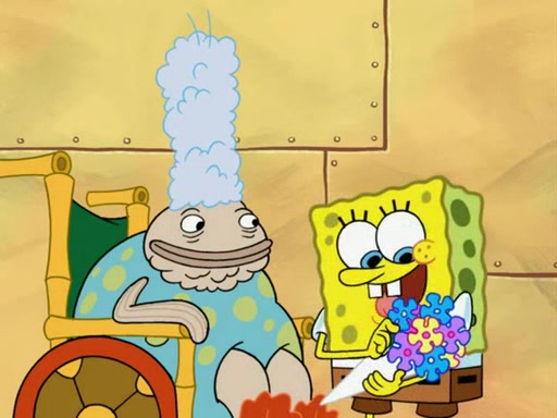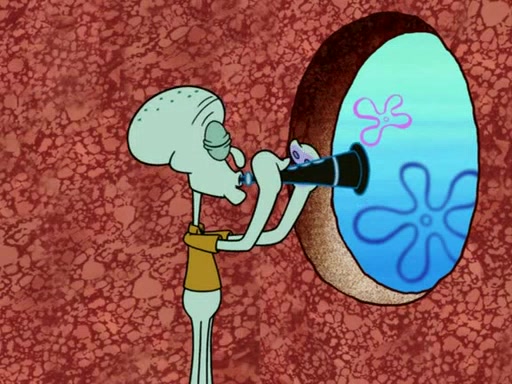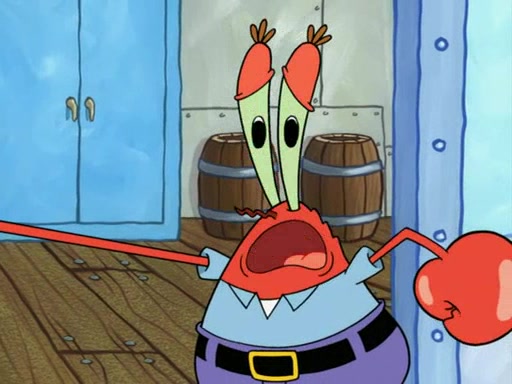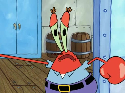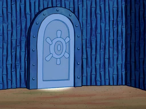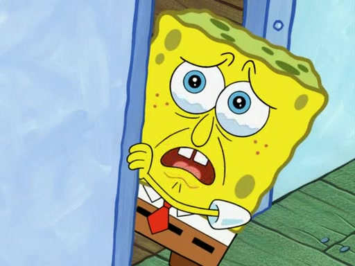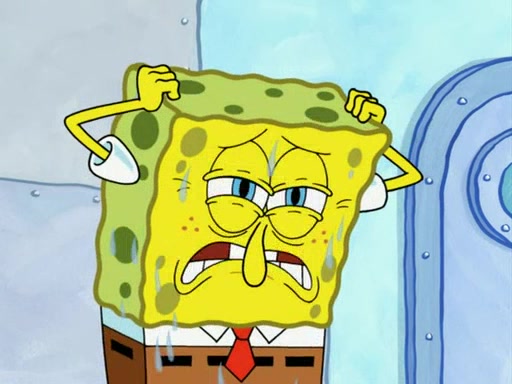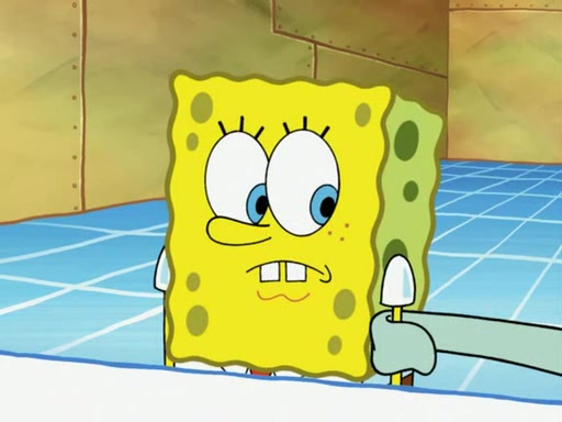 But all that changes when Squidward's fans go crazy and taking his stuff and won't leave him alone. Everything is too much for Squidward so he goes to SpongeBob for help. Squidward wants to become his normal self, so he and SpongeBob races to Krusty Krab with the crowd following them. Mr. Krabs becomes overjoyed to see everyone at the entrance, and begins to name all the prices. While he does that, Squidward tells SpongeBob to slam the door against his face in order to make him normal again. SpongeBob doesn't want to do it, but Squidward threatens to hurt SpongeBob if he doesn't hurt him. So he begins to slam the door against Squidward's face repeatedly, but it only makes Squidward even more handsome. Suddenly, the flying fish's other bowling shoe, falls out of the top, and SpongeBob, who was alarmed by it, pushes Squidward out of the way. SpongeBob's push sends Squidward flying dramatically and causes him to hit a pole, while the shoe just bounces off of SpongeBob's head. The blow from the pole causes Squidward's face to become normal again. The crowd, who is disappointed to see Squidward not handsome anymore, begins to walk away miserably, but Mr. Krabs, who is unhappy to see his beloved customers go away, tries to return Squidward's handsomeness by slamming the door repeatedly against his face.