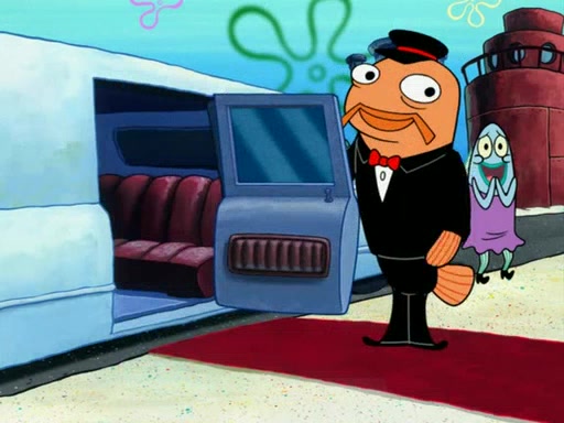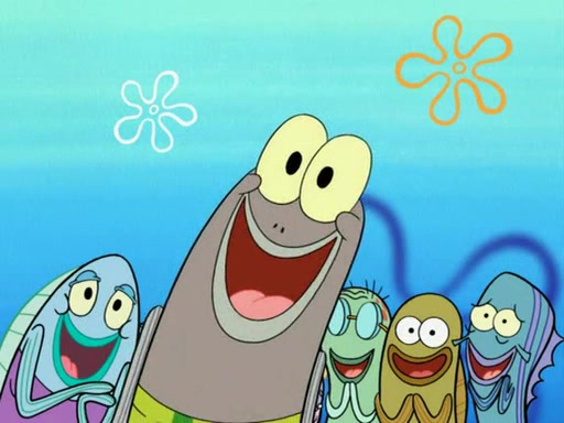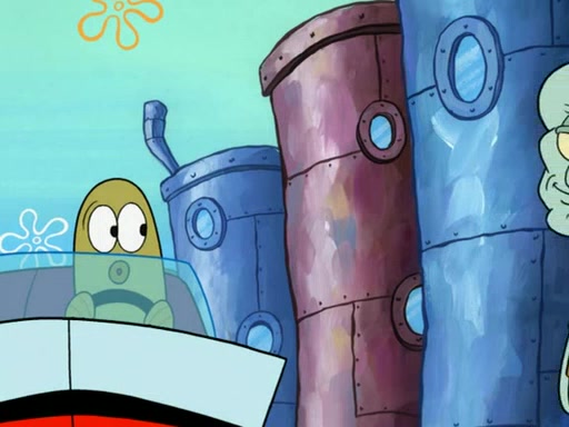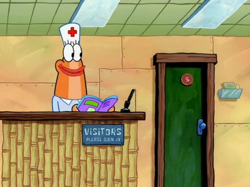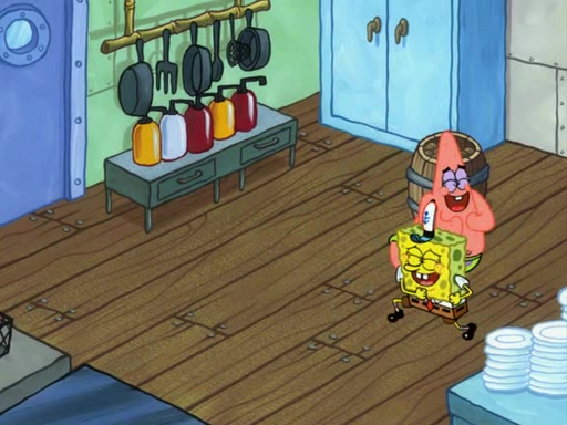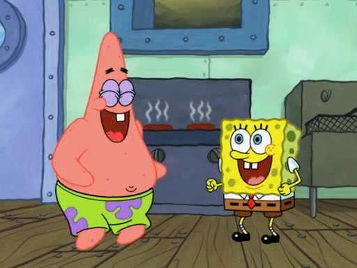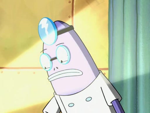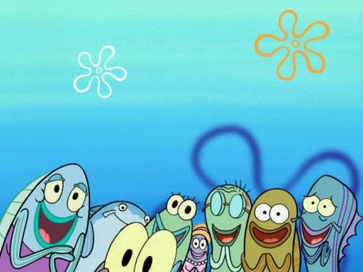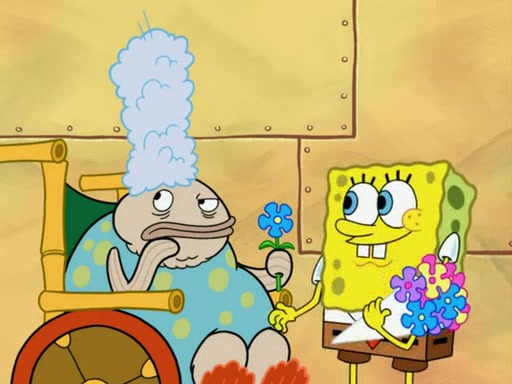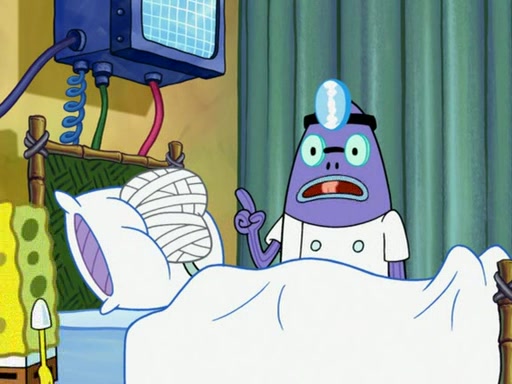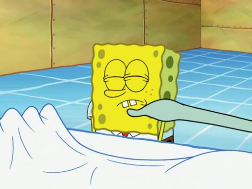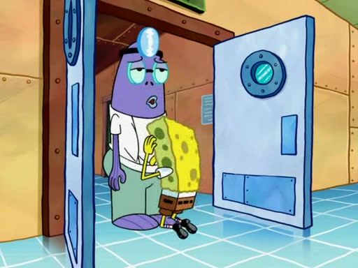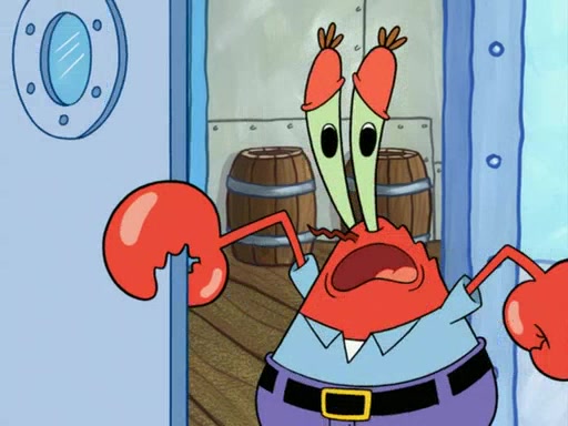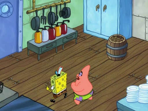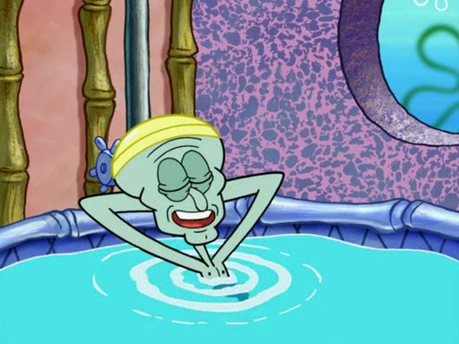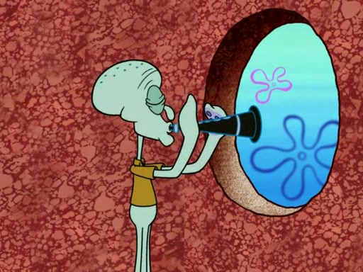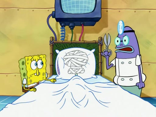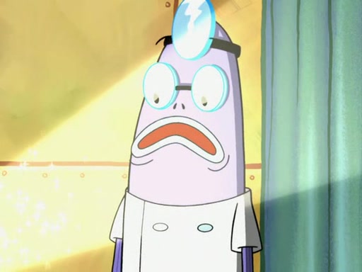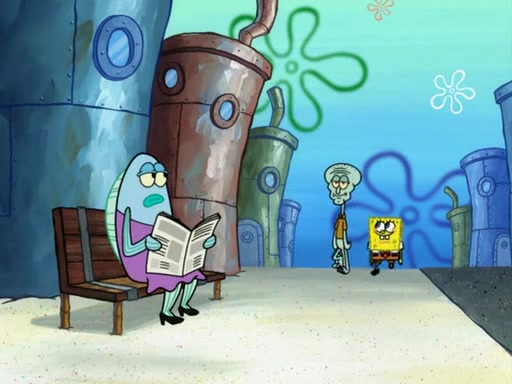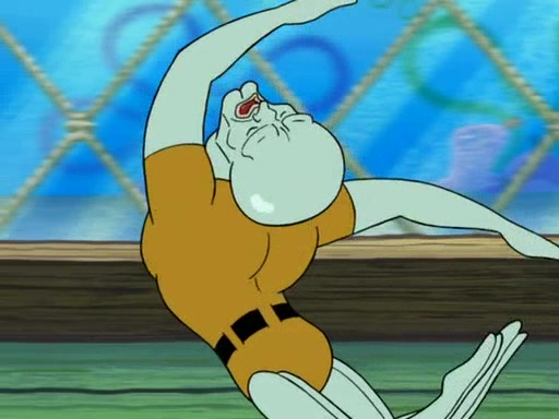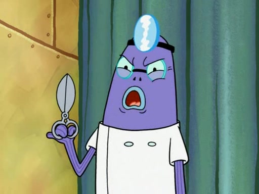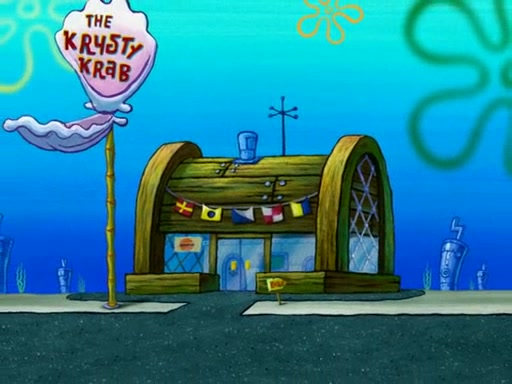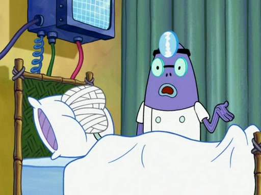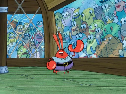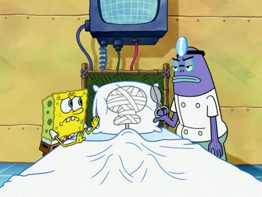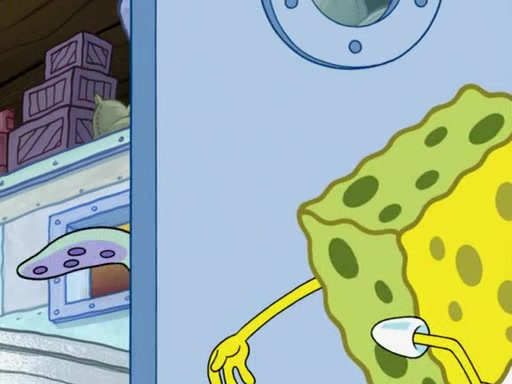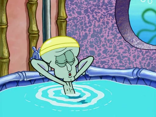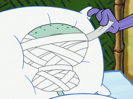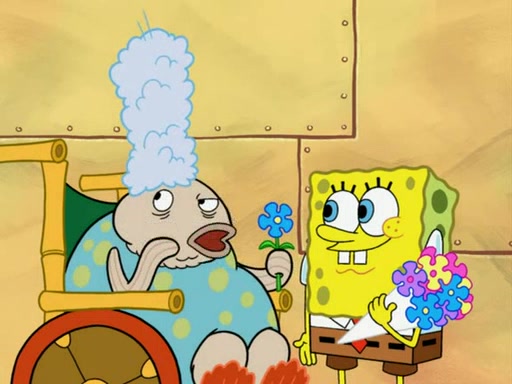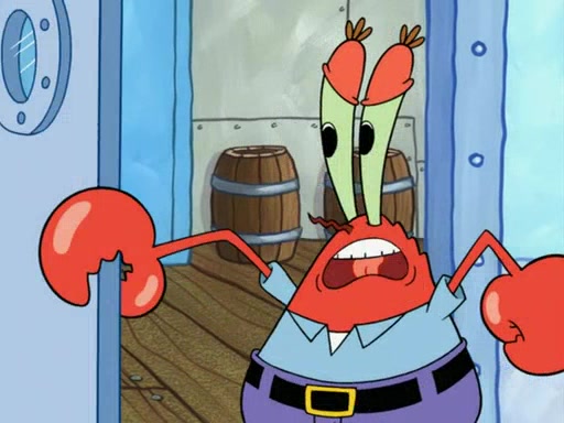 But all that changes when Squidward's fans go crazy and taking his stuff and won't leave him alone. Everything is too much for Squidward so he goes to SpongeBob for help. Squidward wants to become his normal self, so he and SpongeBob races to Krusty Krab with the crowd following them. Mr. Krabs becomes overjoyed to see everyone at the entrance, and begins to name all the prices. While he does that, Squidward tells SpongeBob to slam the door against his face in order to make him normal again. SpongeBob doesn't want to do it, but Squidward threatens to hurt SpongeBob if he doesn't hurt him. So he begins to slam the door against Squidward's face repeatedly, but it only makes Squidward even more handsome. Suddenly, the flying fish's other bowling shoe, falls out of the top, and SpongeBob, who was alarmed by it, pushes Squidward out of the way. SpongeBob's push sends Squidward flying dramatically and causes him to hit a pole, while the shoe just bounces off of SpongeBob's head. The blow from the pole causes Squidward's face to become normal again. The crowd, who is disappointed to see Squidward not handsome anymore, begins to walk away miserably, but Mr. Krabs, who is unhappy to see his beloved customers go away, tries to return Squidward's handsomeness by slamming the door repeatedly against his face.