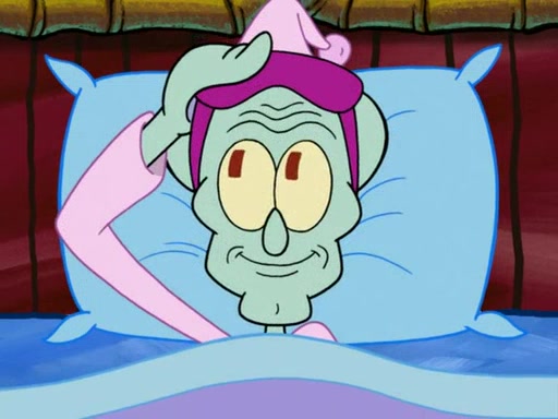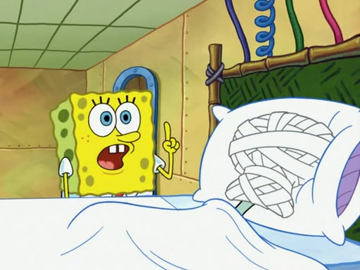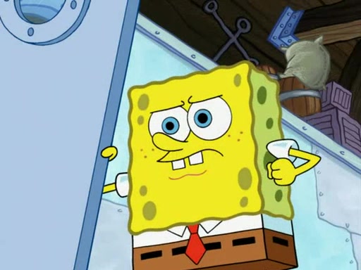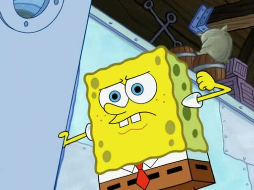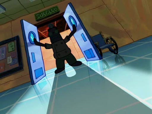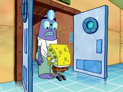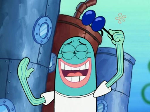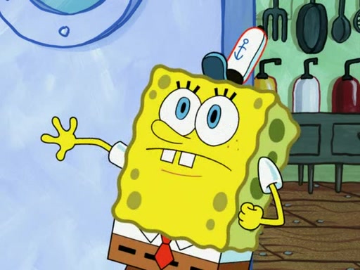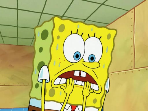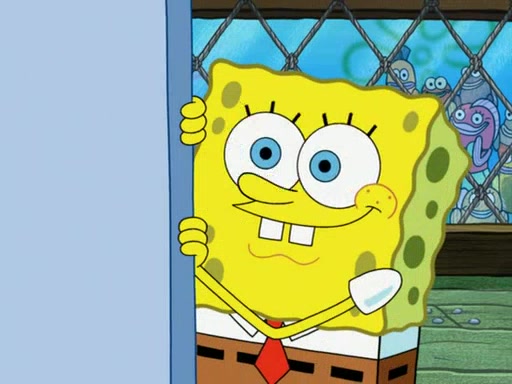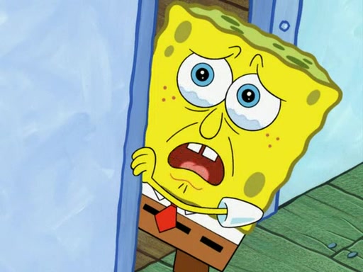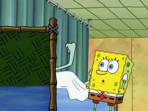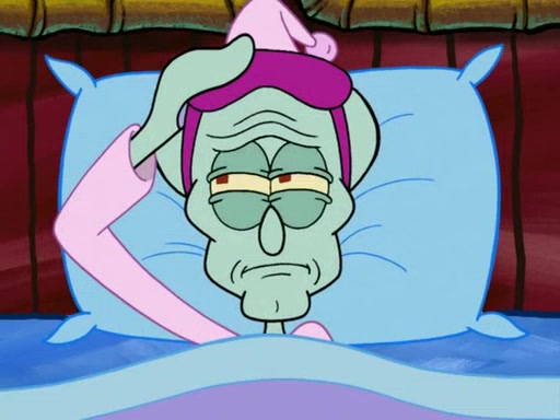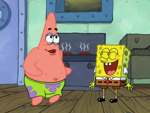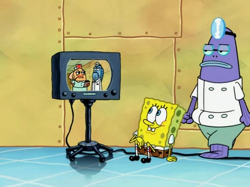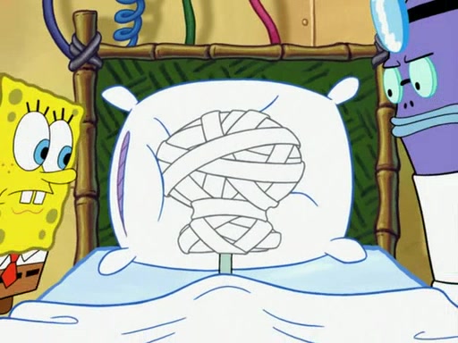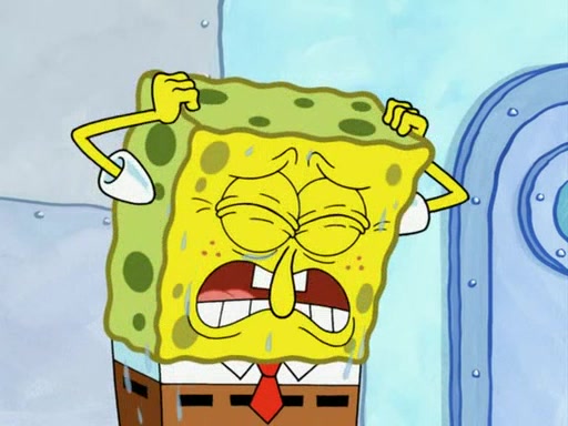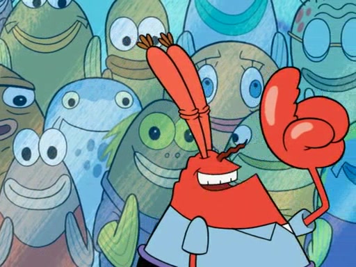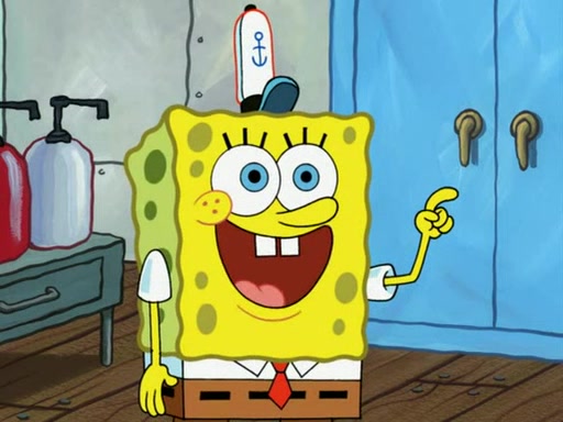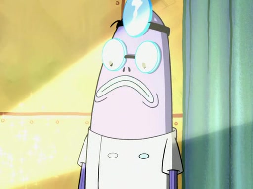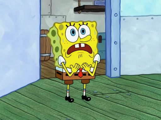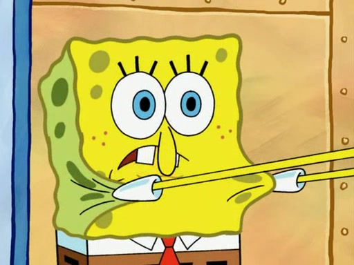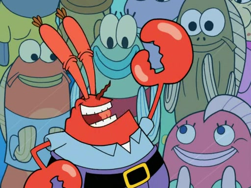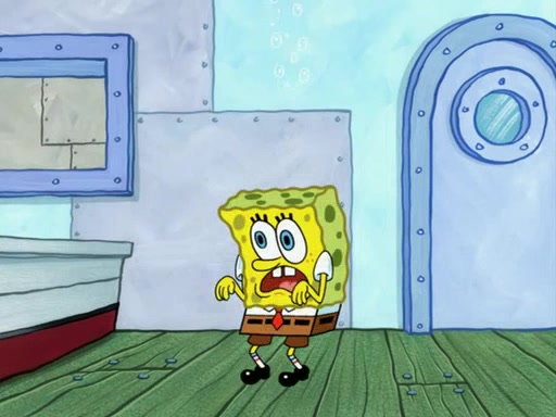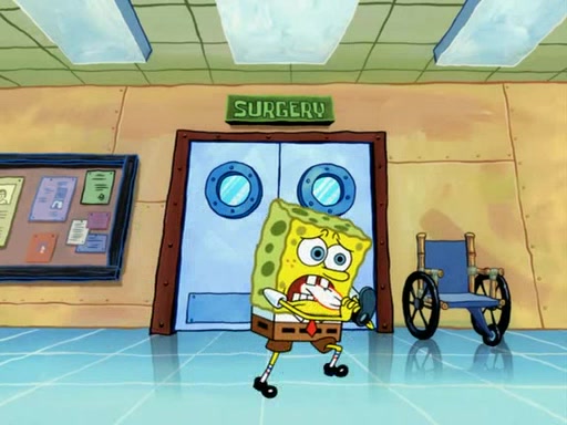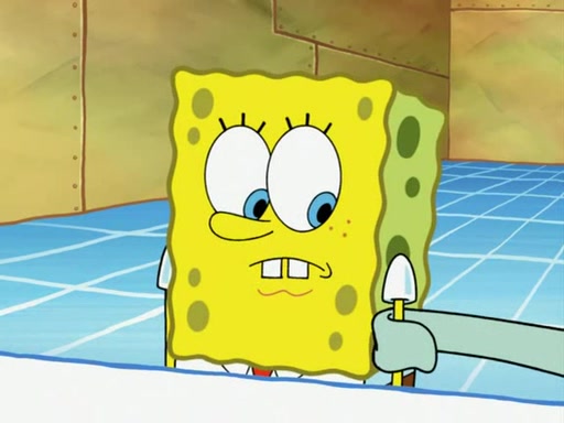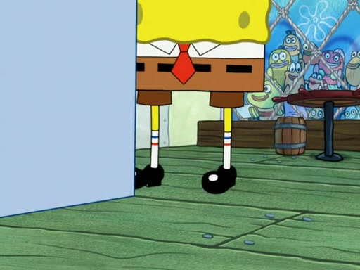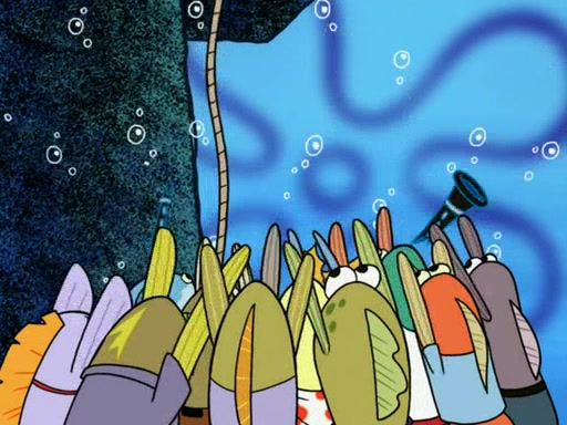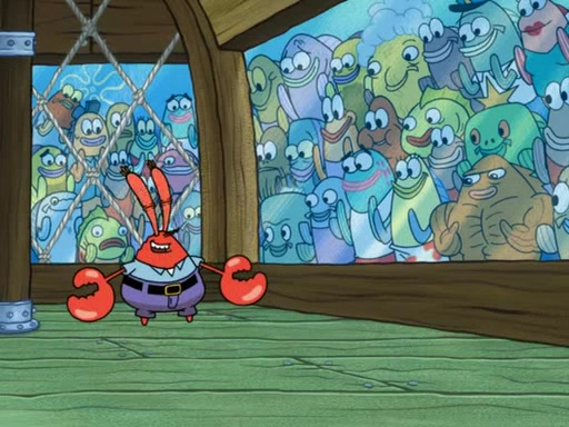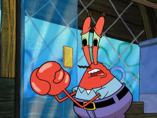 But all that changes when Squidward's fans go crazy and taking his stuff and won't leave him alone. Everything is too much for Squidward so he goes to SpongeBob for help. Squidward wants to become his normal self, so he and SpongeBob races to Krusty Krab with the crowd following them. Mr. Krabs becomes overjoyed to see everyone at the entrance, and begins to name all the prices. While he does that, Squidward tells SpongeBob to slam the door against his face in order to make him normal again. SpongeBob doesn't want to do it, but Squidward threatens to hurt SpongeBob if he doesn't hurt him. So he begins to slam the door against Squidward's face repeatedly, but it only makes Squidward even more handsome. Suddenly, the flying fish's other bowling shoe, falls out of the top, and SpongeBob, who was alarmed by it, pushes Squidward out of the way. SpongeBob's push sends Squidward flying dramatically and causes him to hit a pole, while the shoe just bounces off of SpongeBob's head. The blow from the pole causes Squidward's face to become normal again. The crowd, who is disappointed to see Squidward not handsome anymore, begins to walk away miserably, but Mr. Krabs, who is unhappy to see his beloved customers go away, tries to return Squidward's handsomeness by slamming the door repeatedly against his face.