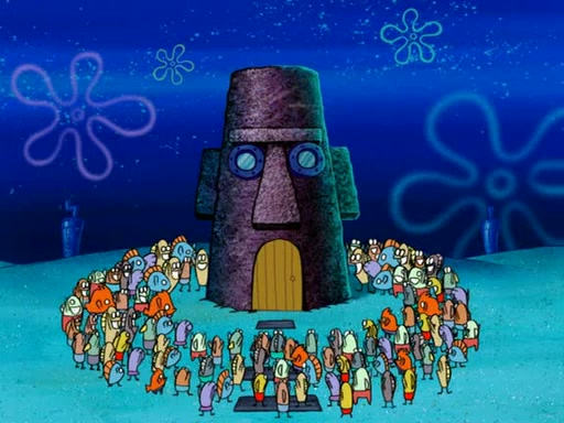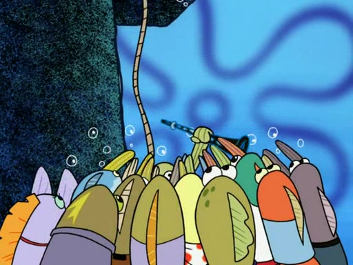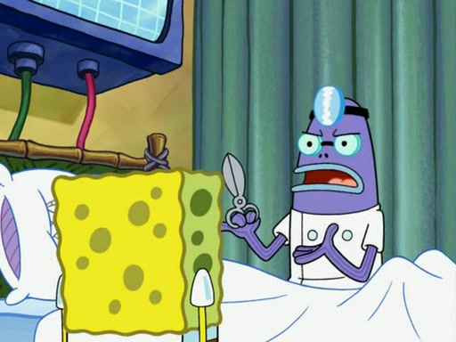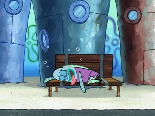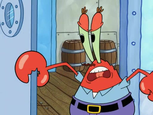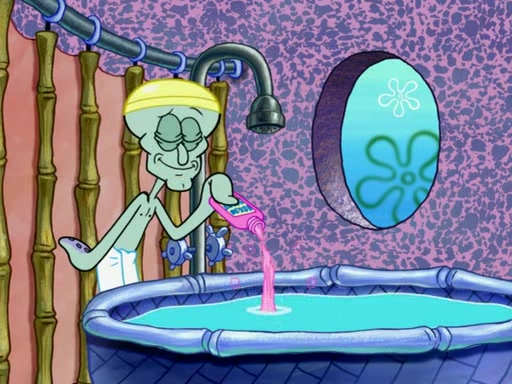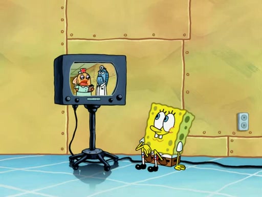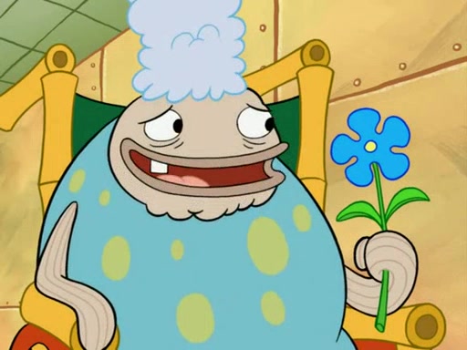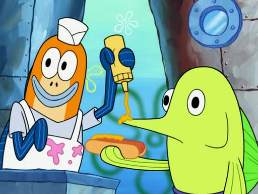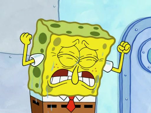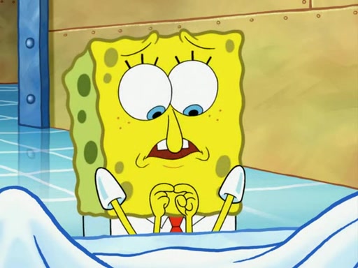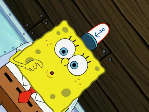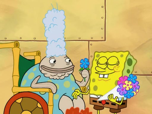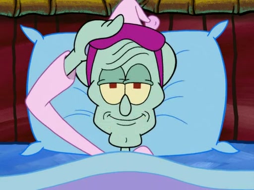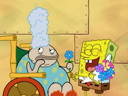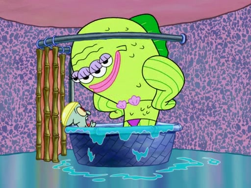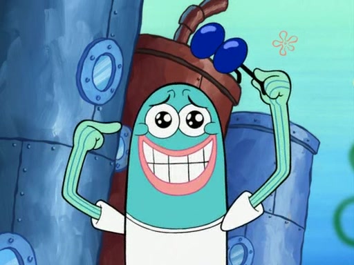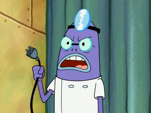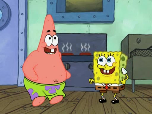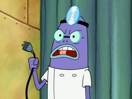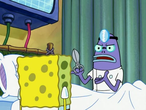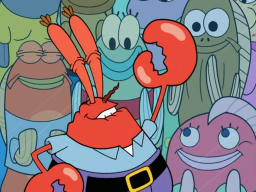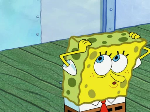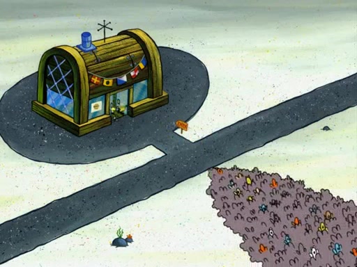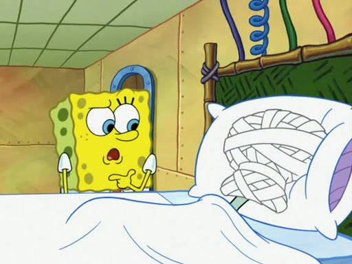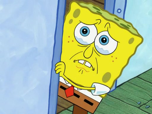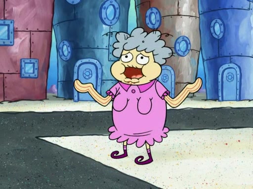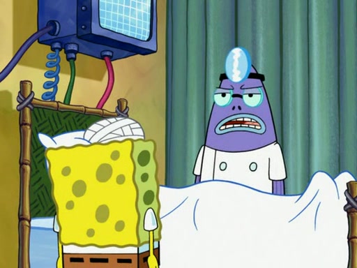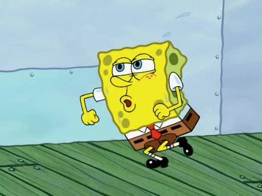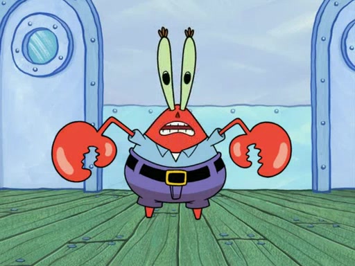 But all that changes when Squidward's fans go crazy and taking his stuff and won't leave him alone. Everything is too much for Squidward so he goes to SpongeBob for help. Squidward wants to become his normal self, so he and SpongeBob races to Krusty Krab with the crowd following them. Mr. Krabs becomes overjoyed to see everyone at the entrance, and begins to name all the prices. While he does that, Squidward tells SpongeBob to slam the door against his face in order to make him normal again. SpongeBob doesn't want to do it, but Squidward threatens to hurt SpongeBob if he doesn't hurt him. So he begins to slam the door against Squidward's face repeatedly, but it only makes Squidward even more handsome. Suddenly, the flying fish's other bowling shoe, falls out of the top, and SpongeBob, who was alarmed by it, pushes Squidward out of the way. SpongeBob's push sends Squidward flying dramatically and causes him to hit a pole, while the shoe just bounces off of SpongeBob's head. The blow from the pole causes Squidward's face to become normal again. The crowd, who is disappointed to see Squidward not handsome anymore, begins to walk away miserably, but Mr. Krabs, who is unhappy to see his beloved customers go away, tries to return Squidward's handsomeness by slamming the door repeatedly against his face.