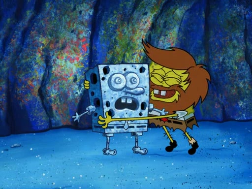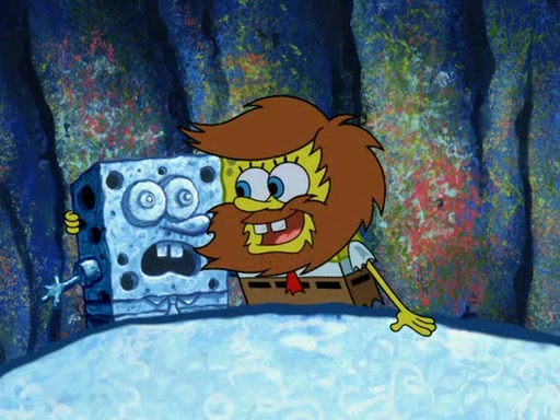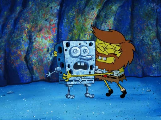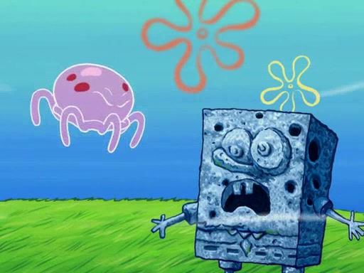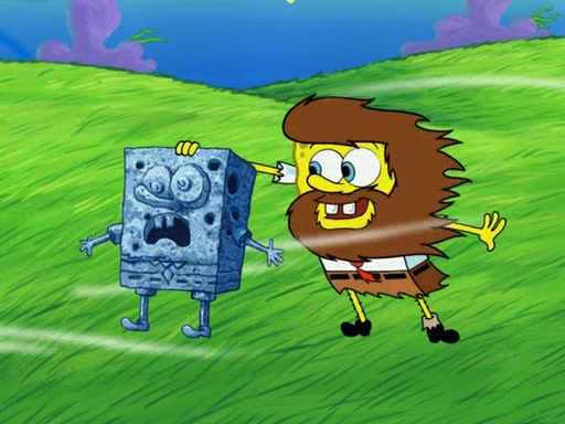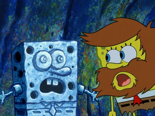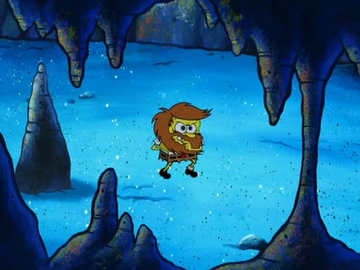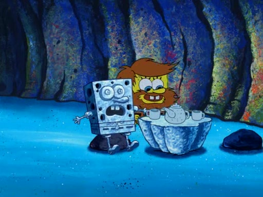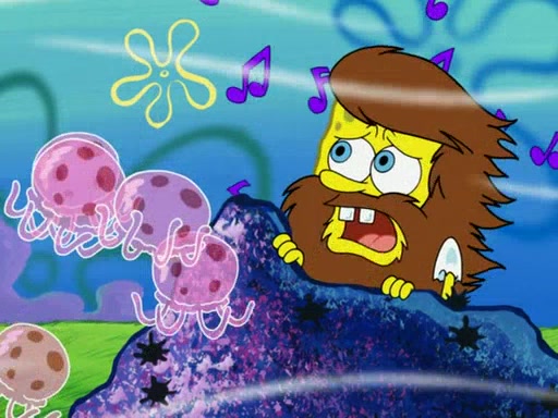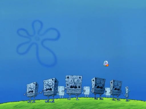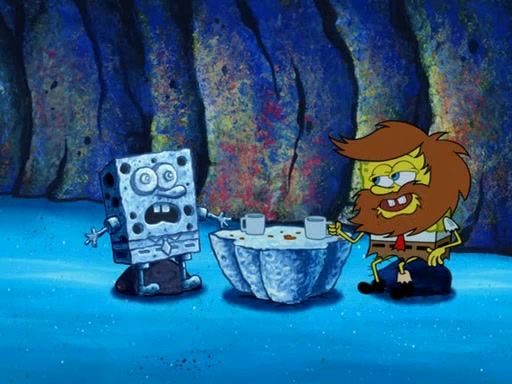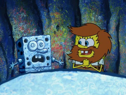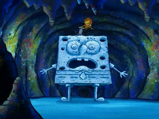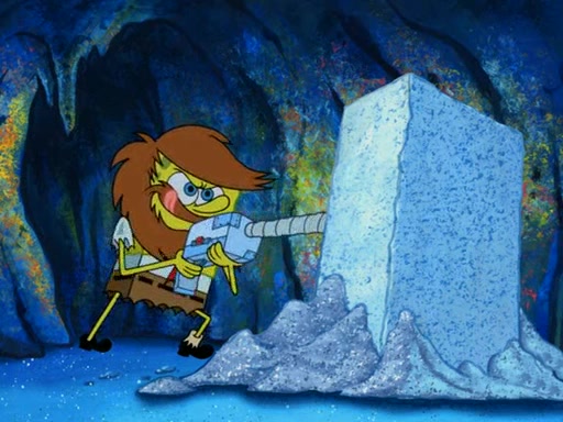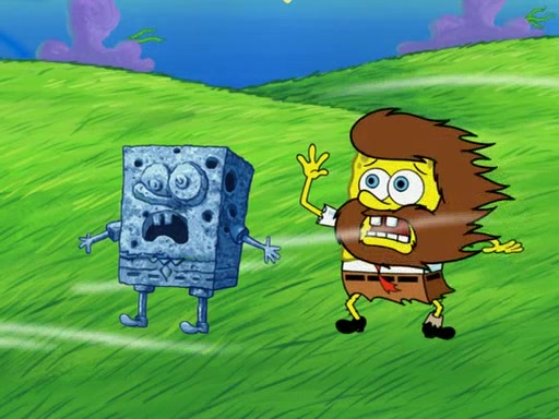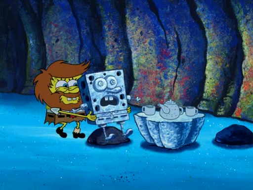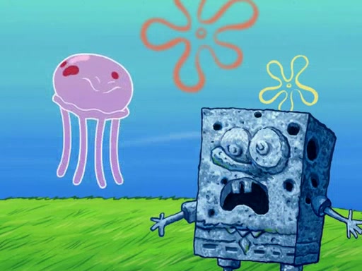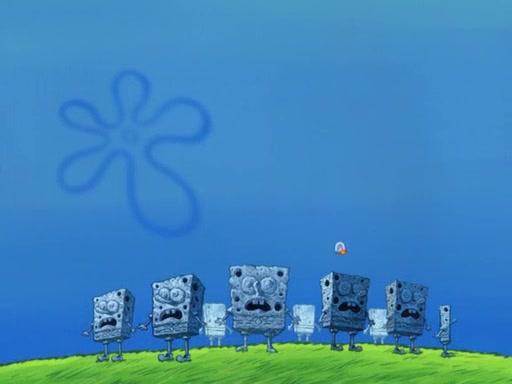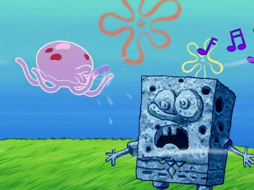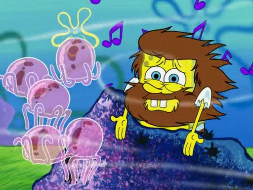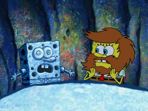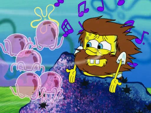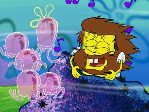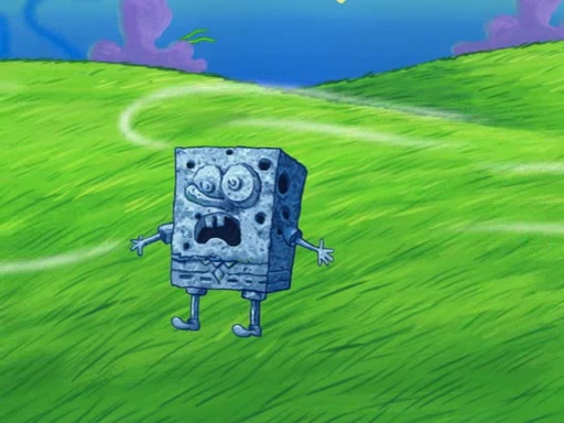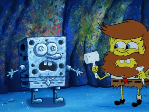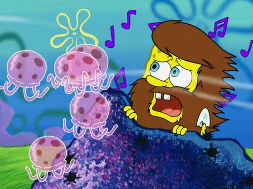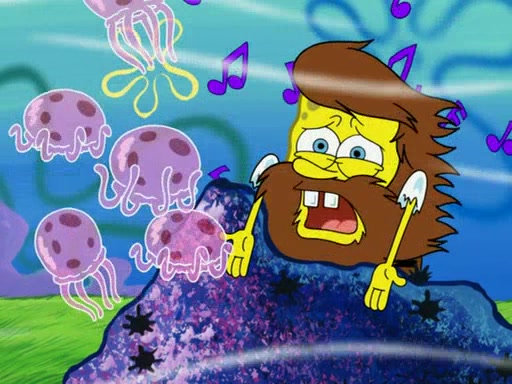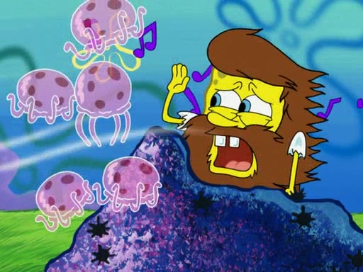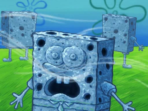 Still being pursued by the swarm of jellyfish, SpongeBob runs to hide in Patrick’s house; however, a jellyfish enters and stings Patrick, making him throw SpongeBob out. Finally, the wind stops, but the jellyfish then begin to sting SpongeBob, forcing him to take refuge in a cave. With that, he starts building a stone replica of himself to alleviate his days of solitude. After a decade, the storm is still there, and SpongeBob had grown a beard and finished the replica. He gives his inanimate companion tea and sugar and talks to it about how the jellyfish keep bothering him due to the music produced when wind blows through his holes. Then, SpongeBob has an idea!