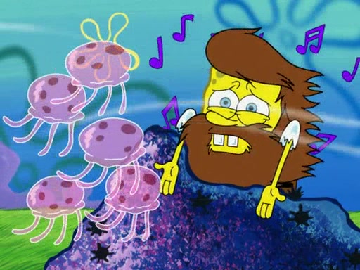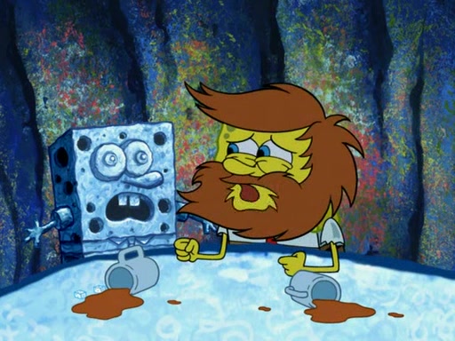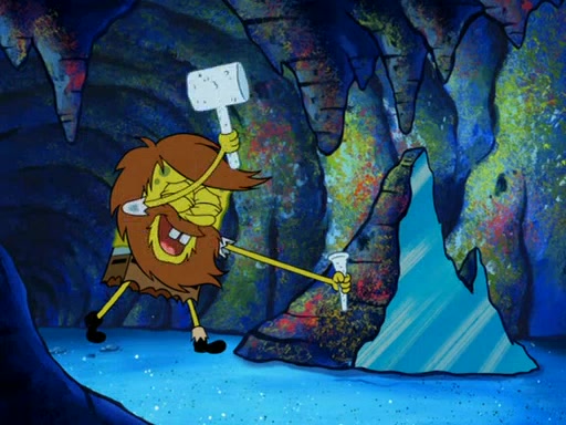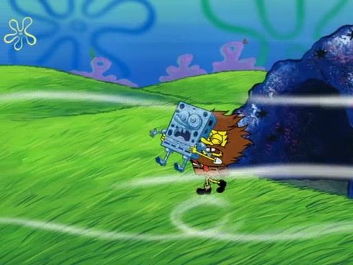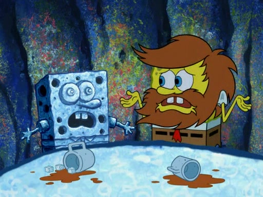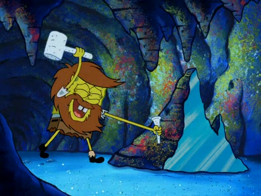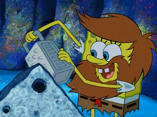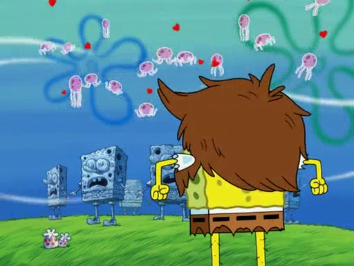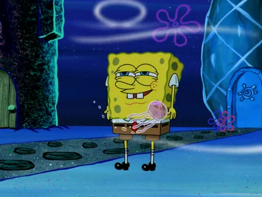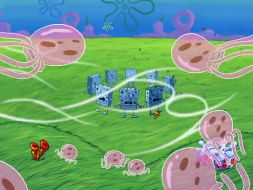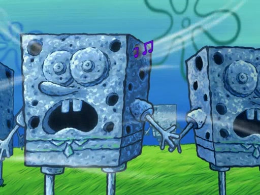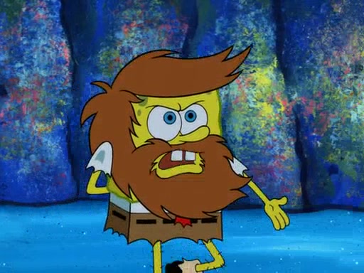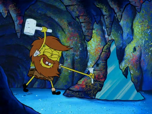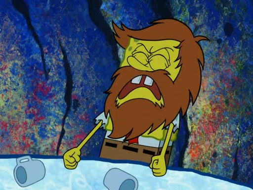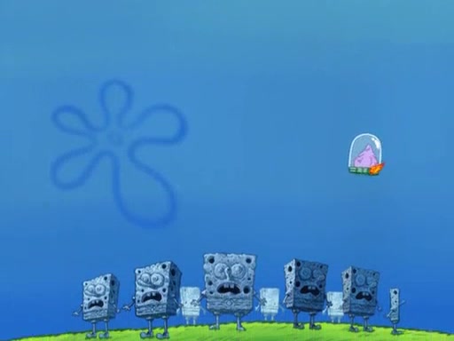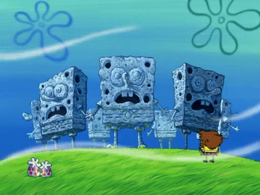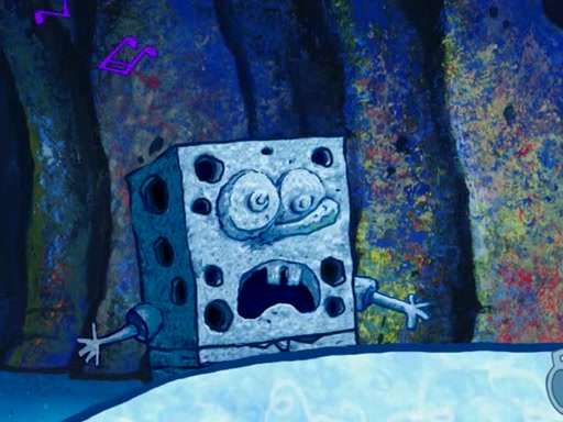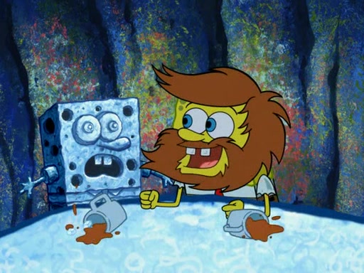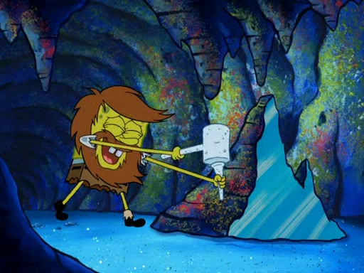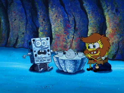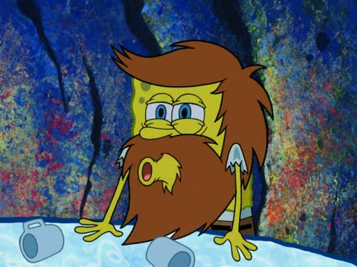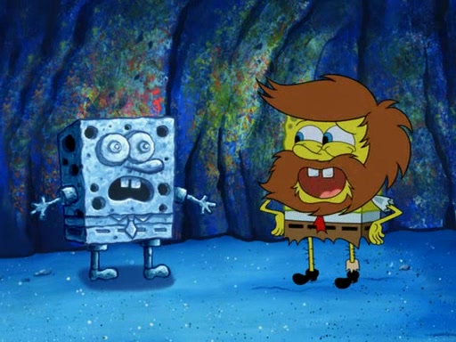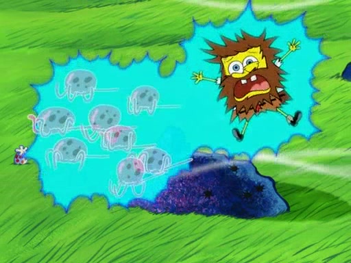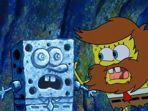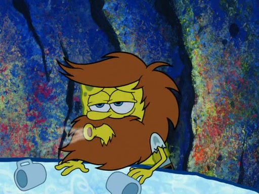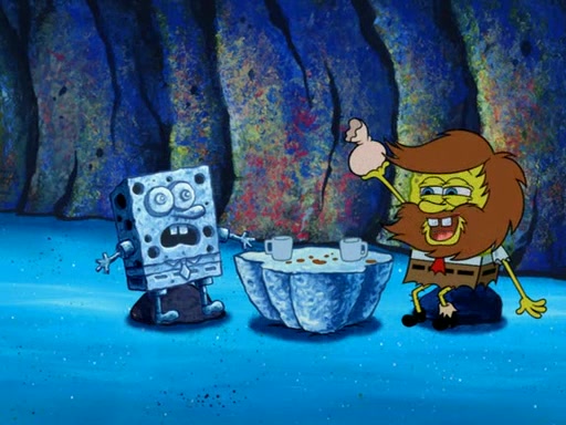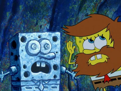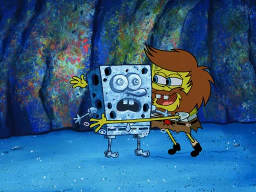 Still being pursued by the swarm of jellyfish, SpongeBob runs to hide in Patrick’s house; however, a jellyfish enters and stings Patrick, making him throw SpongeBob out. Finally, the wind stops, but the jellyfish then begin to sting SpongeBob, forcing him to take refuge in a cave. With that, he starts building a stone replica of himself to alleviate his days of solitude. After a decade, the storm is still there, and SpongeBob had grown a beard and finished the replica. He gives his inanimate companion tea and sugar and talks to it about how the jellyfish keep bothering him due to the music produced when wind blows through his holes. Then, SpongeBob has an idea!