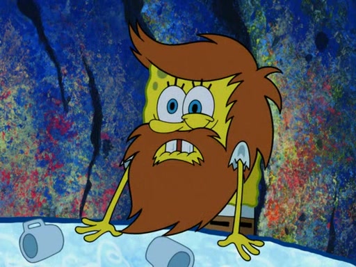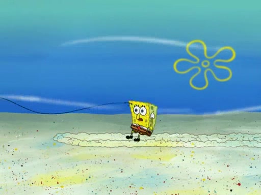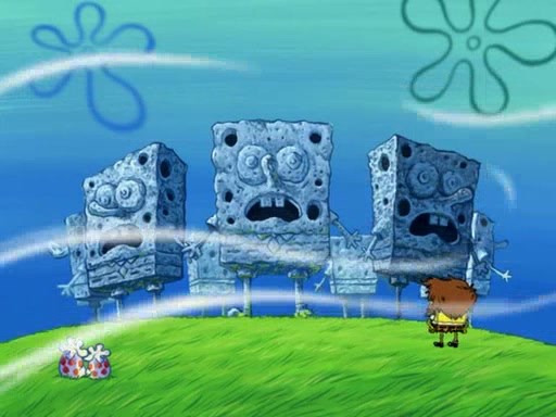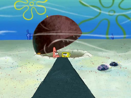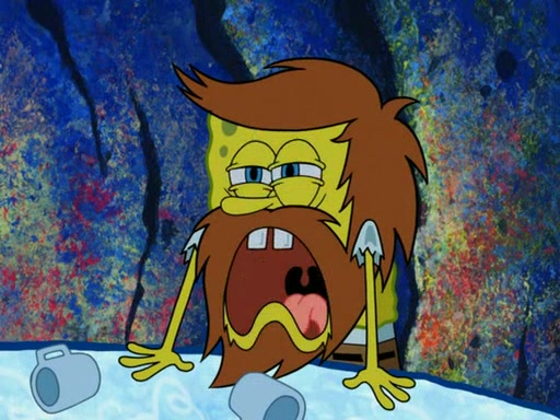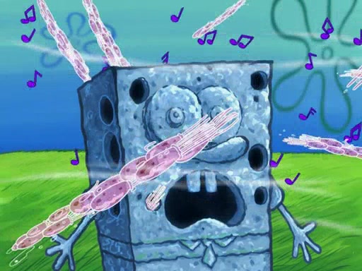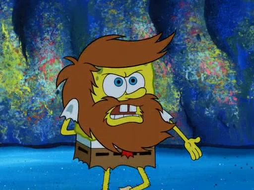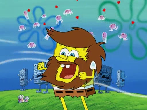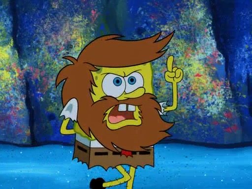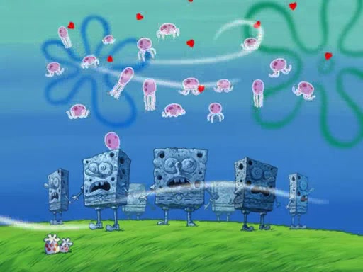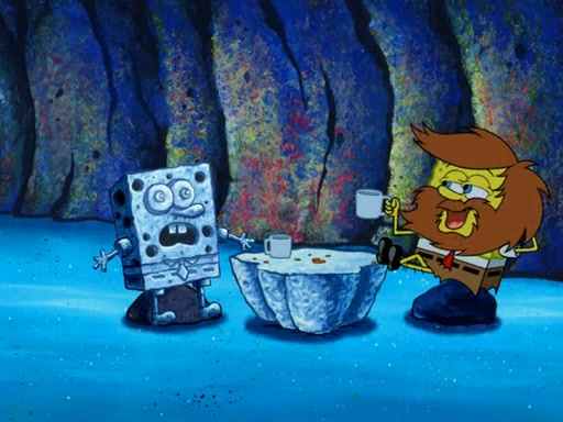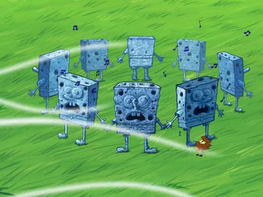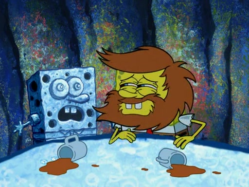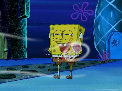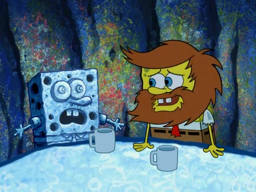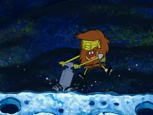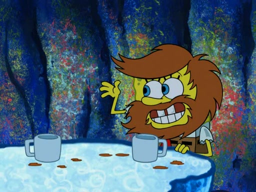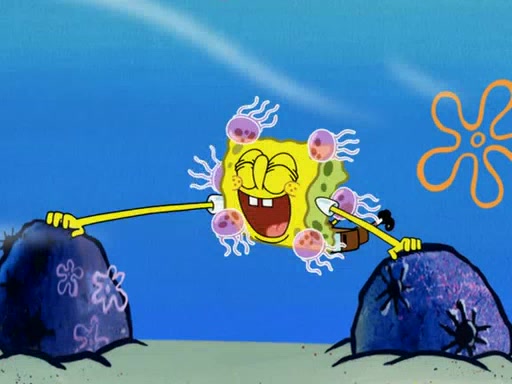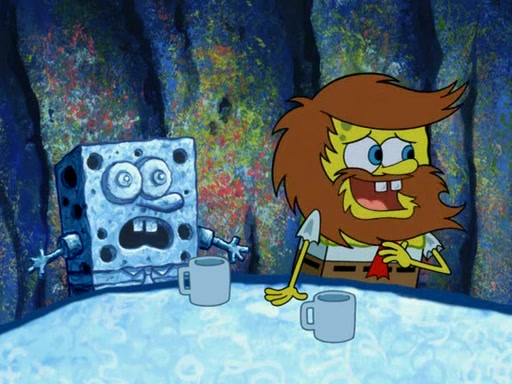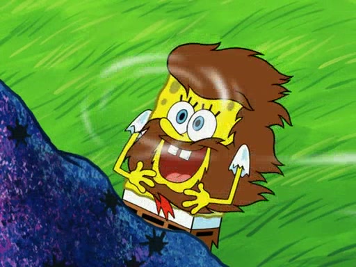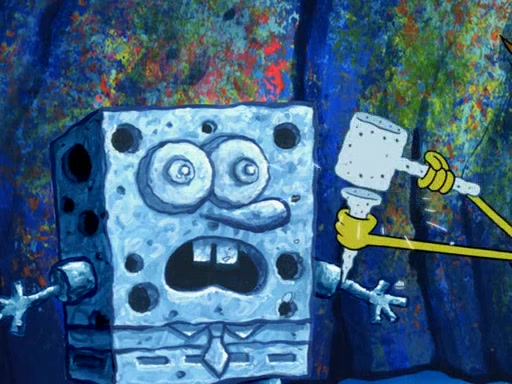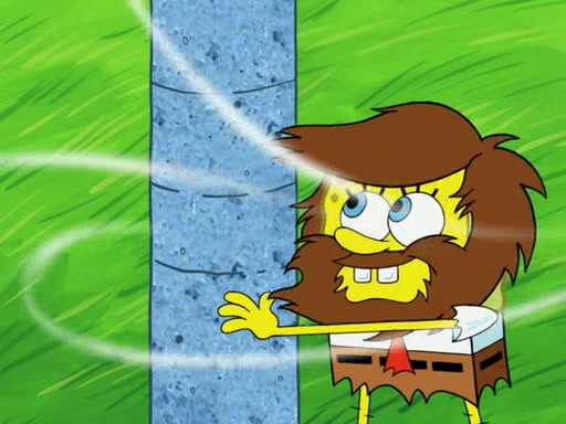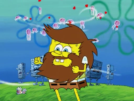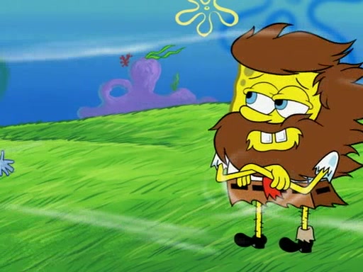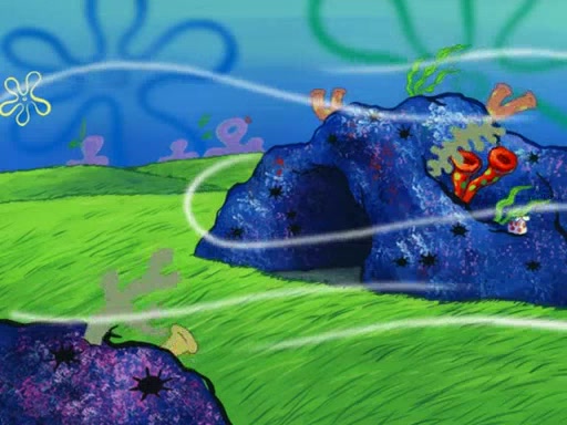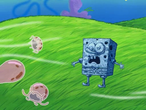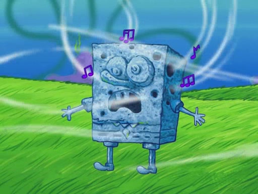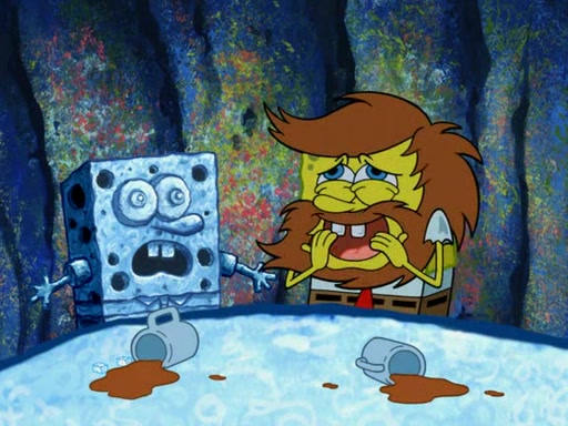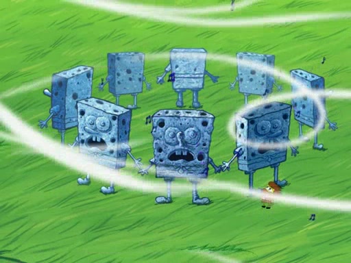 Still being pursued by the swarm of jellyfish, SpongeBob runs to hide in Patrick’s house; however, a jellyfish enters and stings Patrick, making him throw SpongeBob out. Finally, the wind stops, but the jellyfish then begin to sting SpongeBob, forcing him to take refuge in a cave. With that, he starts building a stone replica of himself to alleviate his days of solitude. After a decade, the storm is still there, and SpongeBob had grown a beard and finished the replica. He gives his inanimate companion tea and sugar and talks to it about how the jellyfish keep bothering him due to the music produced when wind blows through his holes. Then, SpongeBob has an idea!
