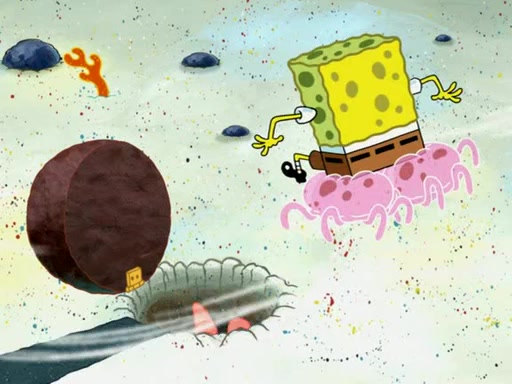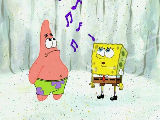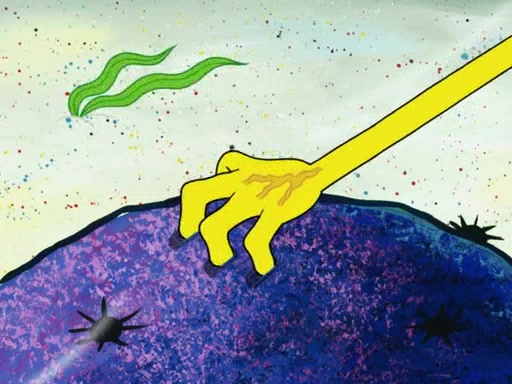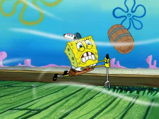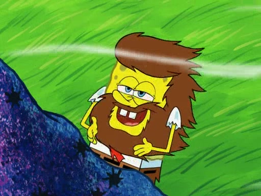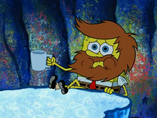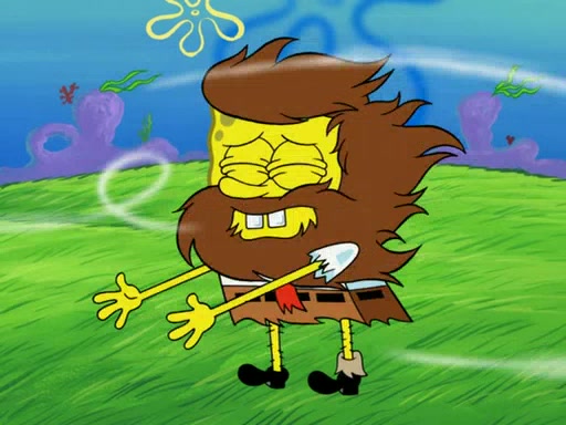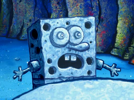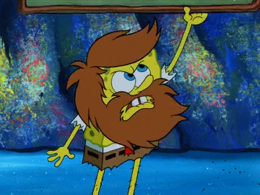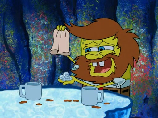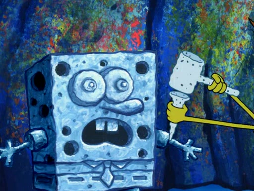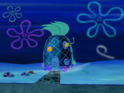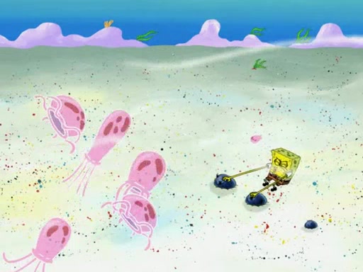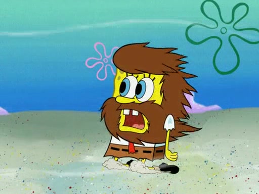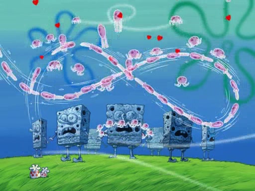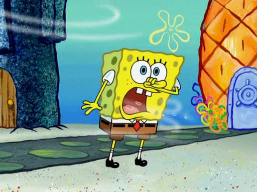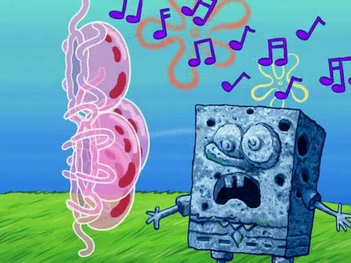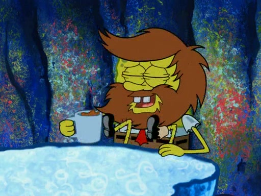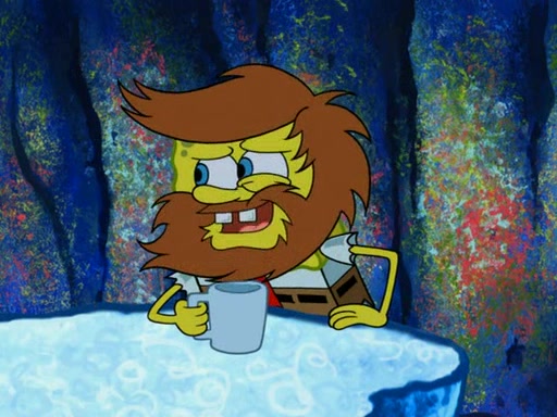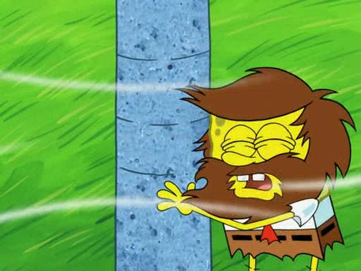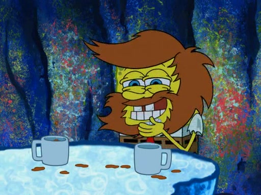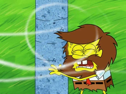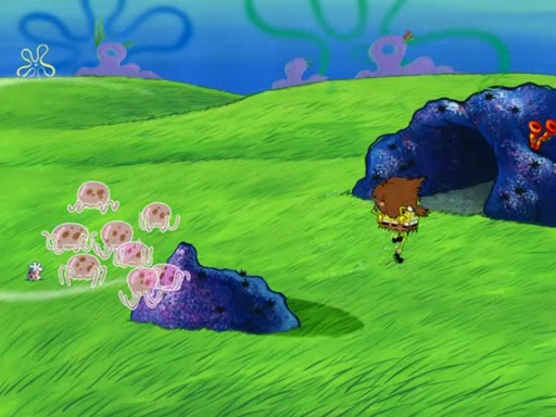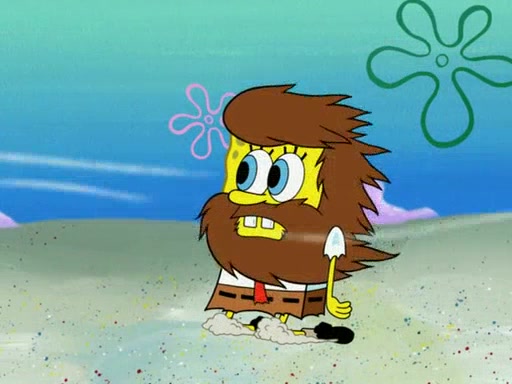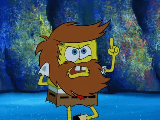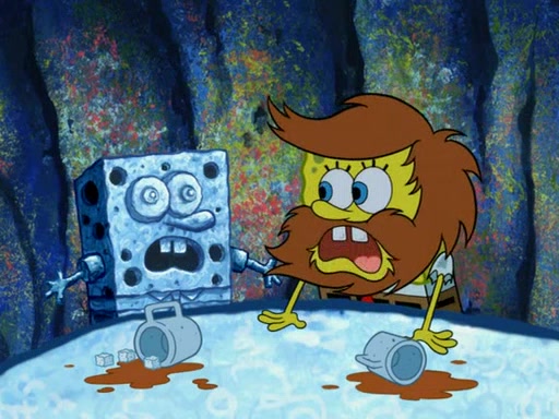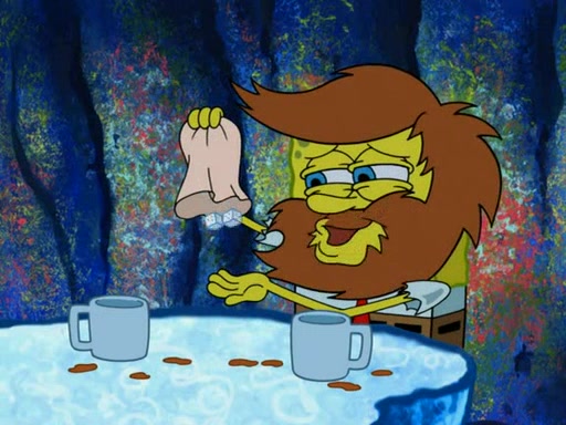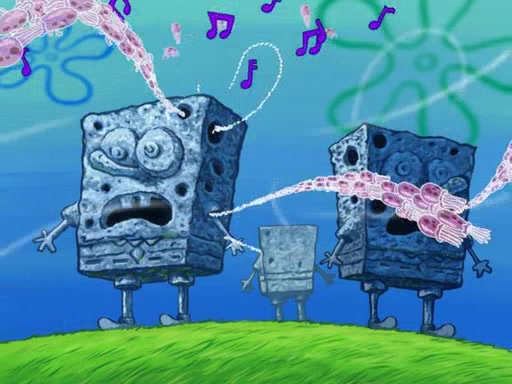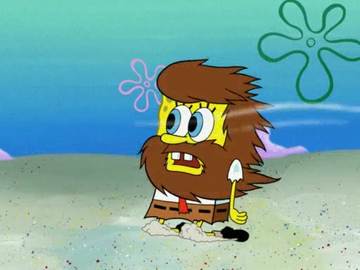 Still being pursued by the swarm of jellyfish, SpongeBob runs to hide in Patrick’s house; however, a jellyfish enters and stings Patrick, making him throw SpongeBob out. Finally, the wind stops, but the jellyfish then begin to sting SpongeBob, forcing him to take refuge in a cave. With that, he starts building a stone replica of himself to alleviate his days of solitude. After a decade, the storm is still there, and SpongeBob had grown a beard and finished the replica. He gives his inanimate companion tea and sugar and talks to it about how the jellyfish keep bothering him due to the music produced when wind blows through his holes. Then, SpongeBob has an idea!