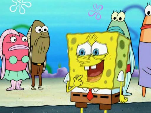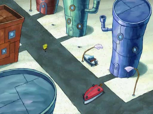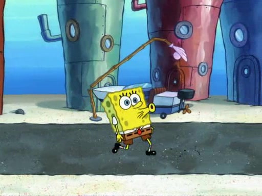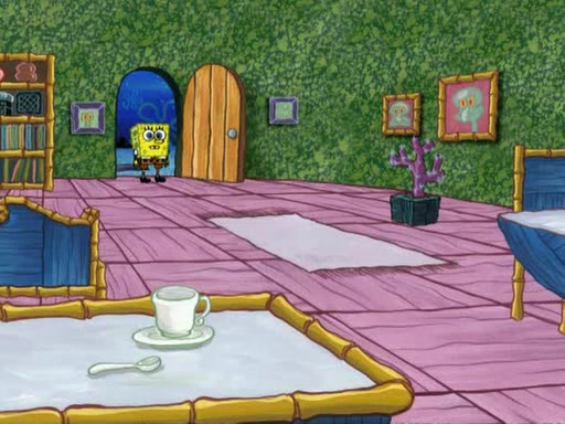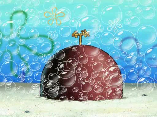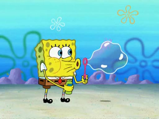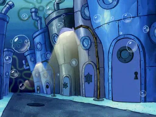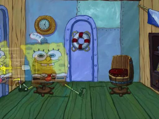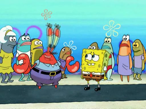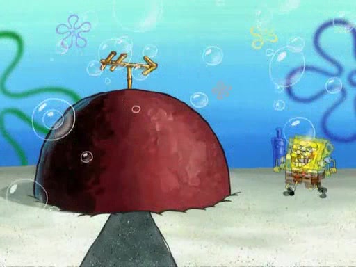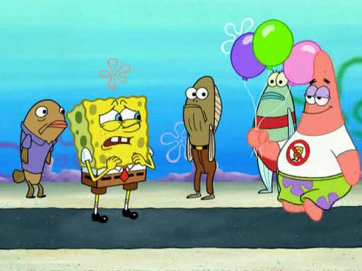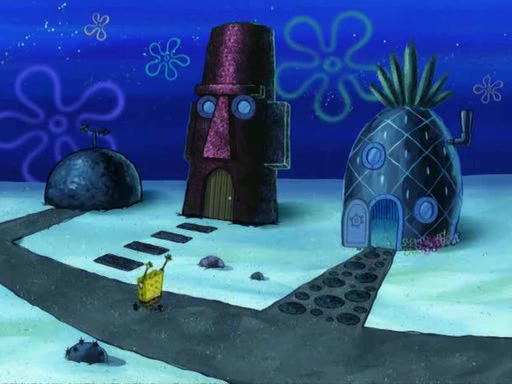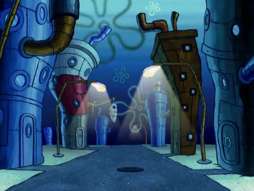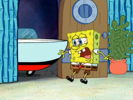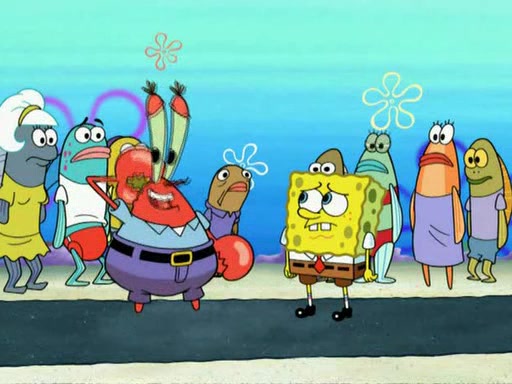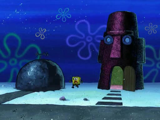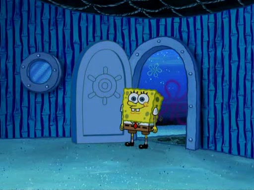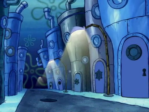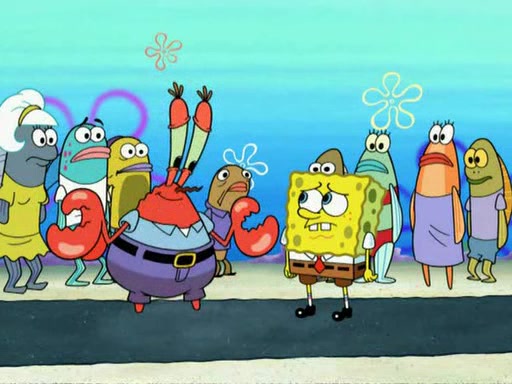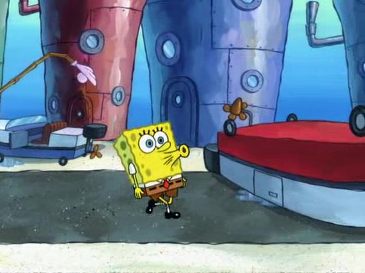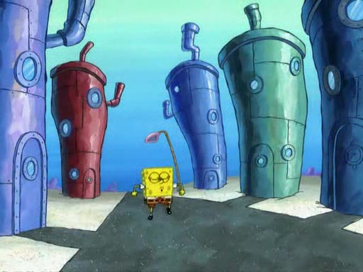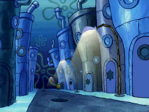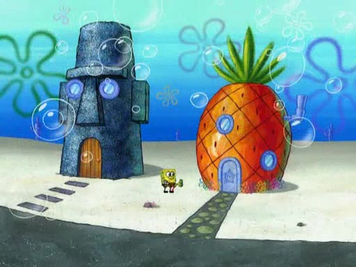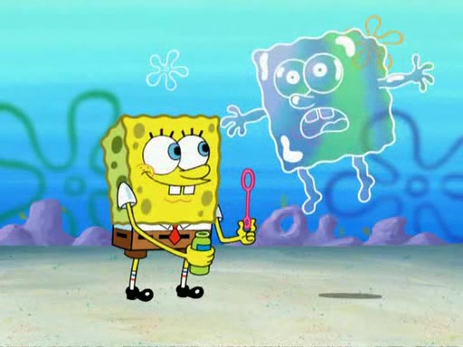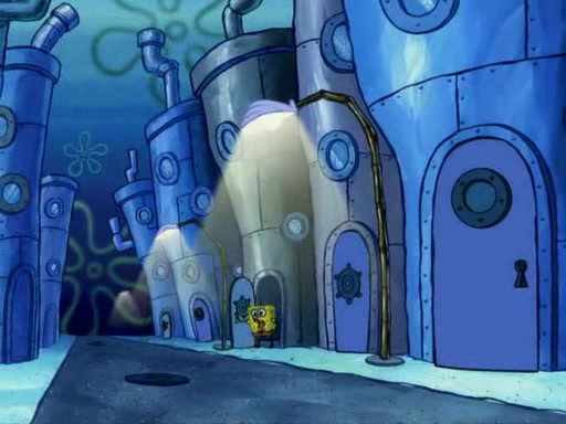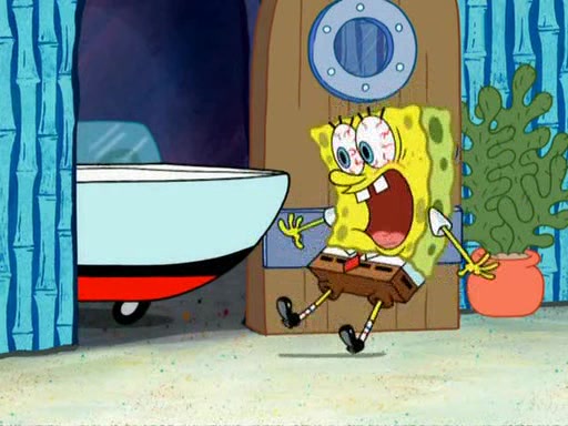 When the others don't return, SpongeBob then decides to live out everyone's lives for them. He makes a bubble version of himself in his front yard, then runs to the top floor of Squidward's house, pretending to be Squidward yelling at SpongeBob for making too much noise. SpongeBob then runs to the Krusty Krab, imitating Squidward and Mr. Krabs. He imitates Sandy at the Treedome and Patrick at the Rock respectively before running to the boating school and pretending to be Mrs. Puff.