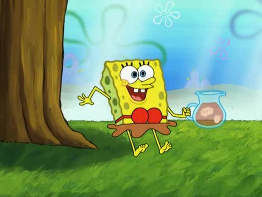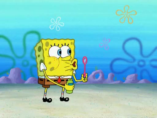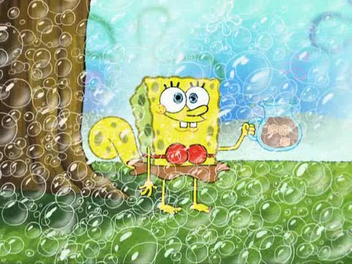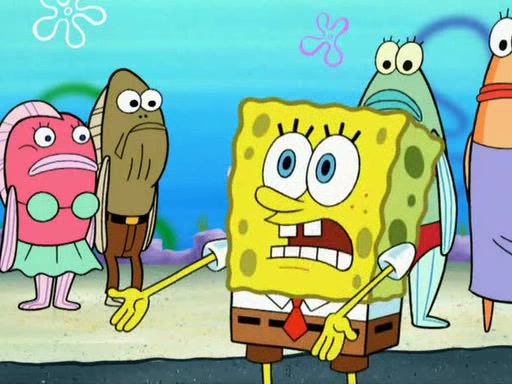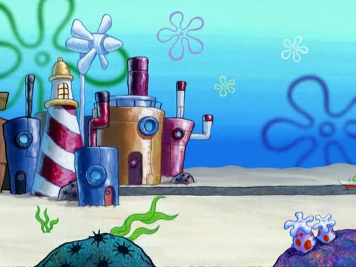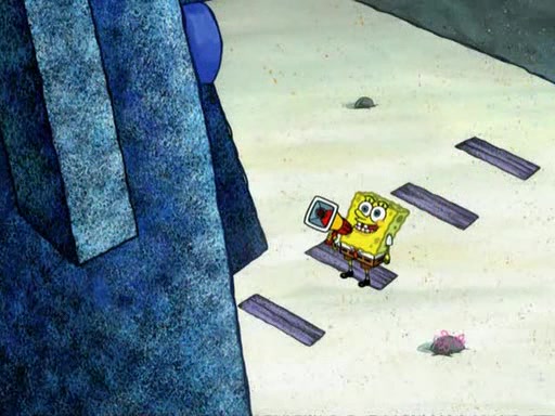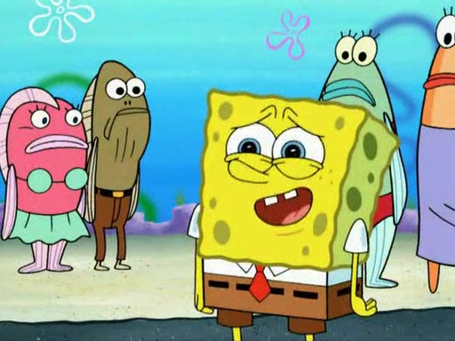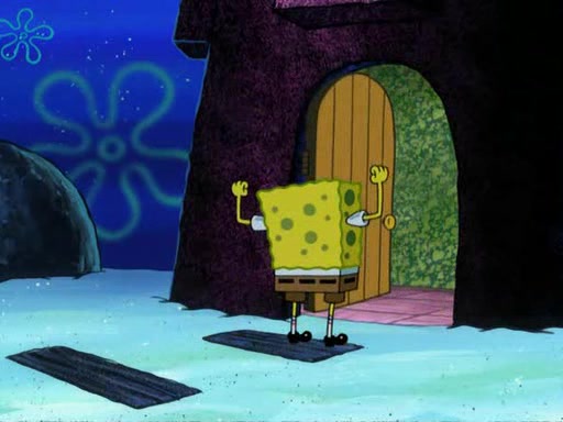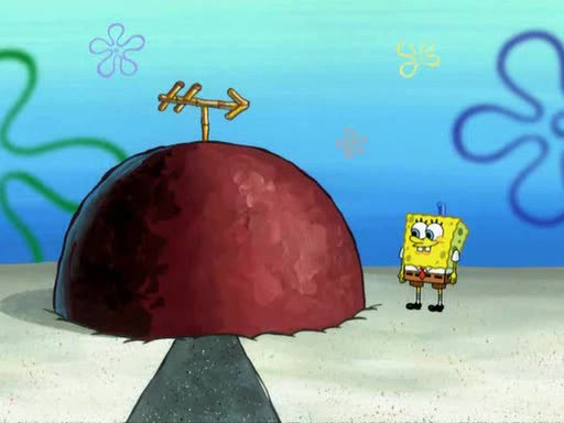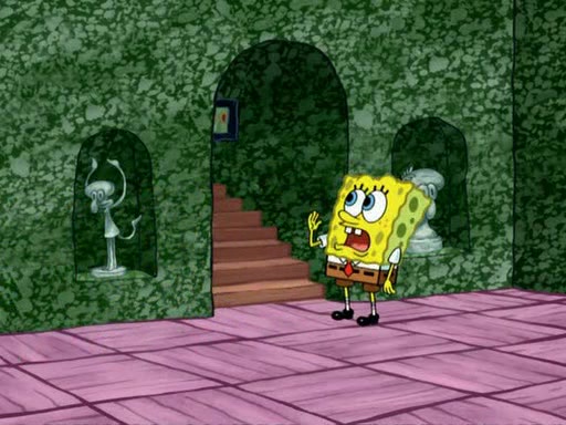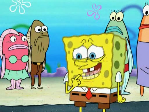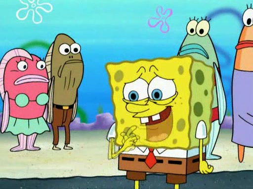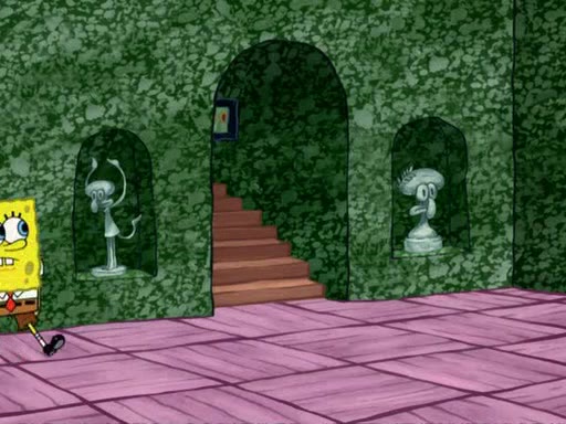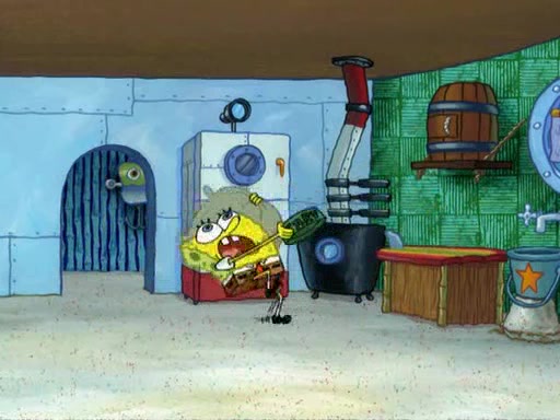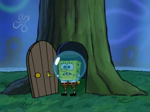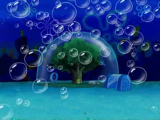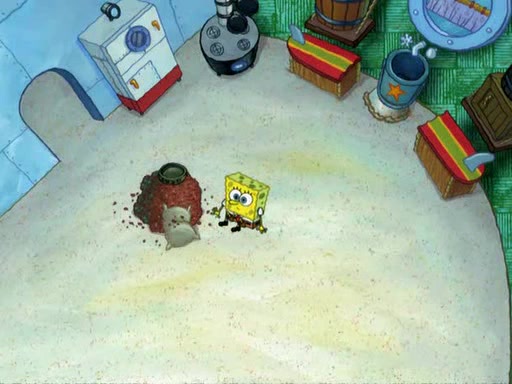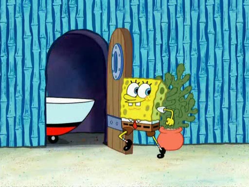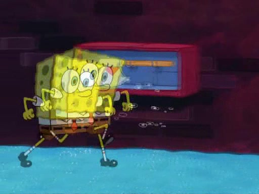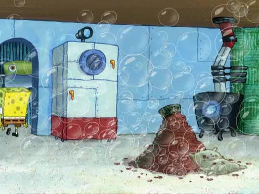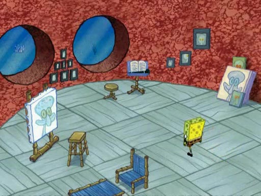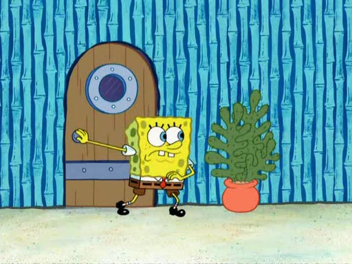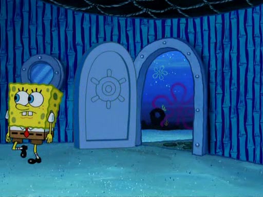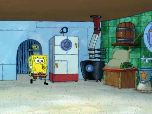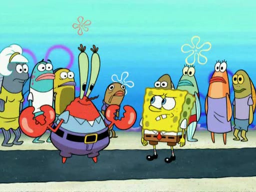 When the others don't return, SpongeBob then decides to live out everyone's lives for them. He makes a bubble version of himself in his front yard, then runs to the top floor of Squidward's house, pretending to be Squidward yelling at SpongeBob for making too much noise. SpongeBob then runs to the Krusty Krab, imitating Squidward and Mr. Krabs. He imitates Sandy at the Treedome and Patrick at the Rock respectively before running to the boating school and pretending to be Mrs. Puff.