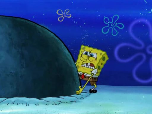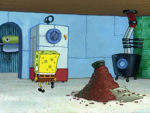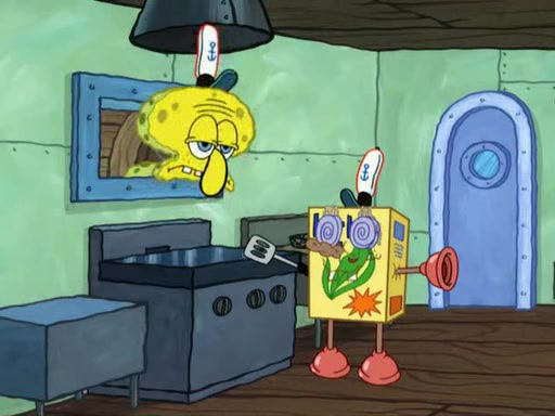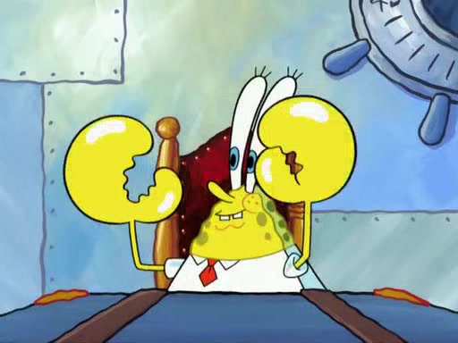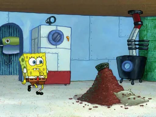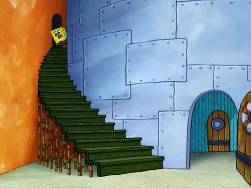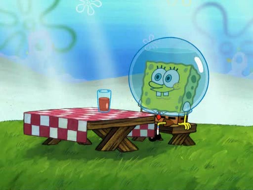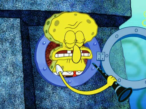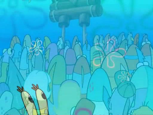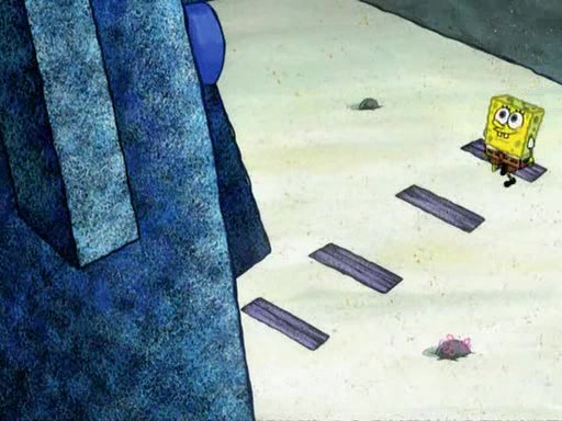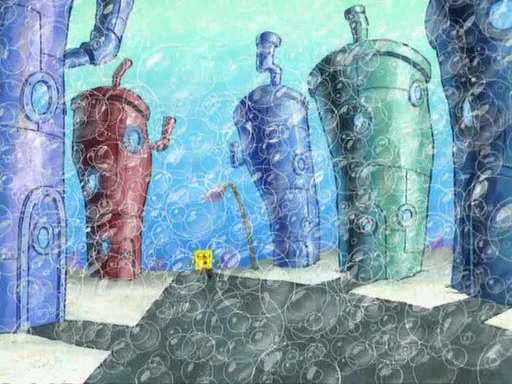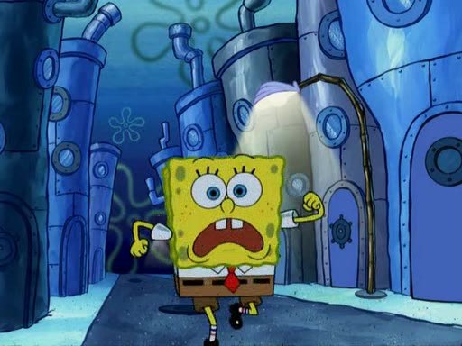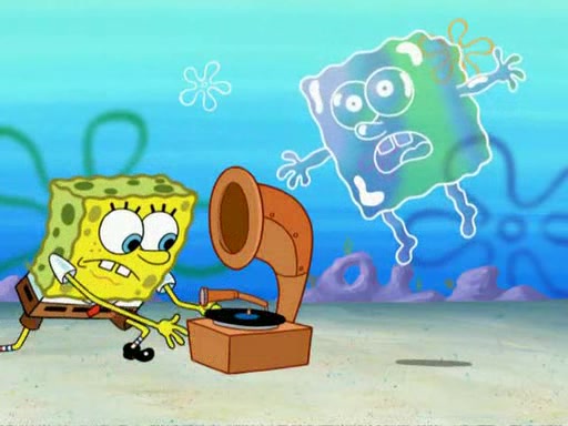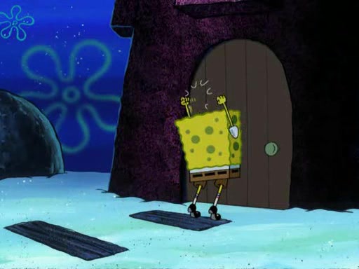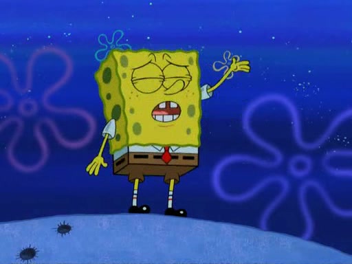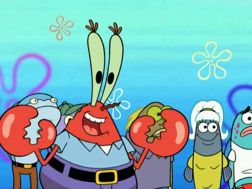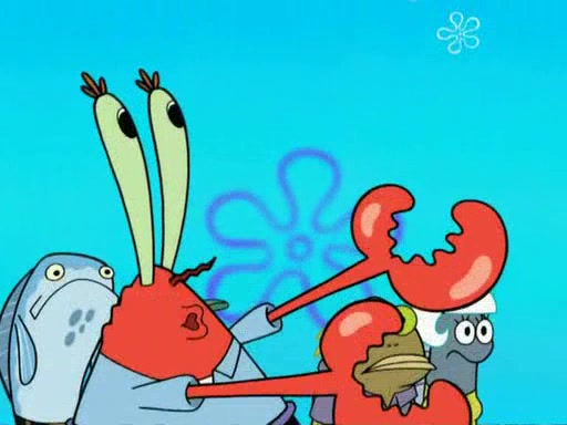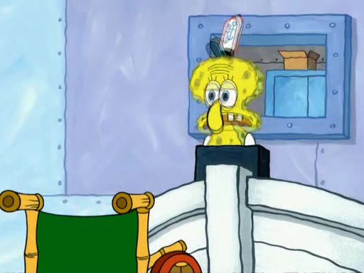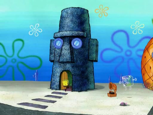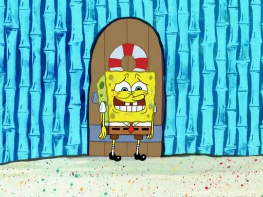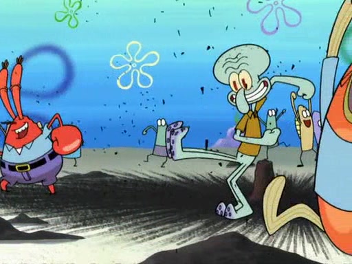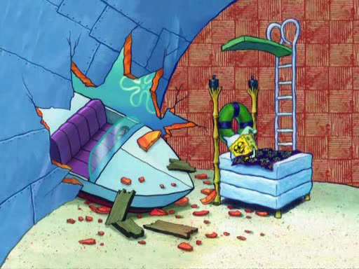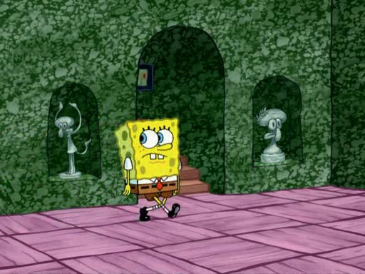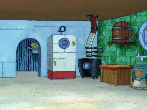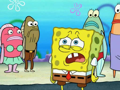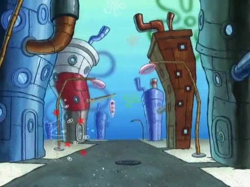 When the others don't return, SpongeBob then decides to live out everyone's lives for them. He makes a bubble version of himself in his front yard, then runs to the top floor of Squidward's house, pretending to be Squidward yelling at SpongeBob for making too much noise. SpongeBob then runs to the Krusty Krab, imitating Squidward and Mr. Krabs. He imitates Sandy at the Treedome and Patrick at the Rock respectively before running to the boating school and pretending to be Mrs. Puff.