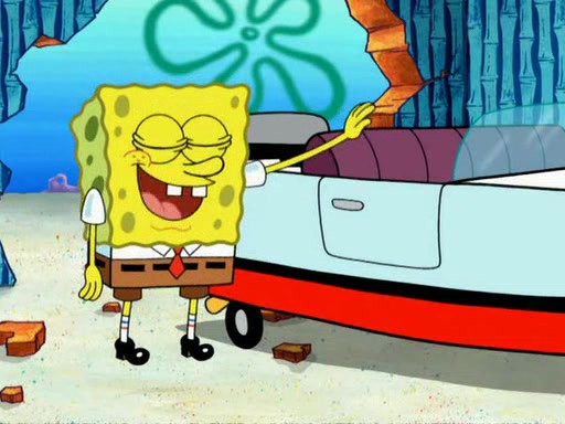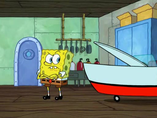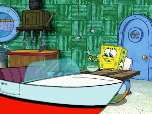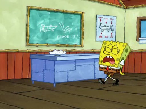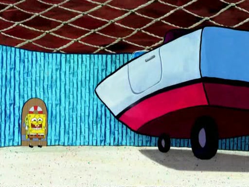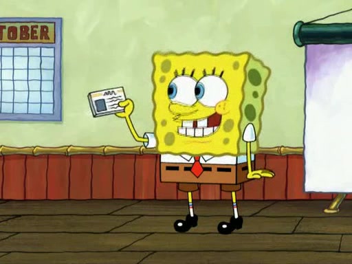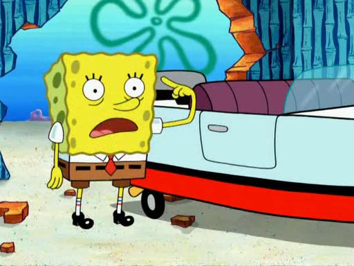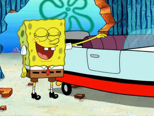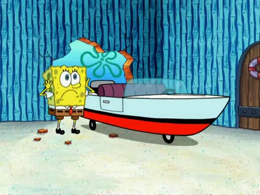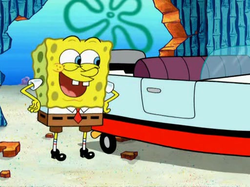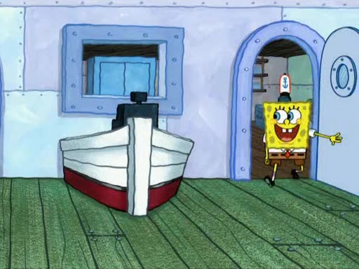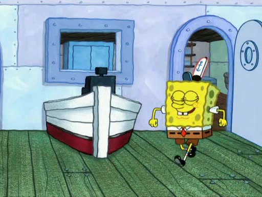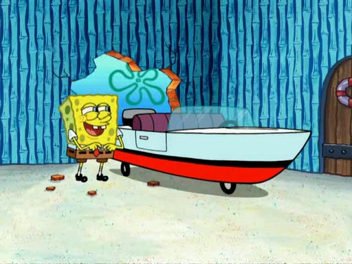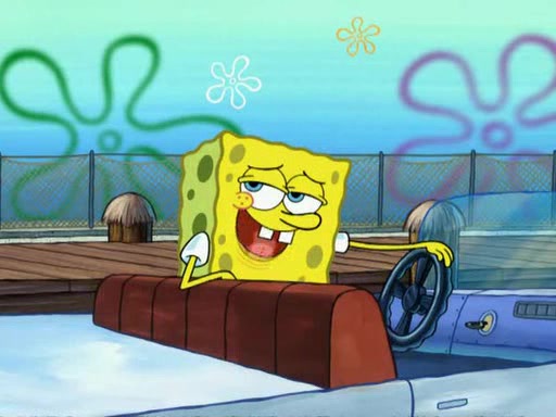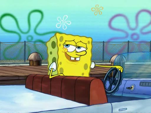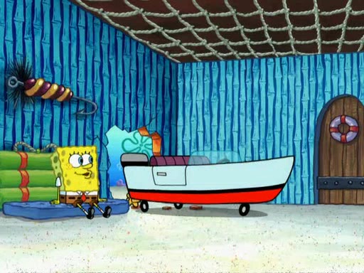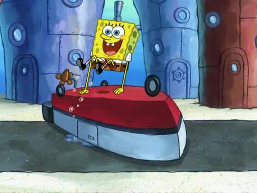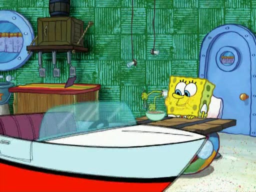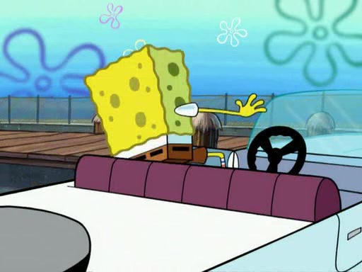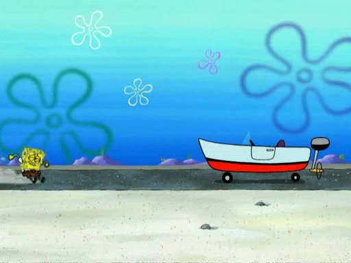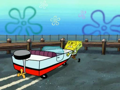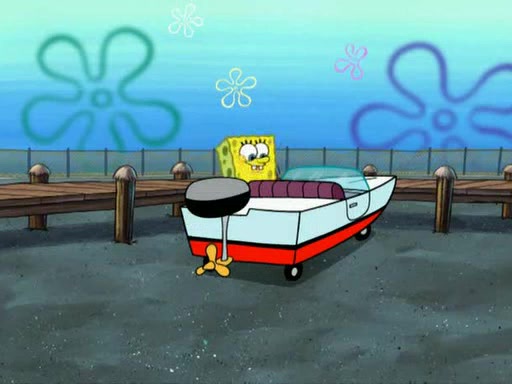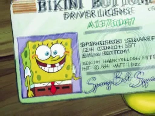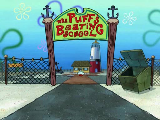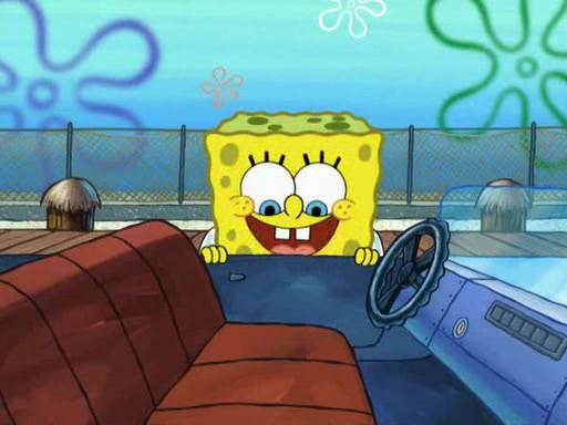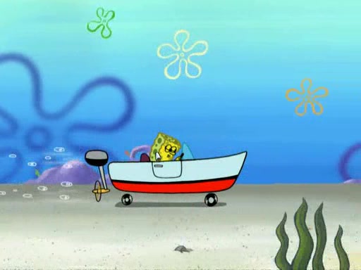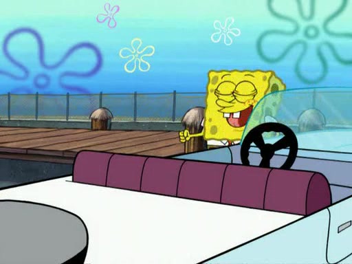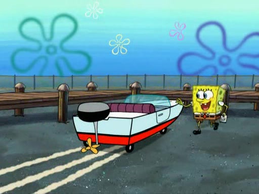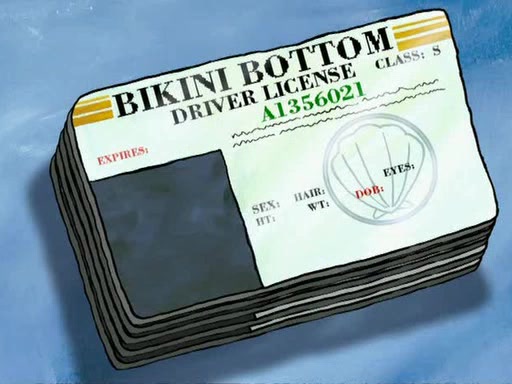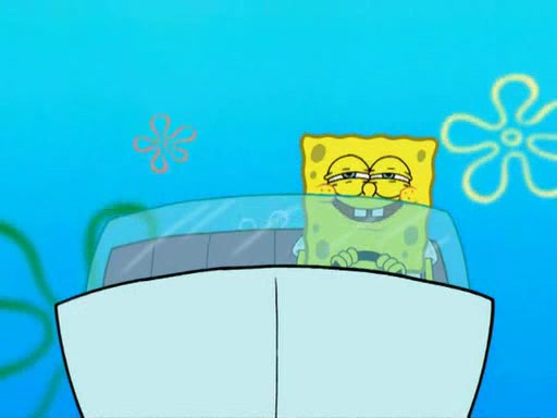 In the classroom, he realizes that living out everyone's lives won't work, and he breaks down crying on Mrs. Puff's desk. SpongeBob's mood quickly changes when he discovers a stack of blank driver's licenses. He takes a picture of himself, and prints out his own license. He then takes off with the student driver boat, naming it "Boaty," and joyriding throughout the city.