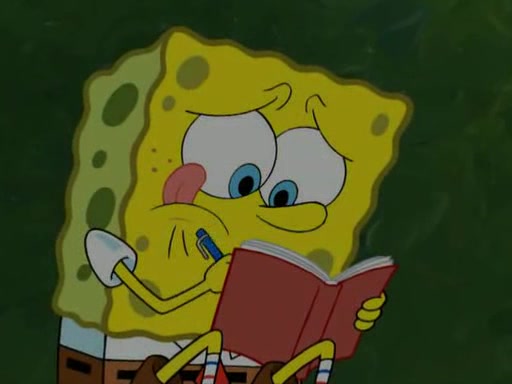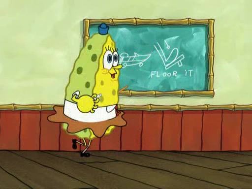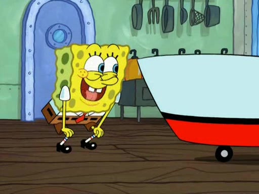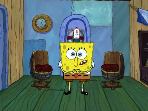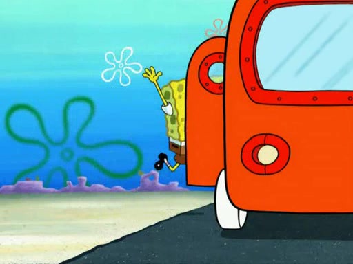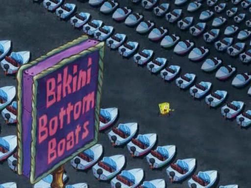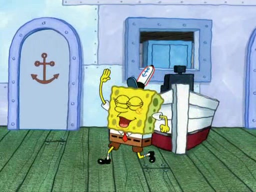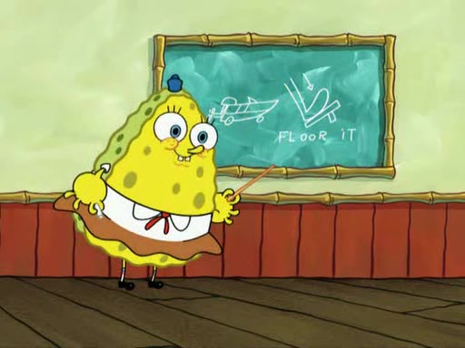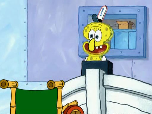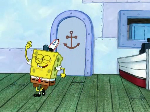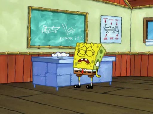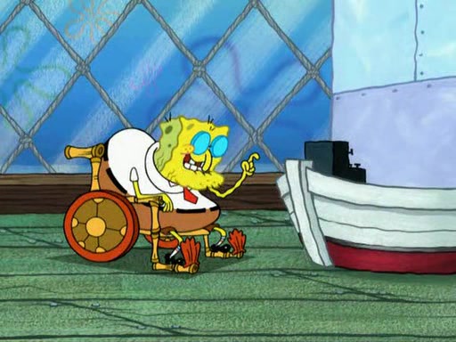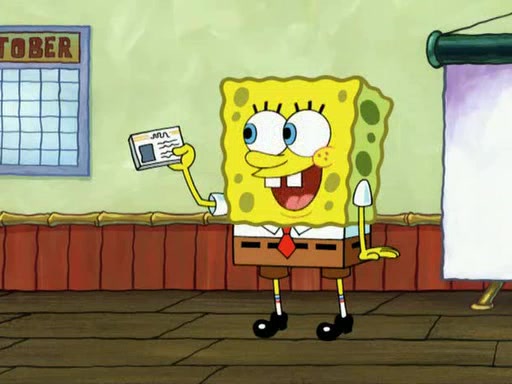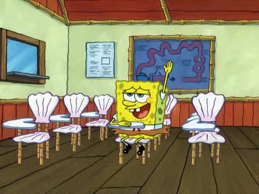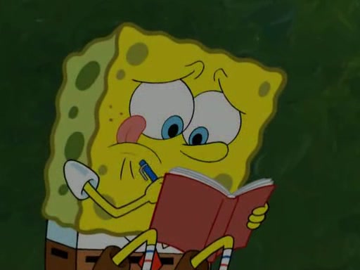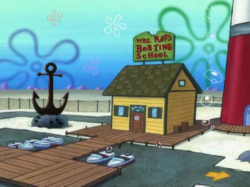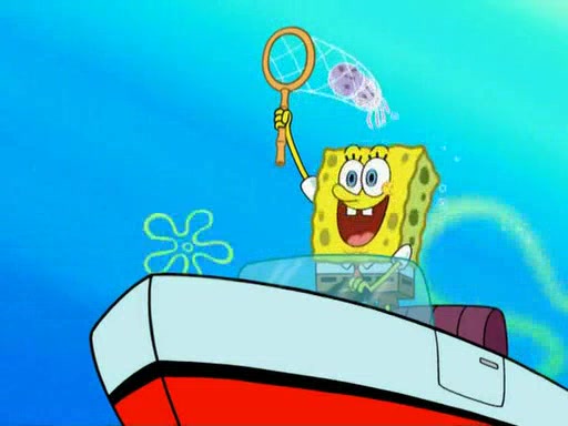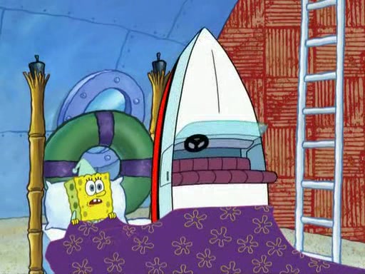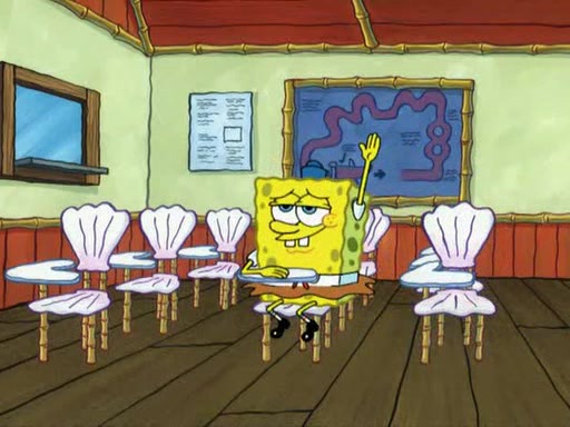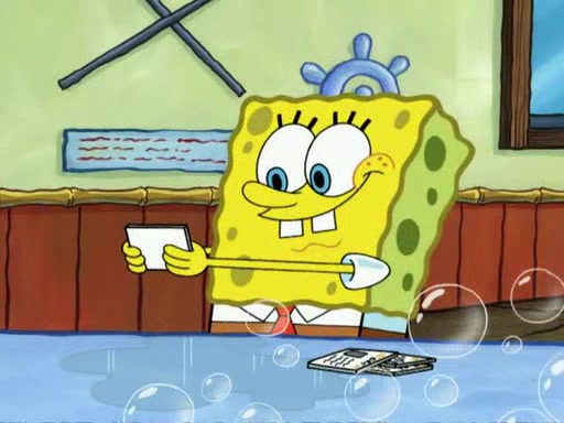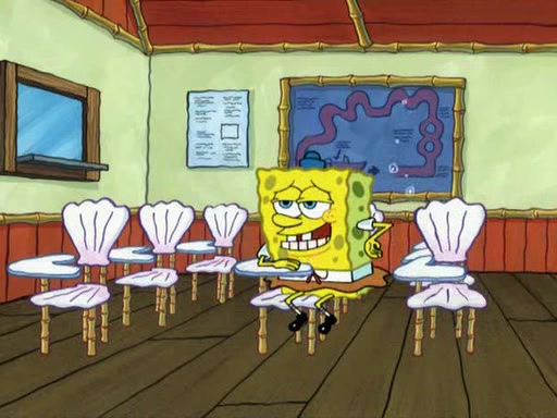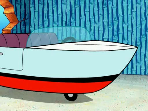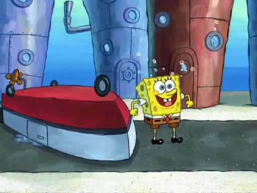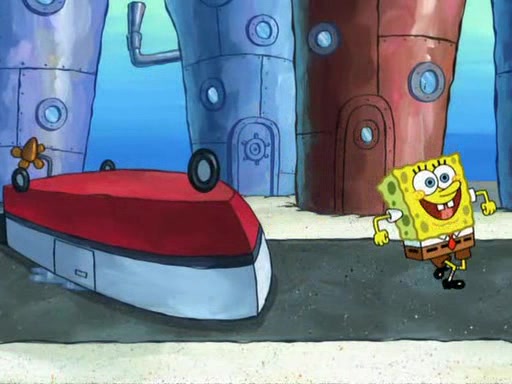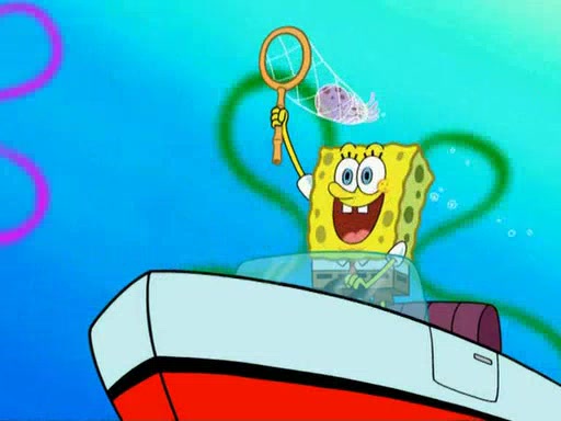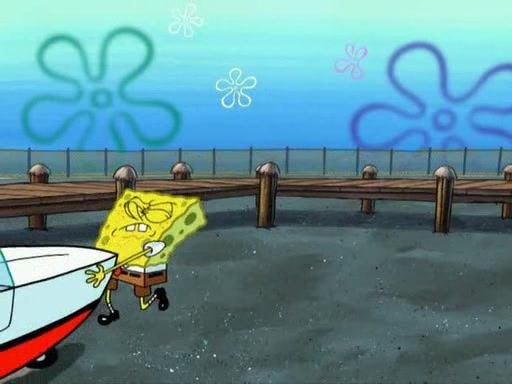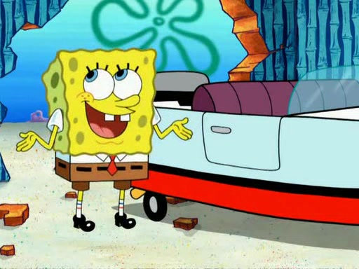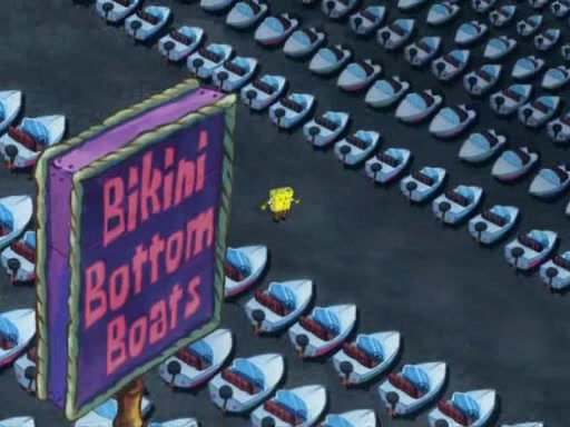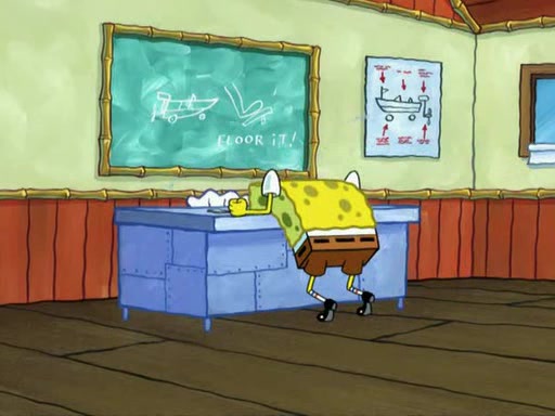 In the classroom, he realizes that living out everyone's lives won't work, and he breaks down crying on Mrs. Puff's desk. SpongeBob's mood quickly changes when he discovers a stack of blank driver's licenses. He takes a picture of himself, and prints out his own license. He then takes off with the student driver boat, naming it "Boaty," and joyriding throughout the city.