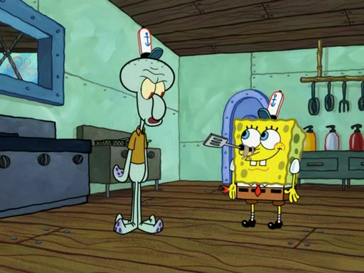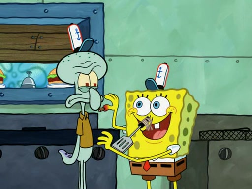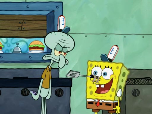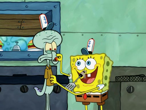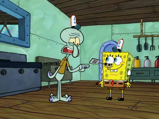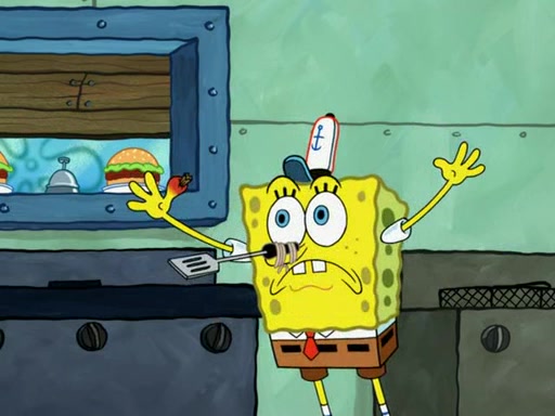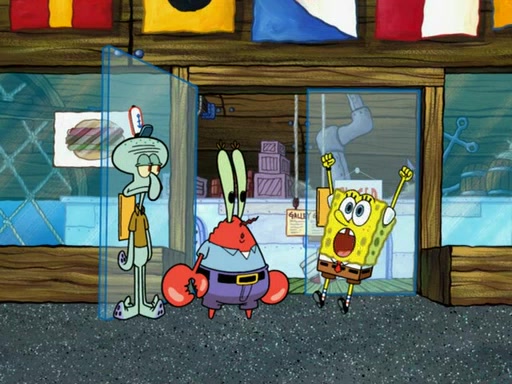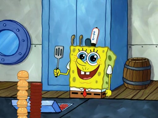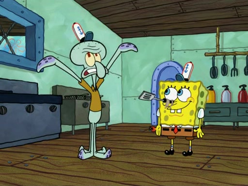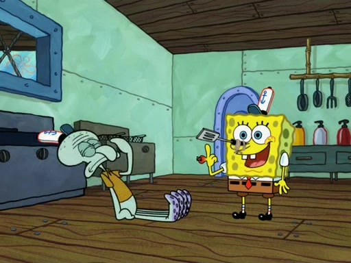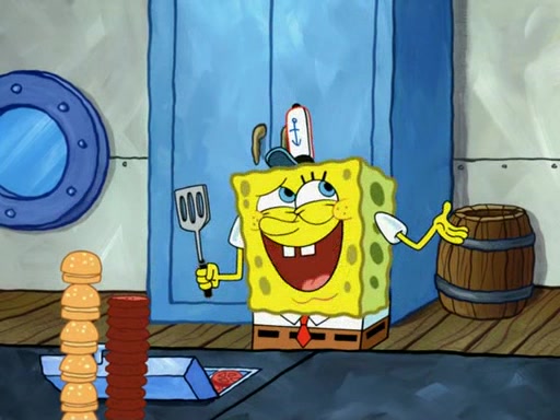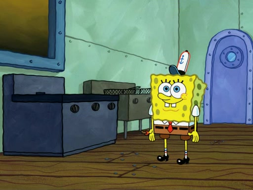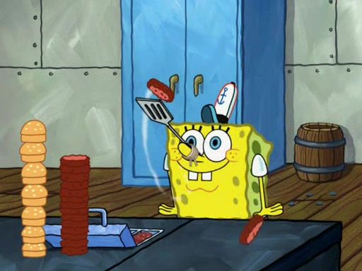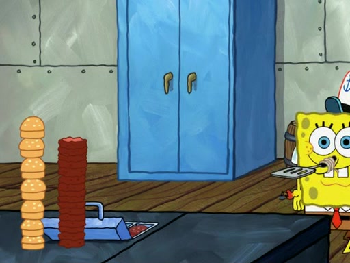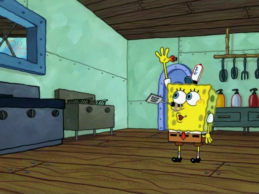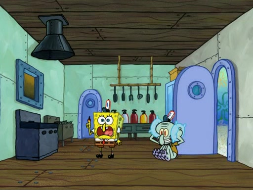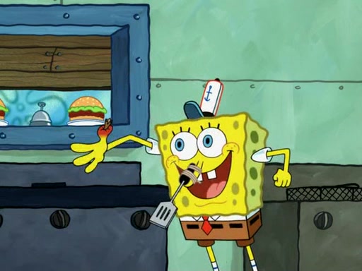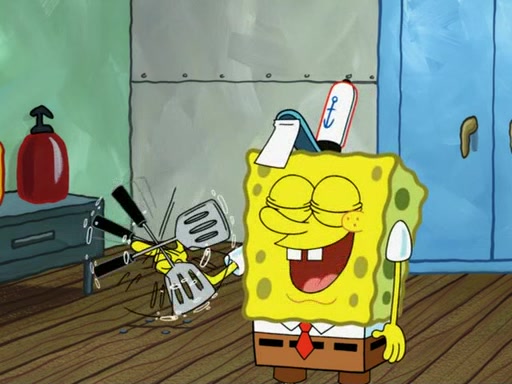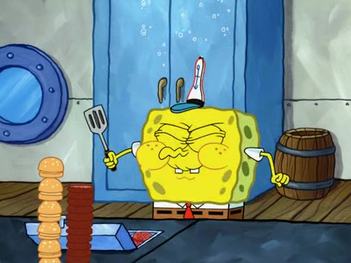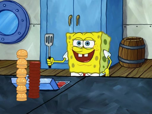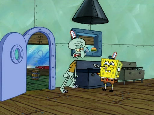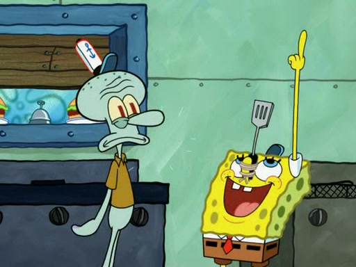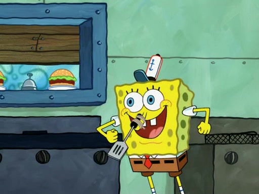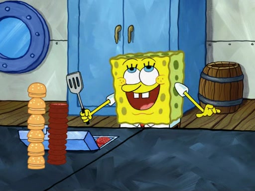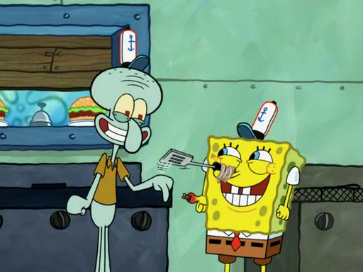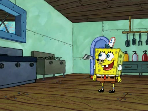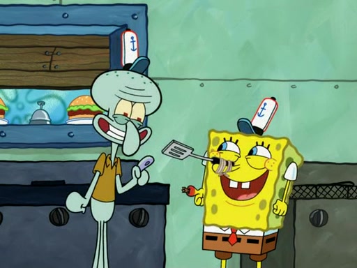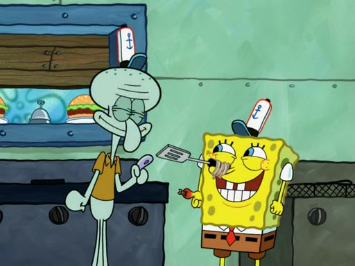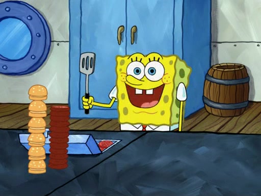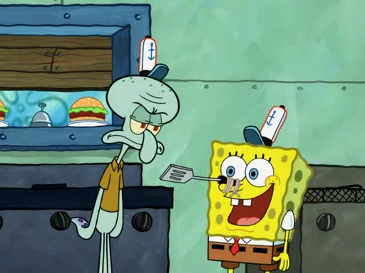The Krusty Krab opens at a seemingly average morning and SpongeBob is extremely happy. He gets the Krabby Patties ready and soon gets an order of two Krabby Patties plus an insult from Squidward, which is to no effect. His excitement eventually causes him to accidentally throw his spatula into the ceiling and when trying to get it out, he falls, nearly being injured by scissors and swords.