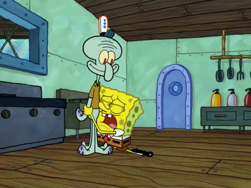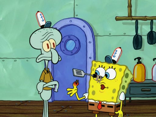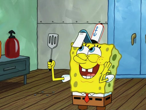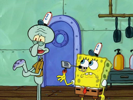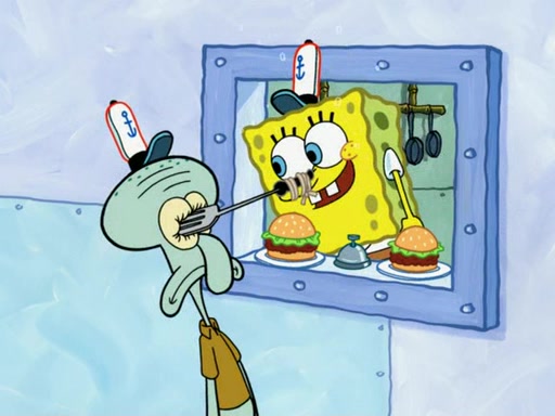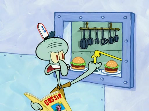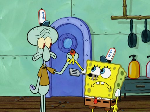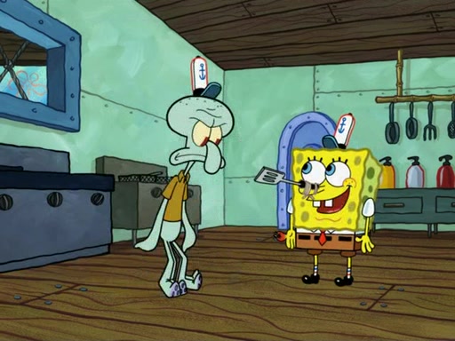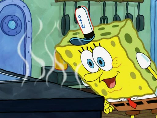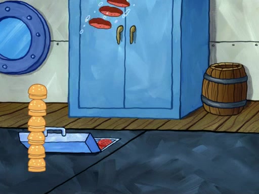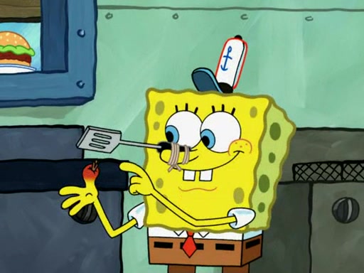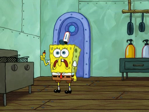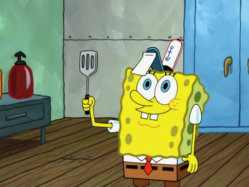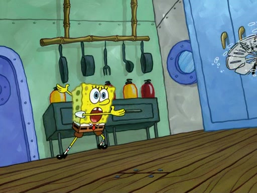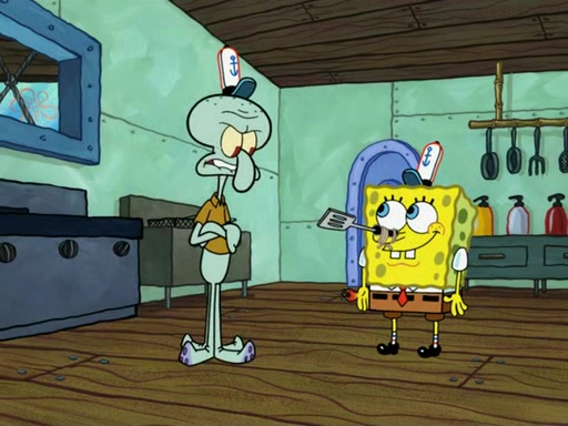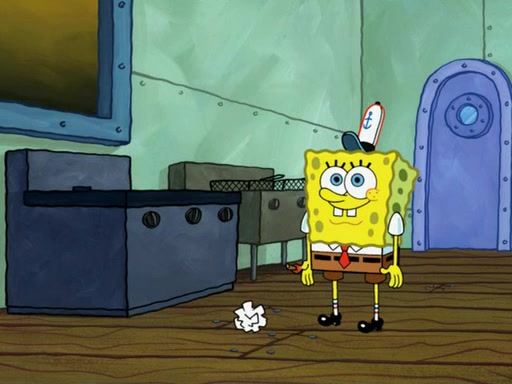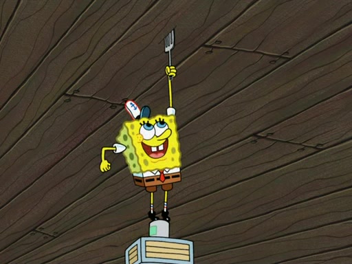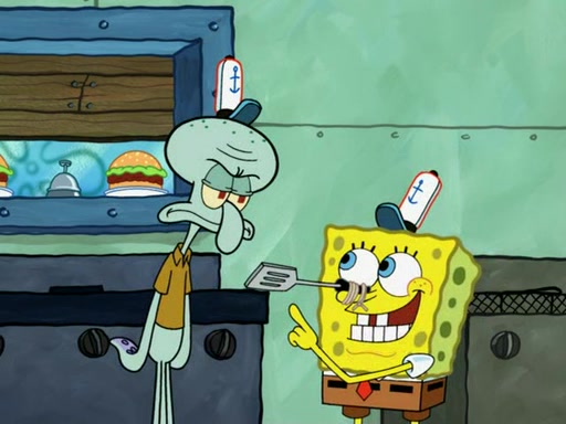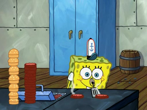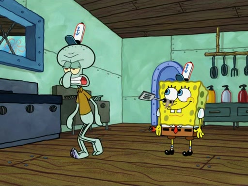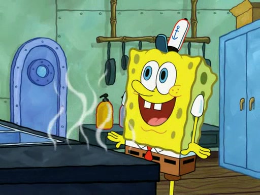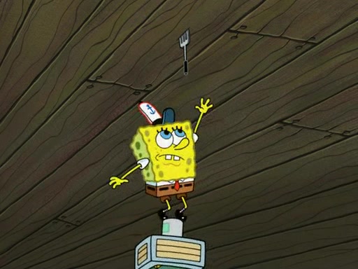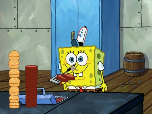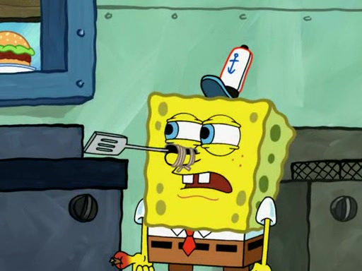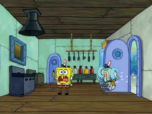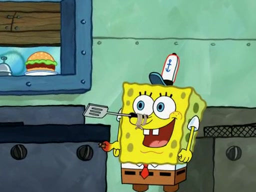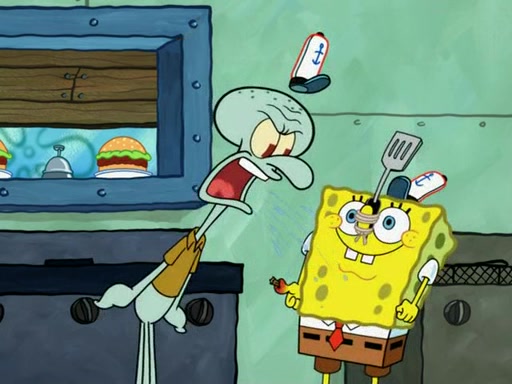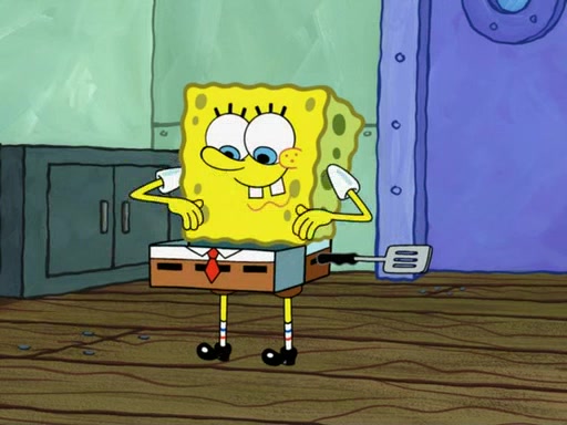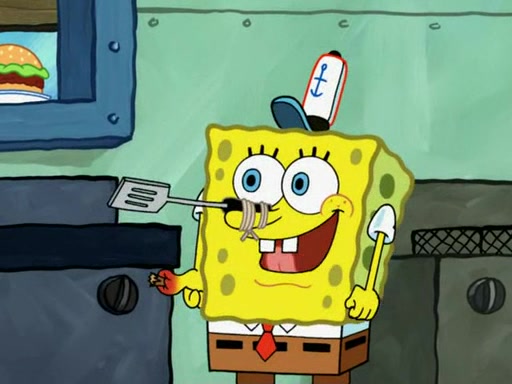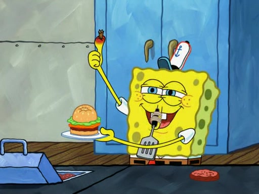 The Krusty Krab opens at a seemingly average morning and SpongeBob is extremely happy. He gets the Krabby Patties ready and soon gets an order of two Krabby Patties plus an insult from Squidward, which is to no effect. His excitement eventually causes him to accidentally throw his spatula into the ceiling and when trying to get it out, he falls, nearly being injured by scissors and swords.