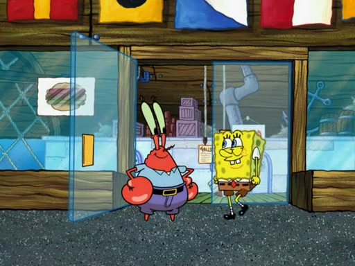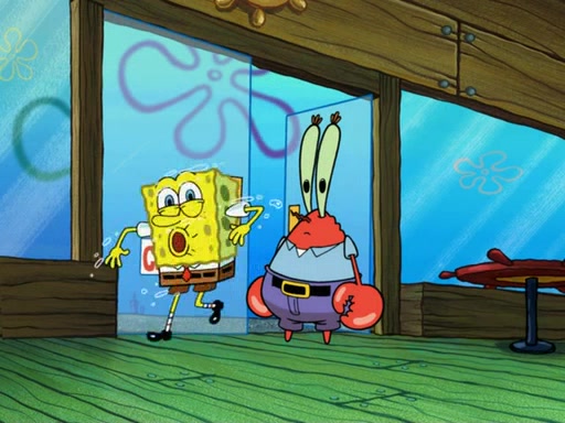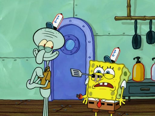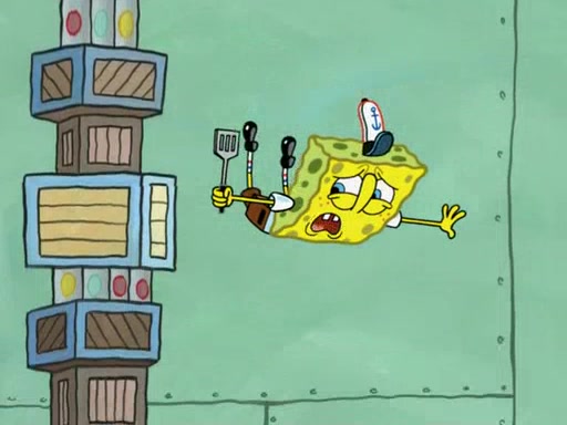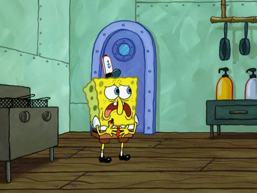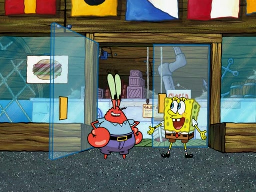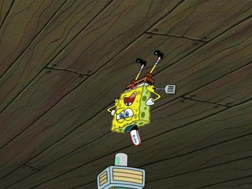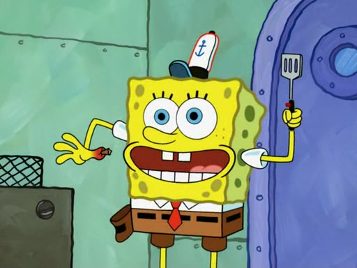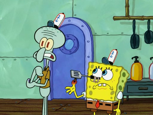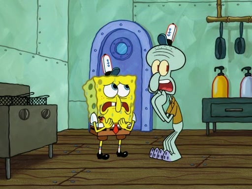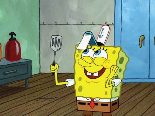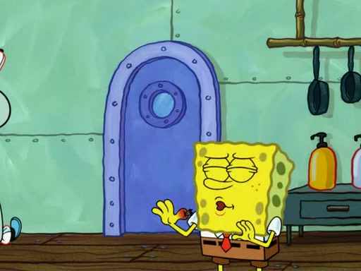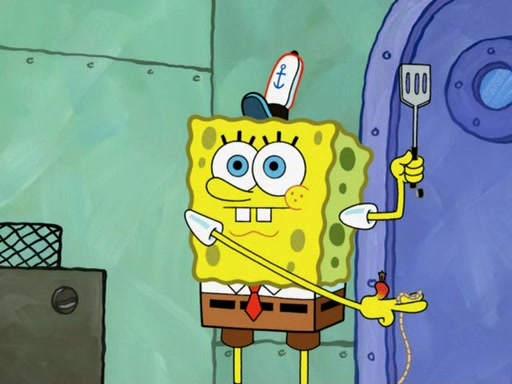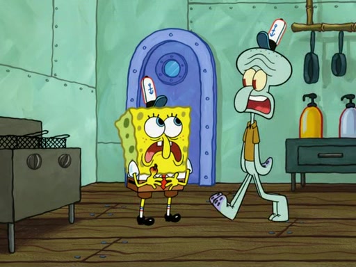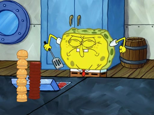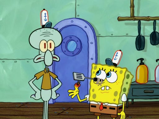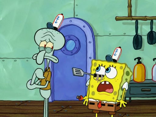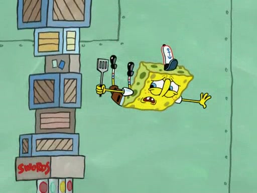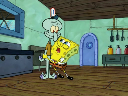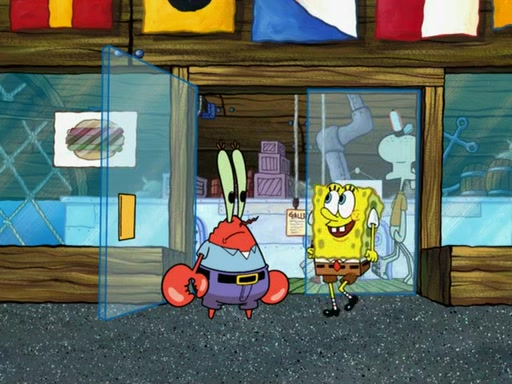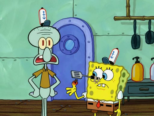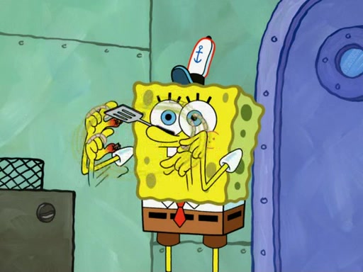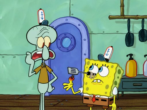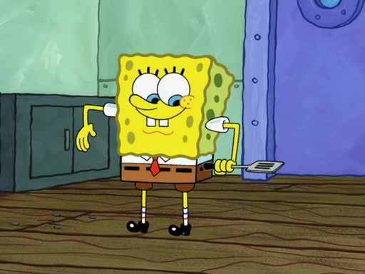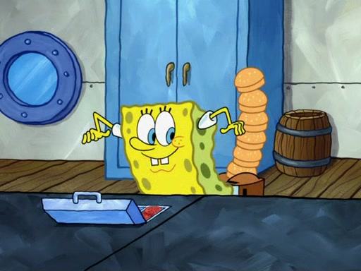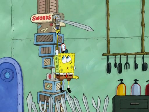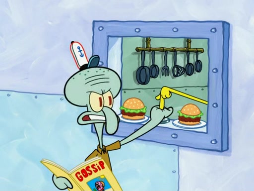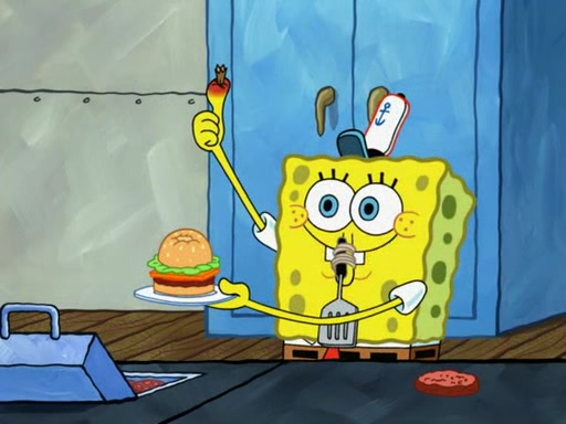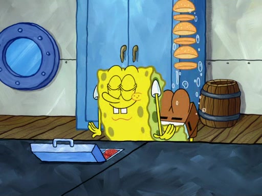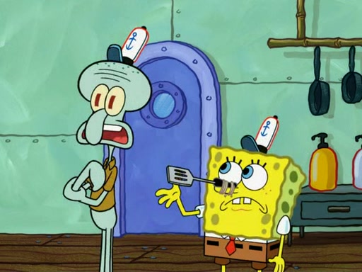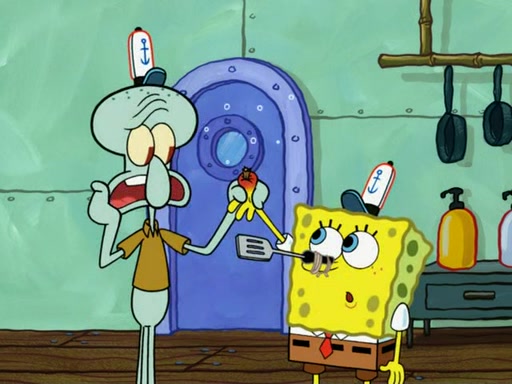 The Krusty Krab opens at a seemingly average morning and SpongeBob is extremely happy. He gets the Krabby Patties ready and soon gets an order of two Krabby Patties plus an insult from Squidward, which is to no effect. His excitement eventually causes him to accidentally throw his spatula into the ceiling and when trying to get it out, he falls, nearly being injured by scissors and swords.