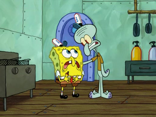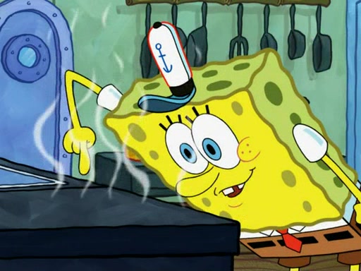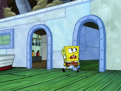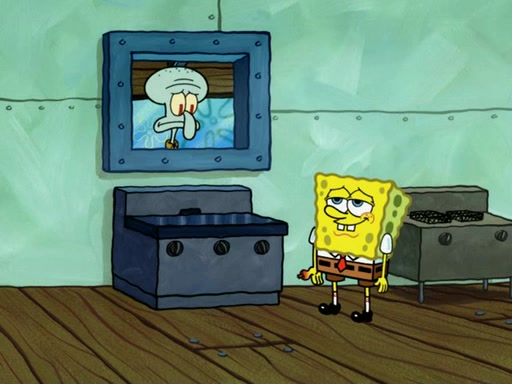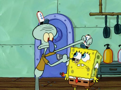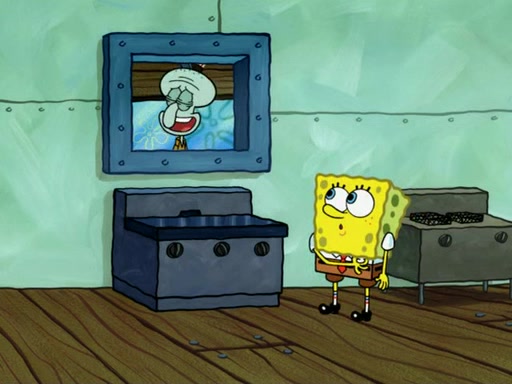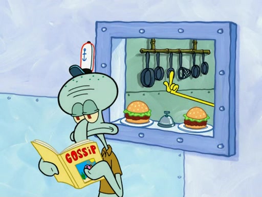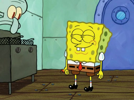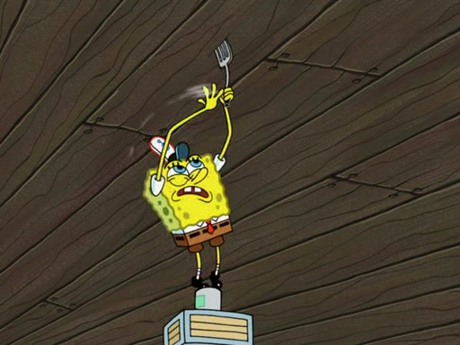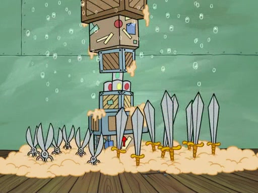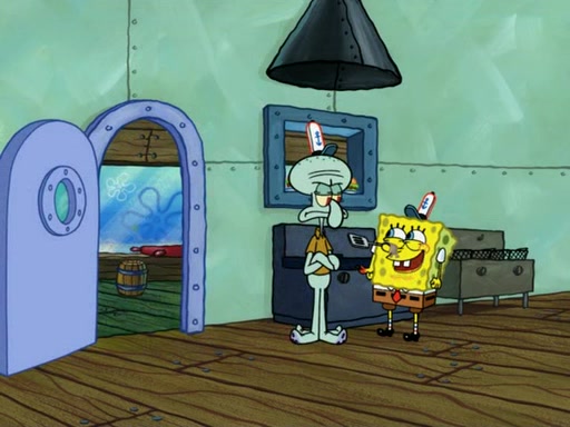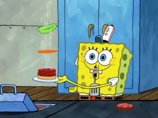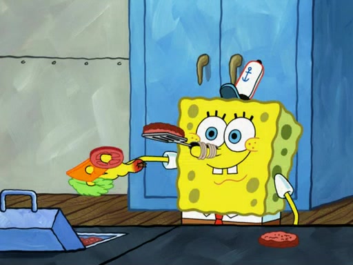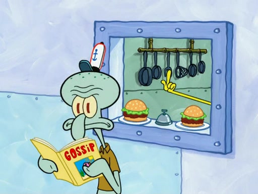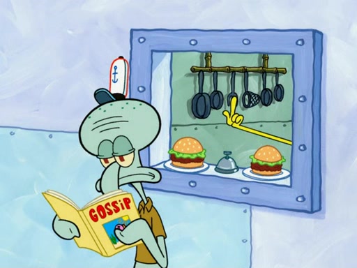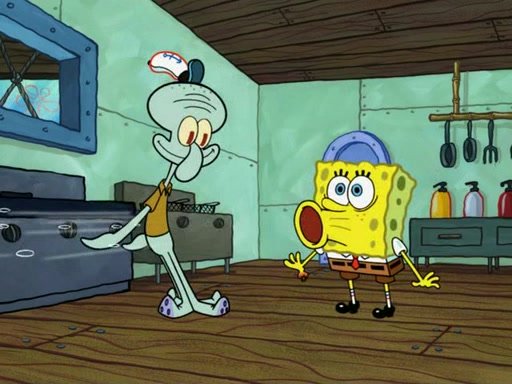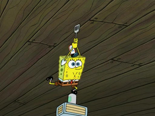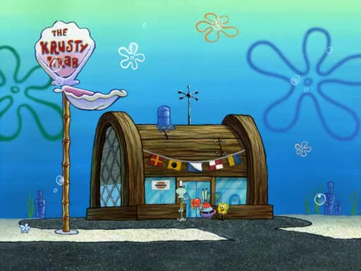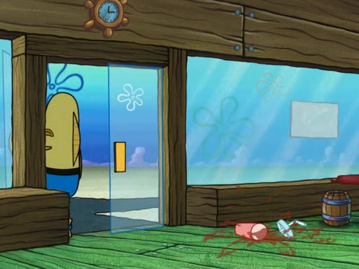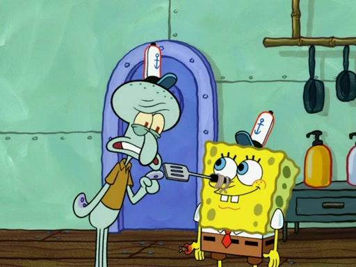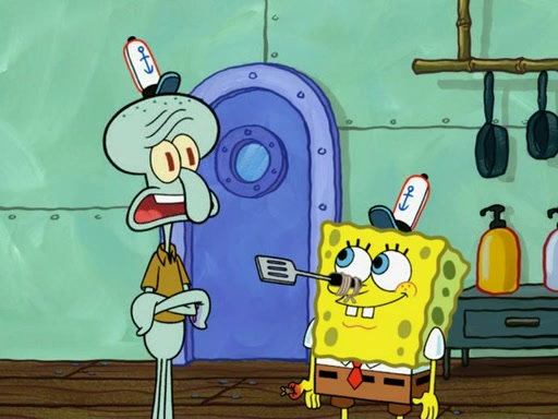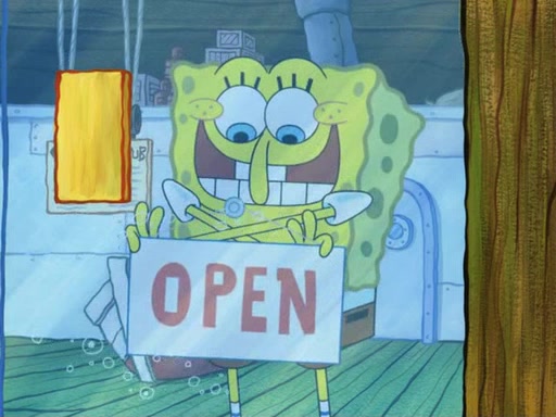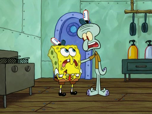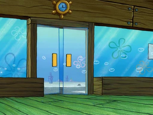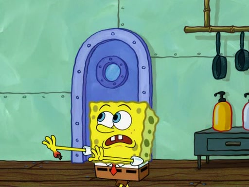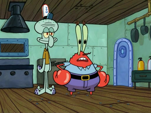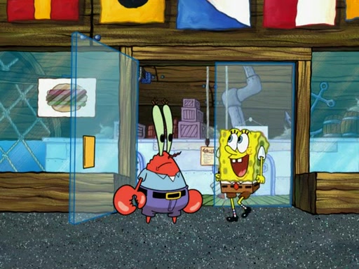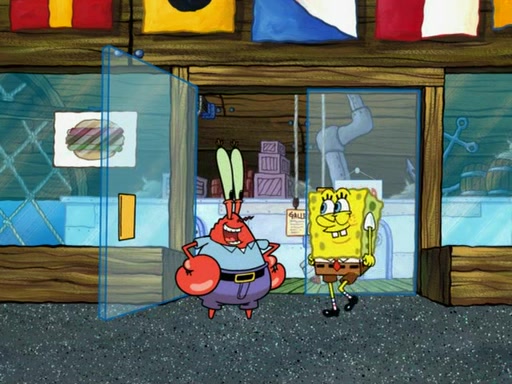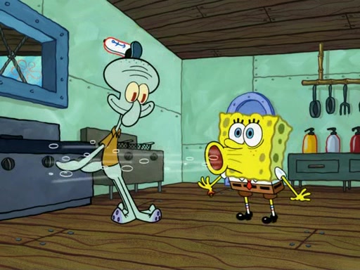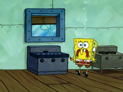 The Krusty Krab opens at a seemingly average morning and SpongeBob is extremely happy. He gets the Krabby Patties ready and soon gets an order of two Krabby Patties plus an insult from Squidward, which is to no effect. His excitement eventually causes him to accidentally throw his spatula into the ceiling and when trying to get it out, he falls, nearly being injured by scissors and swords.