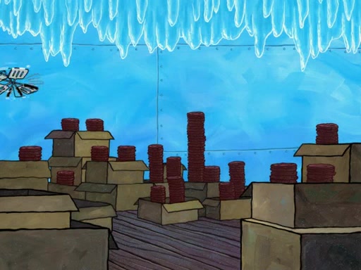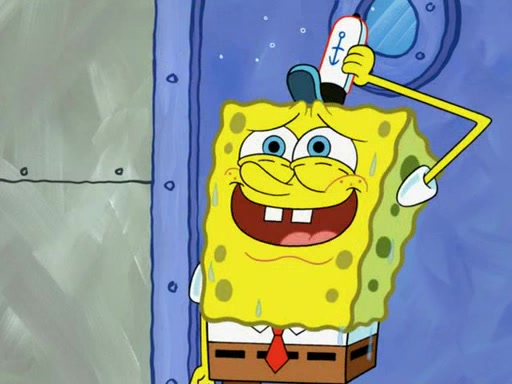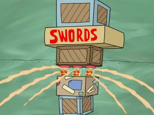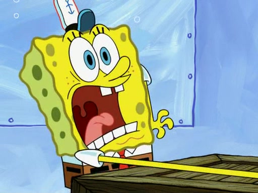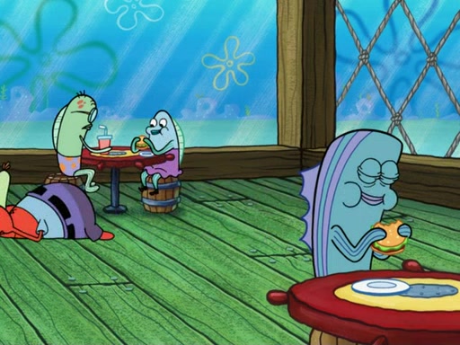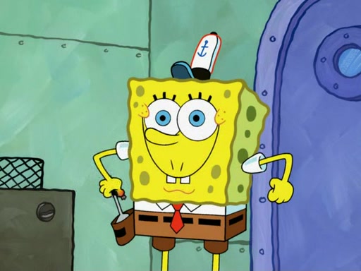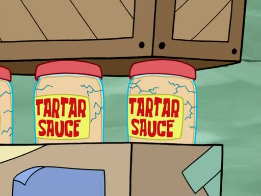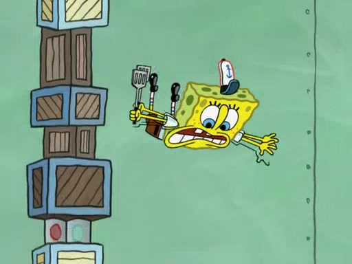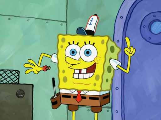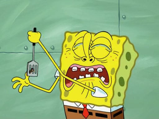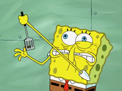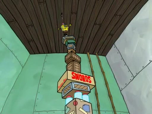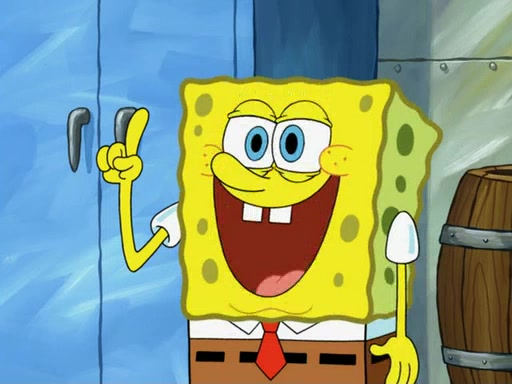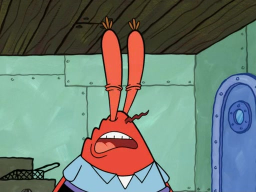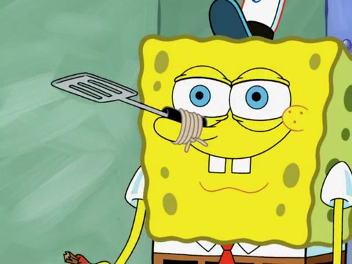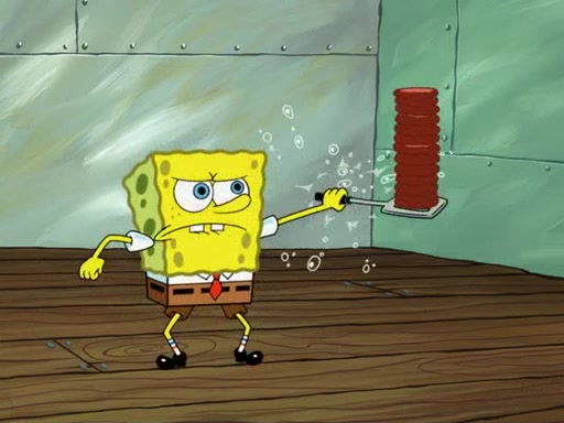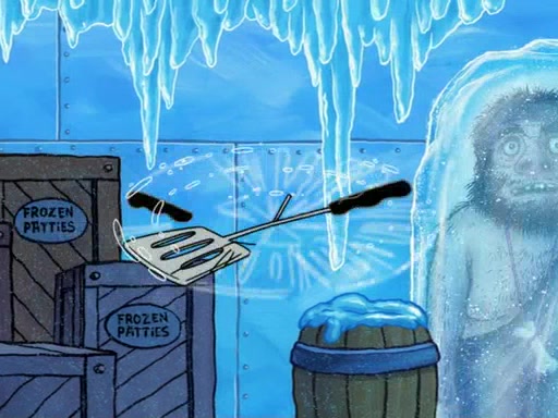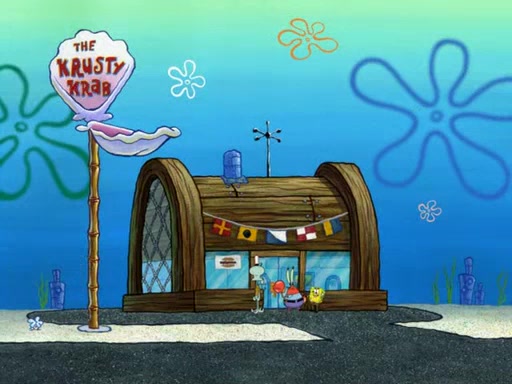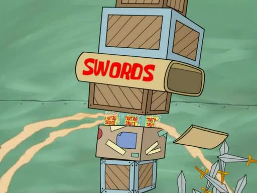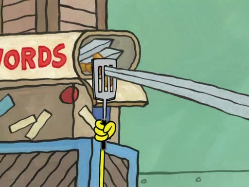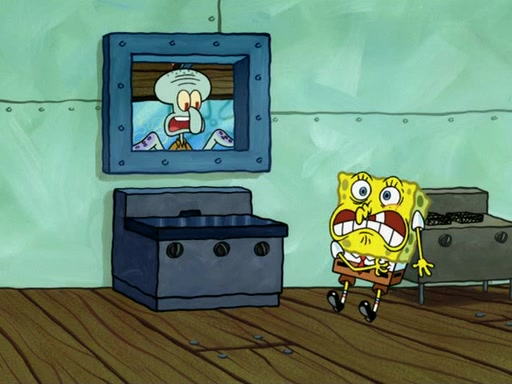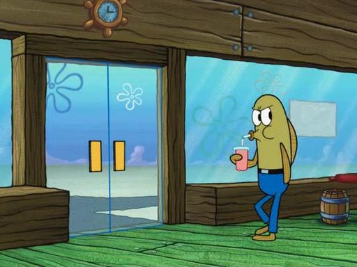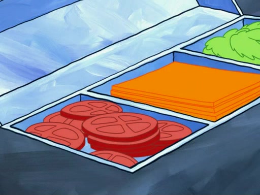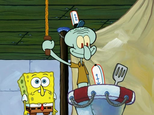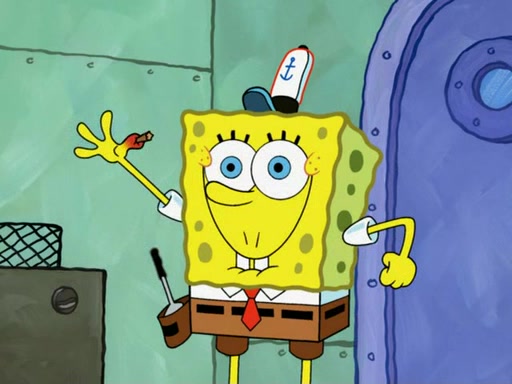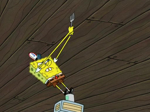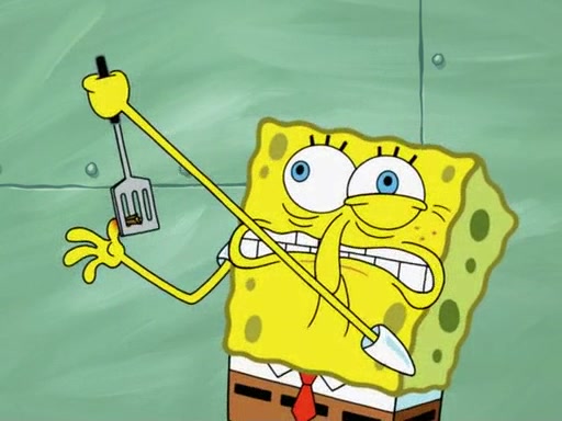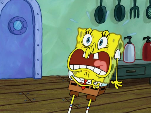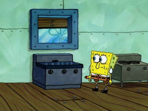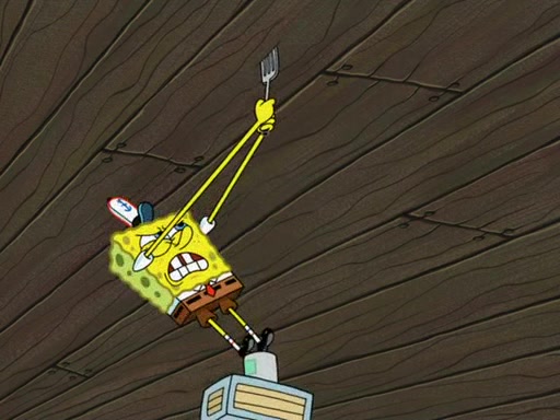 The Krusty Krab opens at a seemingly average morning and SpongeBob is extremely happy. He gets the Krabby Patties ready and soon gets an order of two Krabby Patties plus an insult from Squidward, which is to no effect. His excitement eventually causes him to accidentally throw his spatula into the ceiling and when trying to get it out, he falls, nearly being injured by scissors and swords.