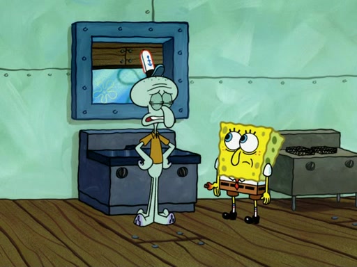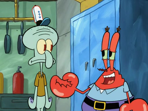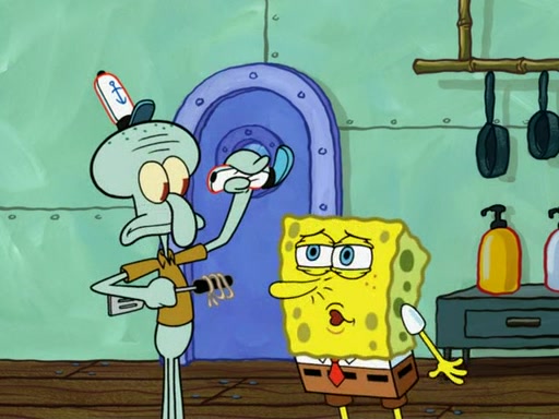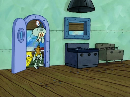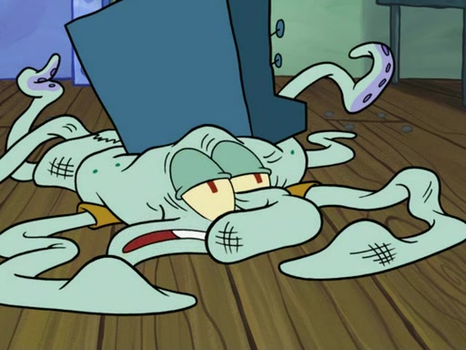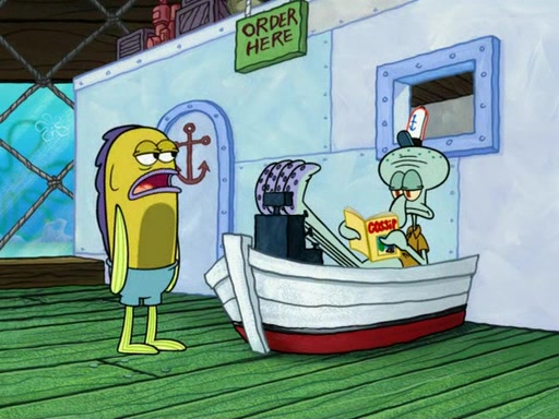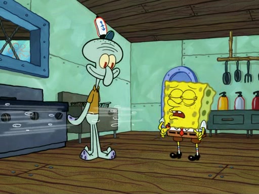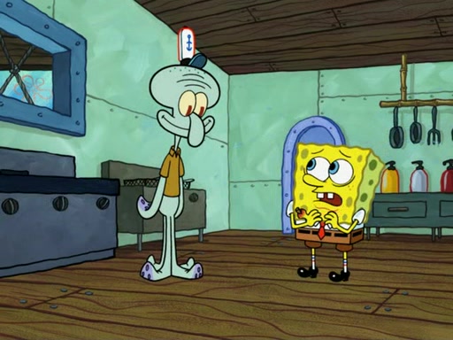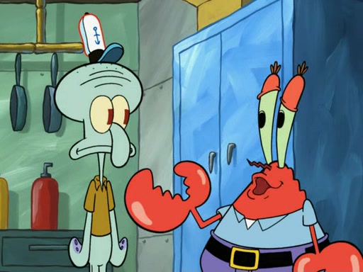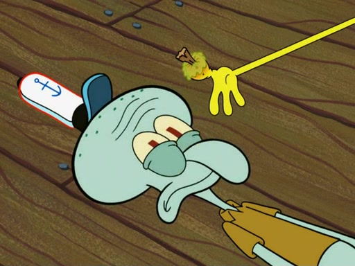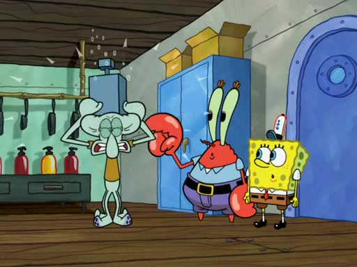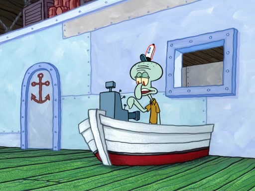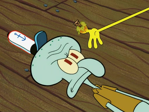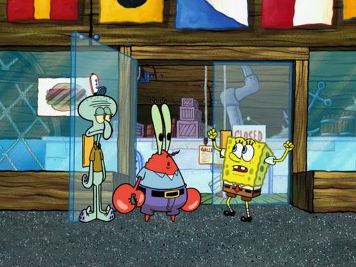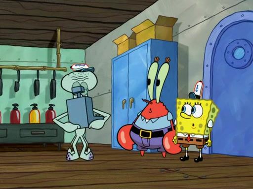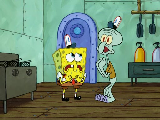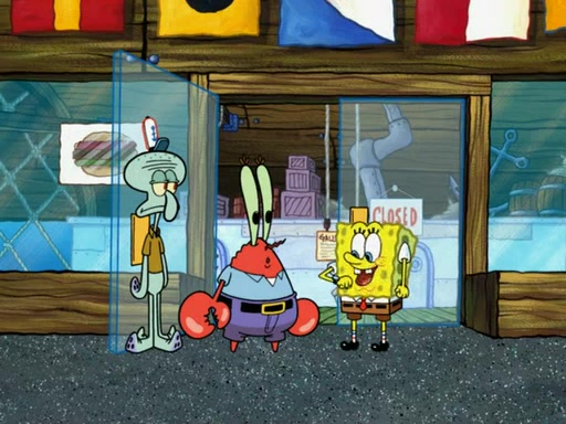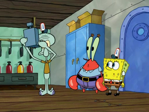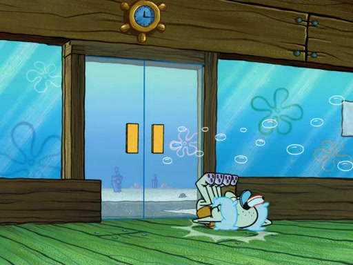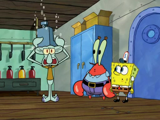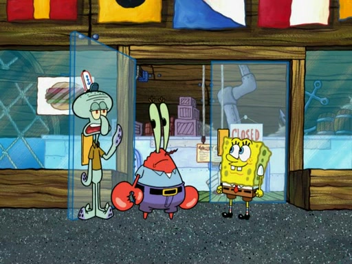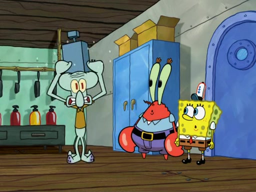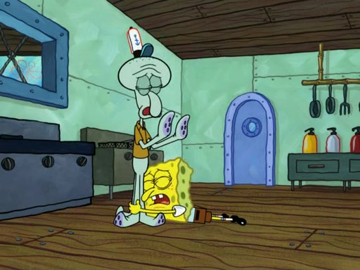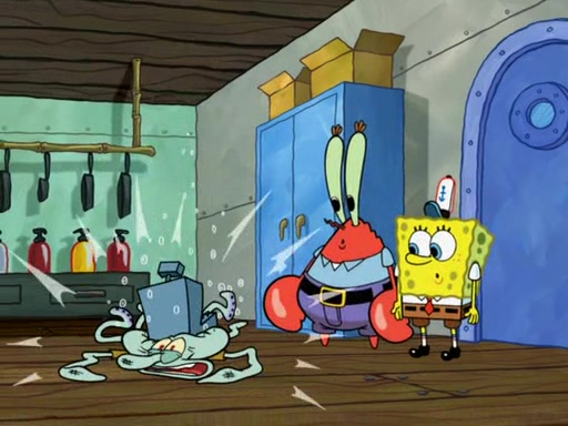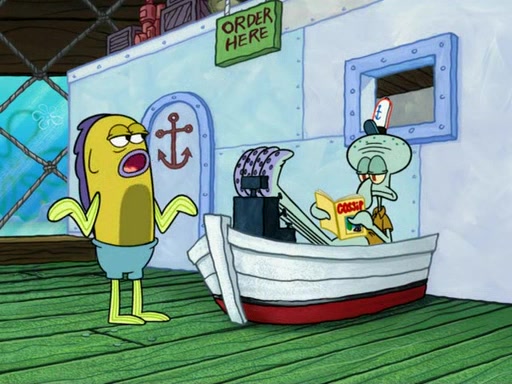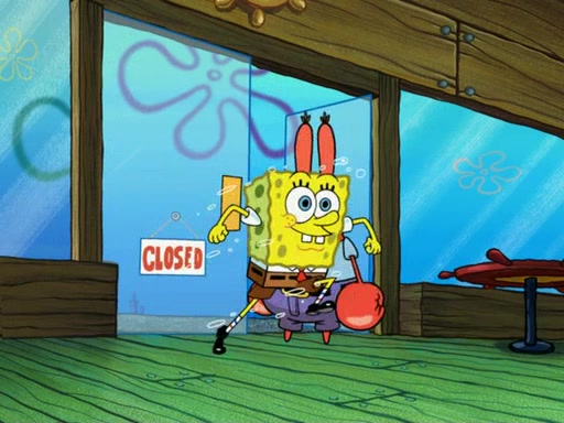 Squidward discovers that he could get sent home early and still get paid by getting injured, called worker's compensation, so he tries to injure himself, only to find out that his shift had ended two minutes ago.