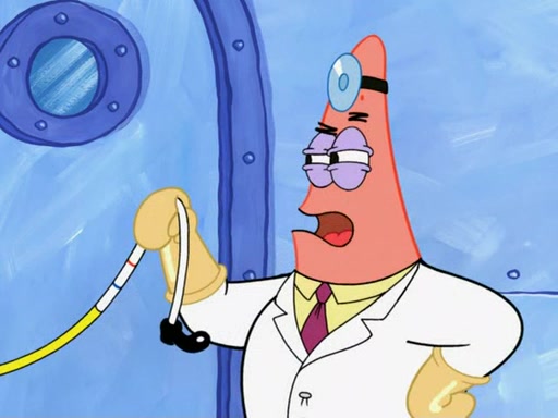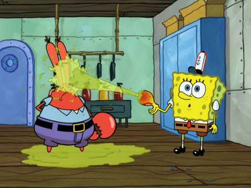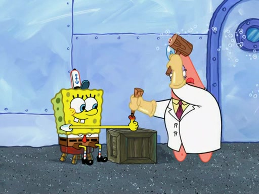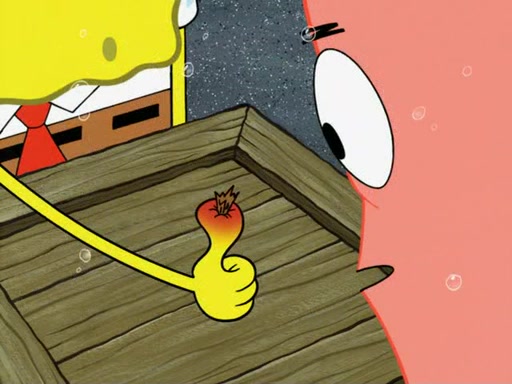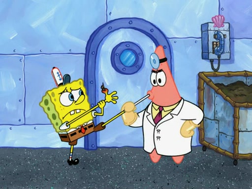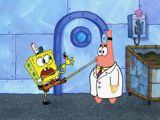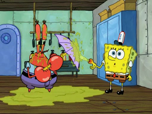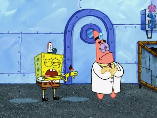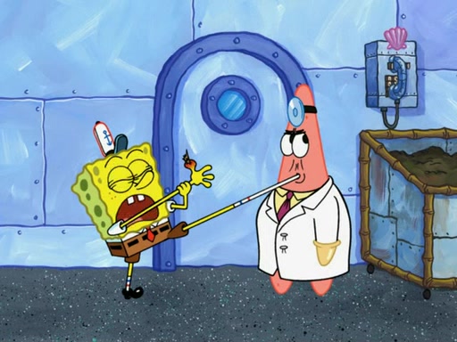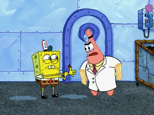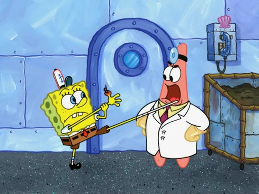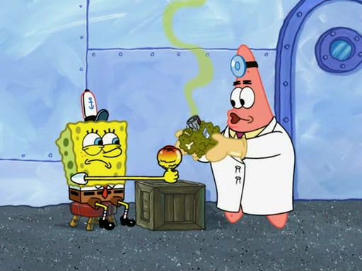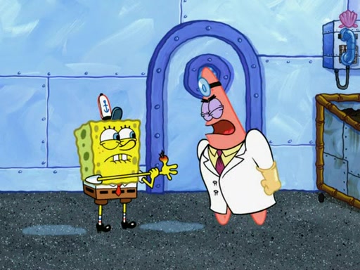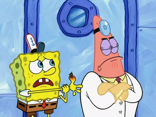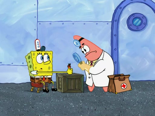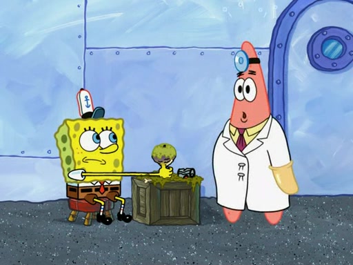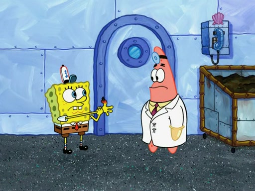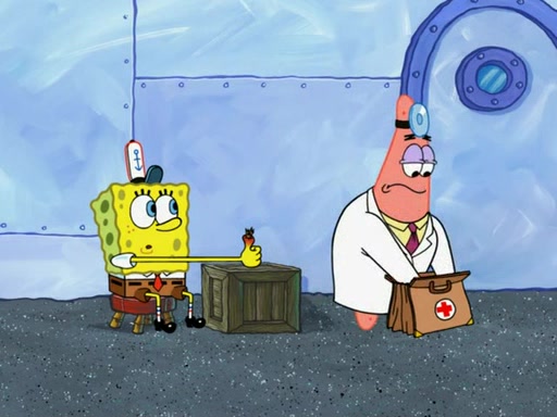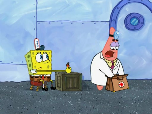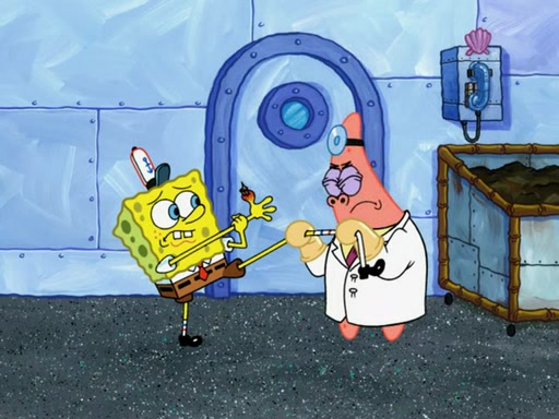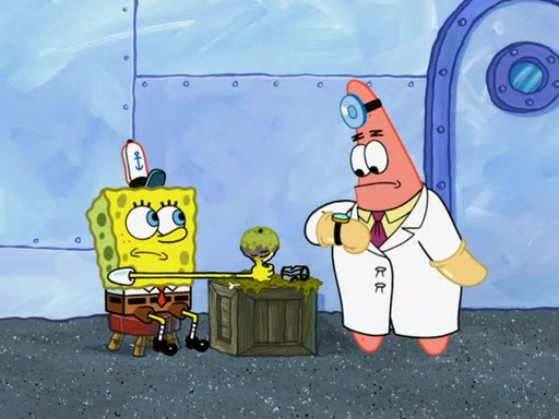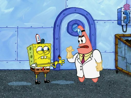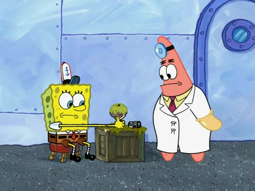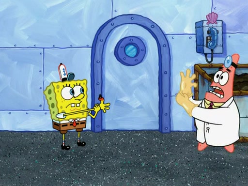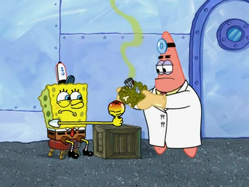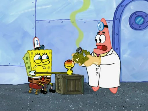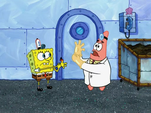 SpongeBob calls Patrick to get treated for it, but the treatment only ends up with his splinter further into his thumb, making it swell more and even infecting it. SpongeBob soon runs into Mr. Krabs and Squidward. Mr. Krabs soon sees the splinter and takes it out, curing him and causing an eruption of pus to impact Mr. Krabs.