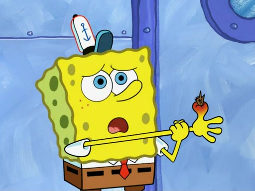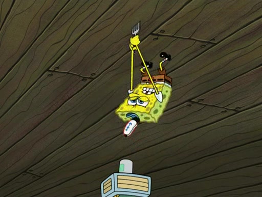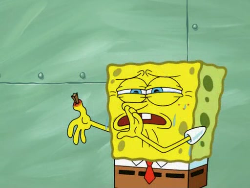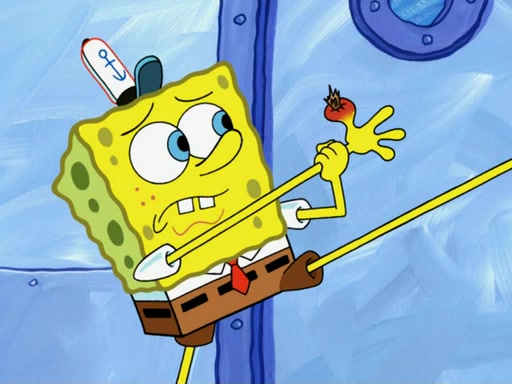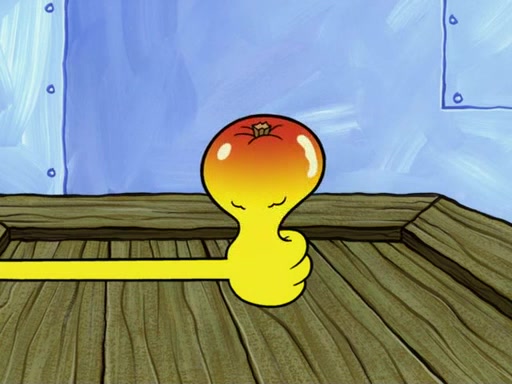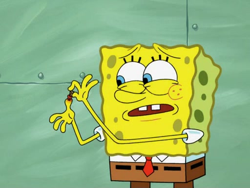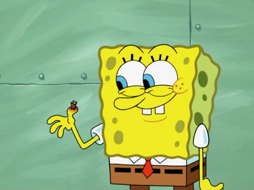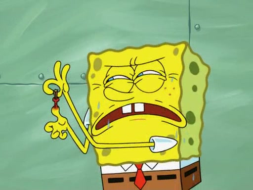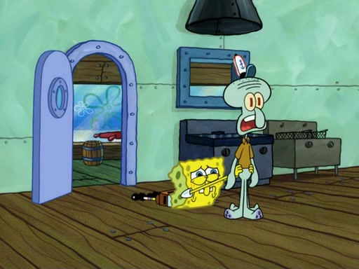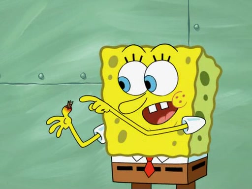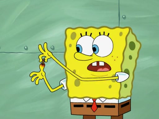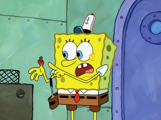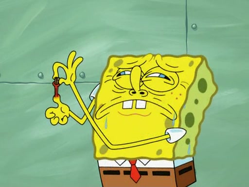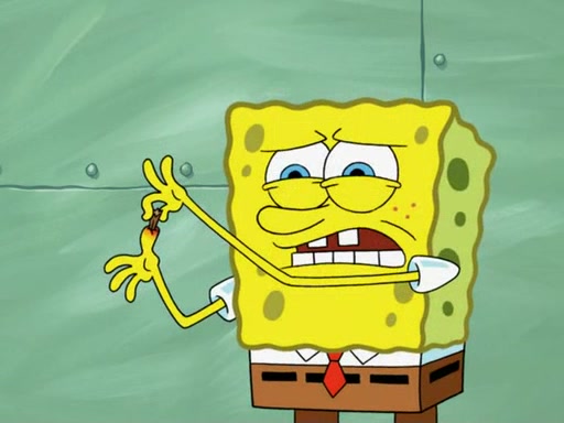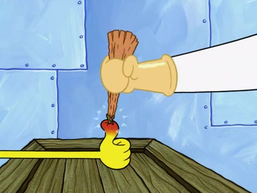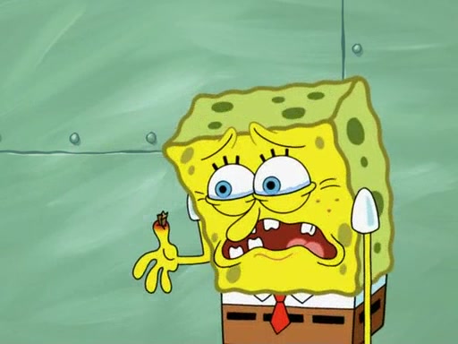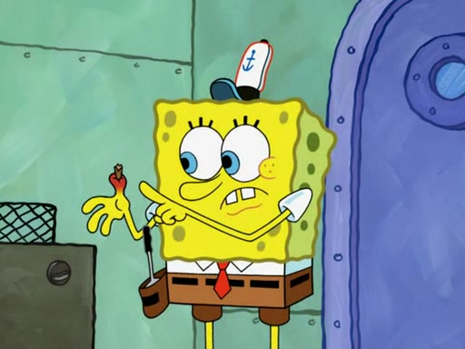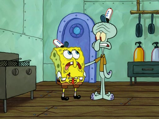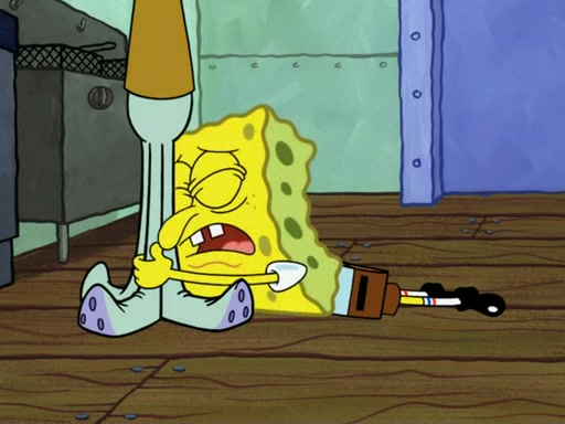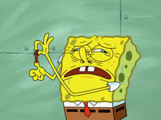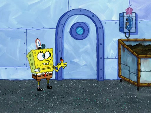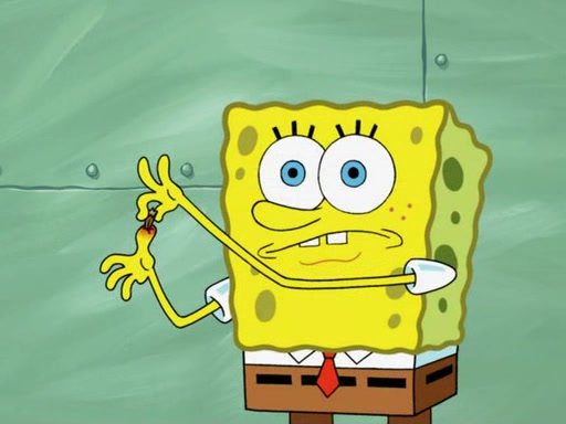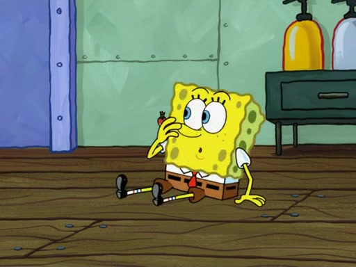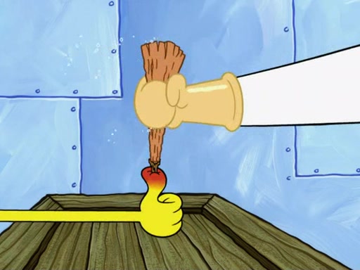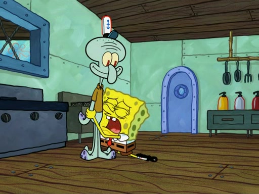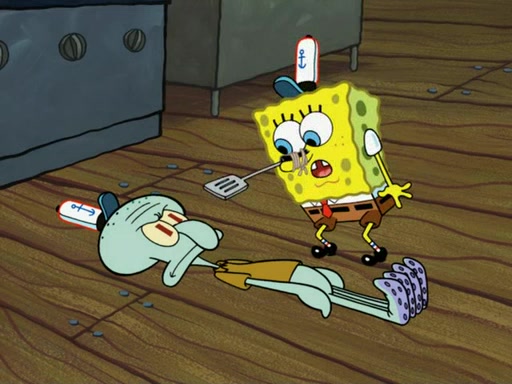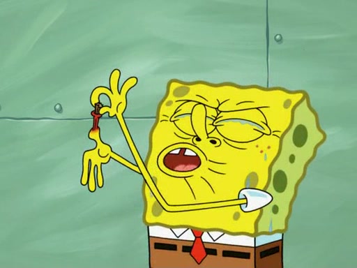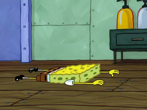 Upon landing, all is well but he trips on tartar sauce. His thumb drags across the wooden floor and rams into a small slab that breaks in half, giving him a splinter that immediately makes his thumb red and swollen. His weak arms keep him from getting it out and even biting it doesn't work. The customer that ordered earlier is turning impatient and the splinter keeps SpongeBob from holding the spatula needed to serve him. He decides to tie it on his nose and Squidward soon finds out about it.