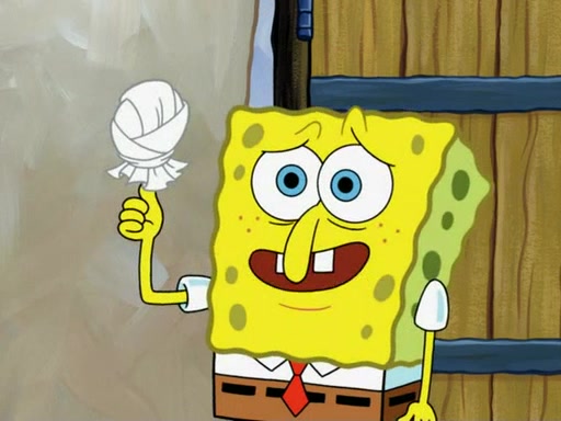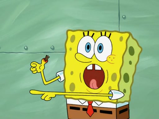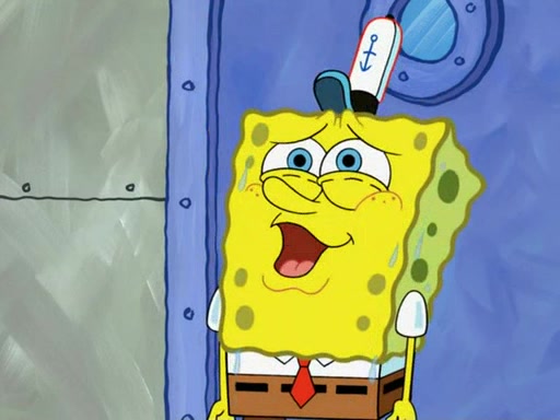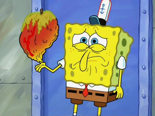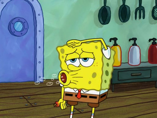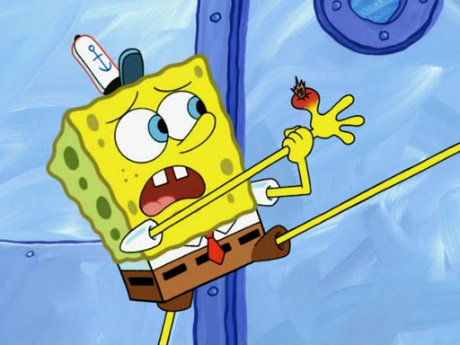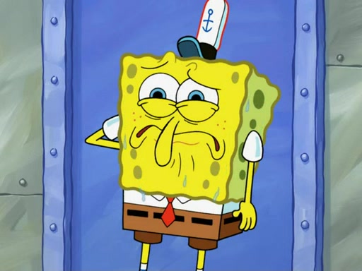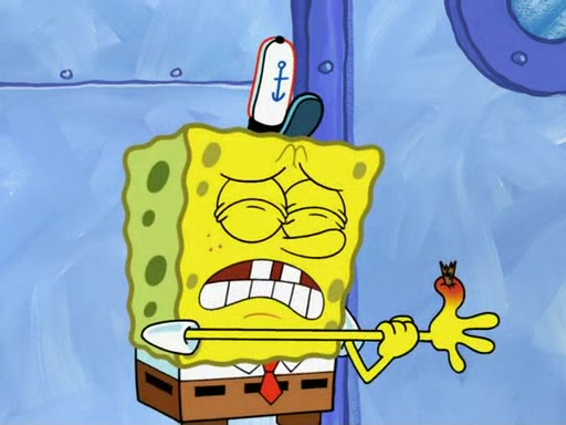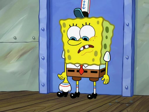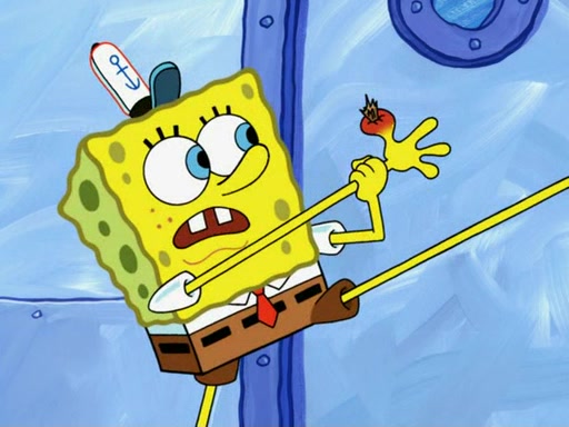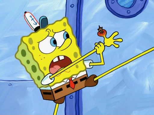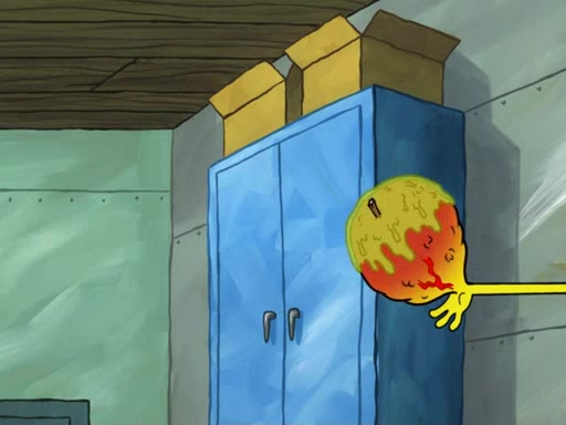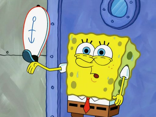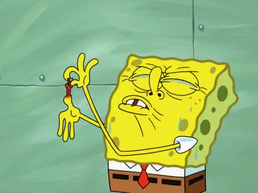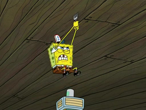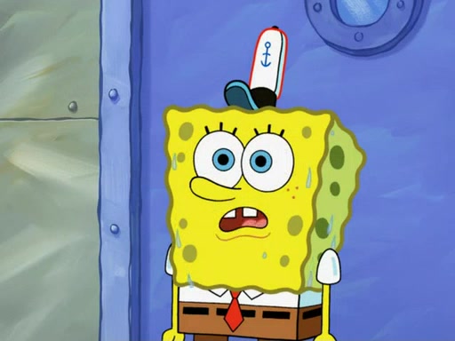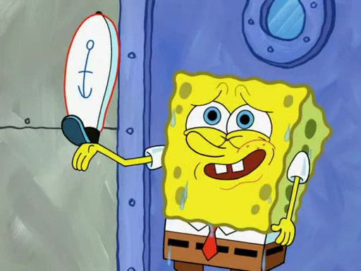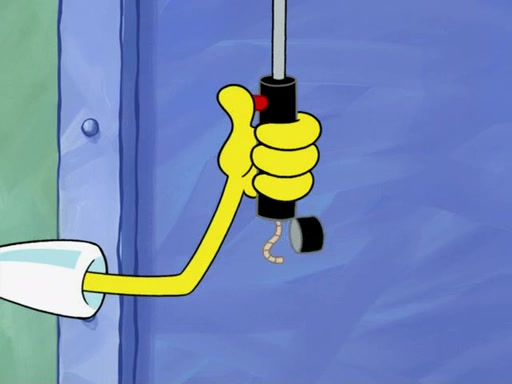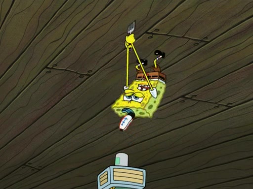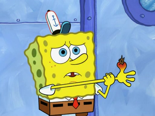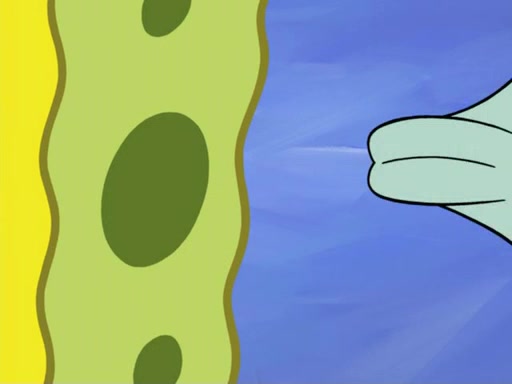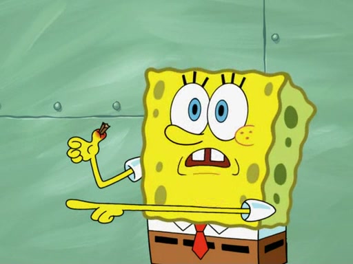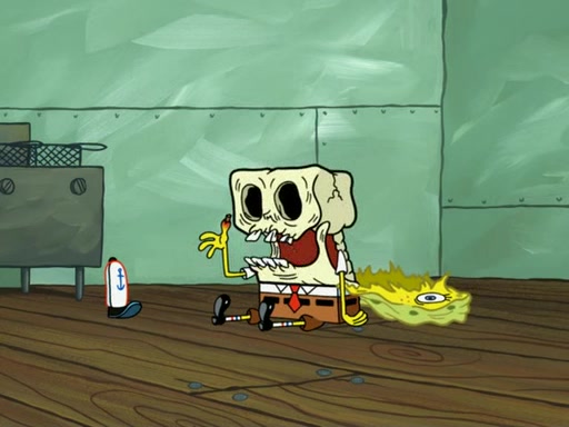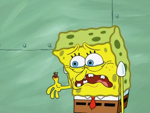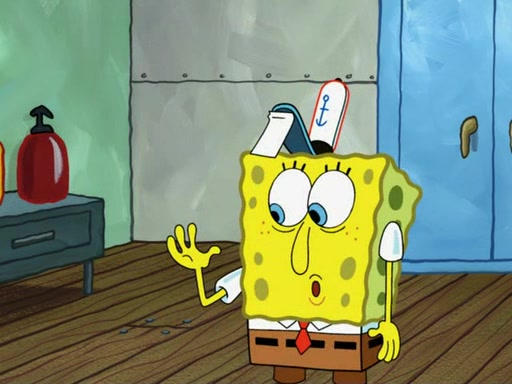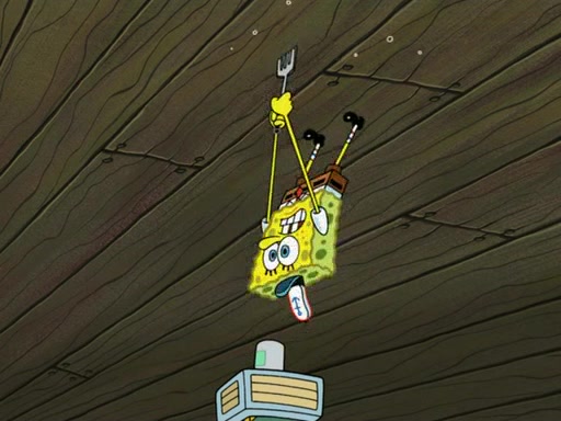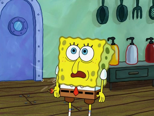 Upon landing, all is well but he trips on tartar sauce. His thumb drags across the wooden floor and rams into a small slab that breaks in half, giving him a splinter that immediately makes his thumb red and swollen. His weak arms keep him from getting it out and even biting it doesn't work. The customer that ordered earlier is turning impatient and the splinter keeps SpongeBob from holding the spatula needed to serve him. He decides to tie it on his nose and Squidward soon finds out about it.