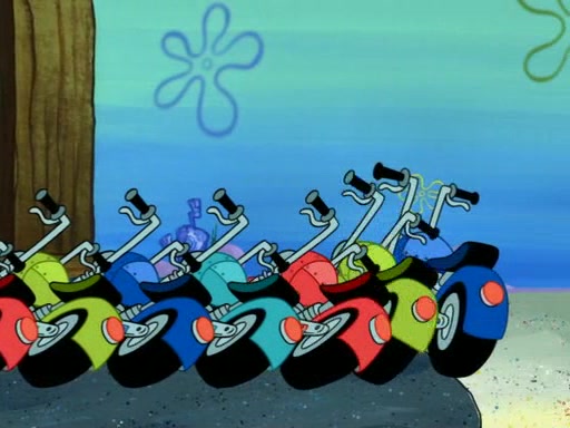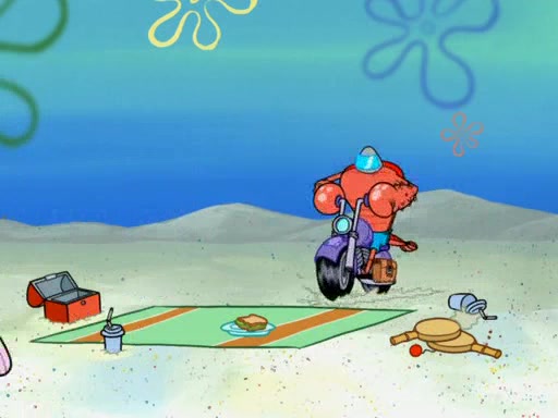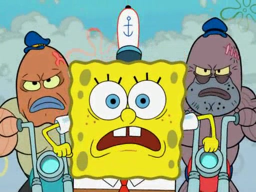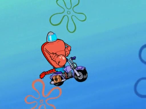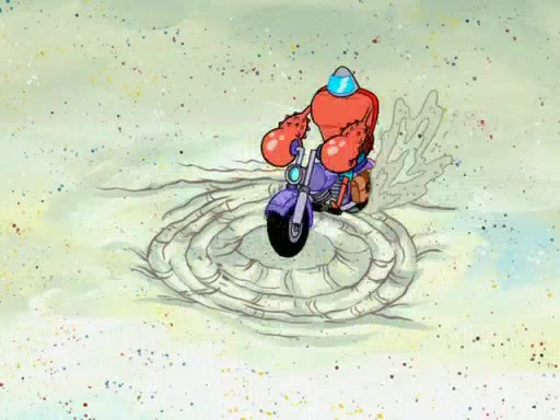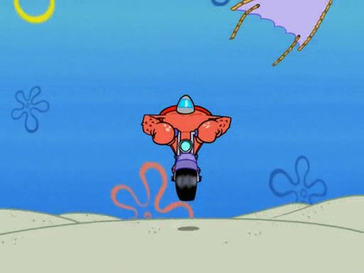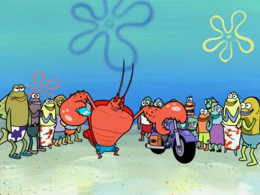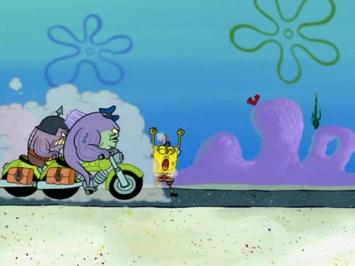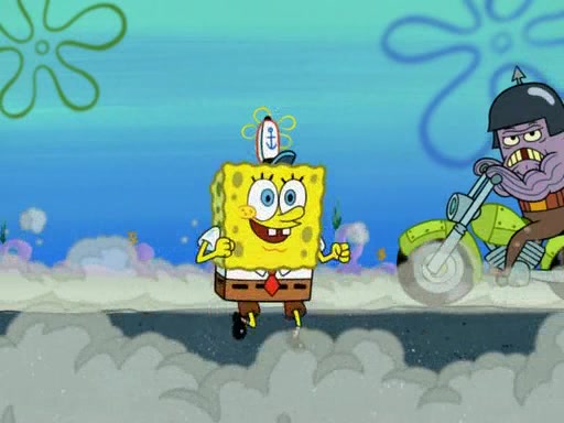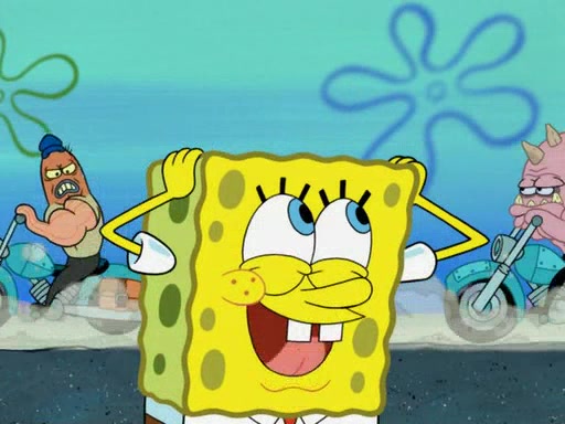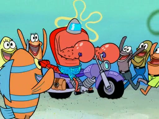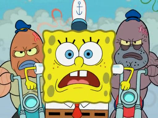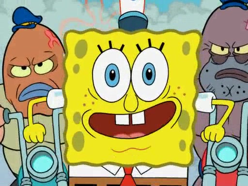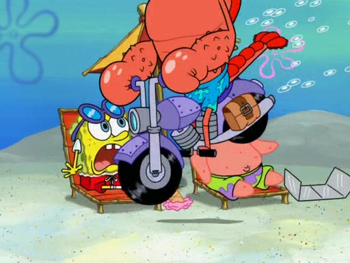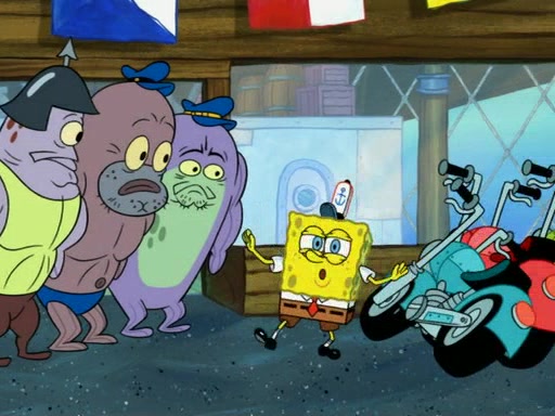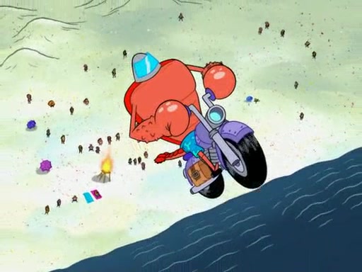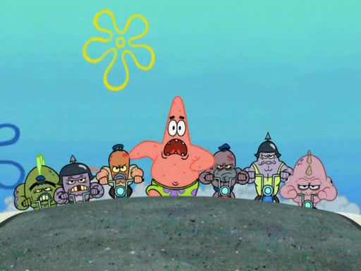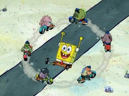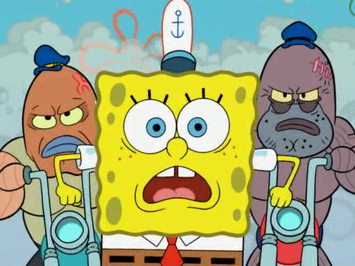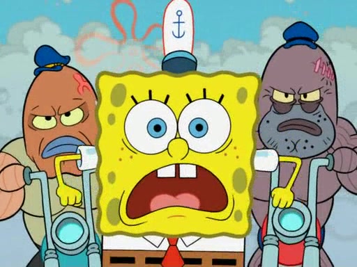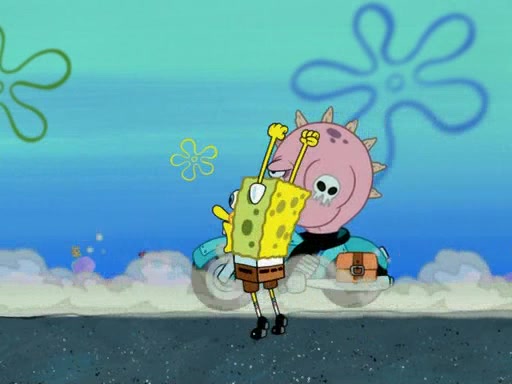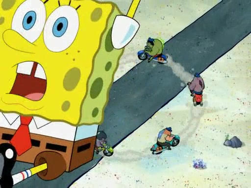 The next day, SpongeBob is working at the Krusty Krab, when Patrick (who apparently survived the monster attack) is running towards the restaurant, trying to get away from five mad bikers (Possibly the Wild Ones). He tells SpongeBob that he was right, and that he would never try such stupid stunts again. When SpongeBob goes outside to talk to the bikers, he knocks down their bikes. SpongeBob and Patrick run down the street, and SpongeBob gets a rush of adrenaline. SpongeBob shouts that he's living like Larry, and is now obsessed with daredevil stunts. The bikers hit SpongeBob with their bikes, sending SpongeBob flying into the air.