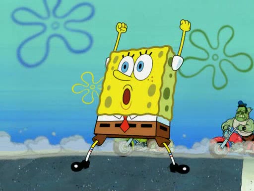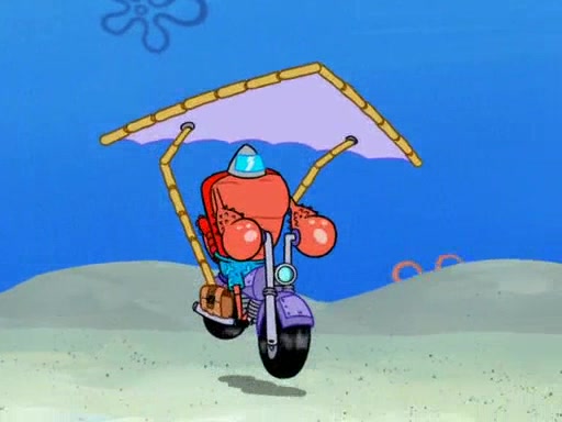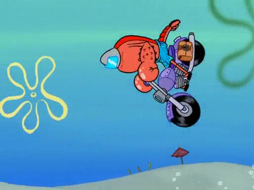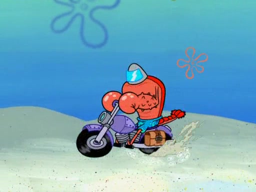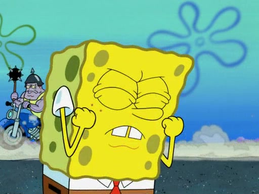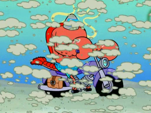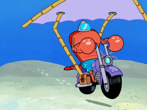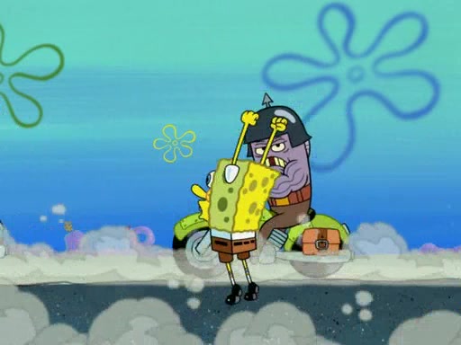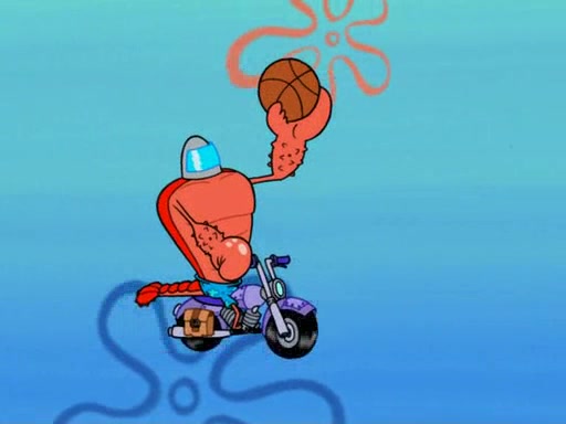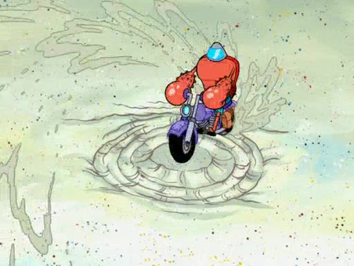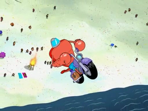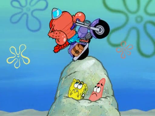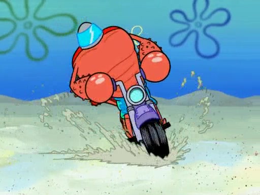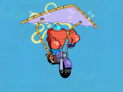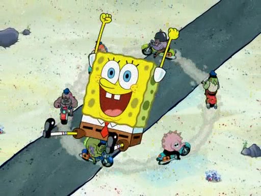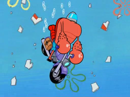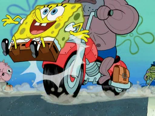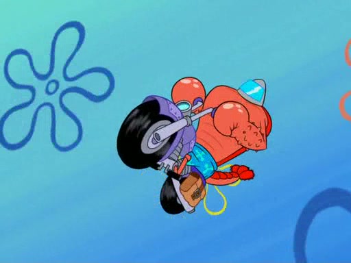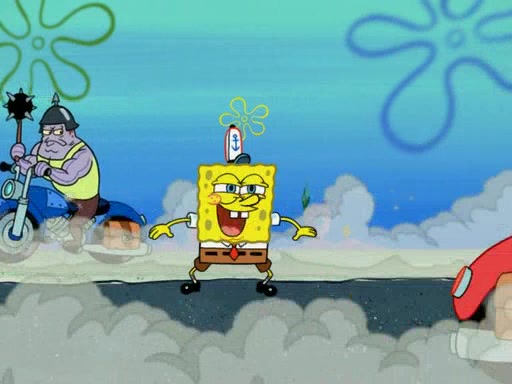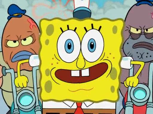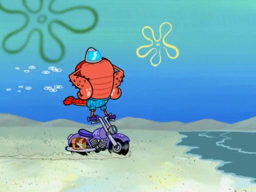The next day, SpongeBob is working at the Krusty Krab, when Patrick (who apparently survived the monster attack) is running towards the restaurant, trying to get away from five mad bikers (Possibly the Wild Ones). He tells SpongeBob that he was right, and that he would never try such stupid stunts again. When SpongeBob goes outside to talk to the bikers, he knocks down their bikes. SpongeBob and Patrick run down the street, and SpongeBob gets a rush of adrenaline. SpongeBob shouts that he's living like Larry, and is now obsessed with daredevil stunts. The bikers hit SpongeBob with their bikes, sending SpongeBob flying into the air.