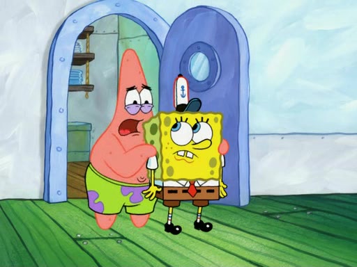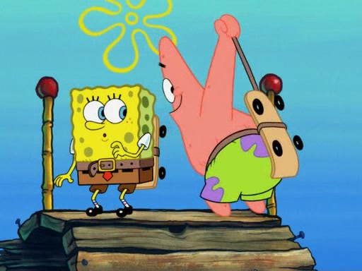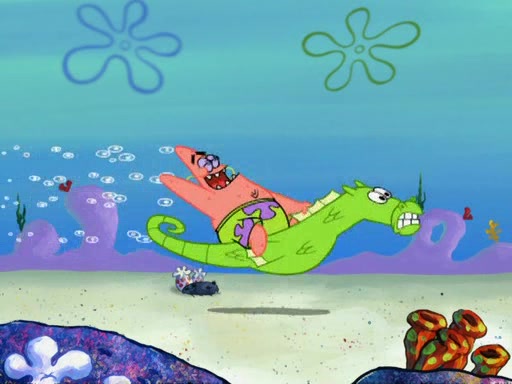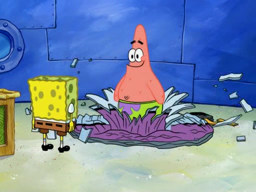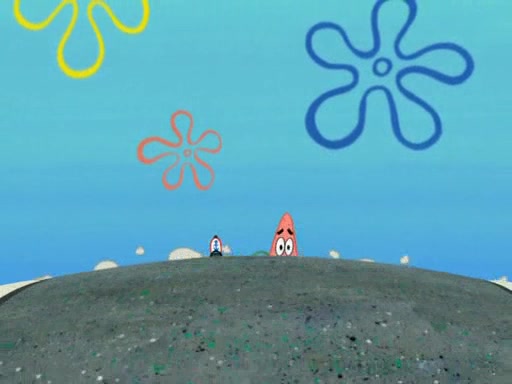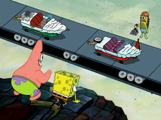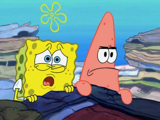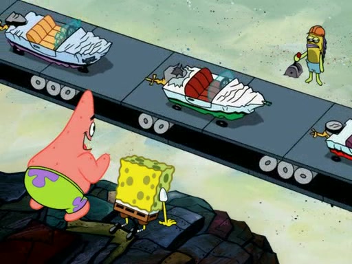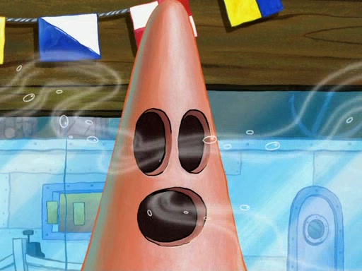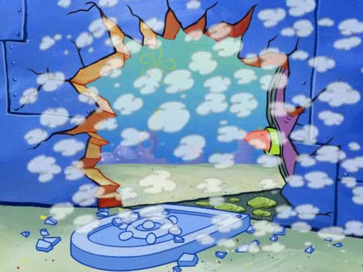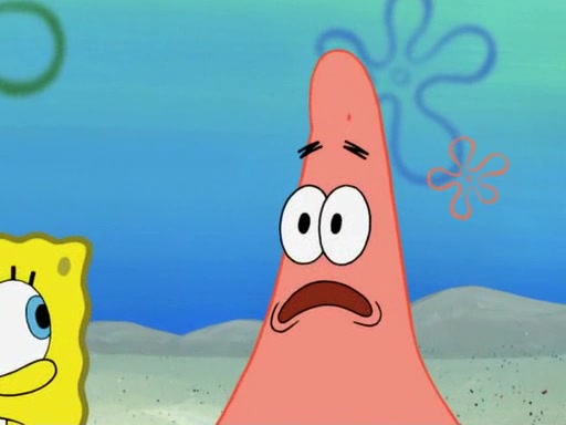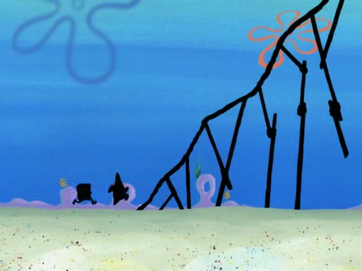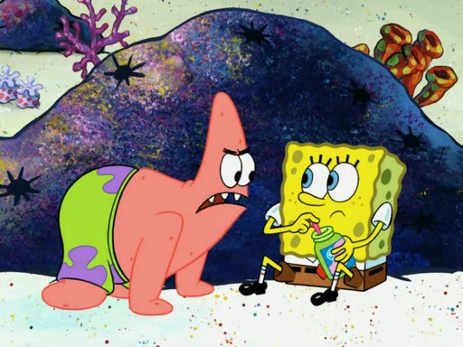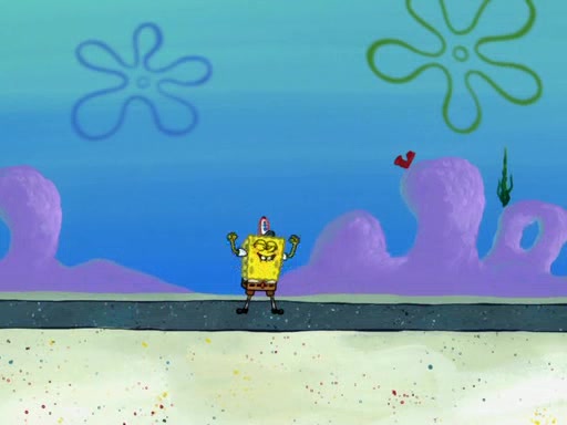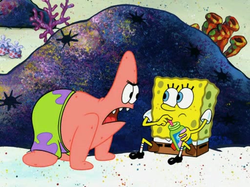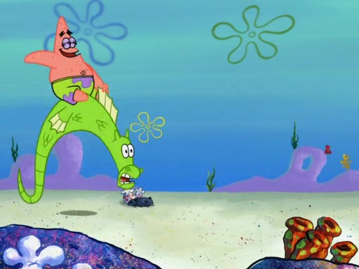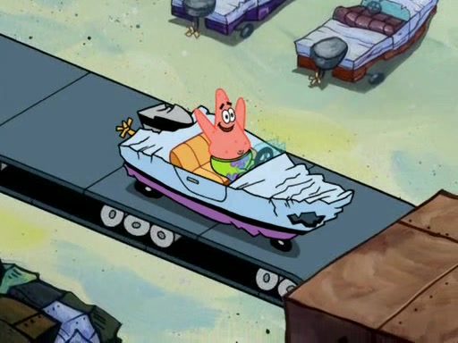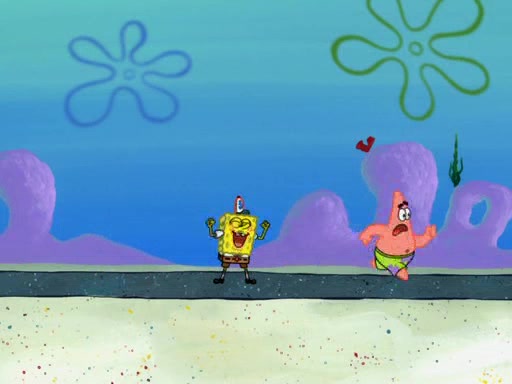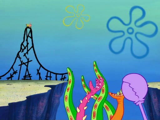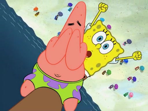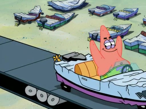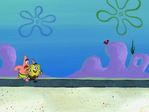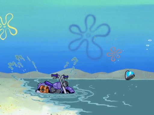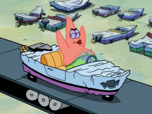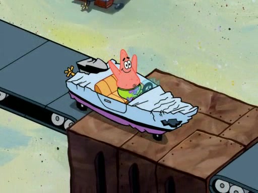 Even later that day, Patrick breaks down the door again (still inside the crushed car) and pulls SpongeBob to the outskirts of Bikini Bottom to a deep canyon next to the canyon is a long board leading to the bottom, which Patrick says he will skate down. He tells SpongeBob to join him, but SpongeBob says that going down the ramp would be stupid, and would certainly kill them. Patrick shrugs and calls SpongeBob a chicken. Patrick then skates down, and flies right into the mouths of several hungry monsters, Patrick's fate is unknown.