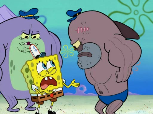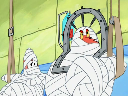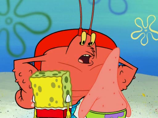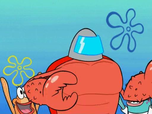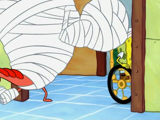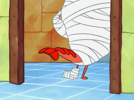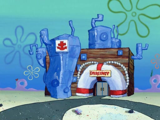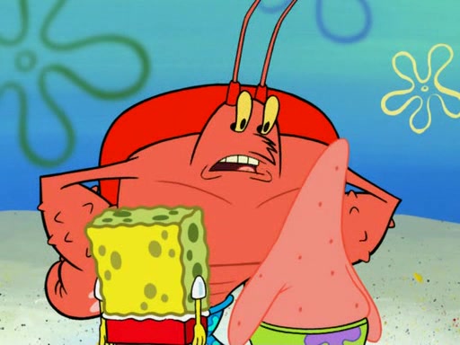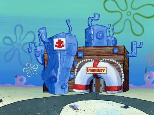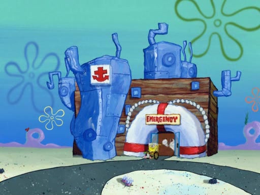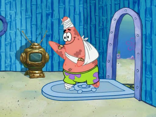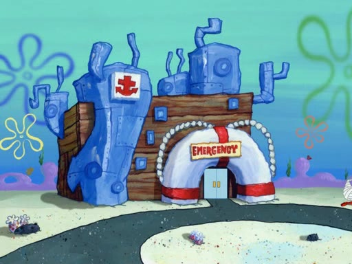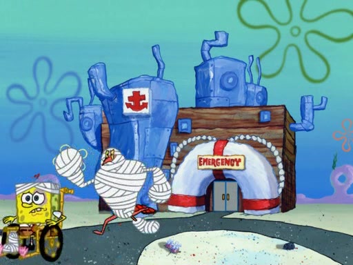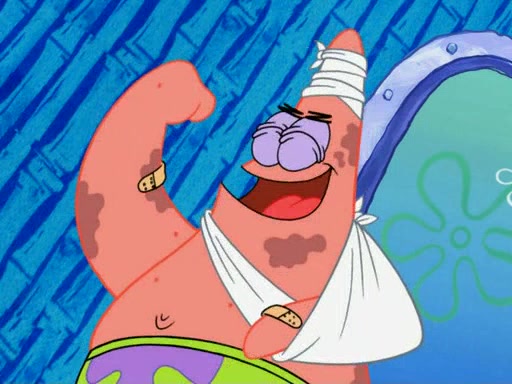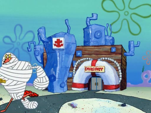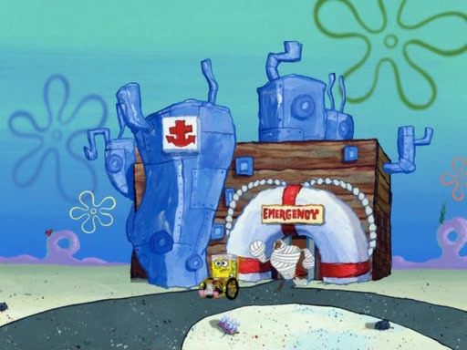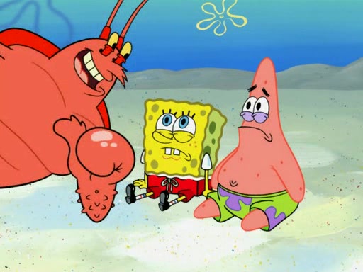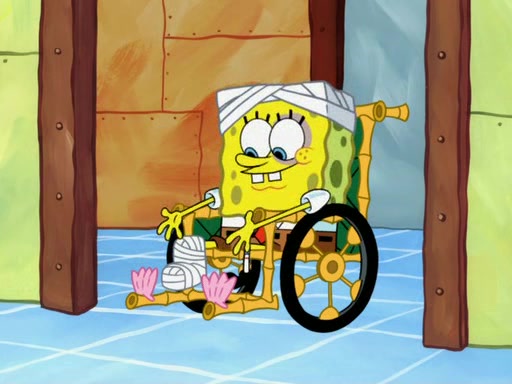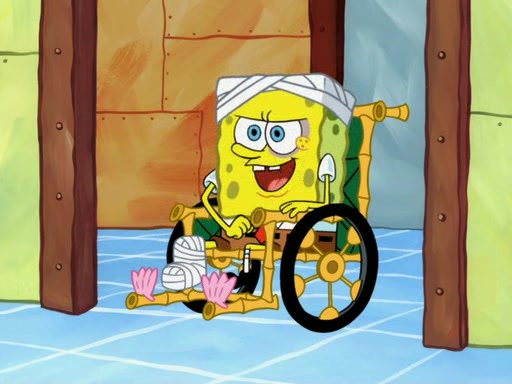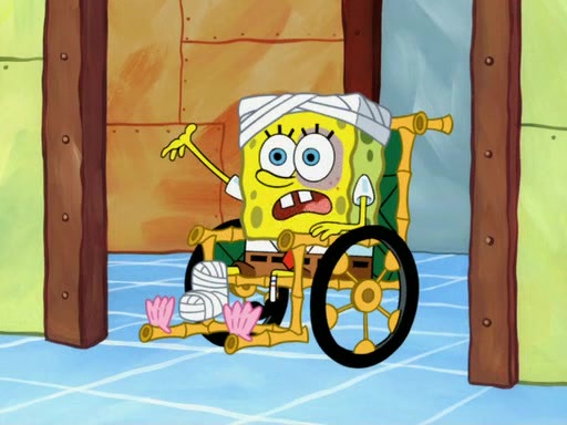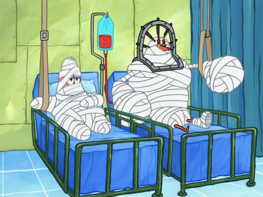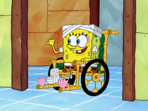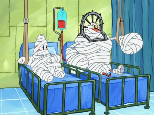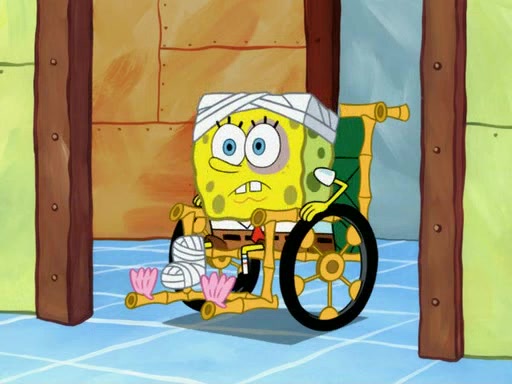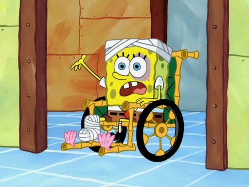 Later at the Bikini Bottom Hospital, Patrick and Larry are put in full body casts, while SpongeBob is put in a wheel chair. SpongeBob says that it's time for his next stunt, and asks "What would Larry do?" Larry gets mad and chases SpongeBob out of the hospital.