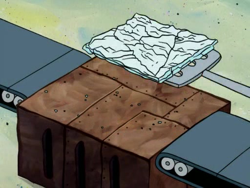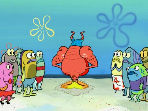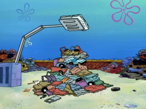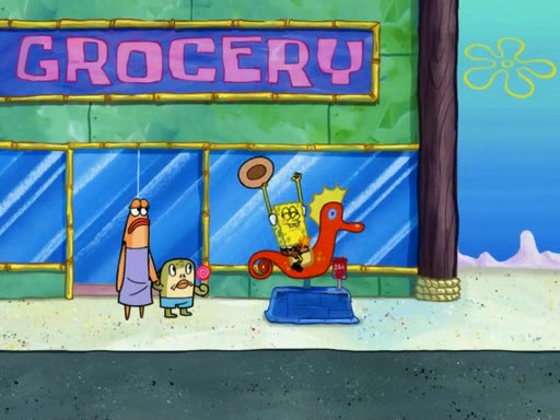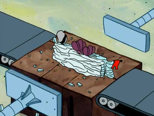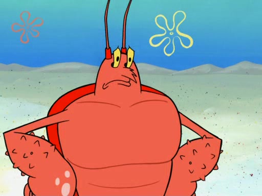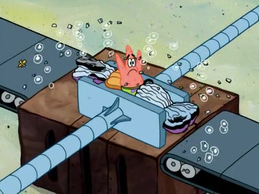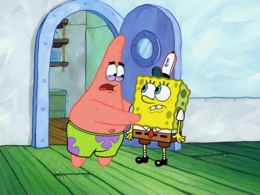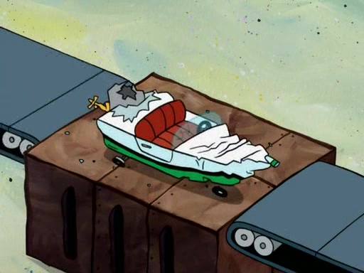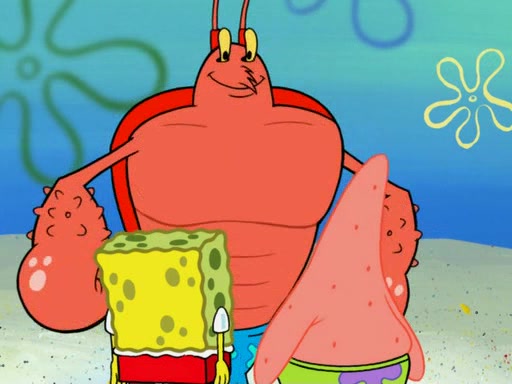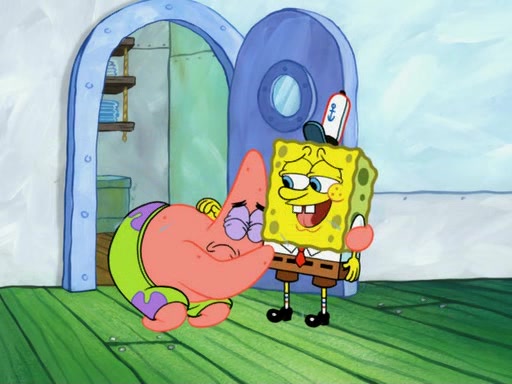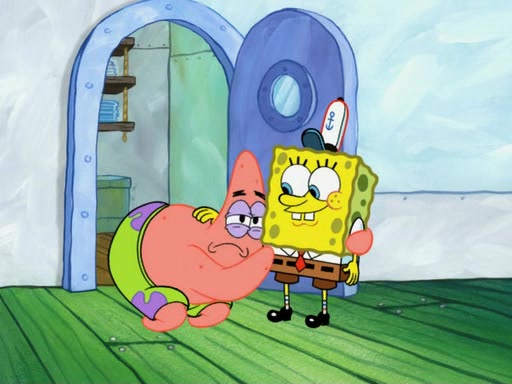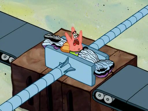 The next day, SpongeBob and Patrick are blowing bubbles, when Patrick says that their lives are boring, and that they need to live like Larry. Patrick then jumps on a seahorse, which bucks him off and severely injures Patrick. Meanwhile, SpongeBob is riding a kiddie ride at the grocery store. Later that day, Patrick kicks down SpongeBob's door, and drags him to the junkyard. Patrick then jumps in a boat going on the conveyor belt. The boat (with Patrick inside) is then crushed by the junkyard crusher, while SpongeBob only watches in horror as Patrick is slowly crushed.