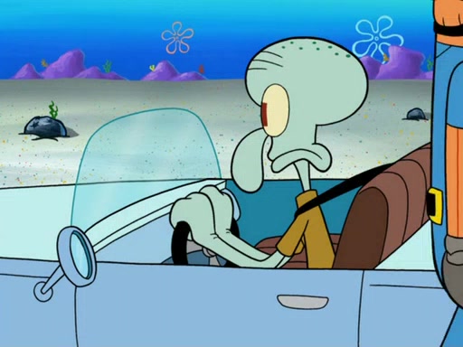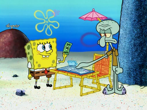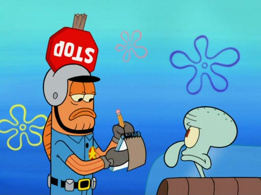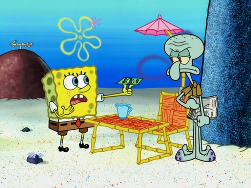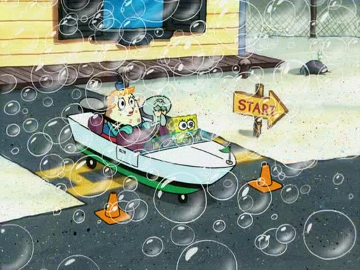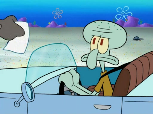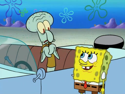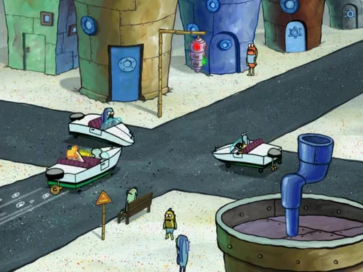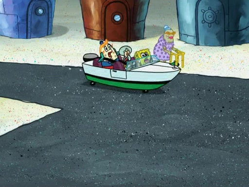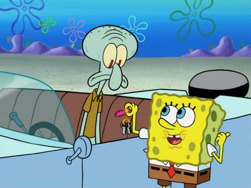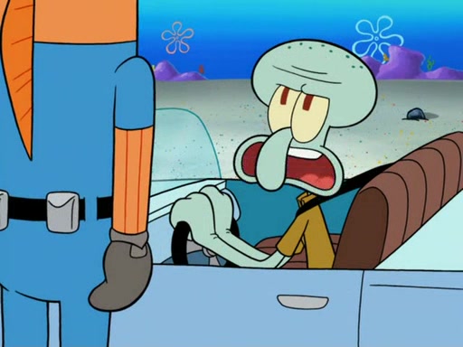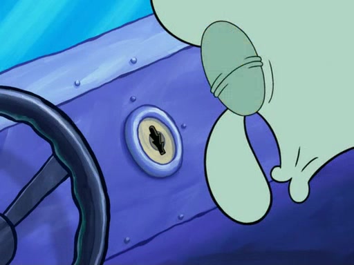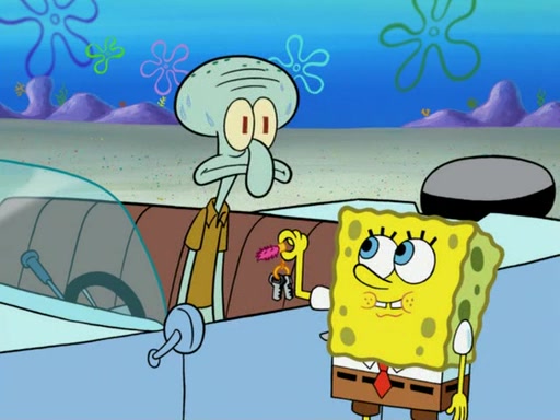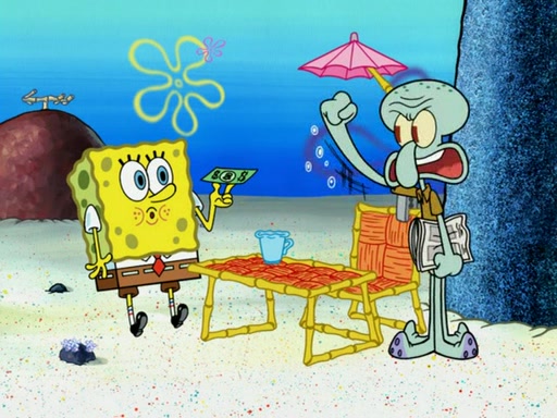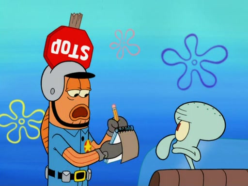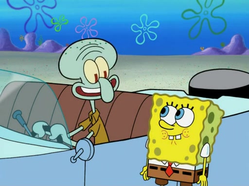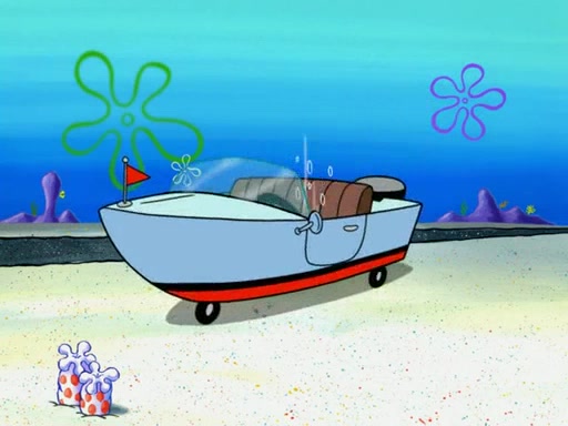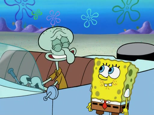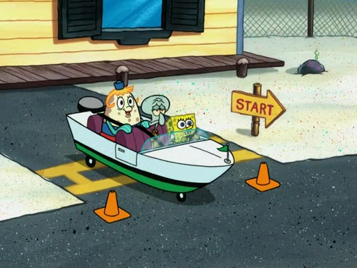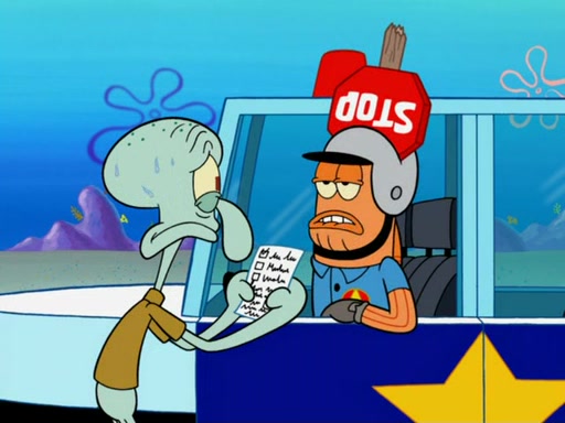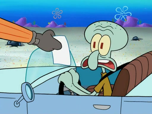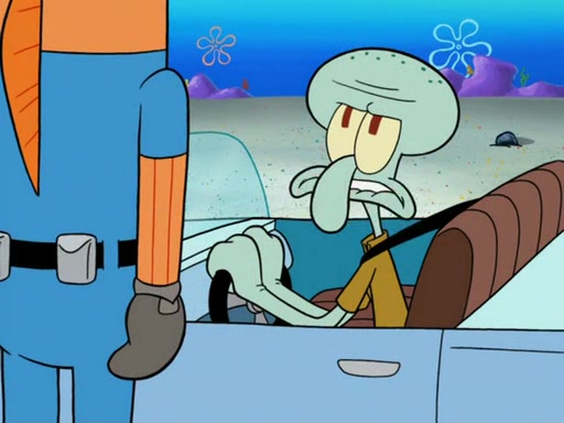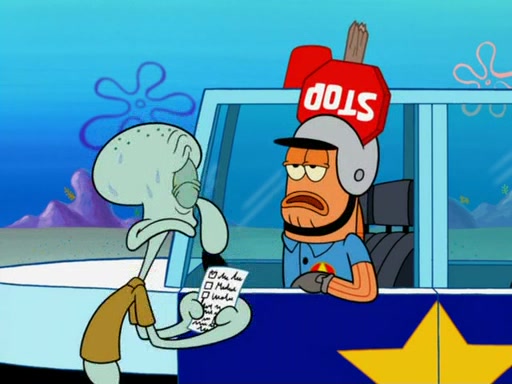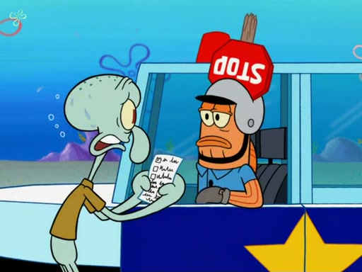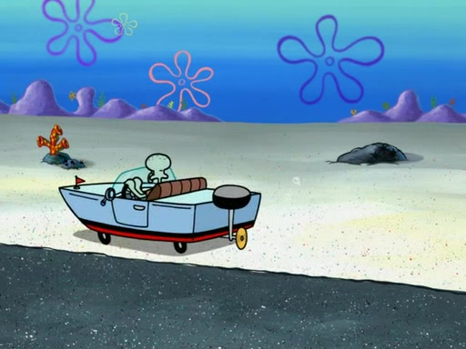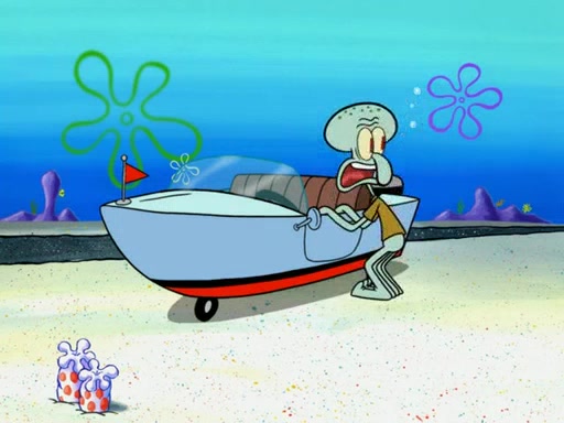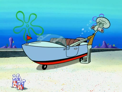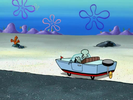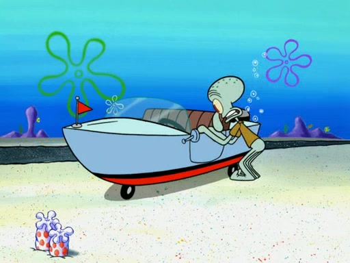 SpongeBob is brushing Gary when he hears a strange noise. He goes outside to investigate, only to find out that it's Squidward breathing. Squidward then tells SpongeBob that he will pay him five dollars if he gives him peace and quiet for the rest of the day. However, Squidward already gave SpongeBob five dollars to leave him alone yesterday. He gets annoyed, so Squidward begins walking away. He then finds out that SpongeBob is following him, so he starts running and he jumps into his boat. However, he can't find the key and SpongeBob arrives at Squidward's boat. Squidward then becomes furious, only to find out that SpongeBob wanted to give him his keys. Squidward then drives away and literally drives through a stop sign. He then gets pulled over by a police man, telling him that he needs to go to boating school.