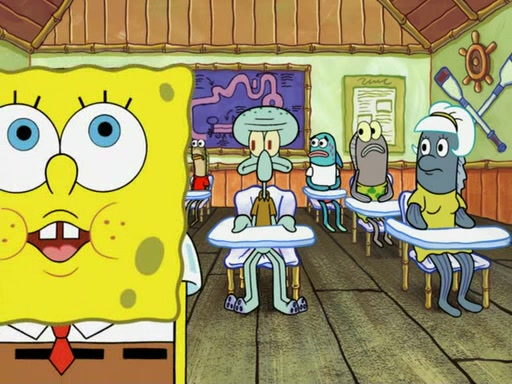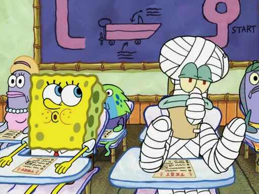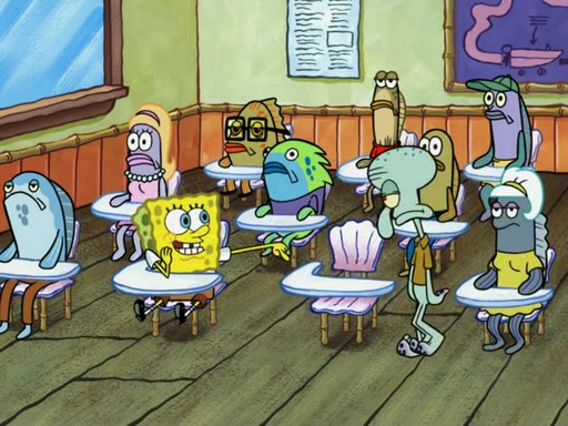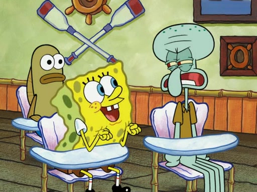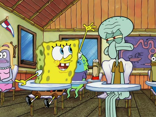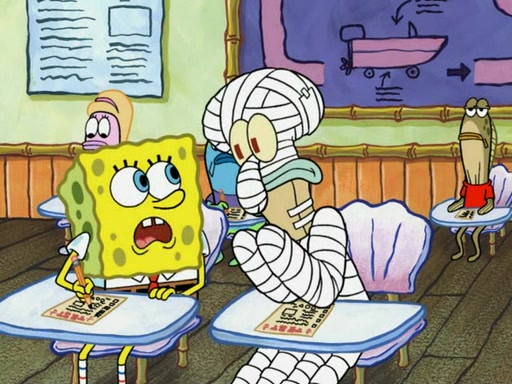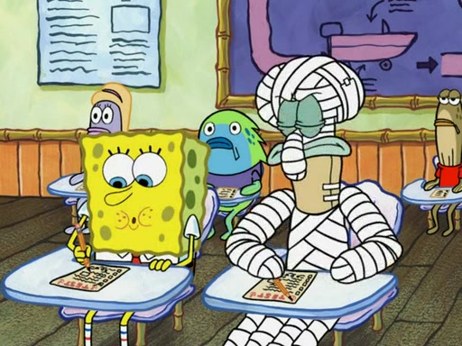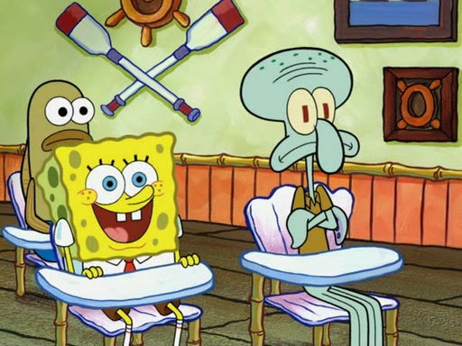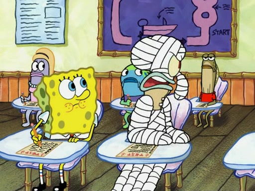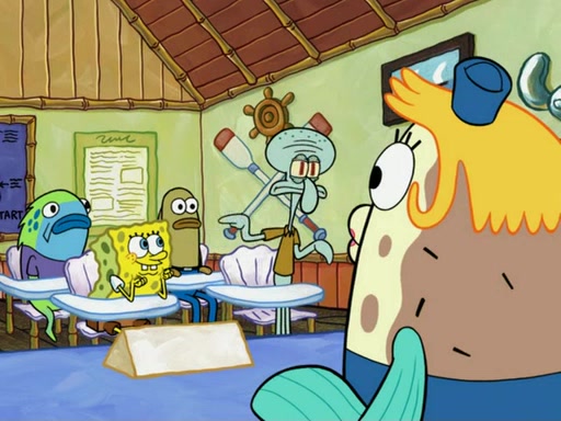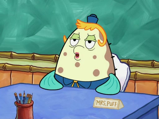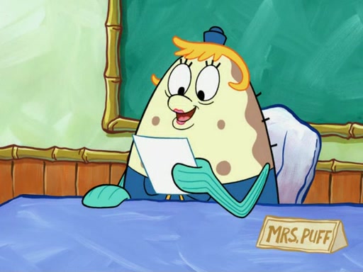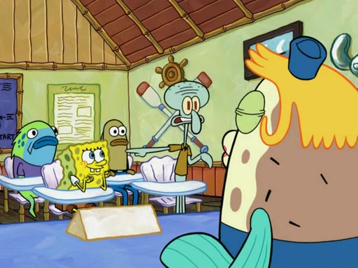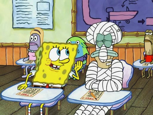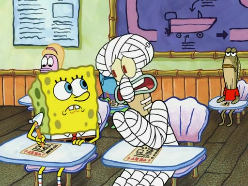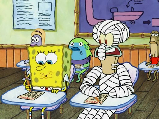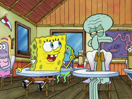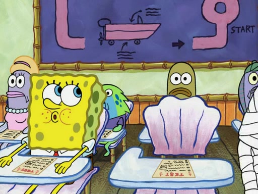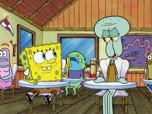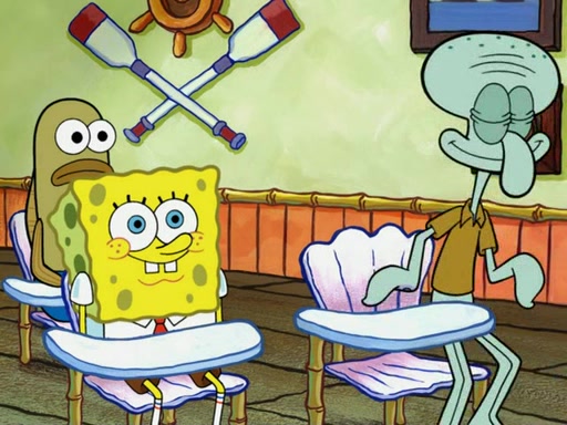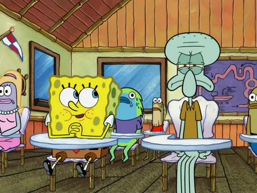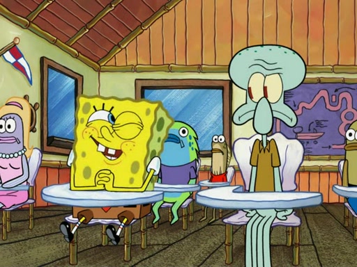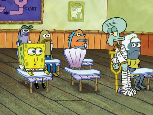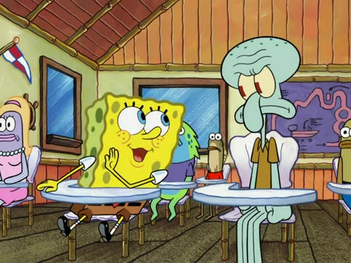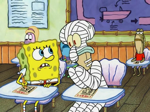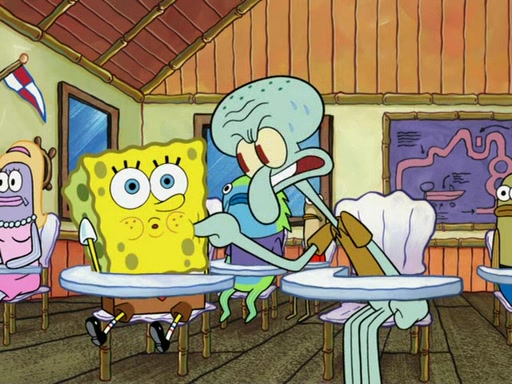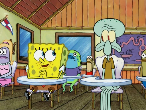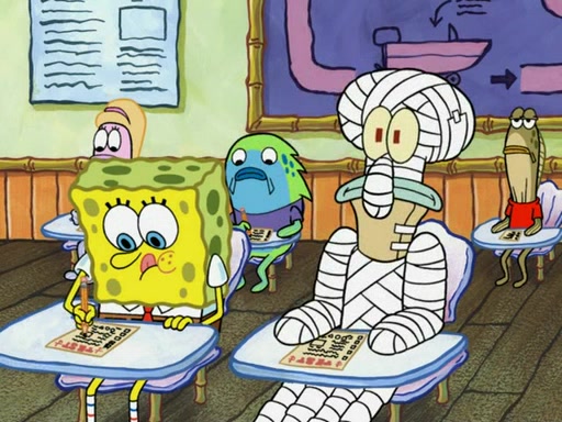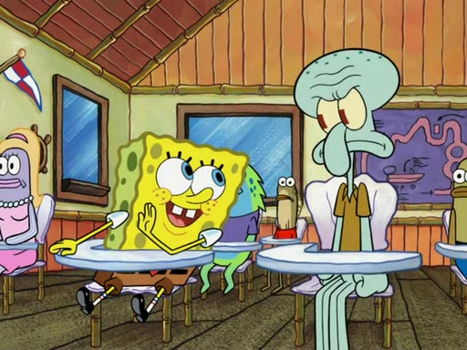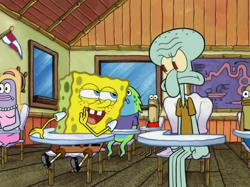 Then the scene changes to everyone back in class. Mrs. Puff explains that everyone is going to do a test. But when SpongeBob tries to help him, Squidward snaps at him that they aren't "Boating Buddies" and he never wants help from him ever again. SpongeBob's feelings are hurt. However, Squidward can't do the test because he can't pick up the pencil, so he asks for SpongeBob's help; when the young sponge reminds him of what he said, Squidward denies it, only for his voice to be recorded by another student. Finally, when Squidward admits that he and SpongeBob are "Boating Buddies," SpongeBob cheers. But time runs out and Squidward asks Mrs. Puff what to do. She then says that he needs to come back the next week. Then Squidward finds out that SpongeBob also failed the test and he has to come back the next week too, and Squidward screams and the episode ends.