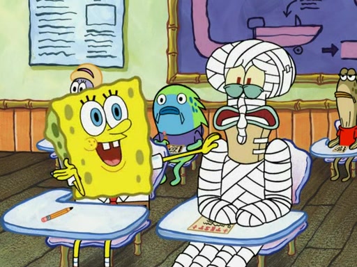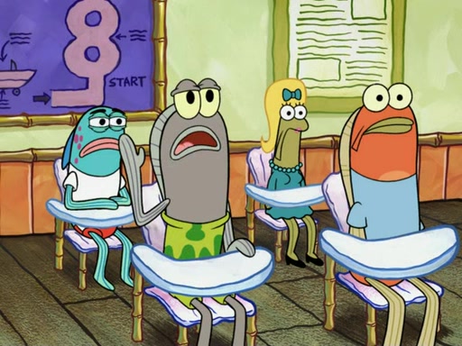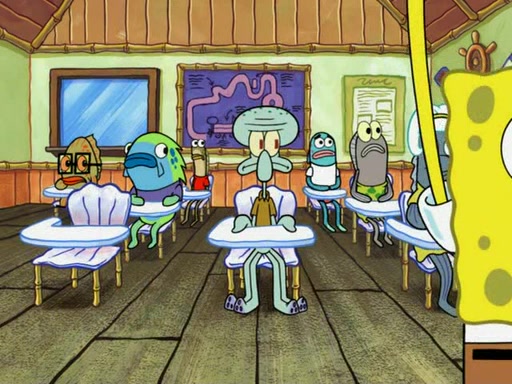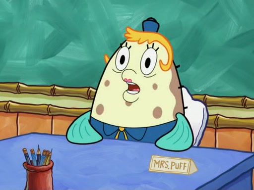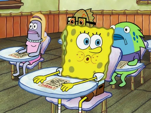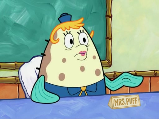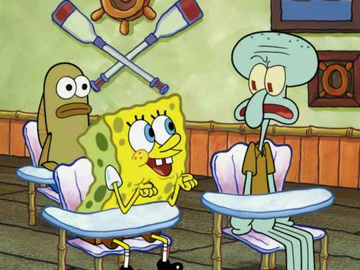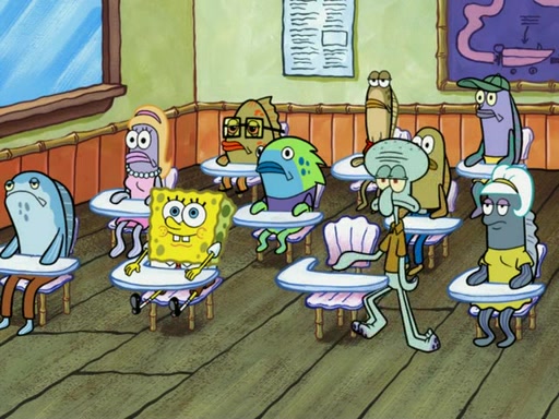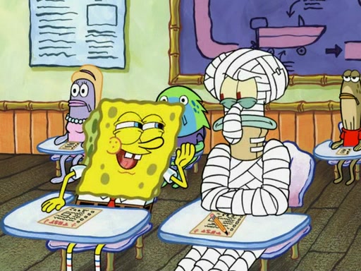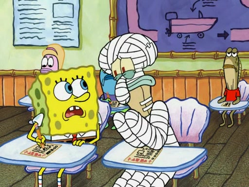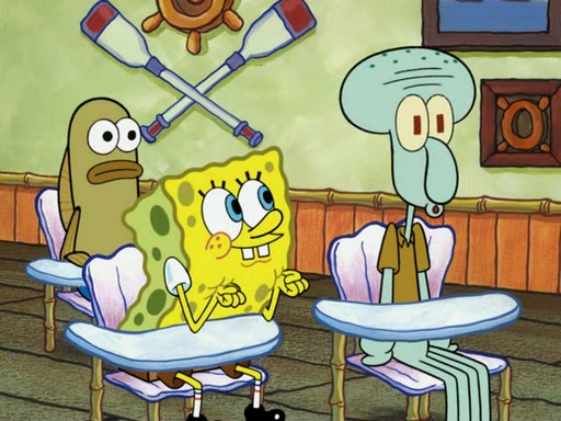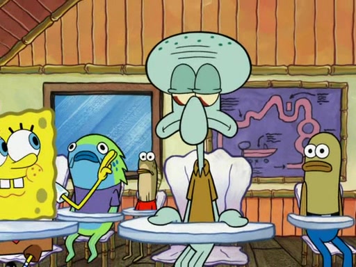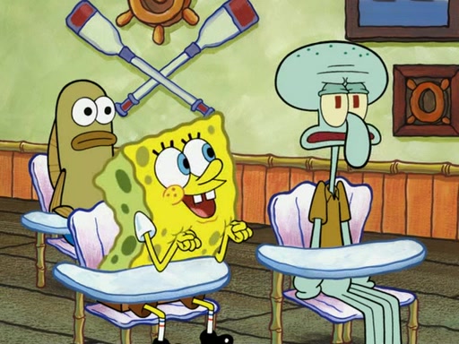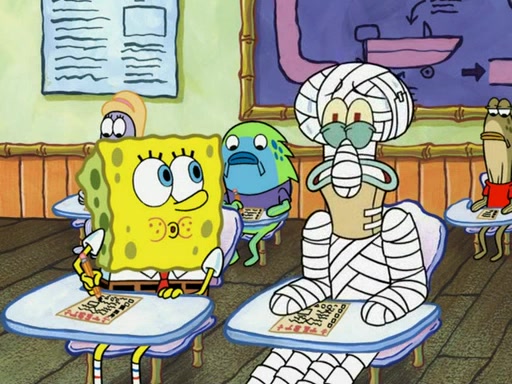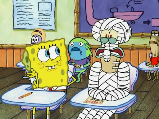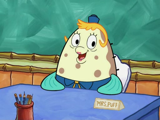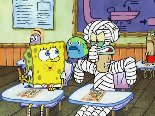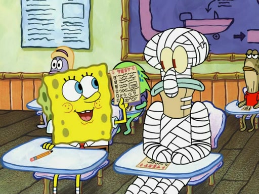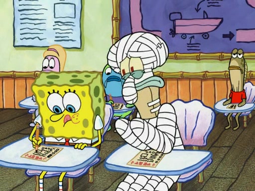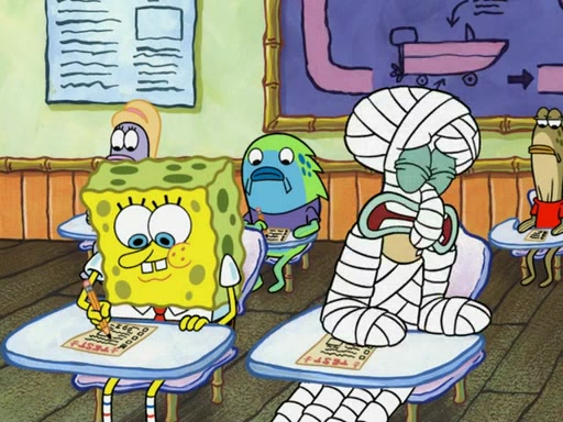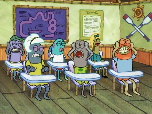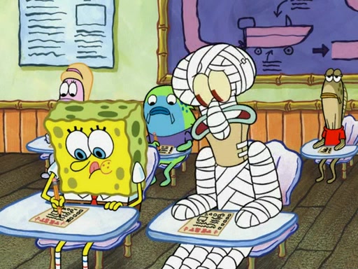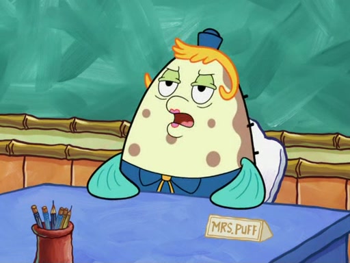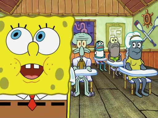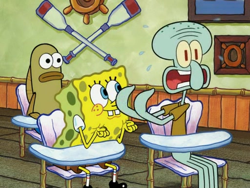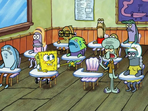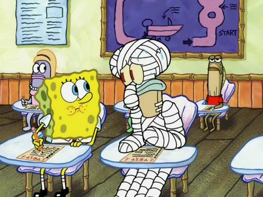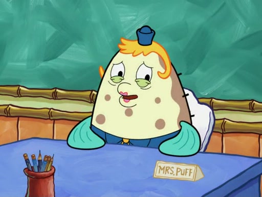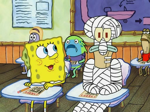 Then the scene changes to everyone back in class. Mrs. Puff explains that everyone is going to do a test. But when SpongeBob tries to help him, Squidward snaps at him that they aren't "Boating Buddies" and he never wants help from him ever again. SpongeBob's feelings are hurt. However, Squidward can't do the test because he can't pick up the pencil, so he asks for SpongeBob's help; when the young sponge reminds him of what he said, Squidward denies it, only for his voice to be recorded by another student. Finally, when Squidward admits that he and SpongeBob are "Boating Buddies," SpongeBob cheers. But time runs out and Squidward asks Mrs. Puff what to do. She then says that he needs to come back the next week. Then Squidward finds out that SpongeBob also failed the test and he has to come back the next week too, and Squidward screams and the episode ends.