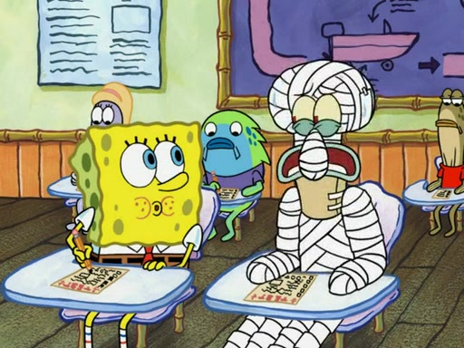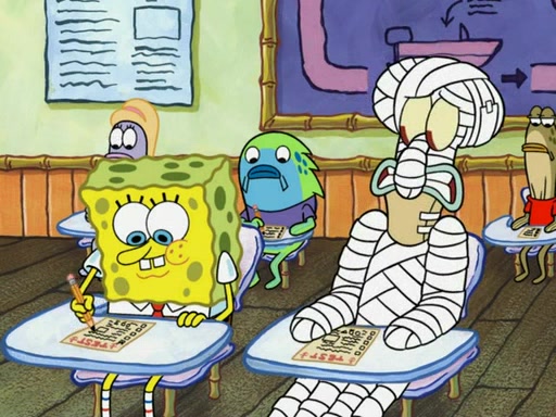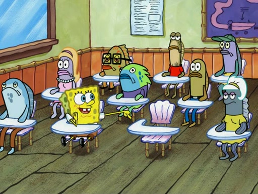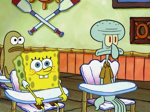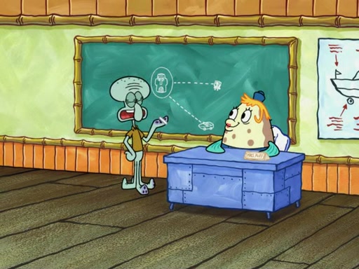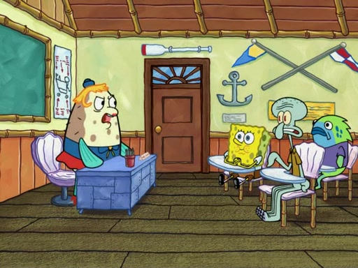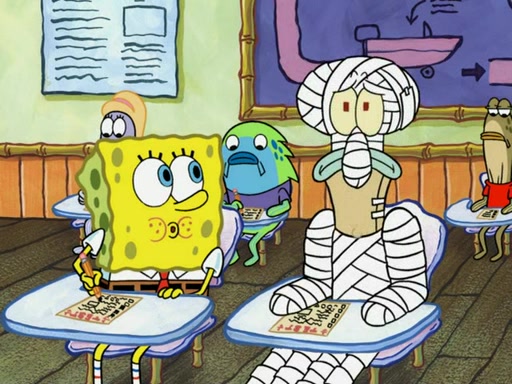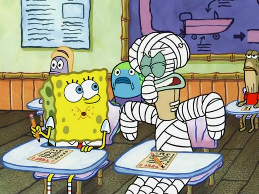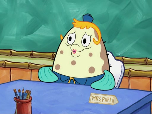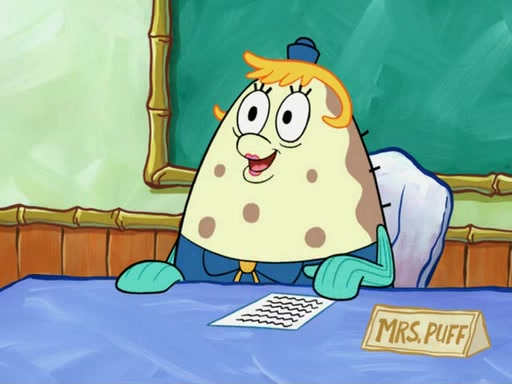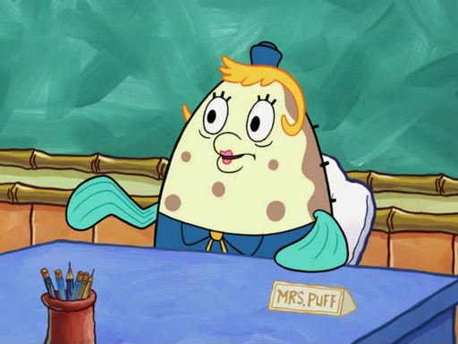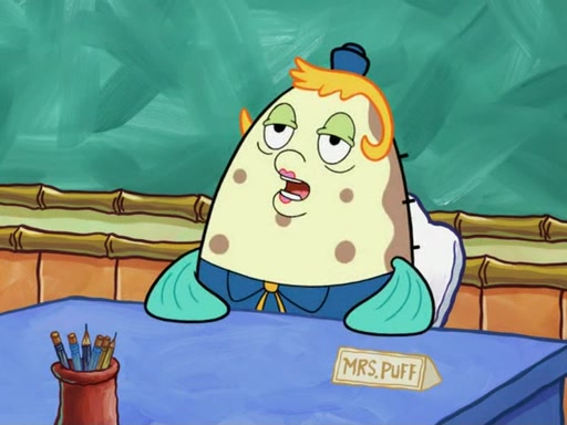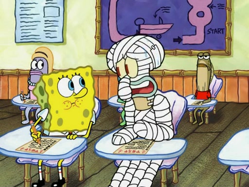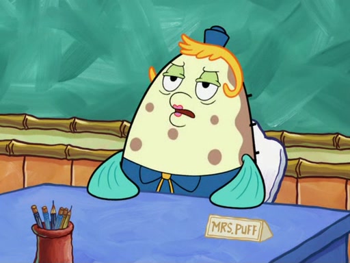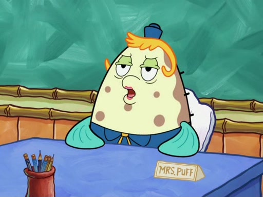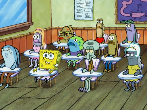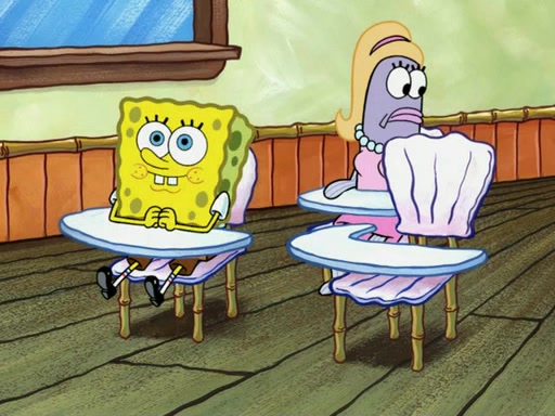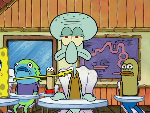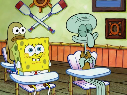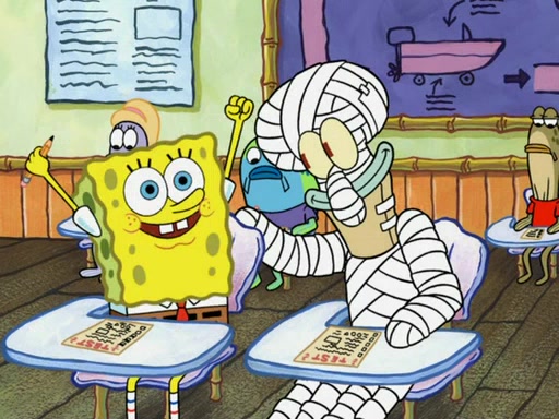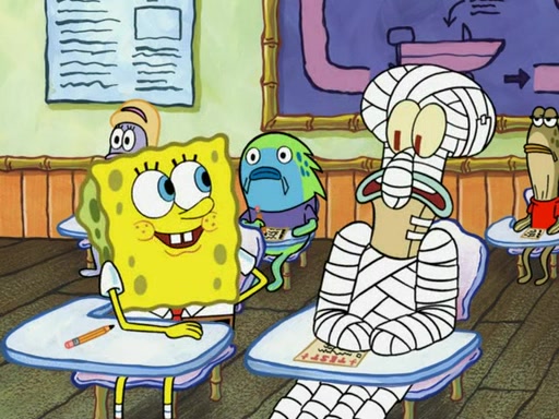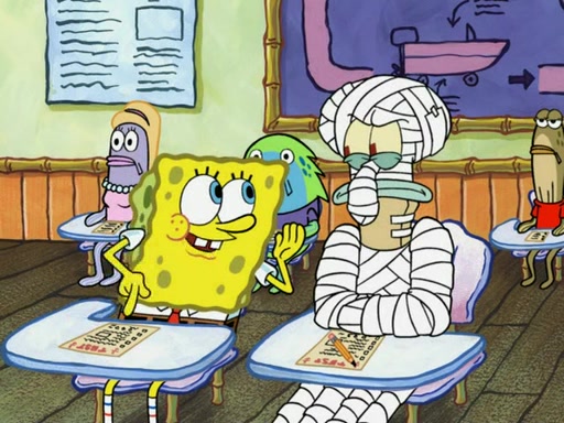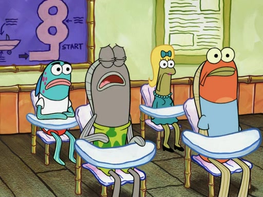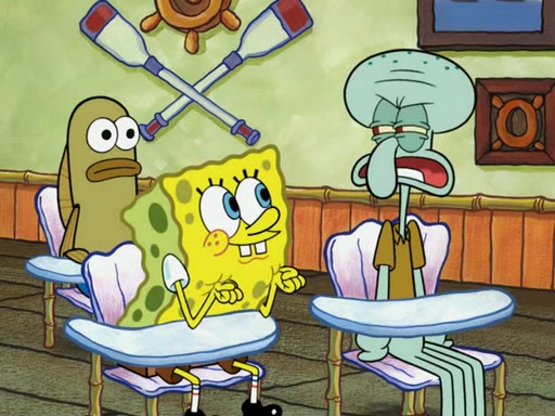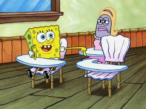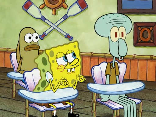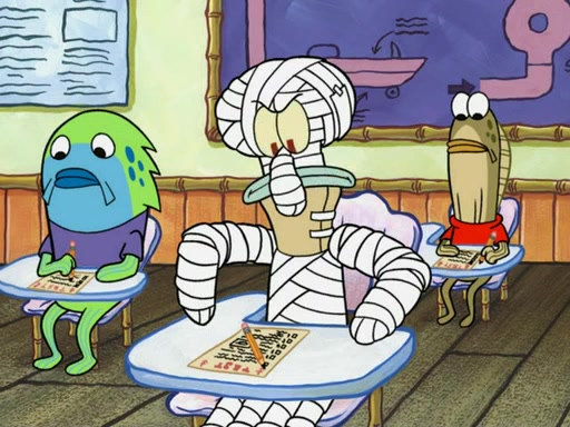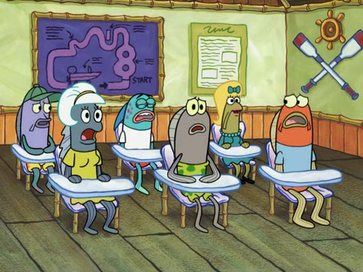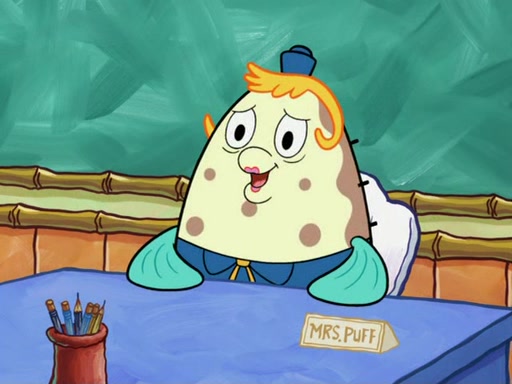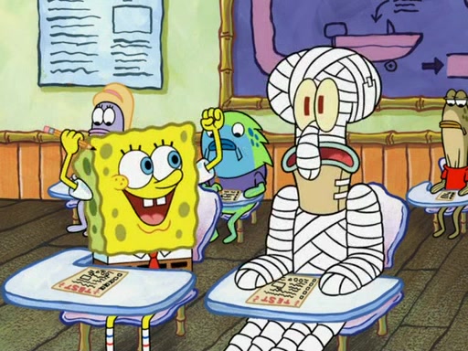 Then the scene changes to everyone back in class. Mrs. Puff explains that everyone is going to do a test. But when SpongeBob tries to help him, Squidward snaps at him that they aren't "Boating Buddies" and he never wants help from him ever again. SpongeBob's feelings are hurt. However, Squidward can't do the test because he can't pick up the pencil, so he asks for SpongeBob's help; when the young sponge reminds him of what he said, Squidward denies it, only for his voice to be recorded by another student. Finally, when Squidward admits that he and SpongeBob are "Boating Buddies," SpongeBob cheers. But time runs out and Squidward asks Mrs. Puff what to do. She then says that he needs to come back the next week. Then Squidward finds out that SpongeBob also failed the test and he has to come back the next week too, and Squidward screams and the episode ends.
