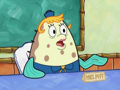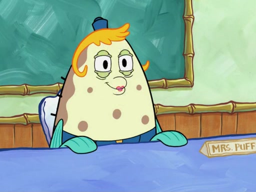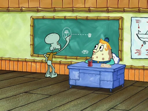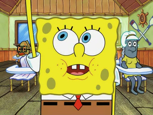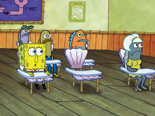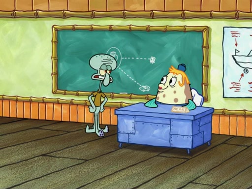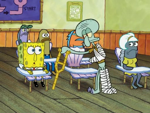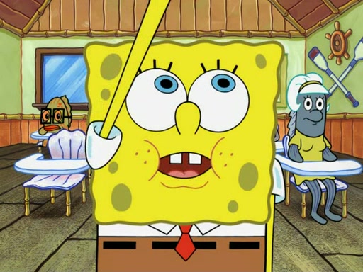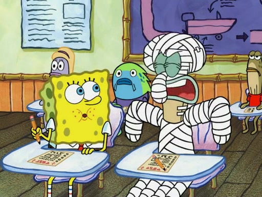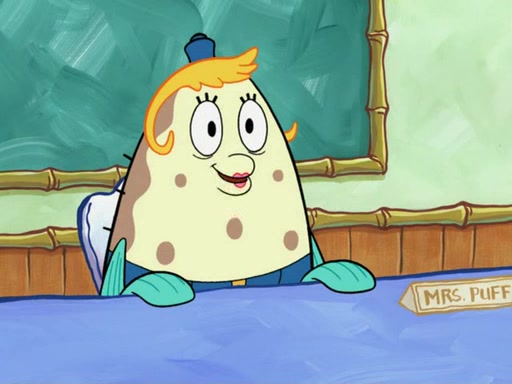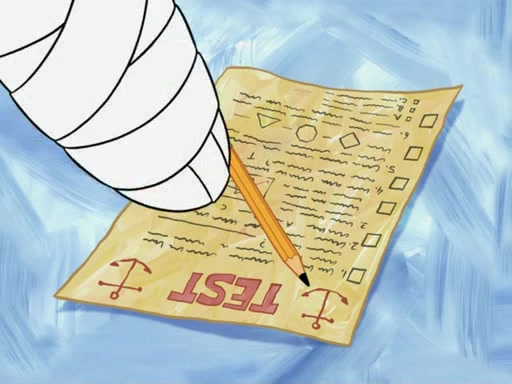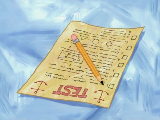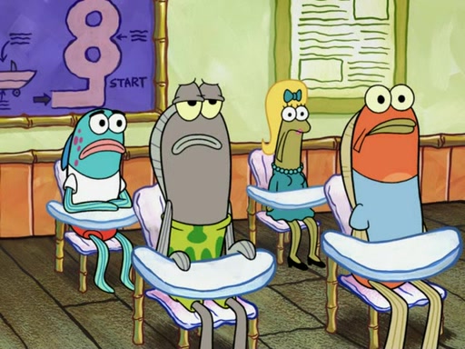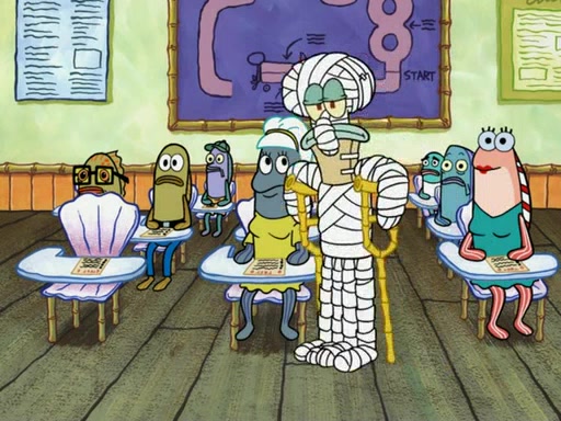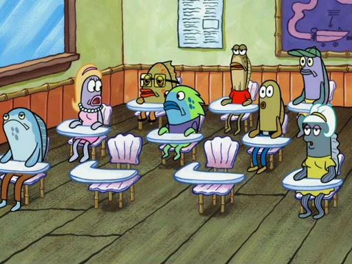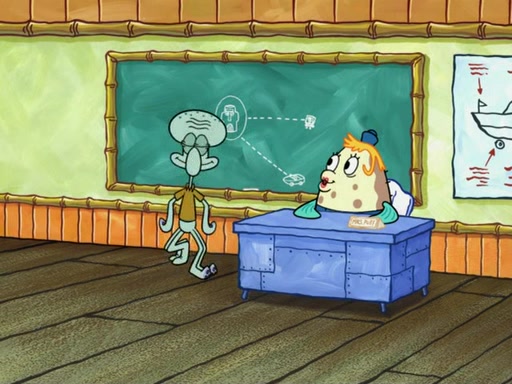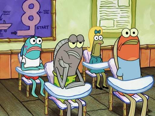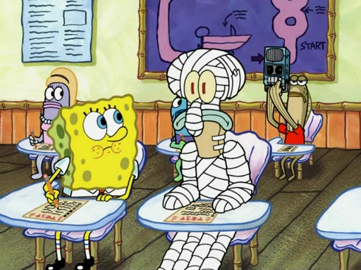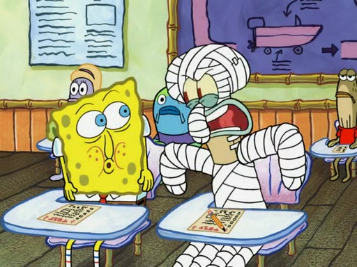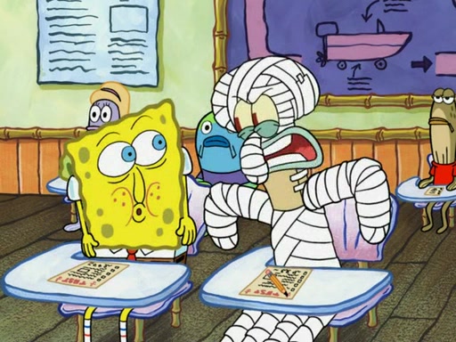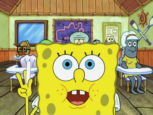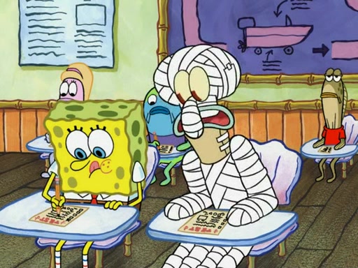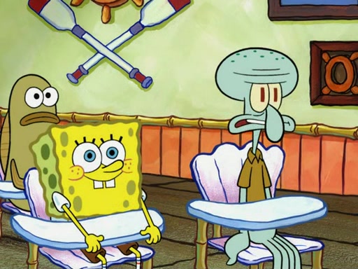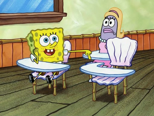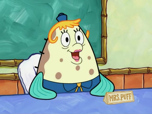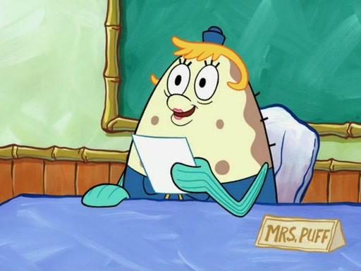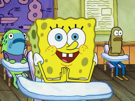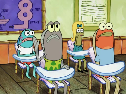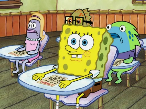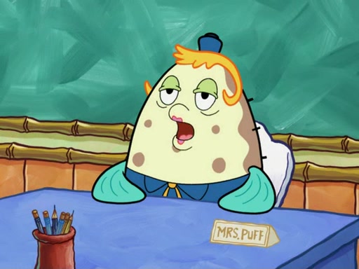 Then the scene changes to everyone back in class. Mrs. Puff explains that everyone is going to do a test. But when SpongeBob tries to help him, Squidward snaps at him that they aren't "Boating Buddies" and he never wants help from him ever again. SpongeBob's feelings are hurt. However, Squidward can't do the test because he can't pick up the pencil, so he asks for SpongeBob's help; when the young sponge reminds him of what he said, Squidward denies it, only for his voice to be recorded by another student. Finally, when Squidward admits that he and SpongeBob are "Boating Buddies," SpongeBob cheers. But time runs out and Squidward asks Mrs. Puff what to do. She then says that he needs to come back the next week. Then Squidward finds out that SpongeBob also failed the test and he has to come back the next week too, and Squidward screams and the episode ends.