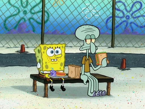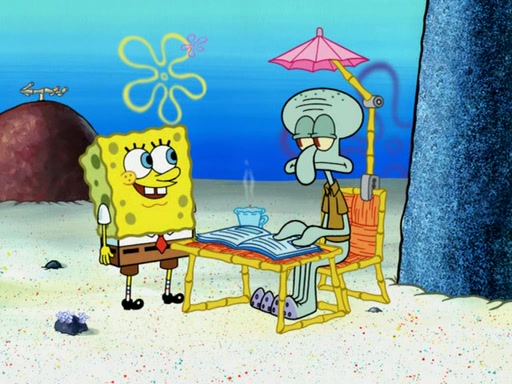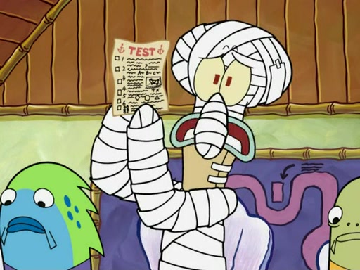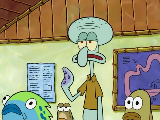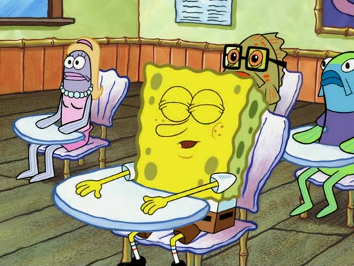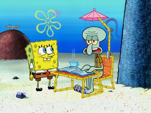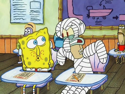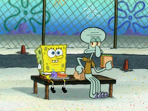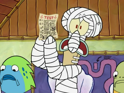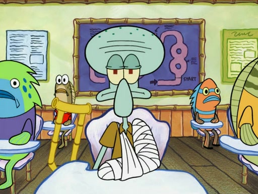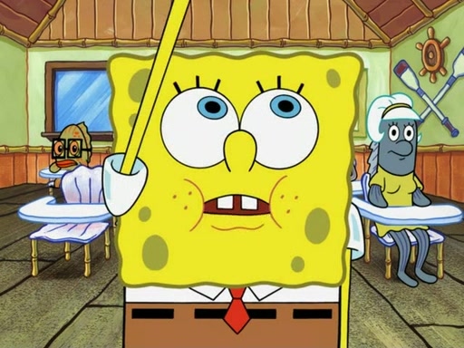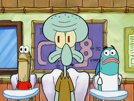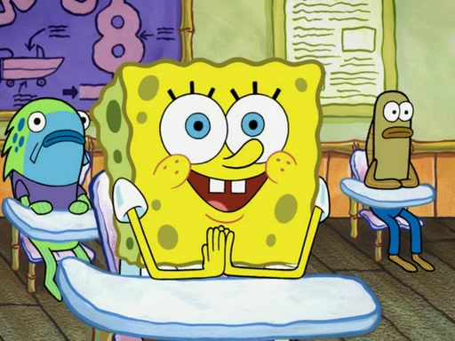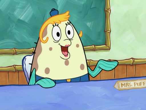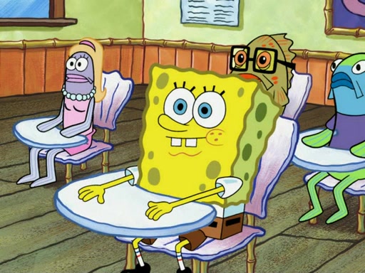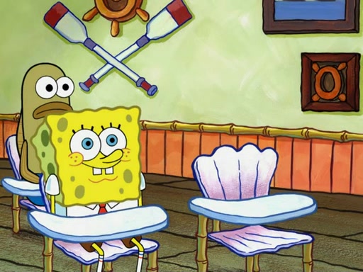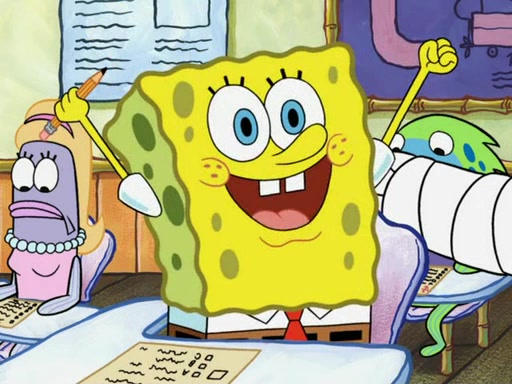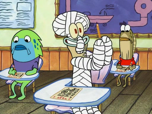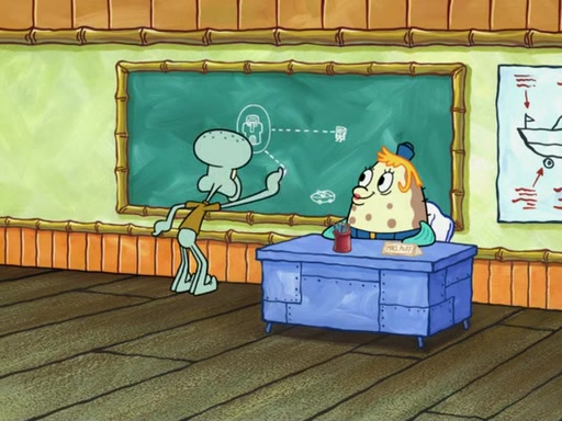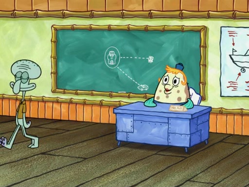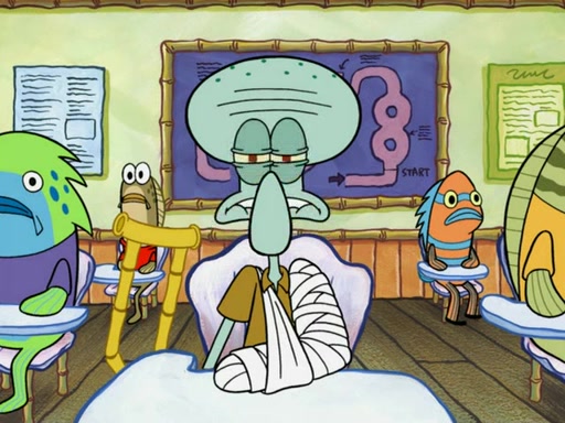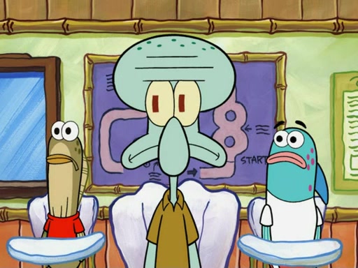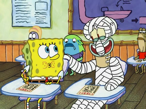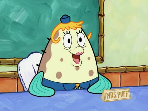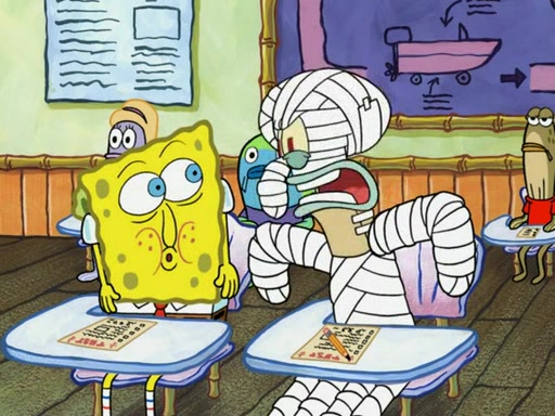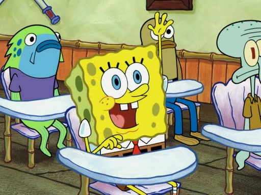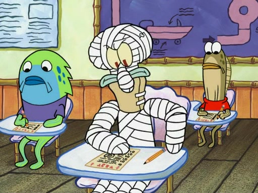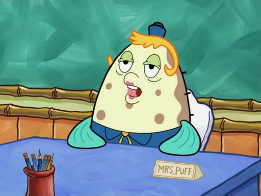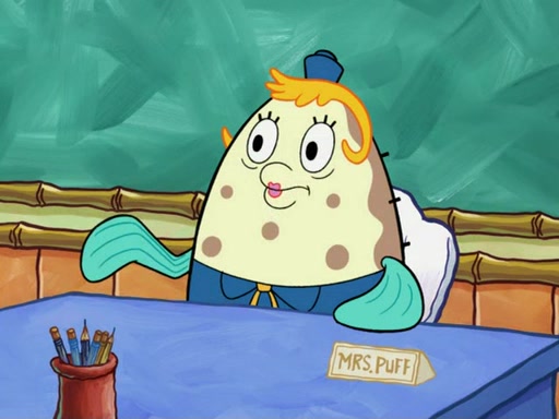 Then the scene changes to everyone back in class. Mrs. Puff explains that everyone is going to do a test. But when SpongeBob tries to help him, Squidward snaps at him that they aren't "Boating Buddies" and he never wants help from him ever again. SpongeBob's feelings are hurt. However, Squidward can't do the test because he can't pick up the pencil, so he asks for SpongeBob's help; when the young sponge reminds him of what he said, Squidward denies it, only for his voice to be recorded by another student. Finally, when Squidward admits that he and SpongeBob are "Boating Buddies," SpongeBob cheers. But time runs out and Squidward asks Mrs. Puff what to do. She then says that he needs to come back the next week. Then Squidward finds out that SpongeBob also failed the test and he has to come back the next week too, and Squidward screams and the episode ends.