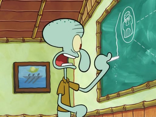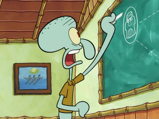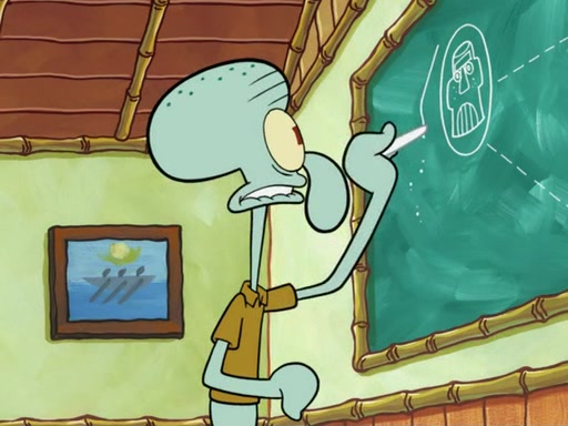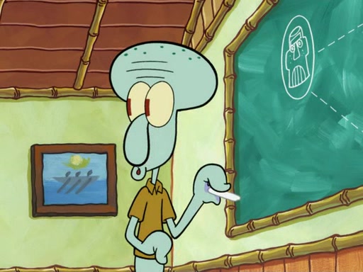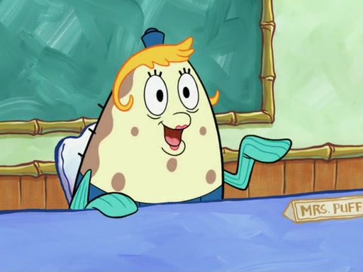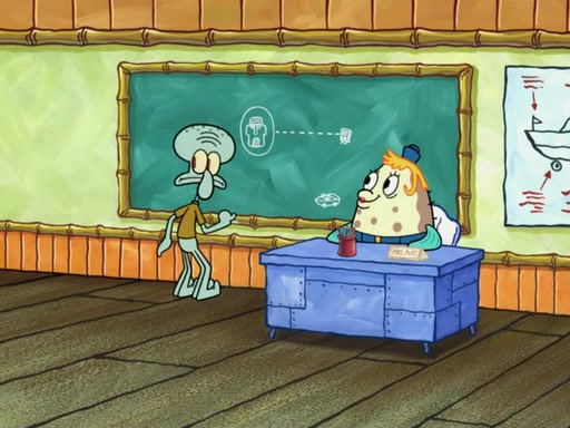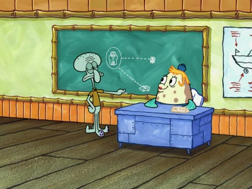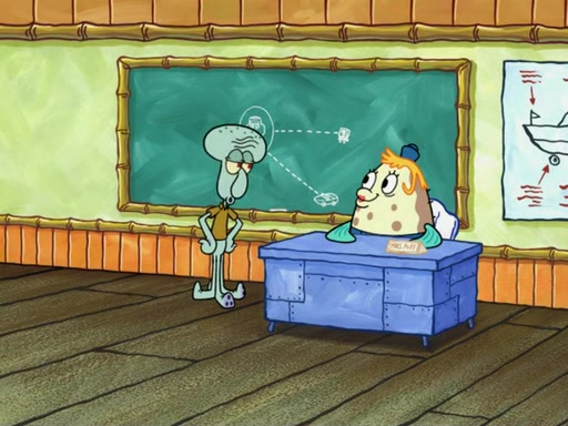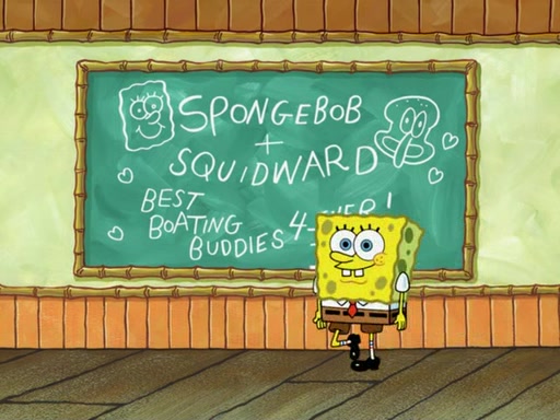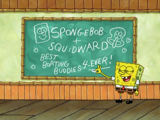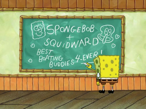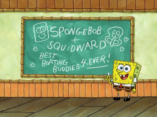 Then the scene changes to Squidward walking up to Mrs. Puff's Boating School and when he opens the door, he sees SpongeBob and then starts to cry. During class, Squidward is forced to sit next to SpongeBob. Then Mrs. Puff asks Squidward why he is enrolled in Boating School, so he tells everyone. Then Mrs. Puff tells SpongeBob to illustrate his side of the story, but SpongeBob just draws a picture with him and Squidward saying "SpongeBob And Squidward, Best Boating Buddies Forever" on the chalkboard.