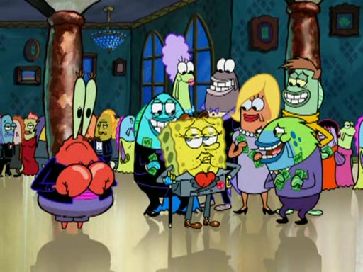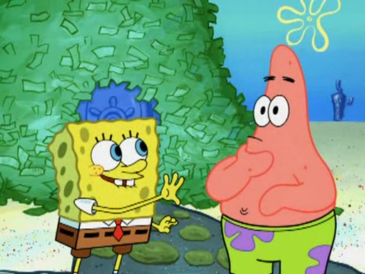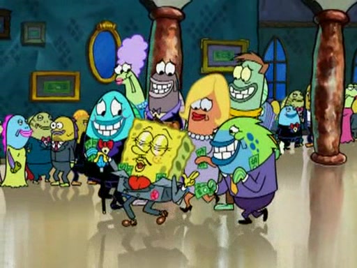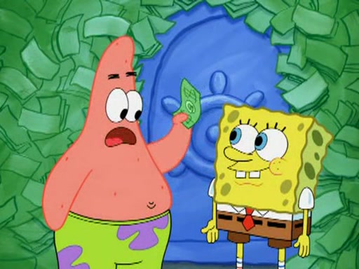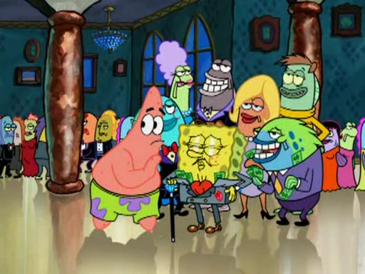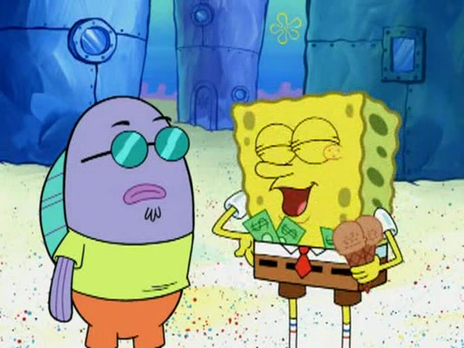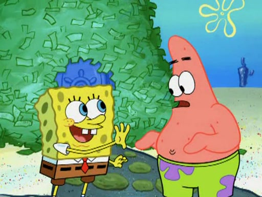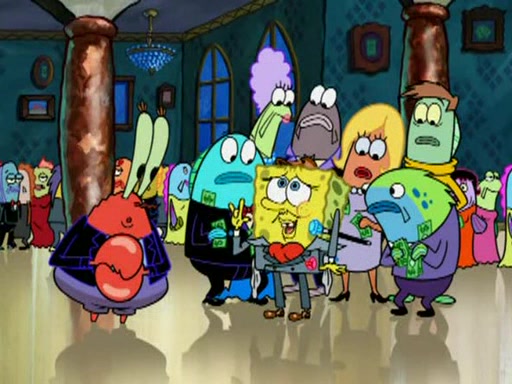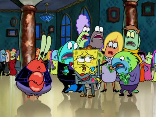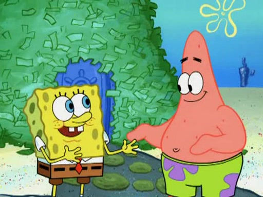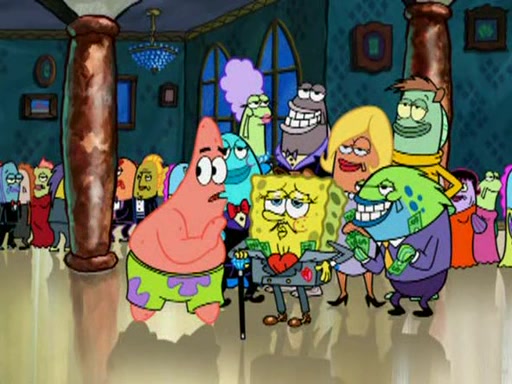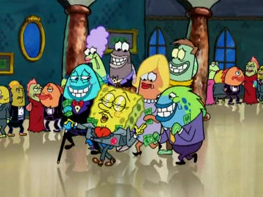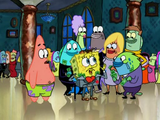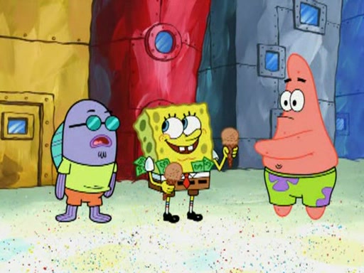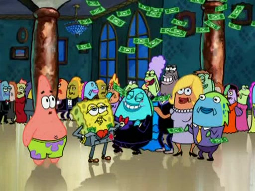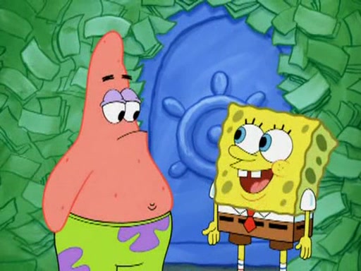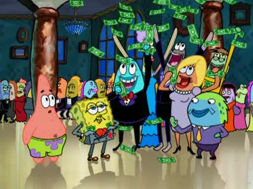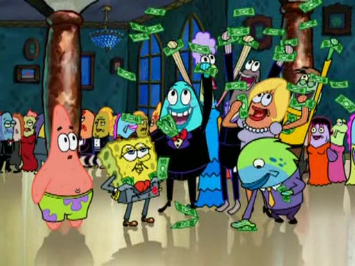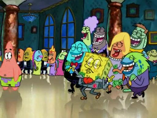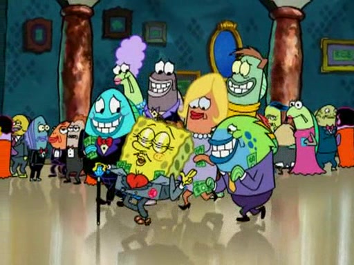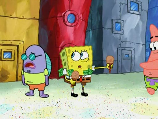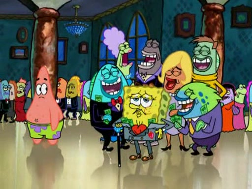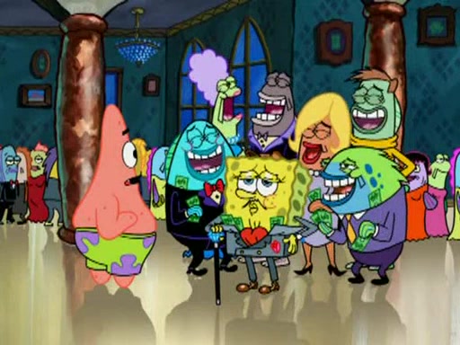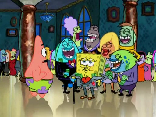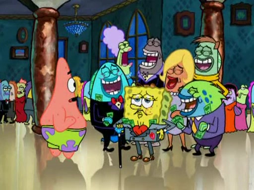 Later, SpongeBob gives out money to others at the local ice-cream stand, causing him to get a lot of friends. SpongeBob is overtaken by fame that he forget Patrick was his best friend. He keeps giving money to his rich "friends", and so many people have used him for it that he runs out completely. Spongebob returns to his normal life and he and Patrick reconcile. Patrick finds another "volleyball", which is really a huge diamond from the Bikini Bottom Diamond Mine.