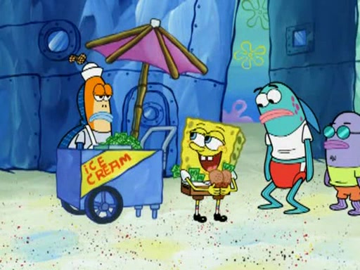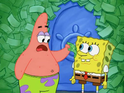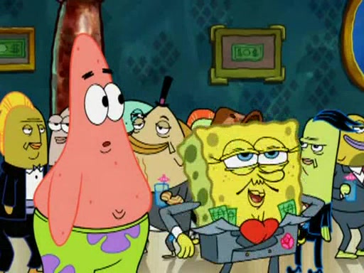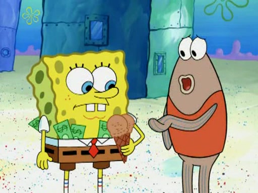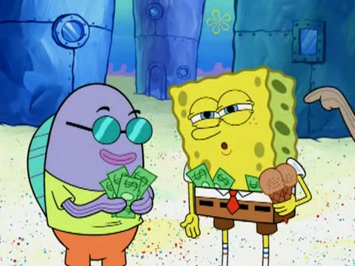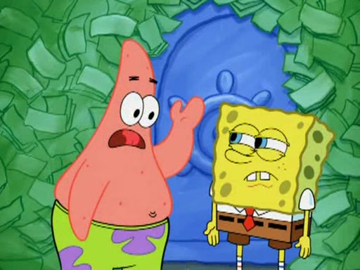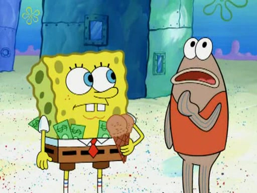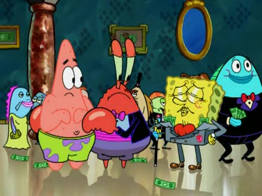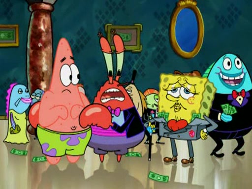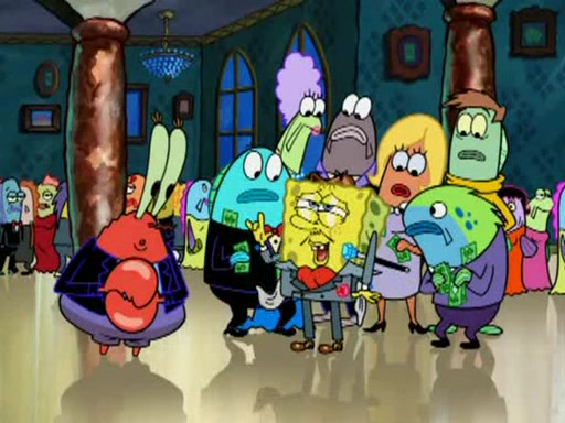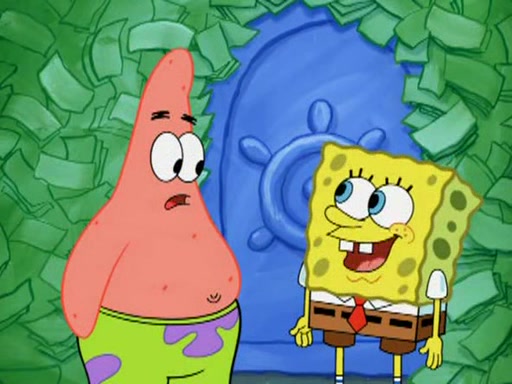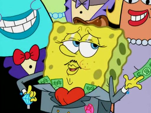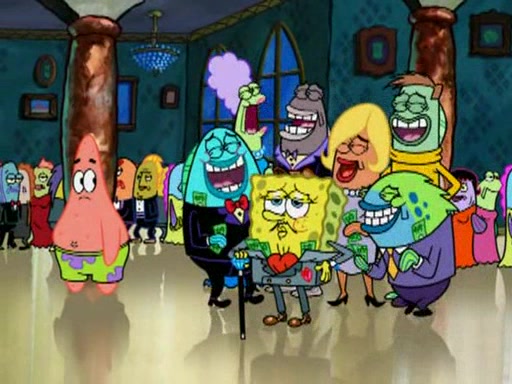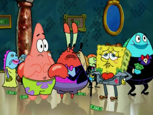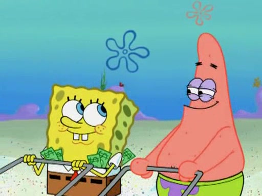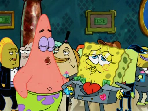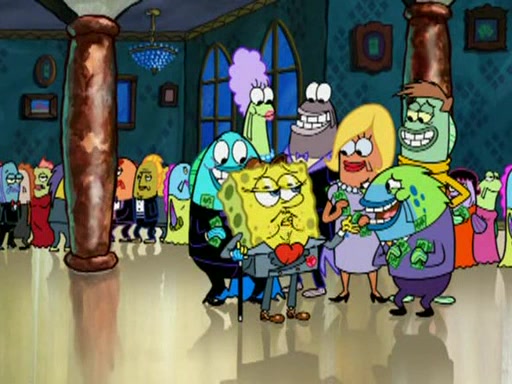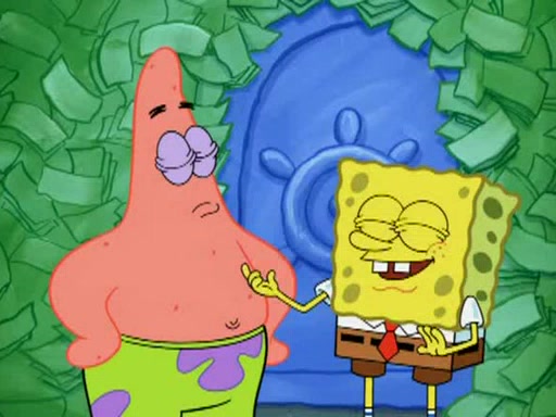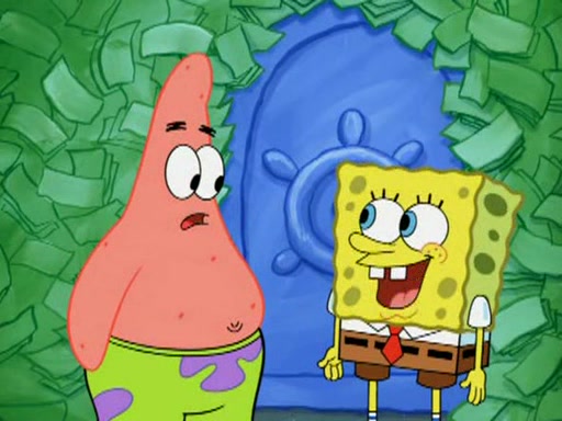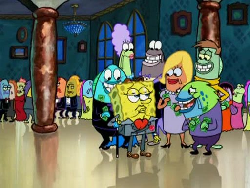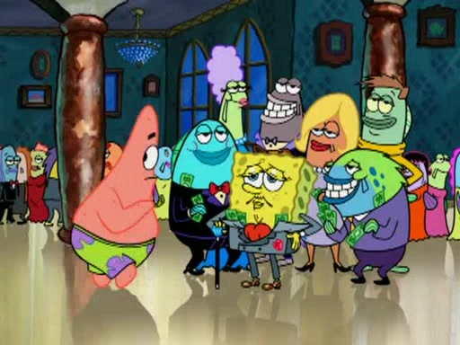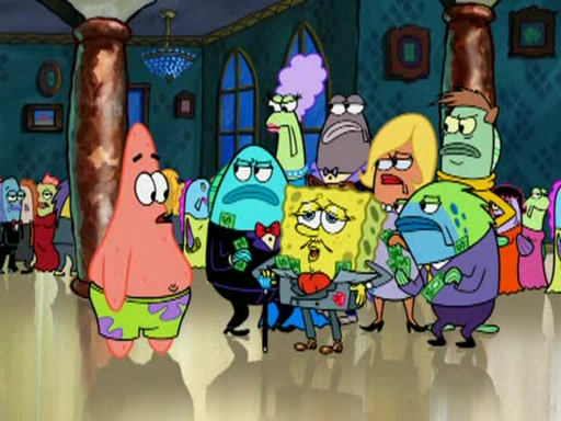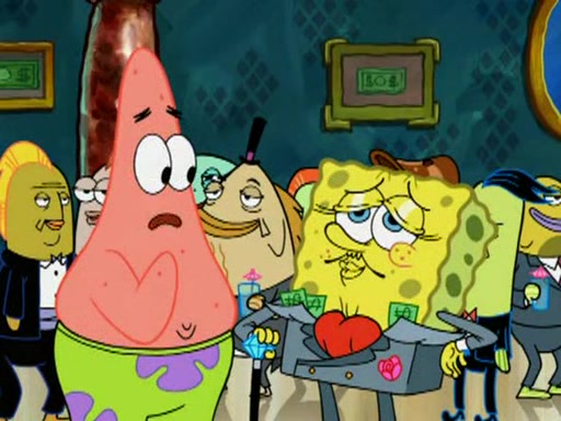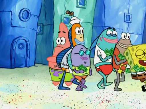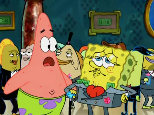 Later, SpongeBob gives out money to others at the local ice-cream stand, causing him to get a lot of friends. SpongeBob is overtaken by fame that he forget Patrick was his best friend. He keeps giving money to his rich "friends", and so many people have used him for it that he runs out completely. Spongebob returns to his normal life and he and Patrick reconcile. Patrick finds another "volleyball", which is really a huge diamond from the Bikini Bottom Diamond Mine.