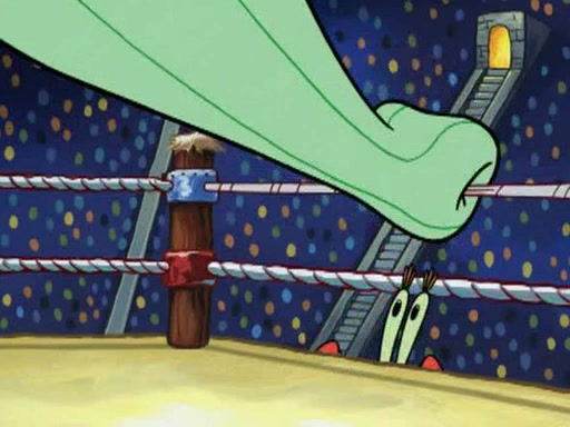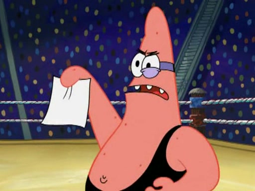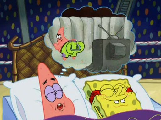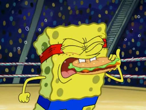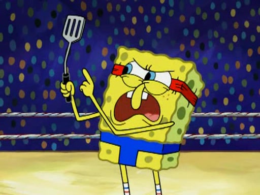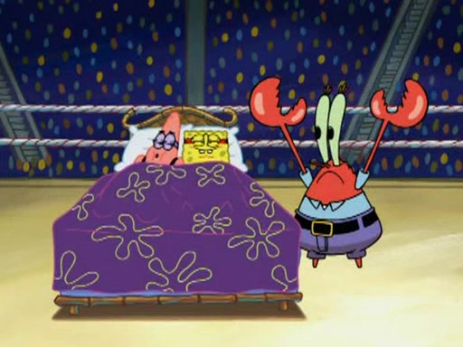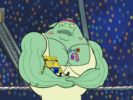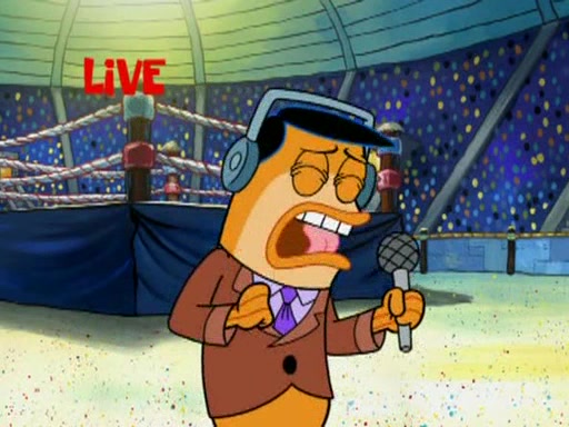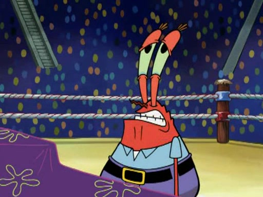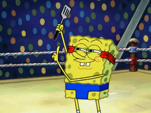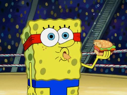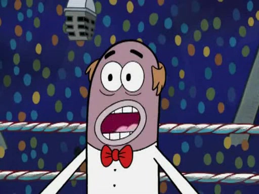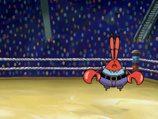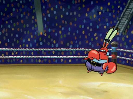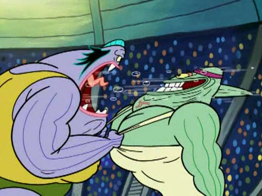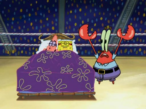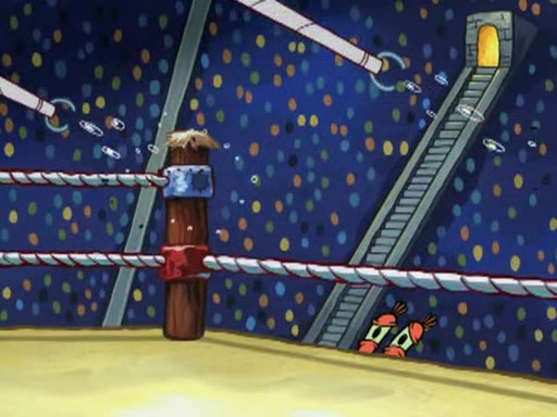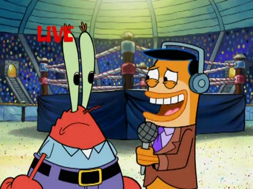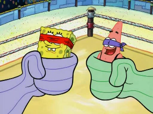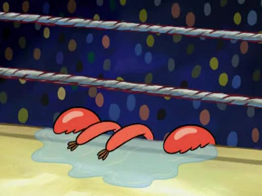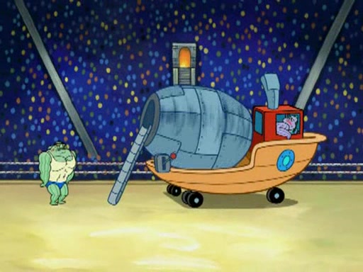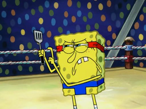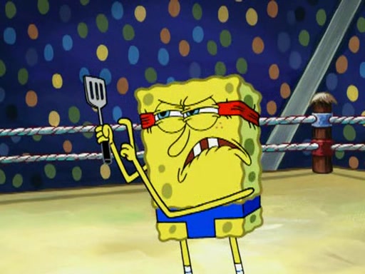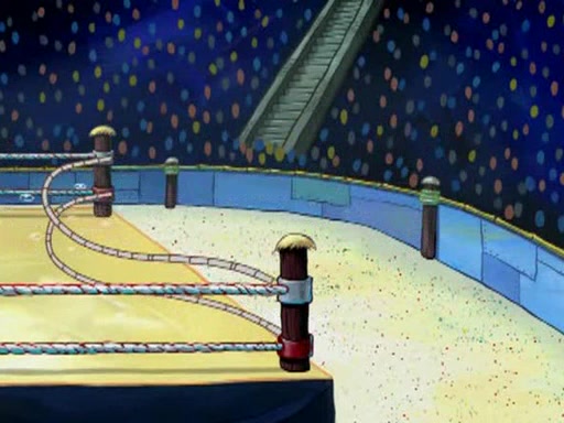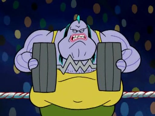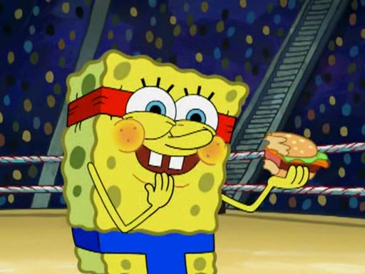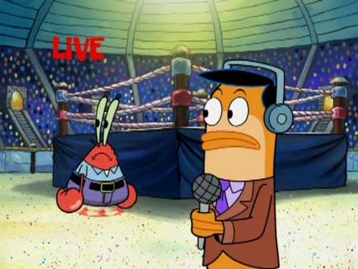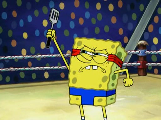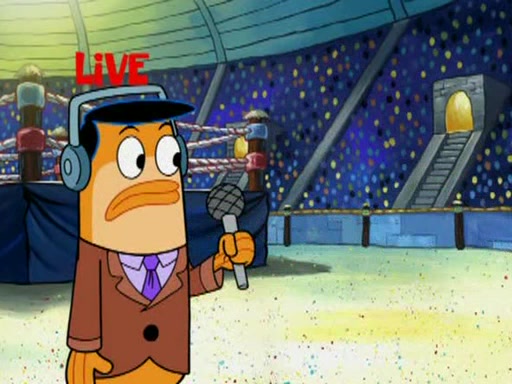 SpongeBob and Patrick are announced to be the "fresh meat" of the champions. They get almost killed in every which way by their opponents (which includes being liquefied and thrown repeatedly). SpongeBob and Patrick soon fall asleep and (while they are unconscious) the opponents decide to kill them with their deadly finishing move. Mr. Krabs is scared that they will die and he won't get the million clams. At the last minute, SpongeBob and Patrick end up winning, thanks to Patrick's "Iron Buns" (which crack the champions into pieces).