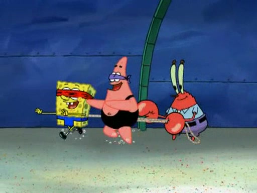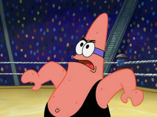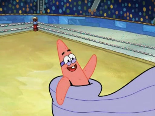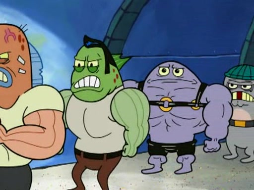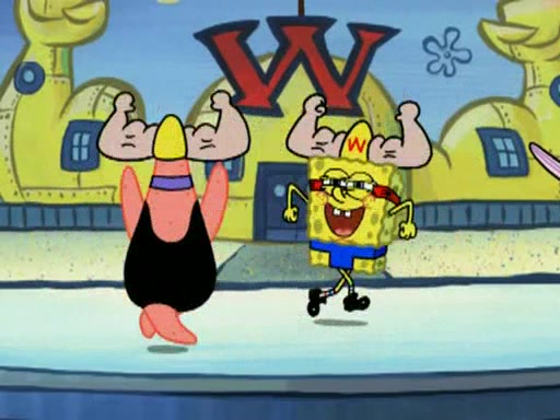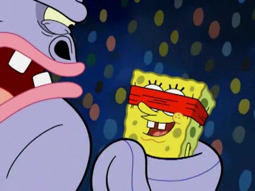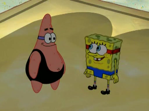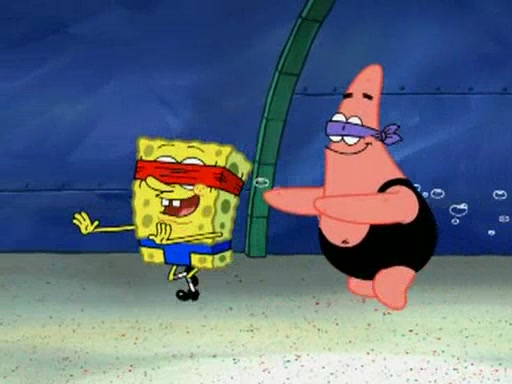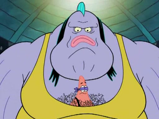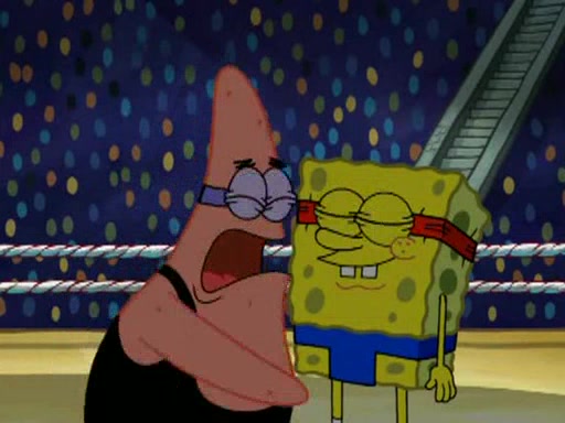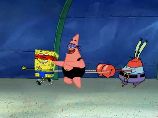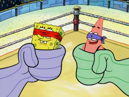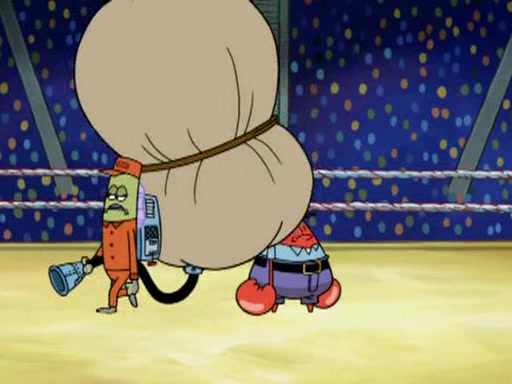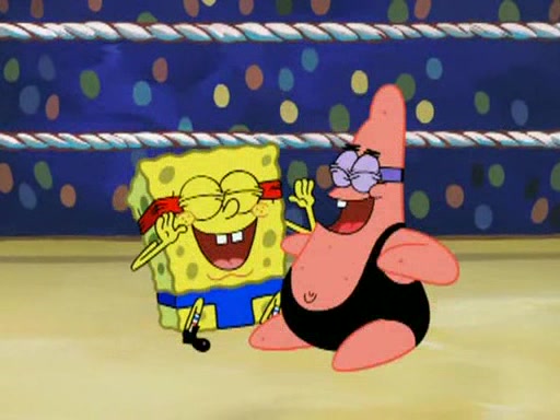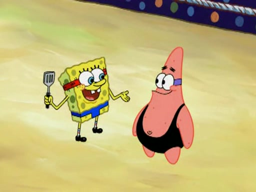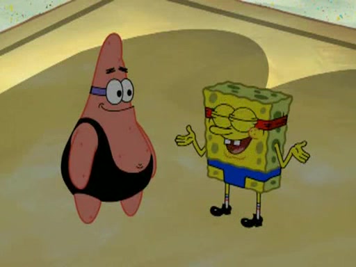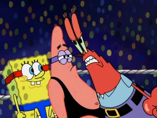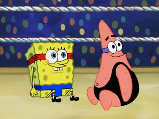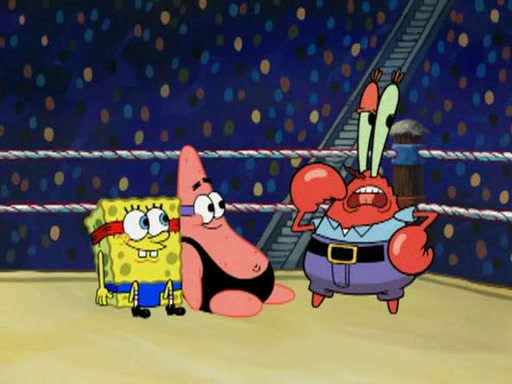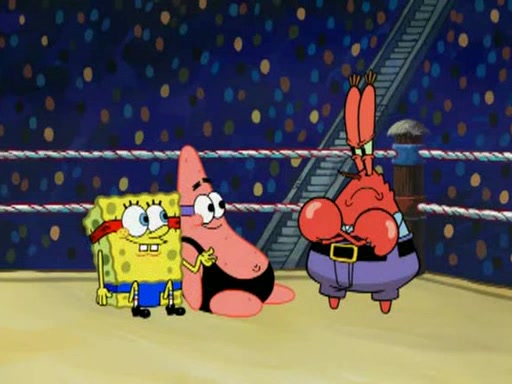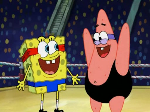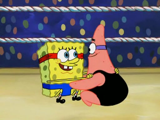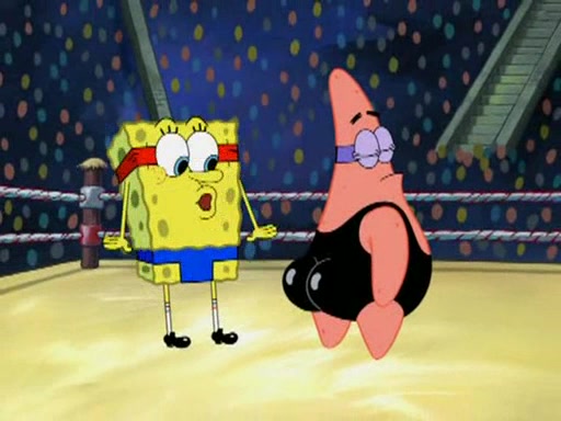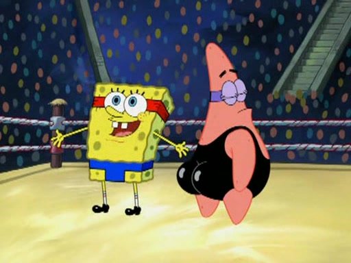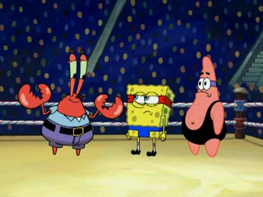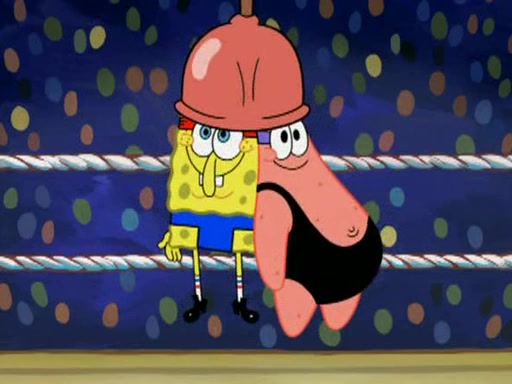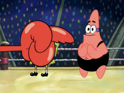 He blindfolds them and drags them in front of the opponents. They try to figure out what is in front of them before they take off the blindfolds. The champions grab them and squeeze them 'til their blindfolds break. SpongeBob and Patrick are terrified by them and run away behind Mr. Krabs. He tells them that they are pretending to be heavyweight champions. Patrick quickly shows SpongeBob his behind to show him that he has been working out. Just to comfort them, he decides their names (SpongeBob is the Shurlor Boy and Patrick is the Pink Patty and together they are the Krusty Krushers).