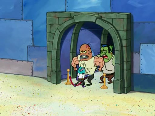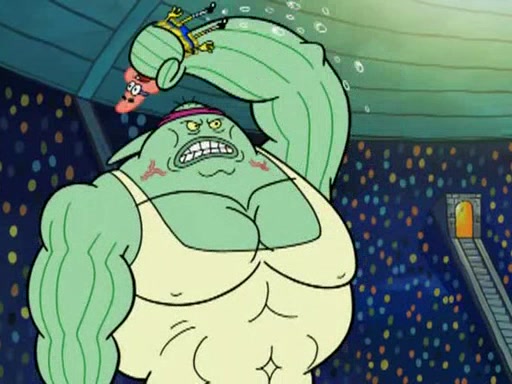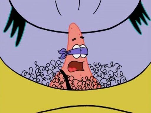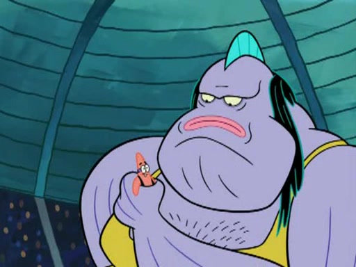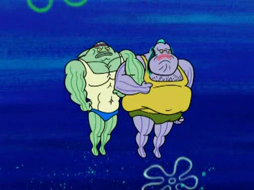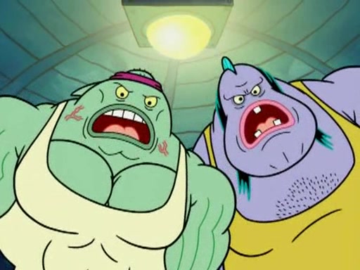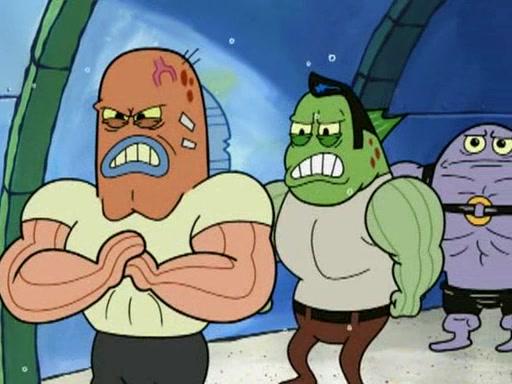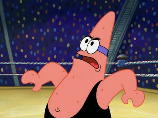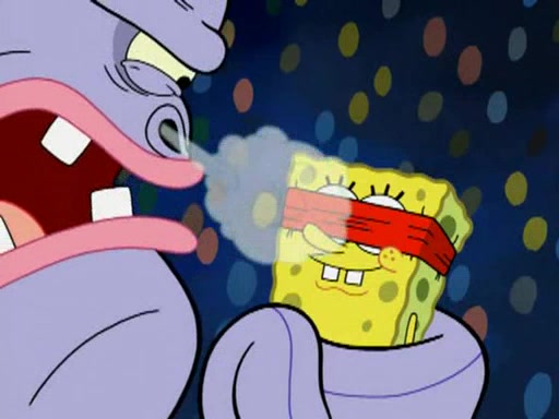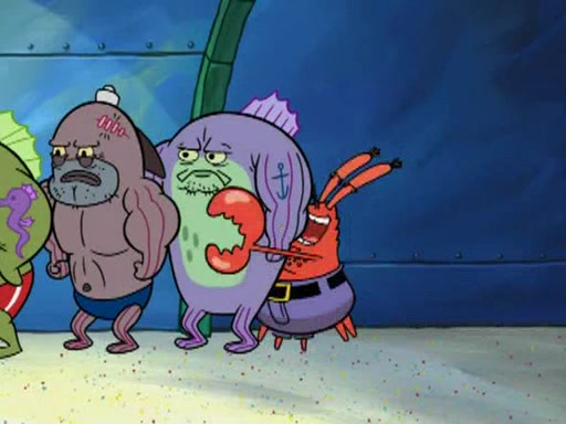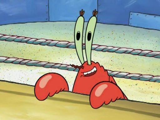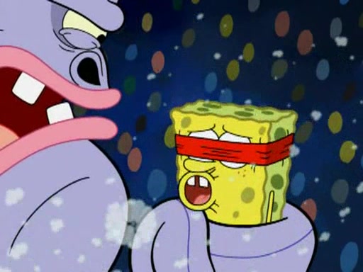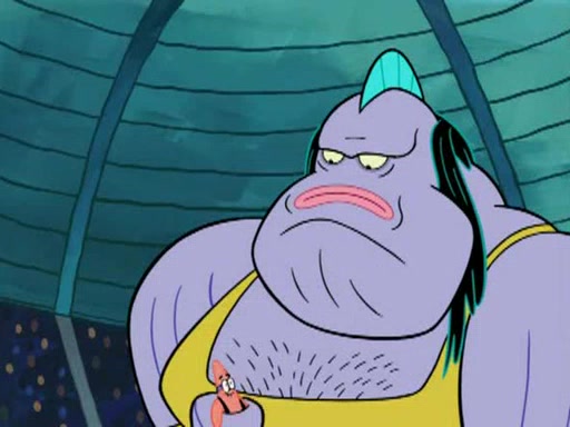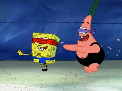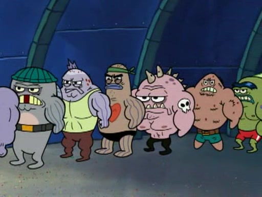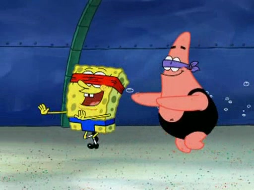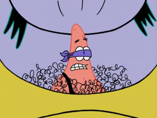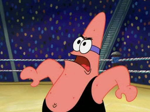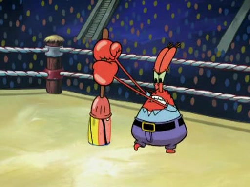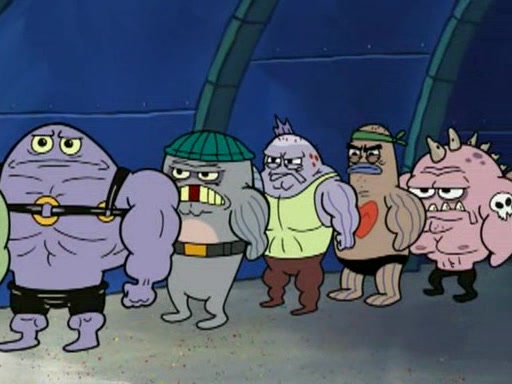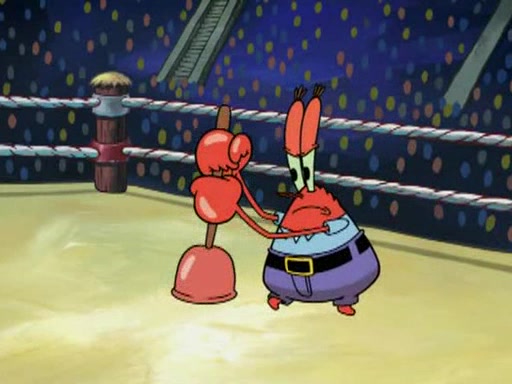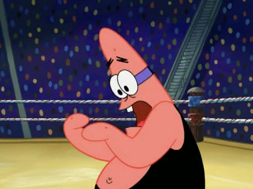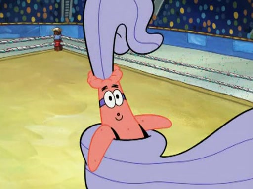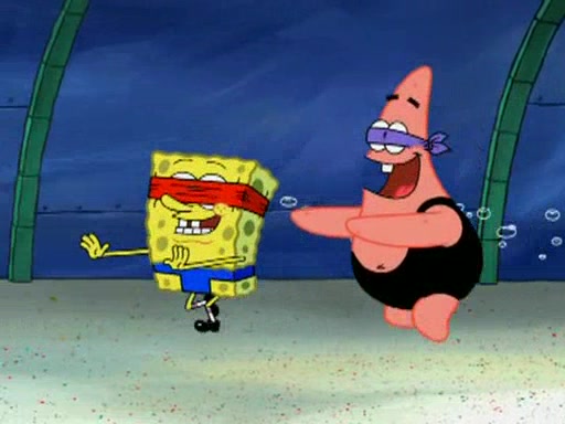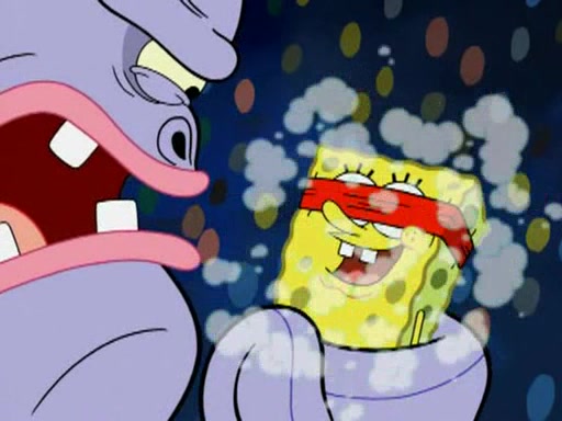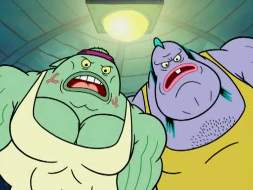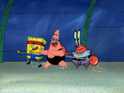 He blindfolds them and drags them in front of the opponents. They try to figure out what is in front of them before they take off the blindfolds. The champions grab them and squeeze them 'til their blindfolds break. SpongeBob and Patrick are terrified by them and run away behind Mr. Krabs. He tells them that they are pretending to be heavyweight champions. Patrick quickly shows SpongeBob his behind to show him that he has been working out. Just to comfort them, he decides their names (SpongeBob is the Shurlor Boy and Patrick is the Pink Patty and together they are the Krusty Krushers).