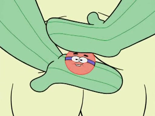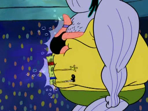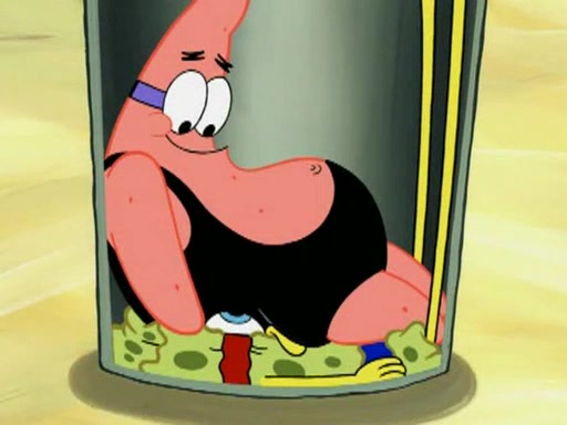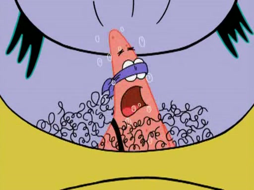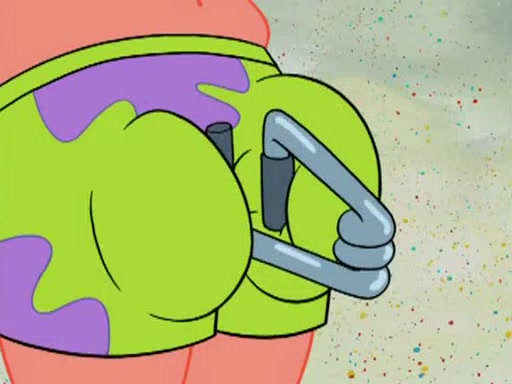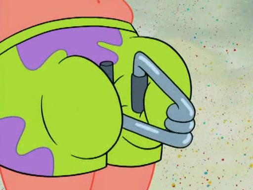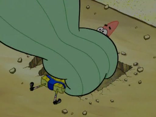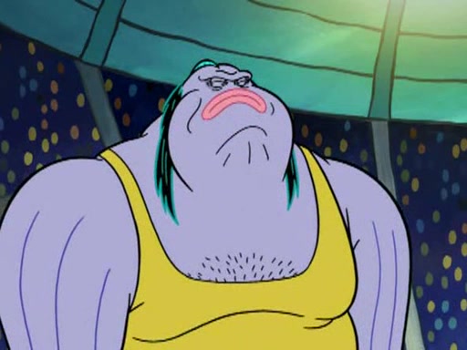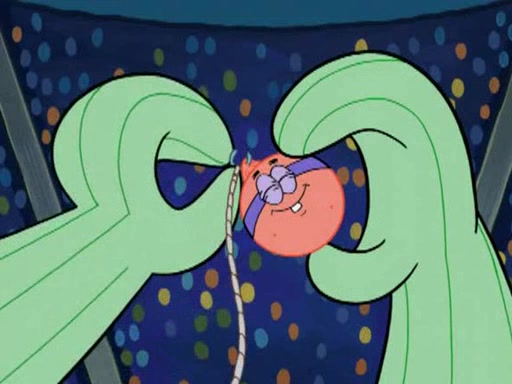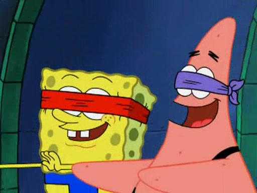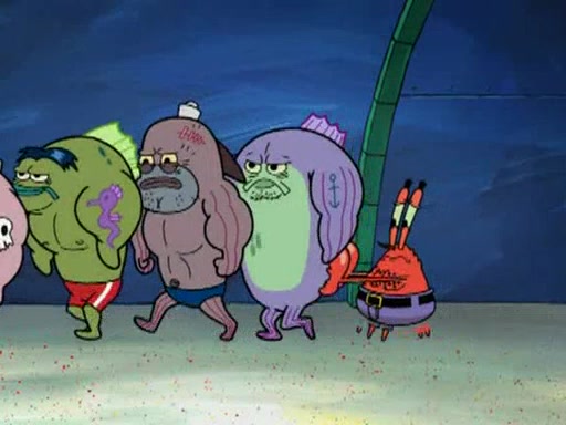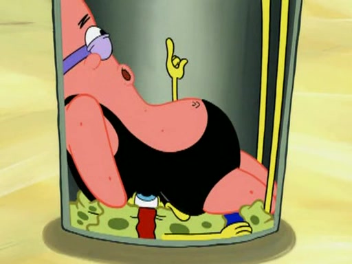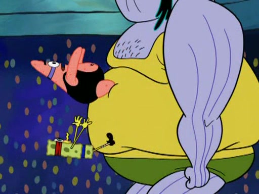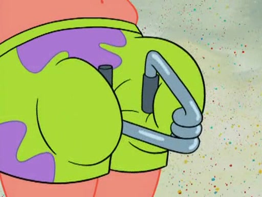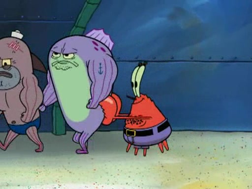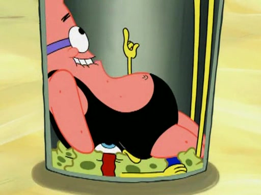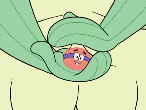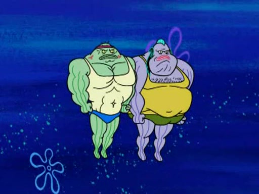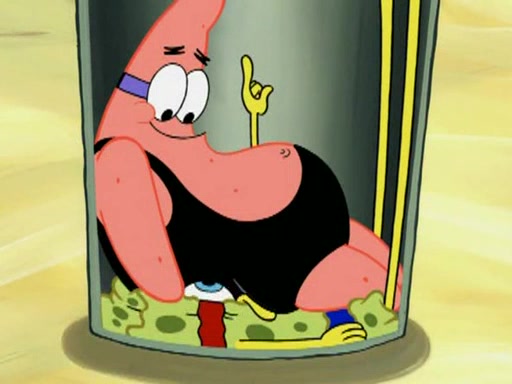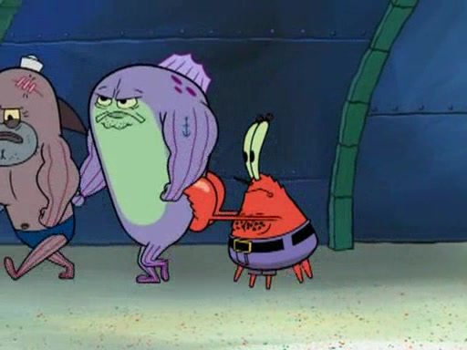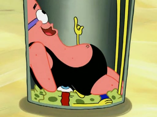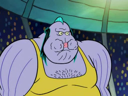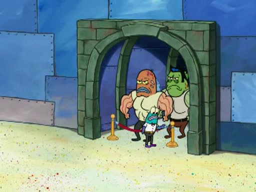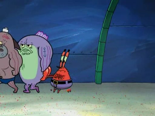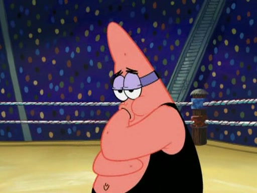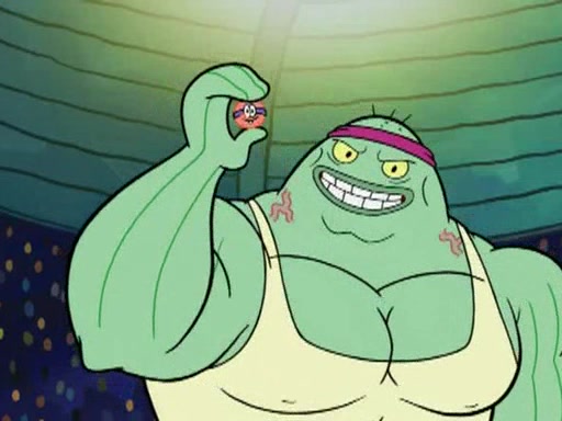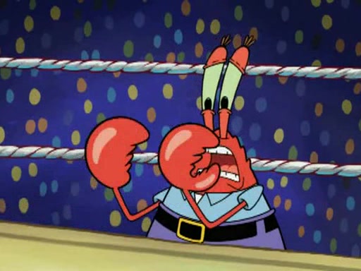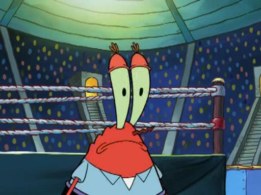 He blindfolds them and drags them in front of the opponents. They try to figure out what is in front of them before they take off the blindfolds. The champions grab them and squeeze them 'til their blindfolds break. SpongeBob and Patrick are terrified by them and run away behind Mr. Krabs. He tells them that they are pretending to be heavyweight champions. Patrick quickly shows SpongeBob his behind to show him that he has been working out. Just to comfort them, he decides their names (SpongeBob is the Shurlor Boy and Patrick is the Pink Patty and together they are the Krusty Krushers).