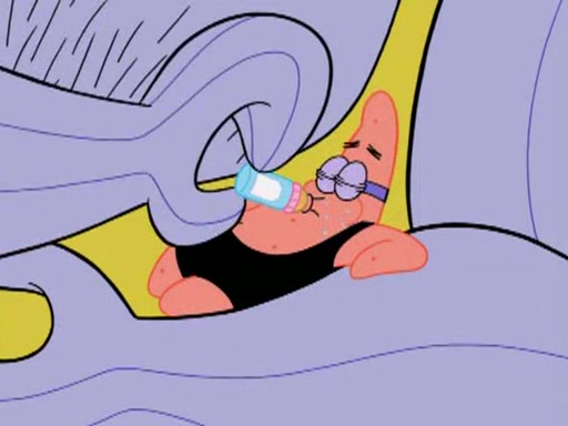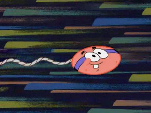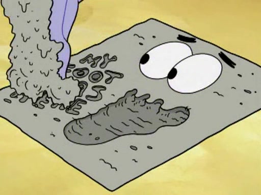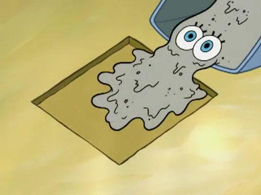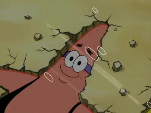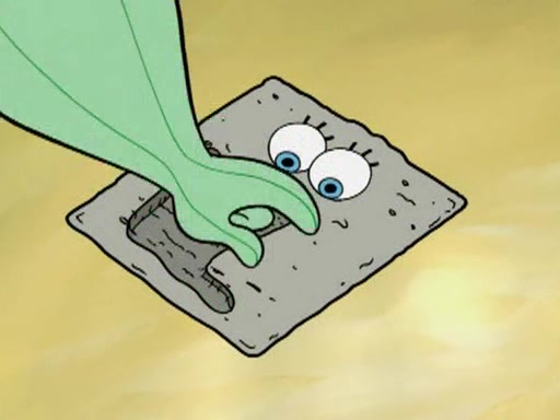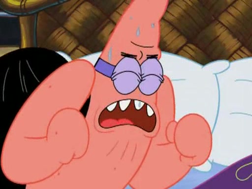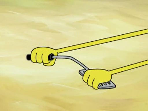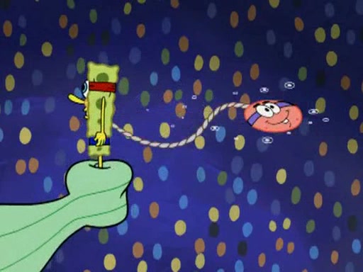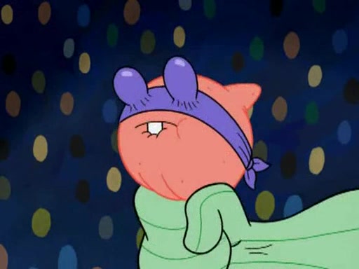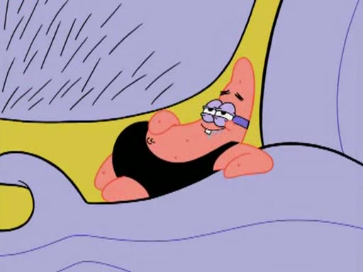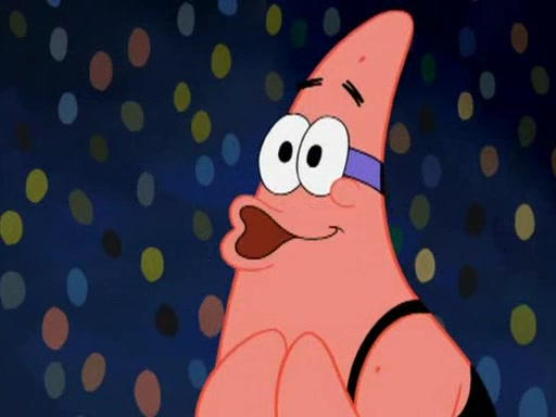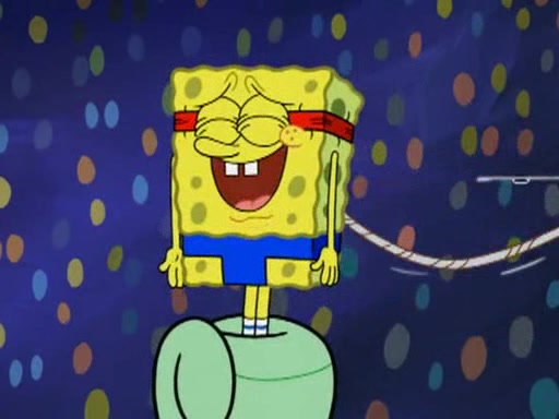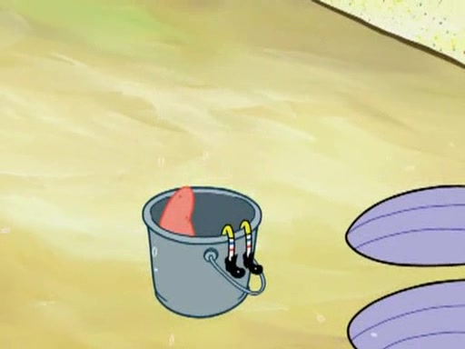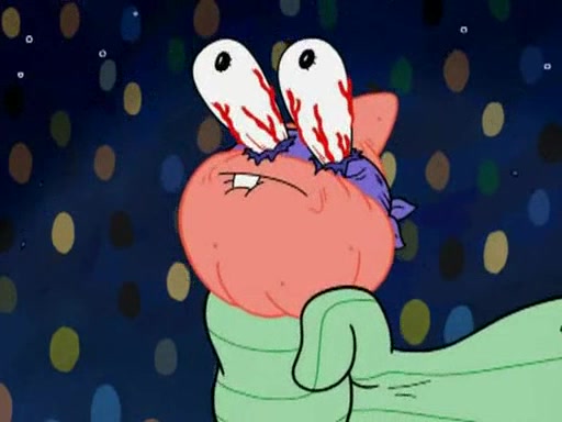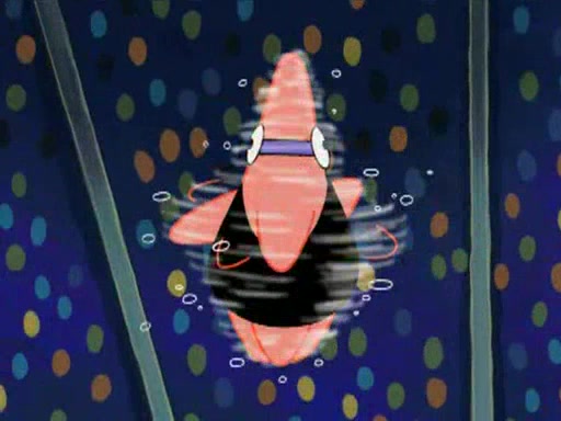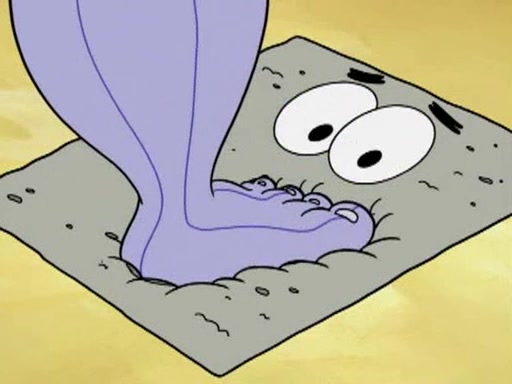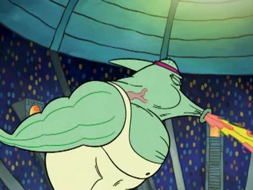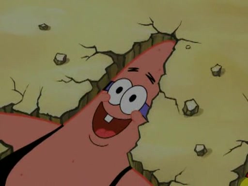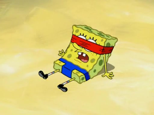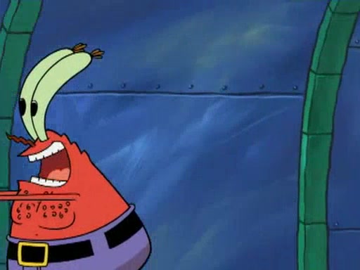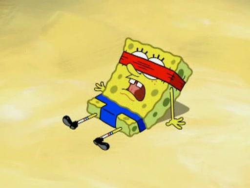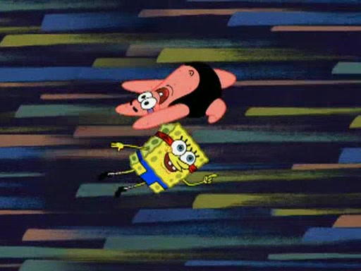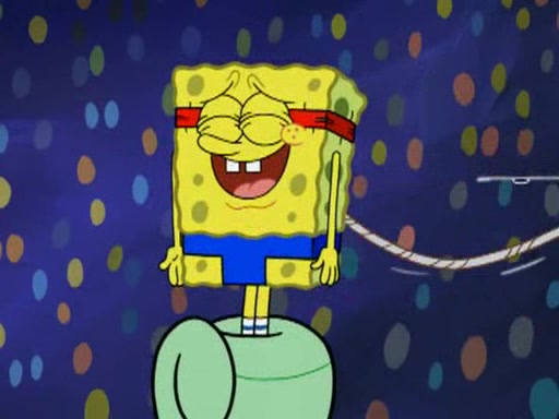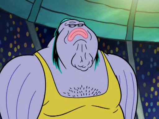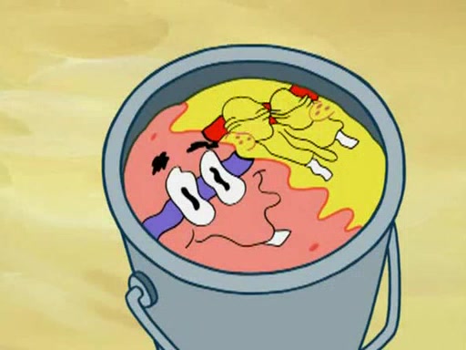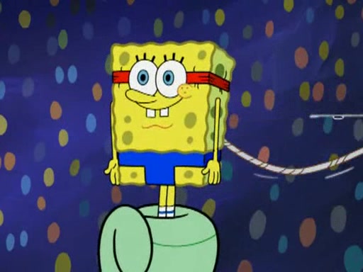 He blindfolds them and drags them in front of the opponents. They try to figure out what is in front of them before they take off the blindfolds. The champions grab them and squeeze them 'til their blindfolds break. SpongeBob and Patrick are terrified by them and run away behind Mr. Krabs. He tells them that they are pretending to be heavyweight champions. Patrick quickly shows SpongeBob his behind to show him that he has been working out. Just to comfort them, he decides their names (SpongeBob is the Shurlor Boy and Patrick is the Pink Patty and together they are the Krusty Krushers).